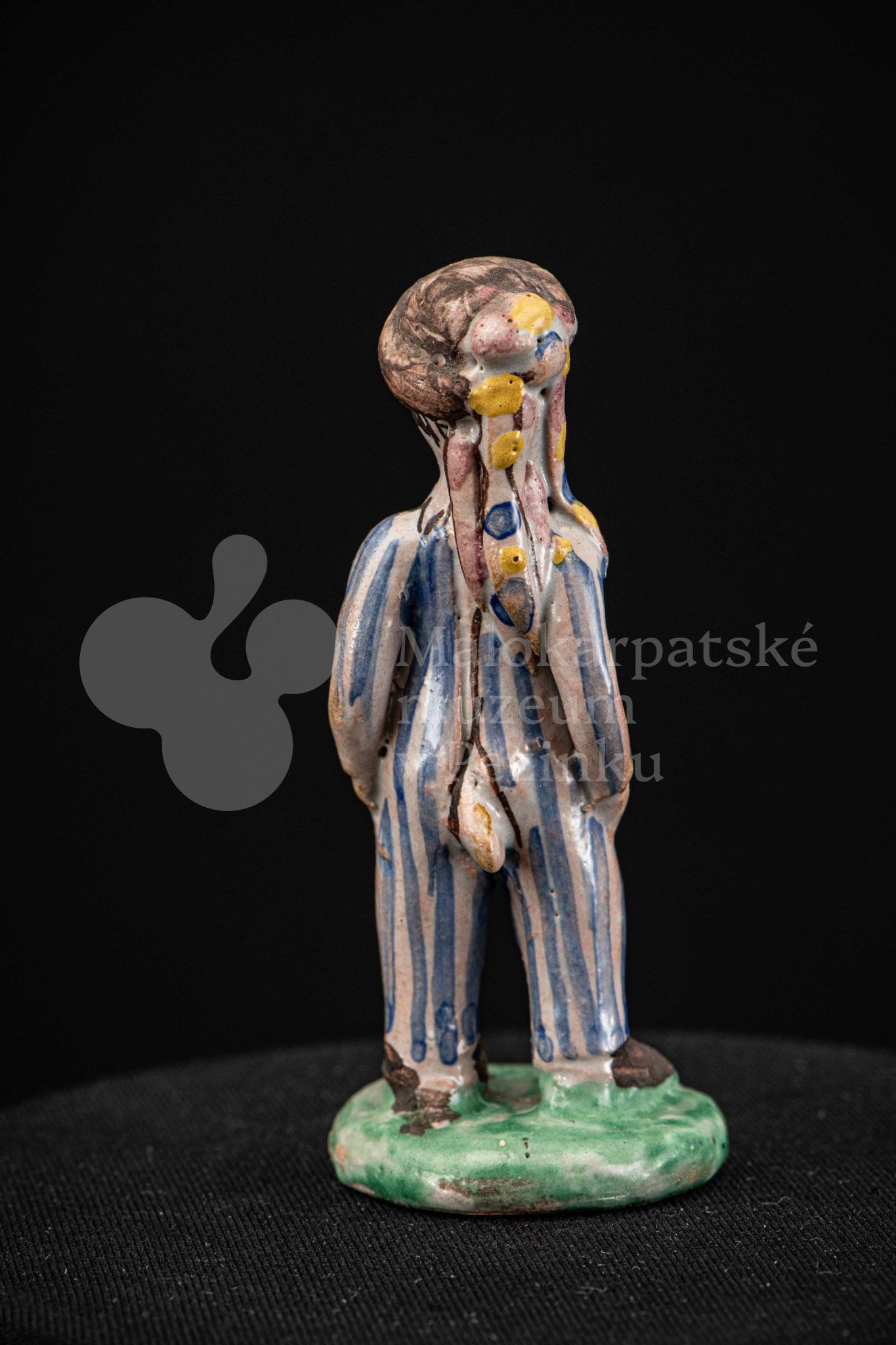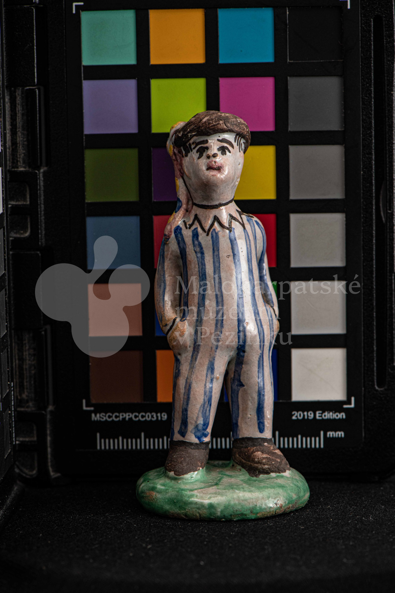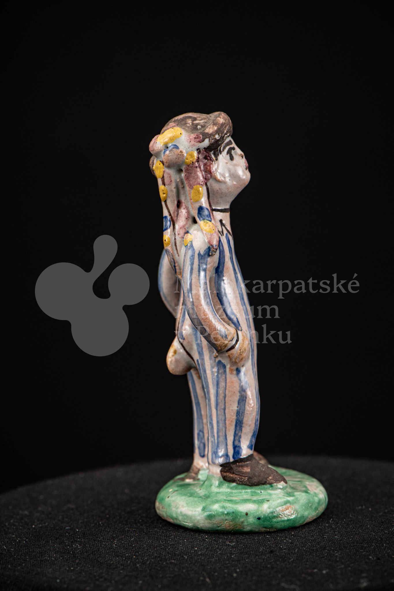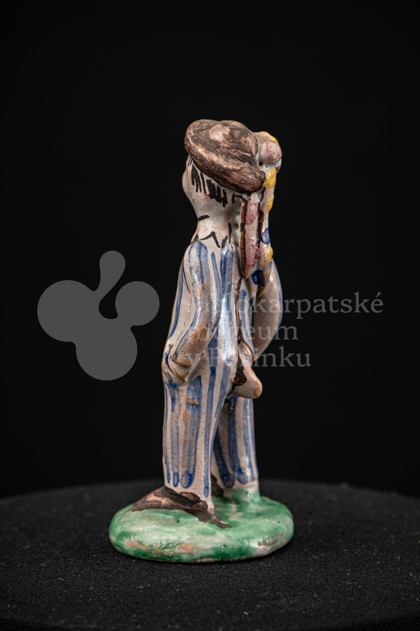 Plastika fajansová – stojaci chlapec v pruhovaných bielomodrých šatách, s manganovým klobúčikom. Okrúhly podstavec je zelený. Na rube podstavca je značenie F.K. ST.