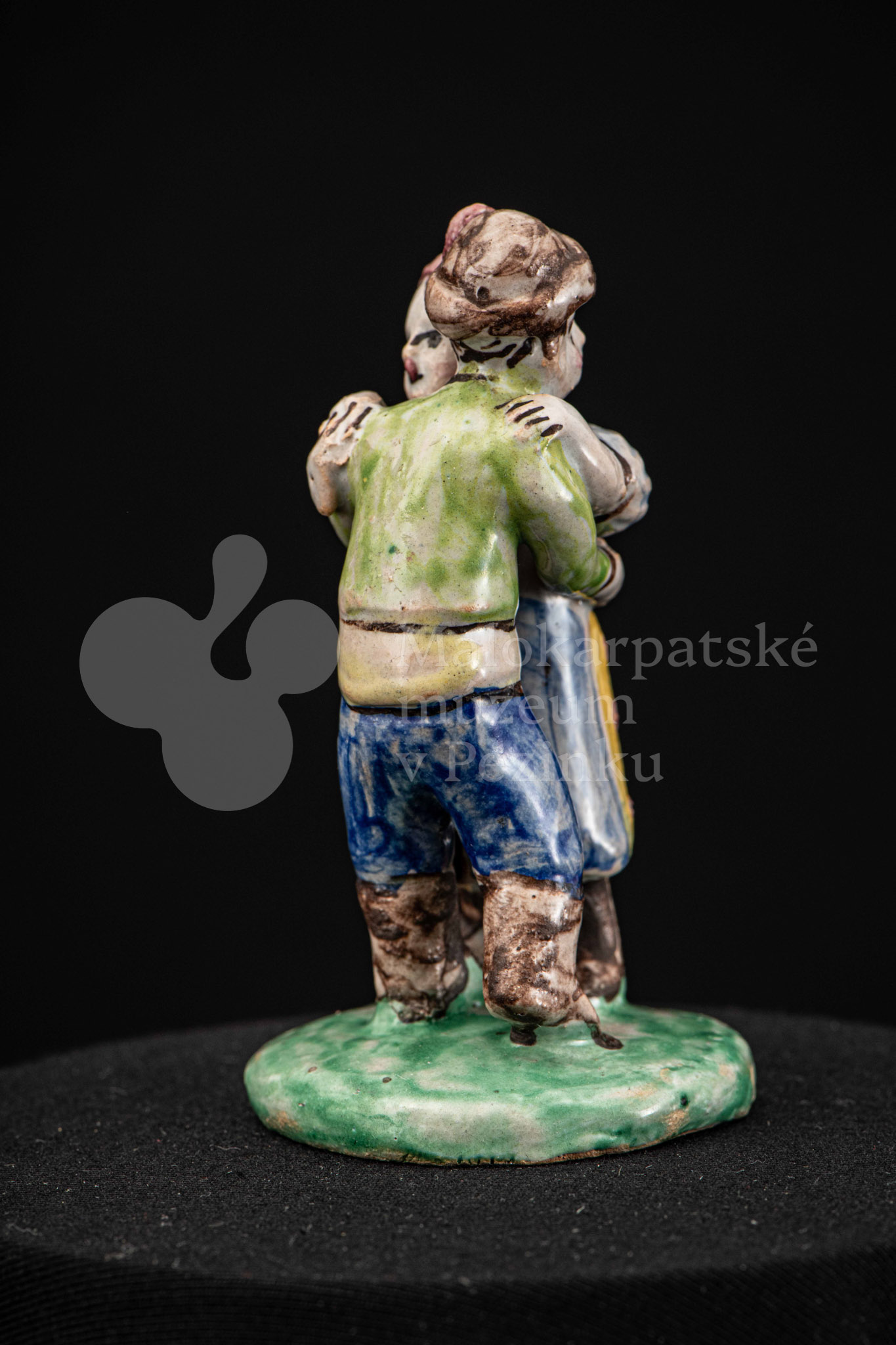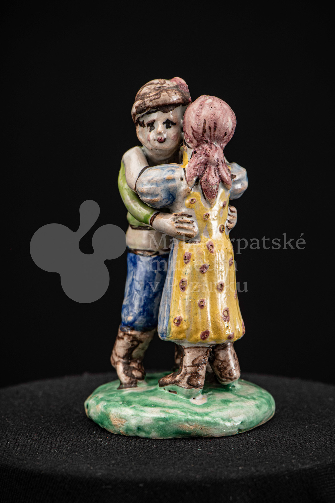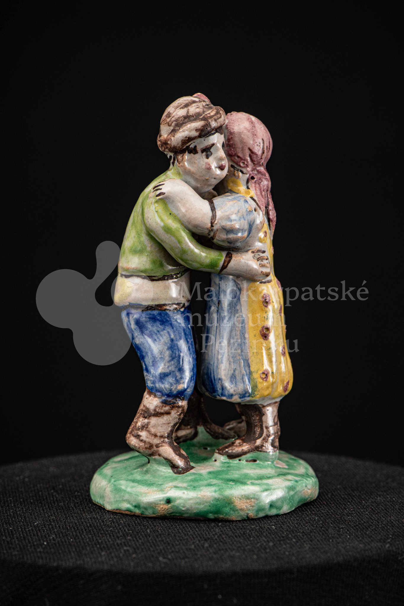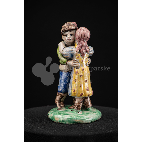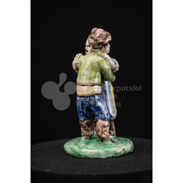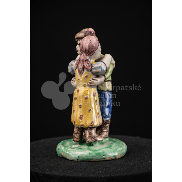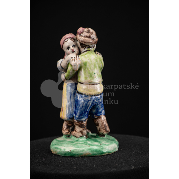 Plastika fajansová Tancujúci pár – tanečník má zelenožlté a modré oblečenie, dievča má na hlave červenú „hanáčku“ a žltú sukňu s červeným dekorom. Okrúhly podstavec je zelený. Na rube podstavca značenie FK.ST.