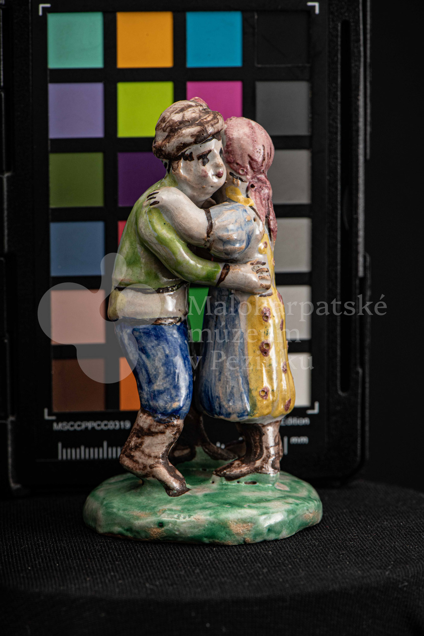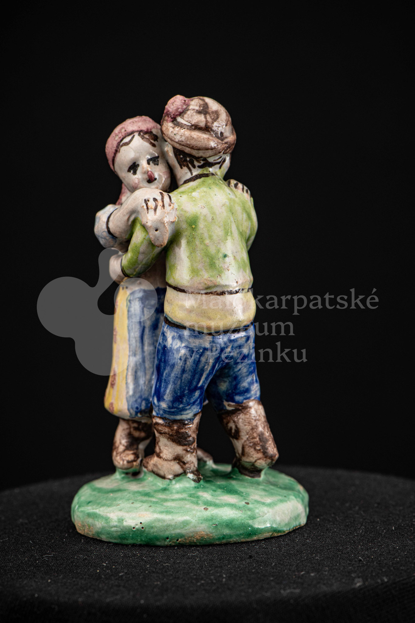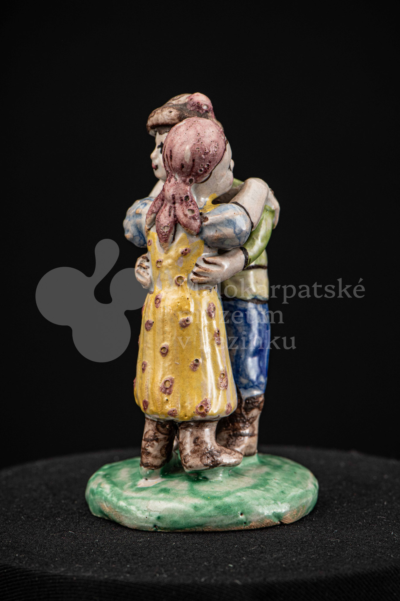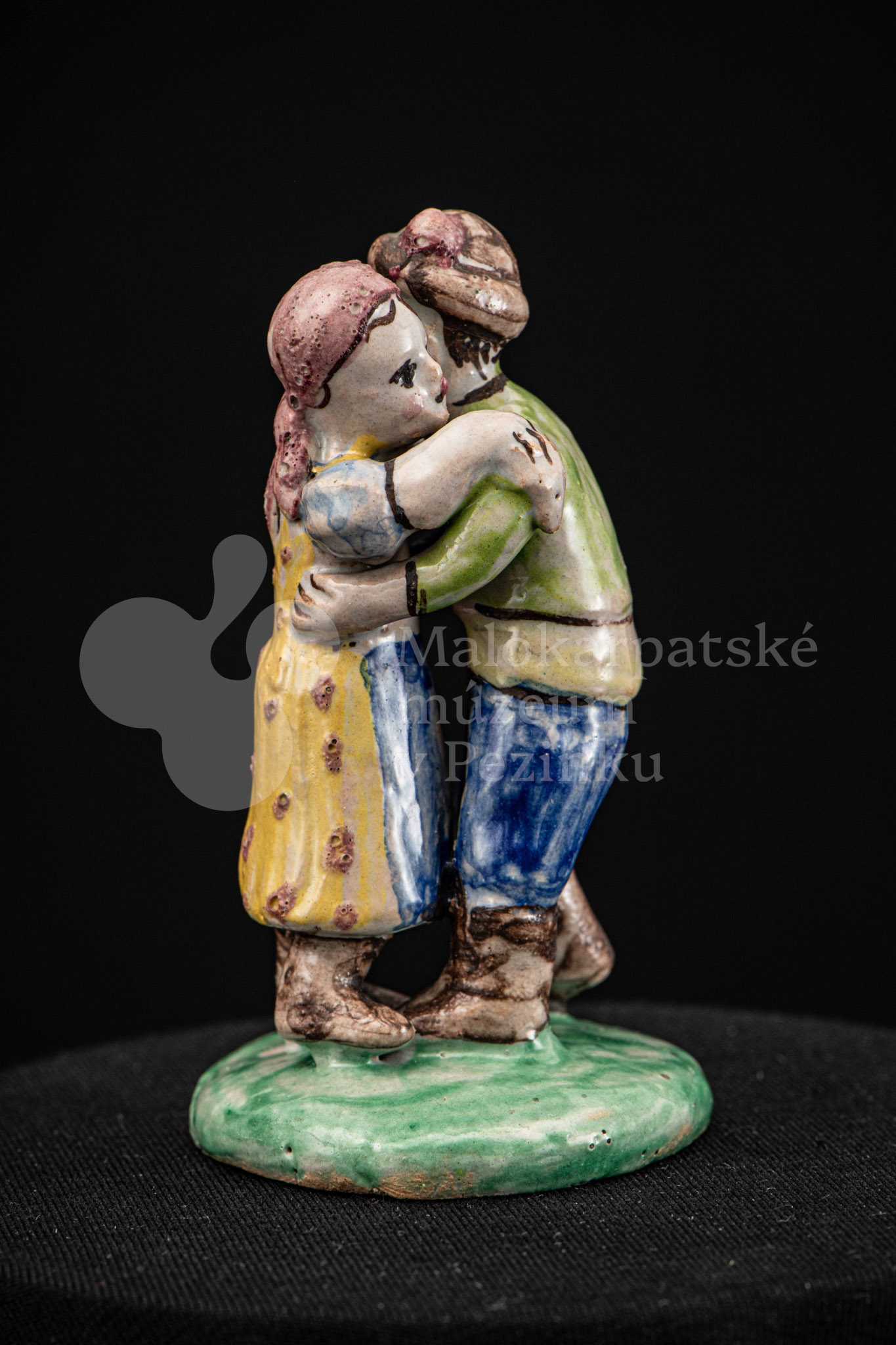 Plastika fajansová Tancujúci pár – tanečník má zelenožlté a modré oblečenie, dievča má na hlave červenú „hanáčku“ a žltú sukňu s červeným dekorom. Okrúhly podstavec je zelený. Na rube podstavca značenie FK.ST.