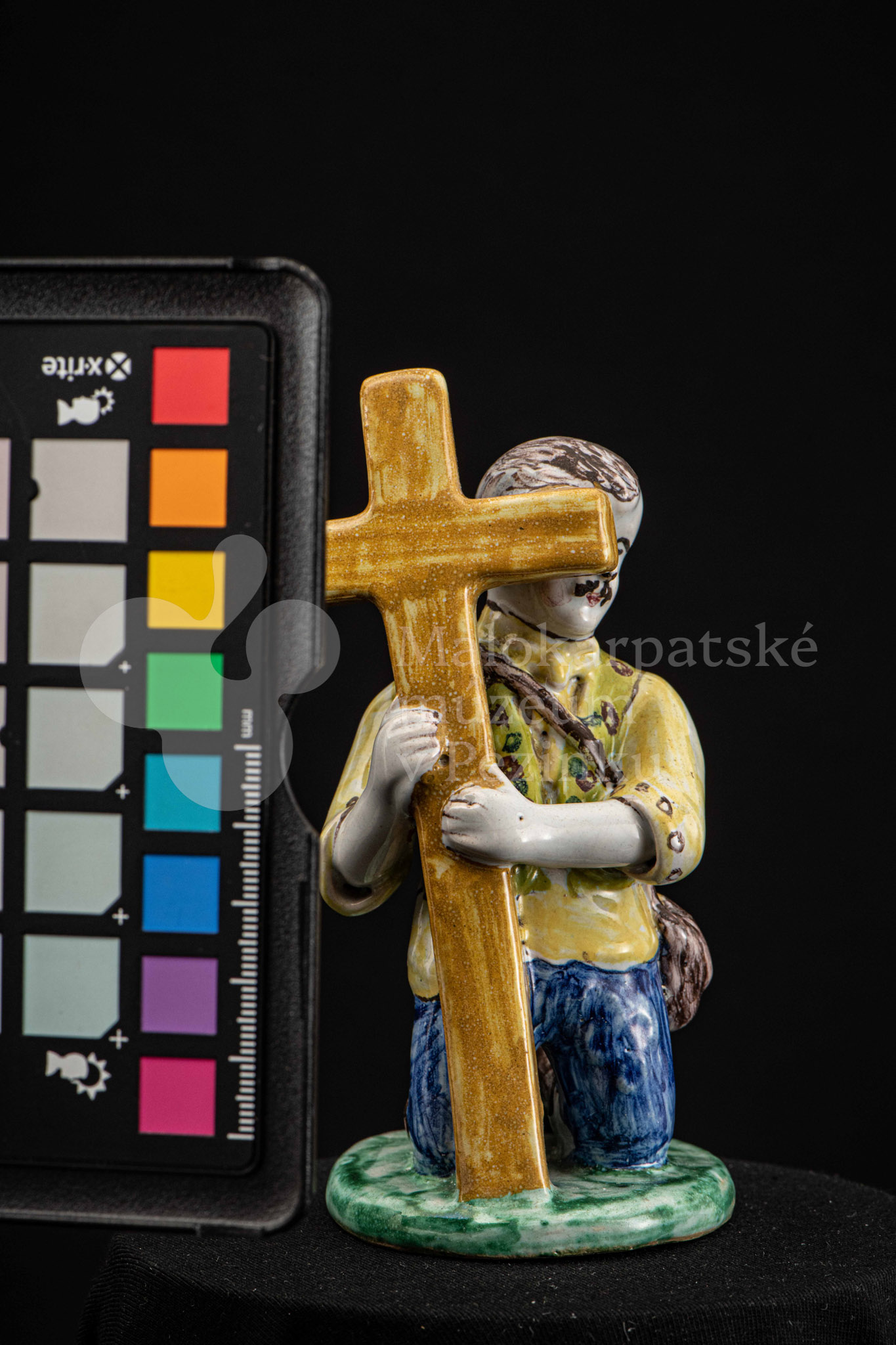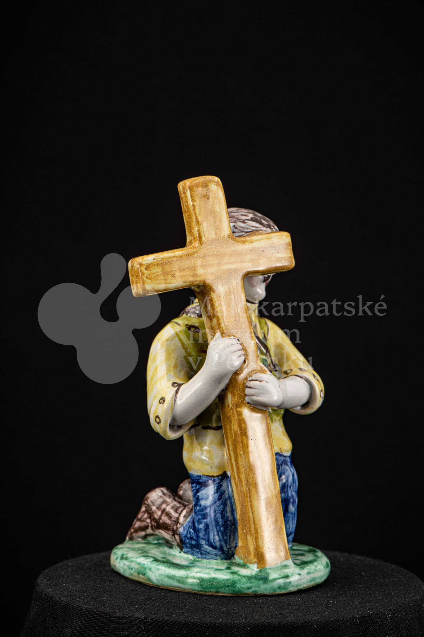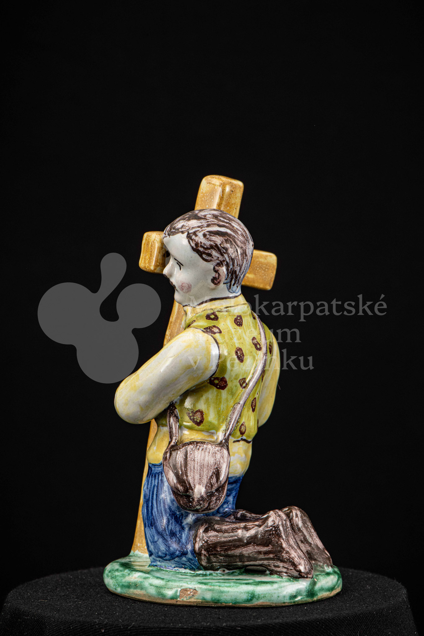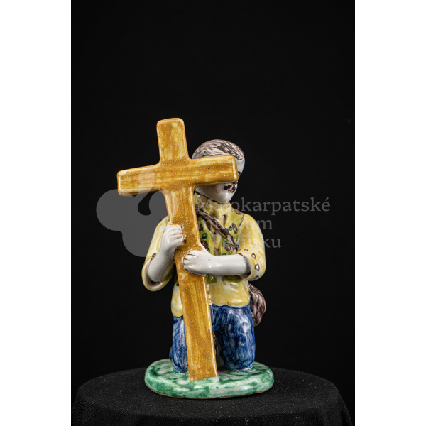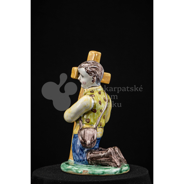 Plastika fajansová Tancujúci párik – tanečník v šatách zdobených jemným červeno-modrým dekorom, dievča má na hlave uviazanú „hanáčku“ zdobenú červenými a žltými bodkami. Okrúhly podstavec je zelený. Na rube podstavca značená FK.ST.
