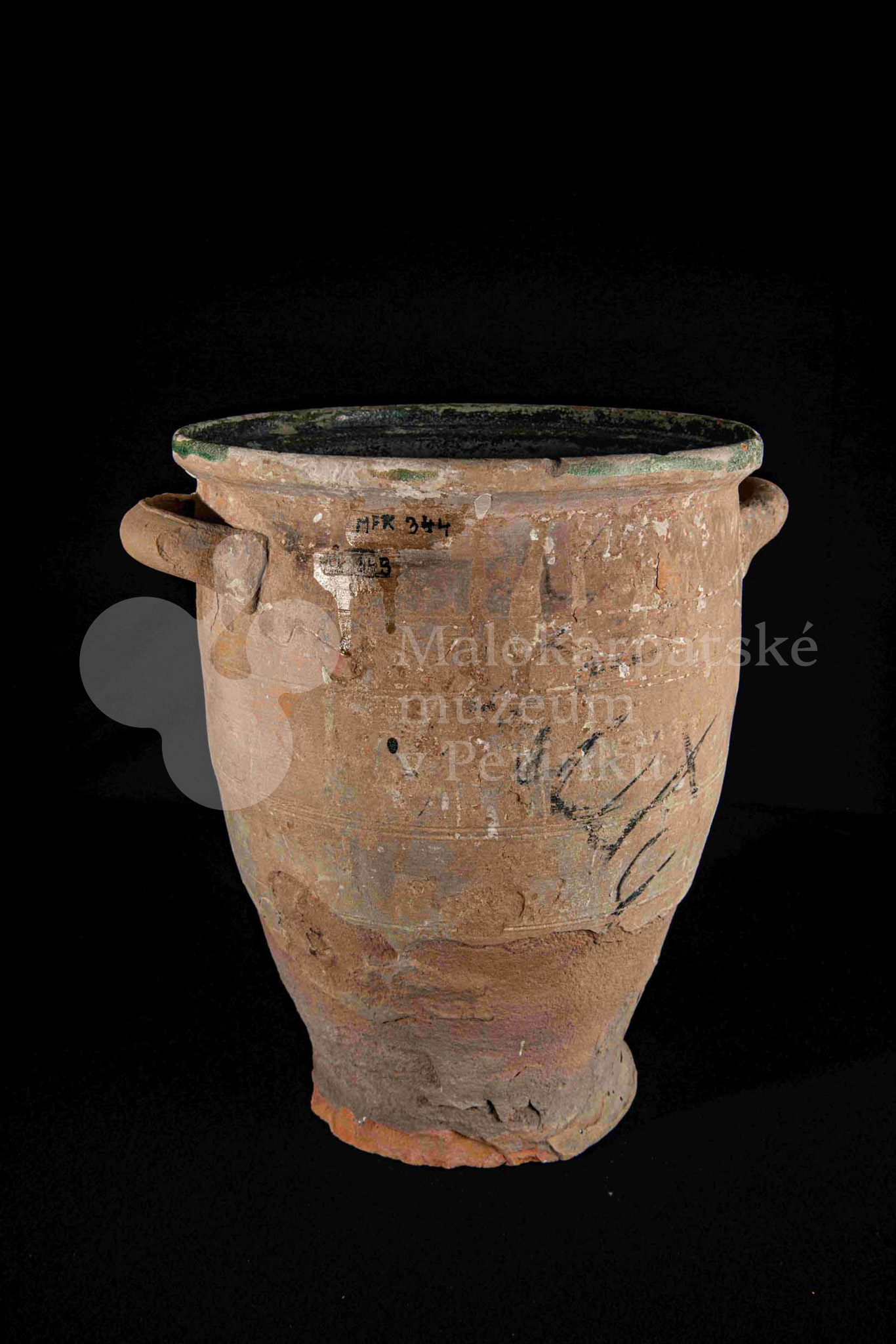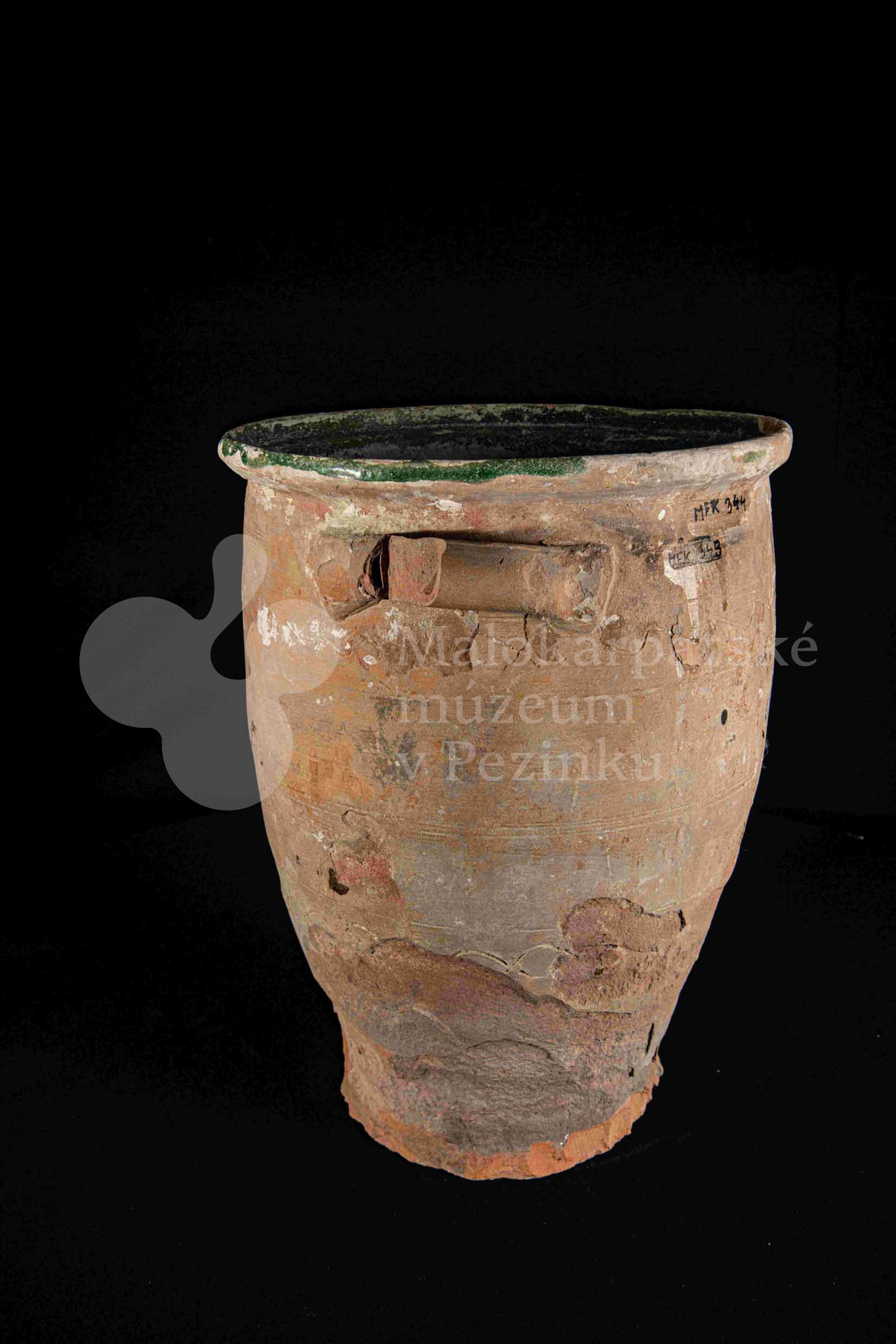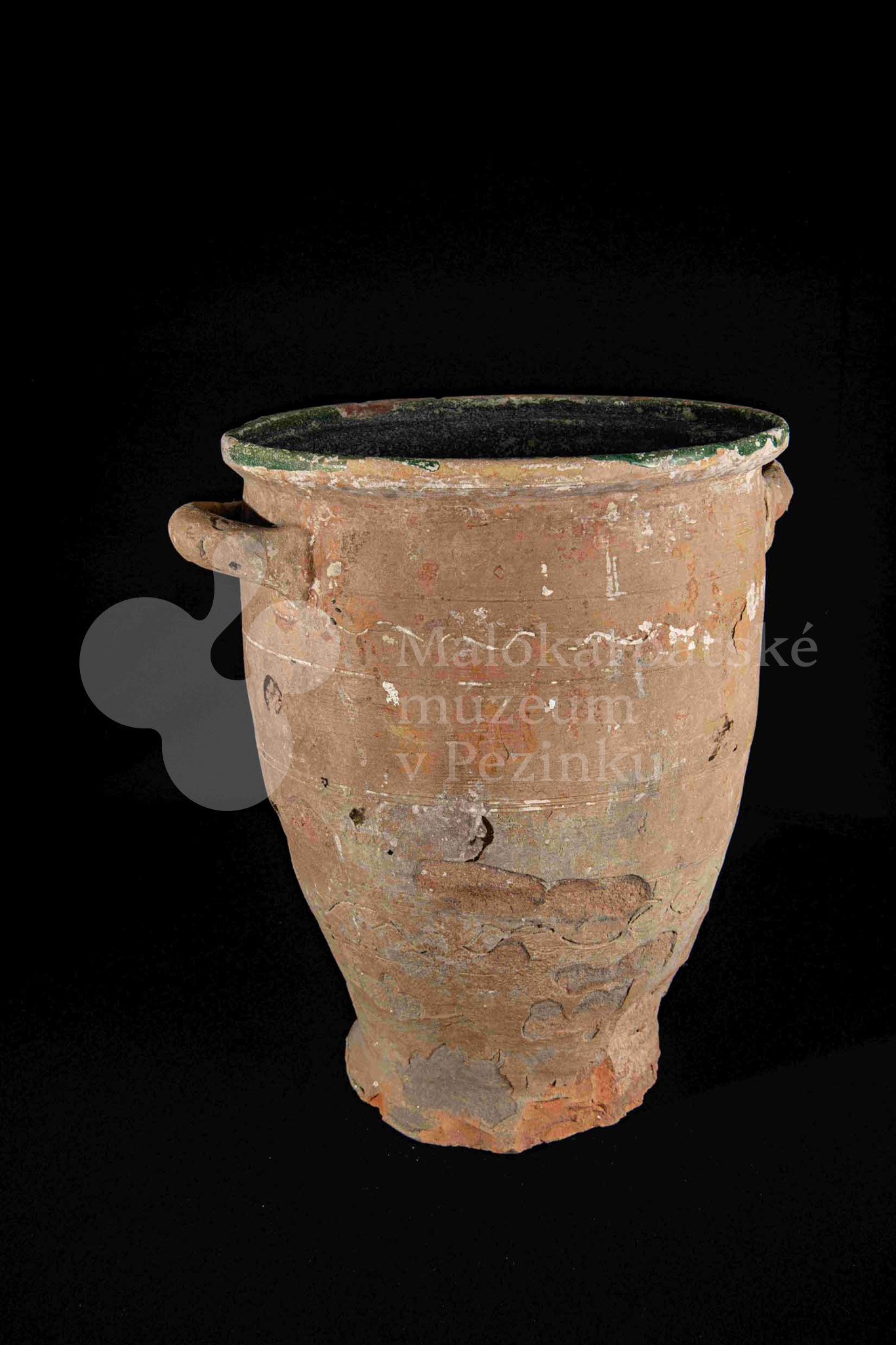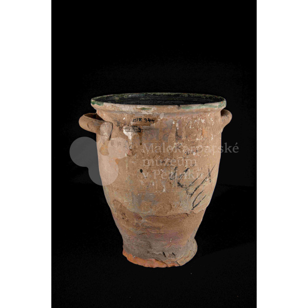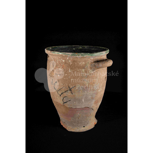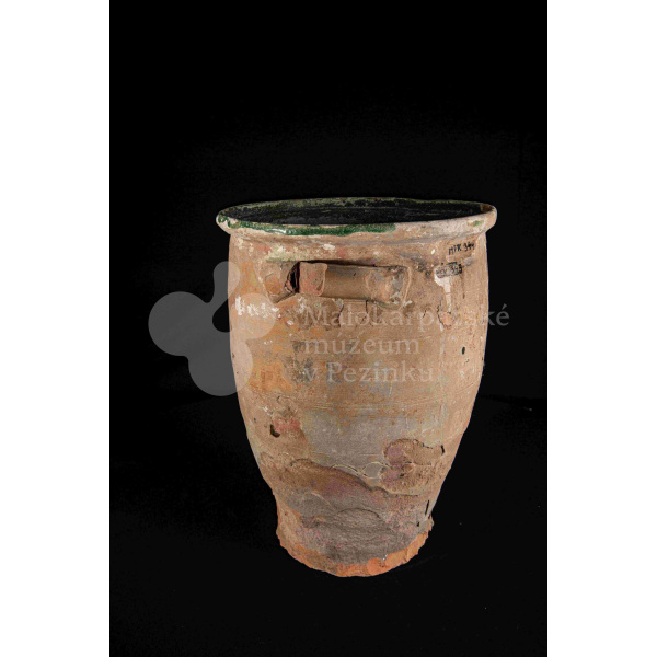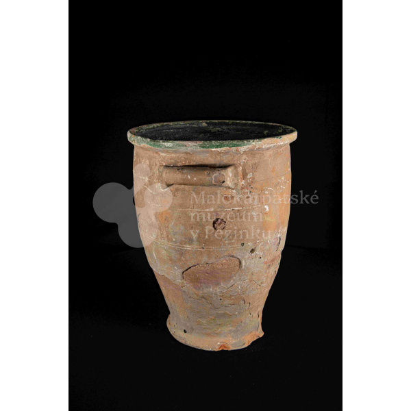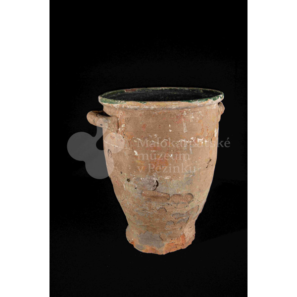 Dve nádoby so surovinou, z raz pálenej hliny – hrnčarina, zvnútra poliate zelenou olovnatou glazúrou silno poškodenou. Po oboch stranách majú modelované