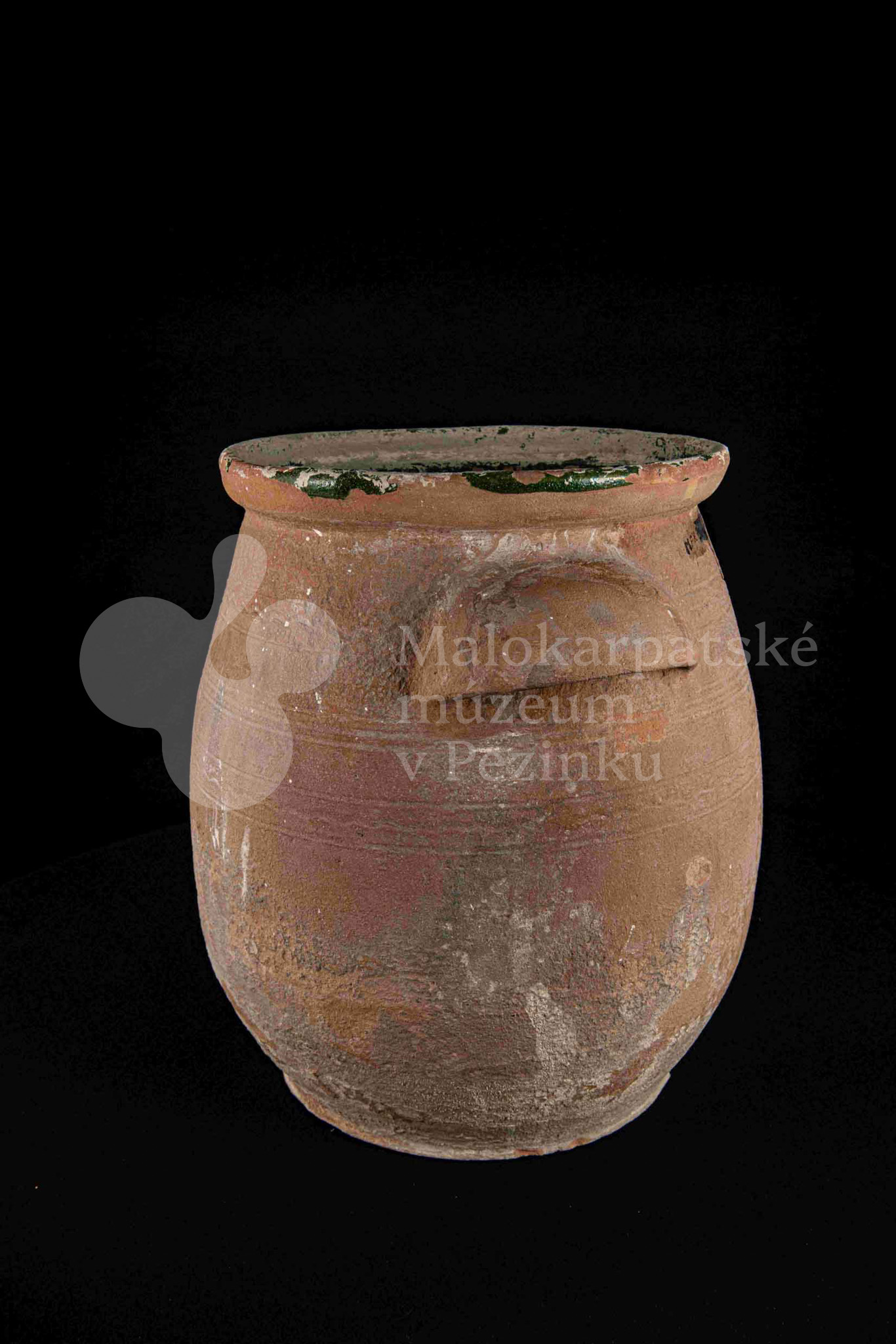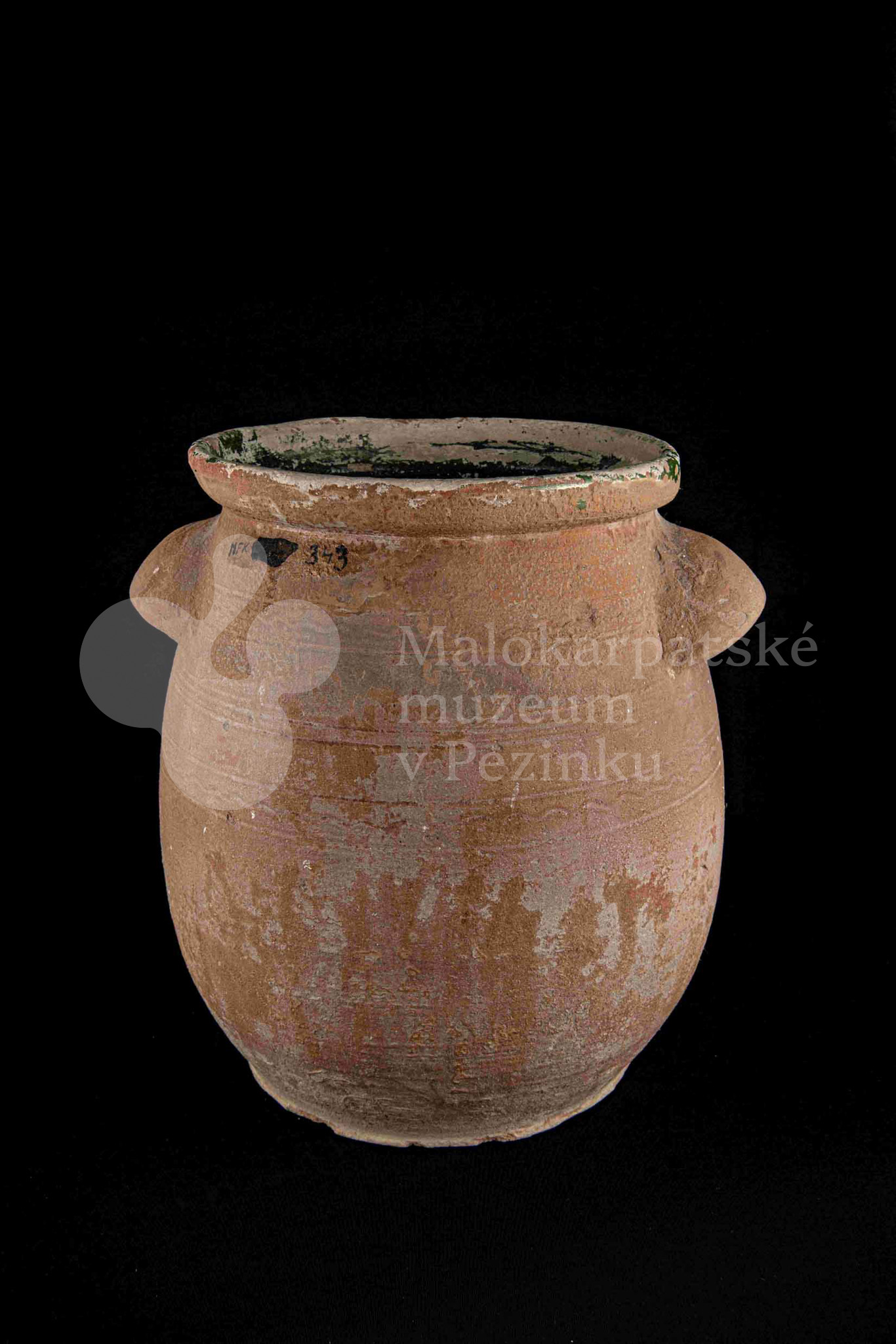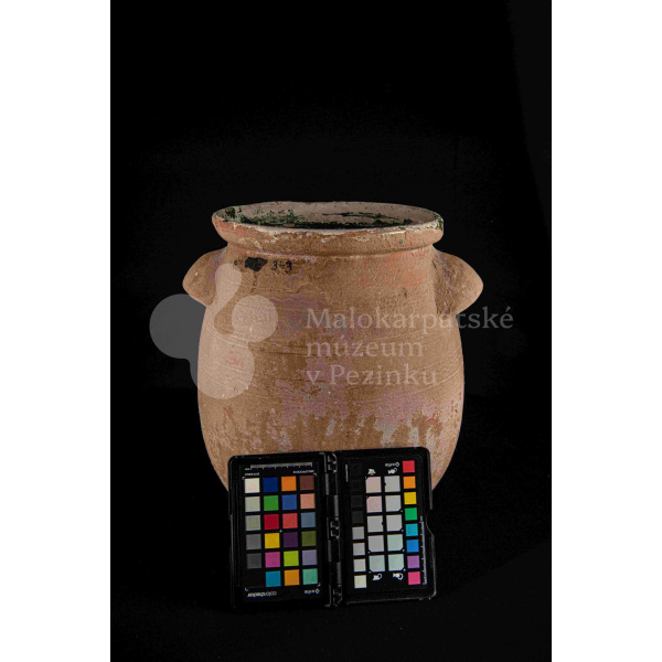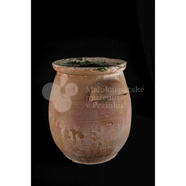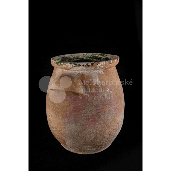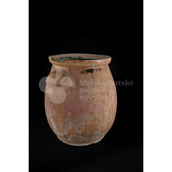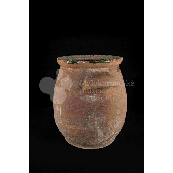 Hrniec sudkovitého tvaru, z raz pálenej hliny – hrnčarina – zvnútra poliaty zelenou olovnatou glazúrou silne poškodenou. Má dve plné uši. Bez značenia.