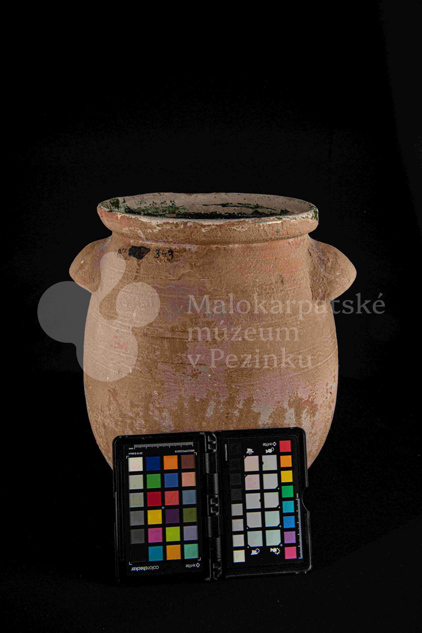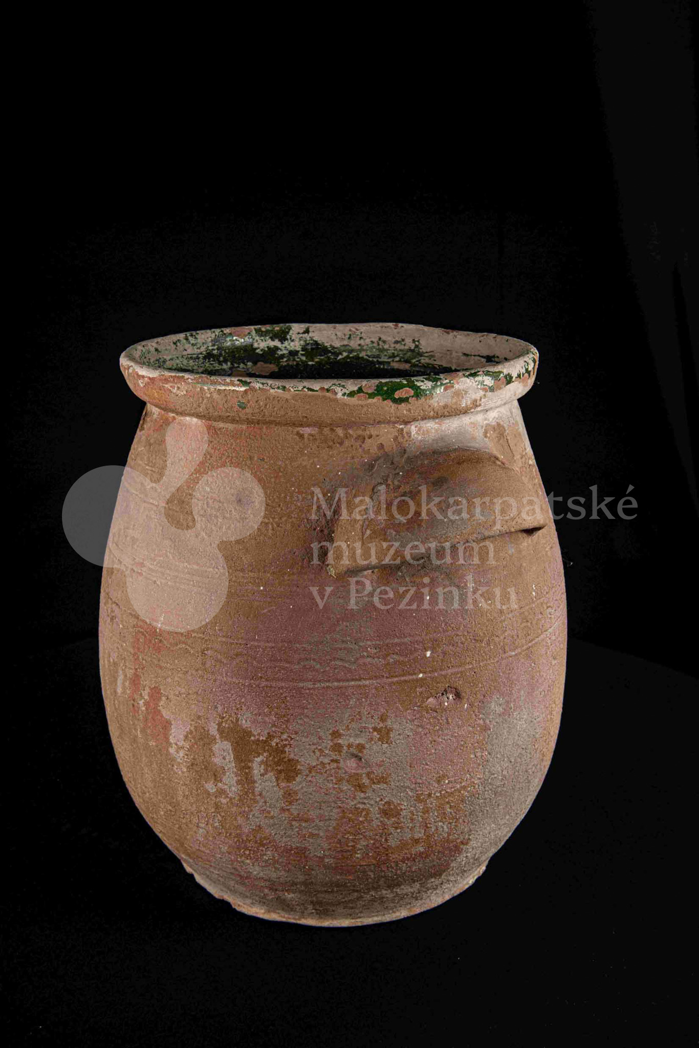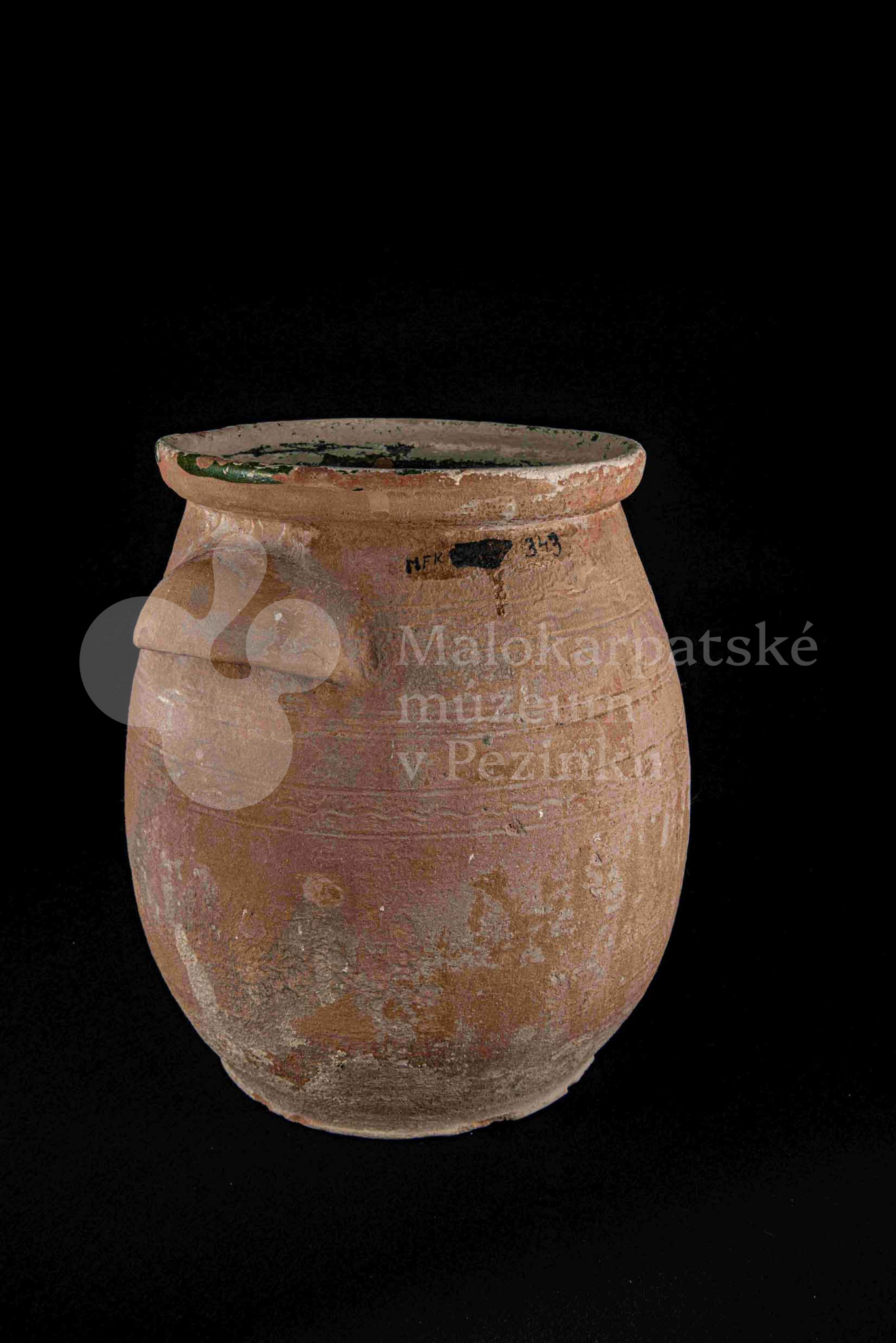 Hrniec sudkovitého tvaru, z raz pálenej hliny – hrnčarina – zvnútra poliaty zelenou olovnatou glazúrou silne poškodenou. Má dve plné uši. Bez značenia.