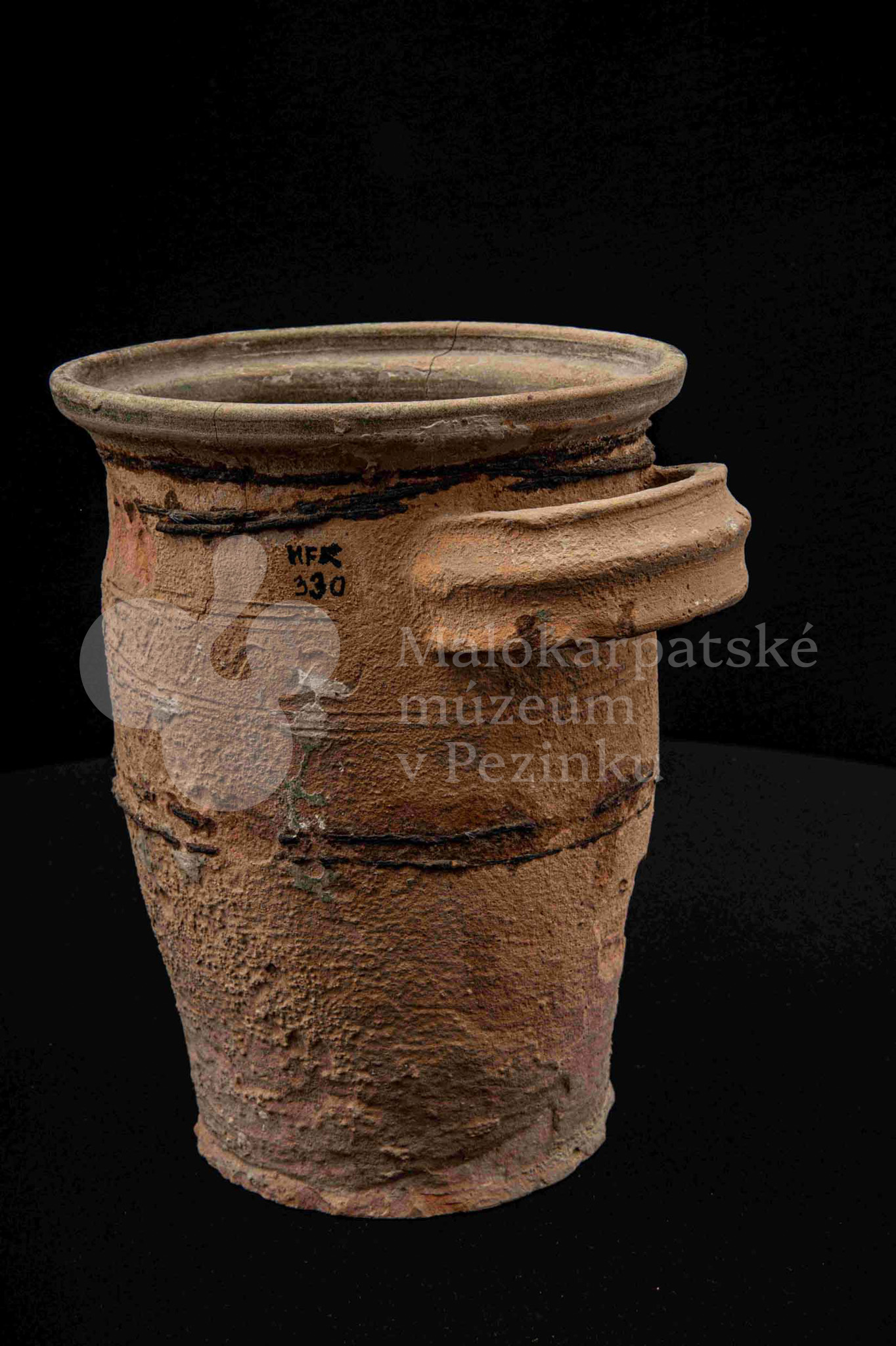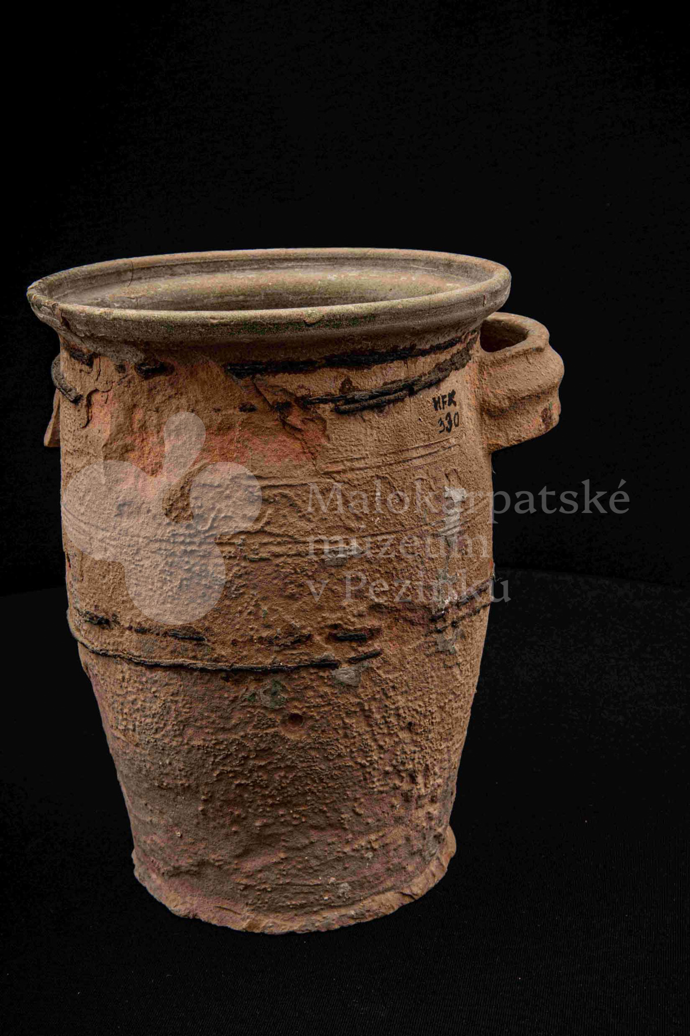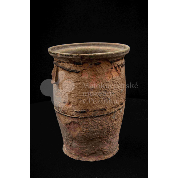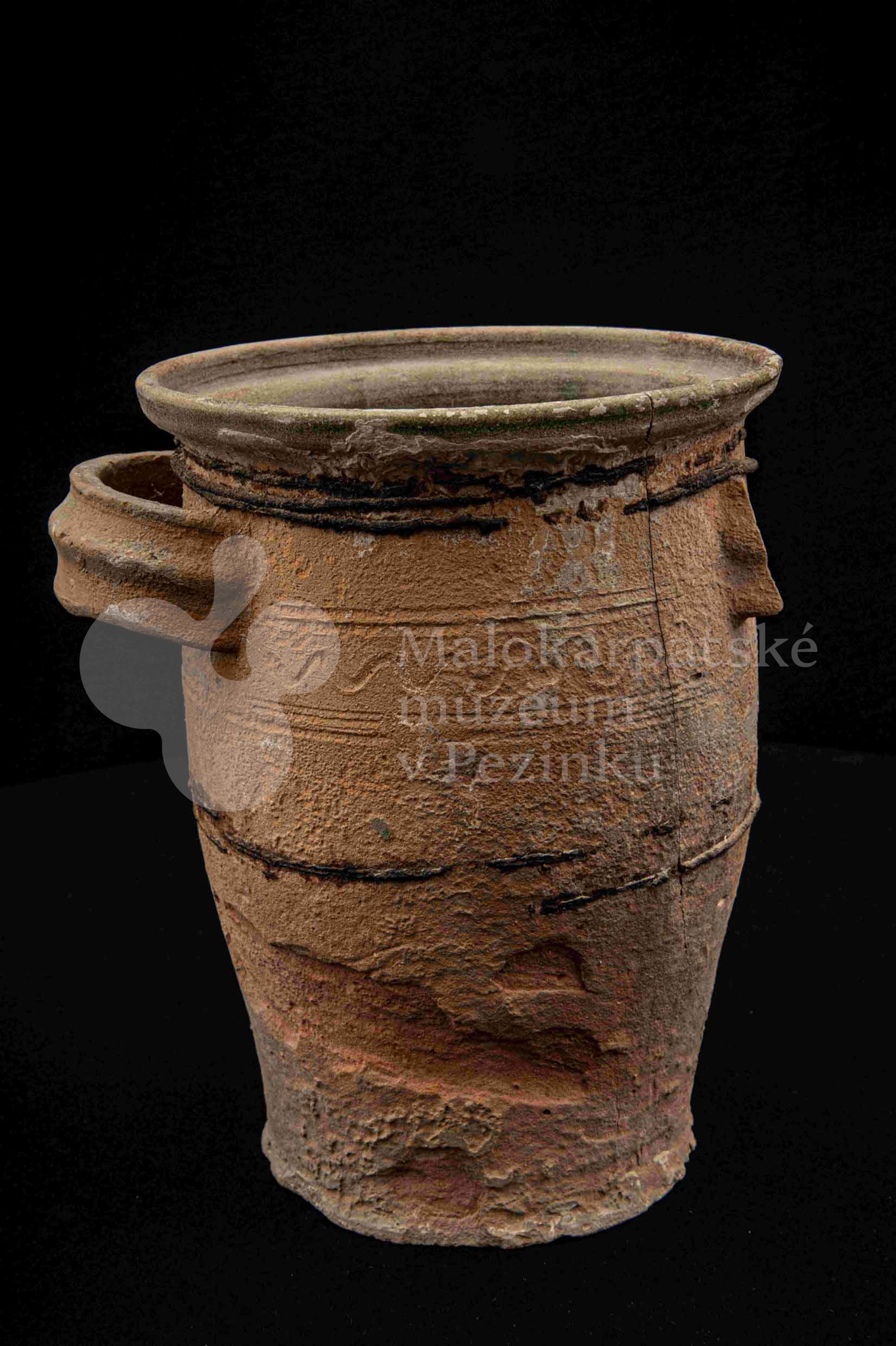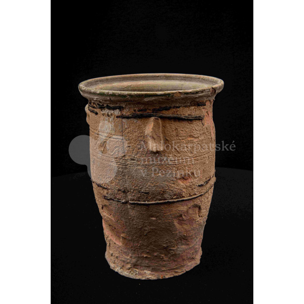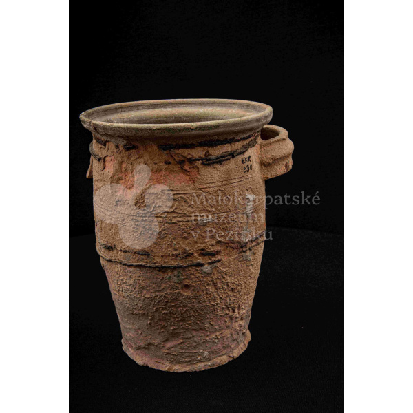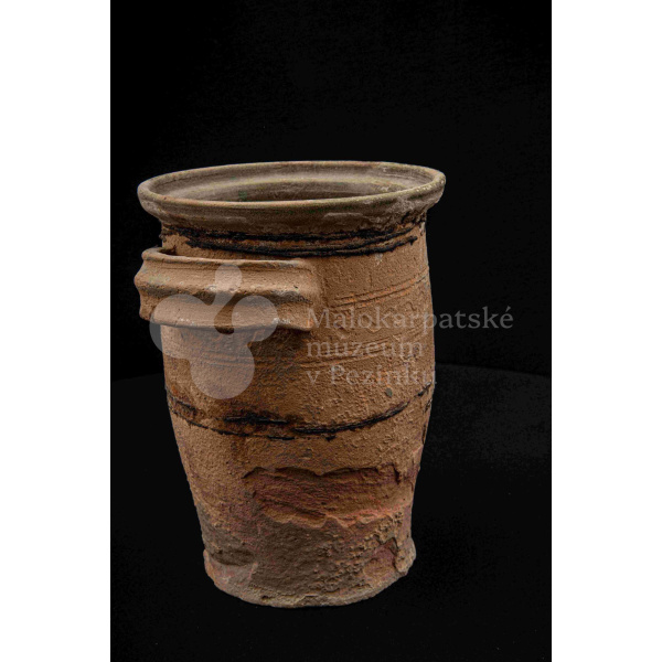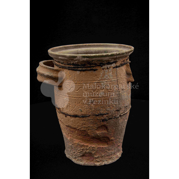 Neglazovaný hrniec, spevnený drôtom, s jedným uchom, druhé je odrazené. Poškodený.