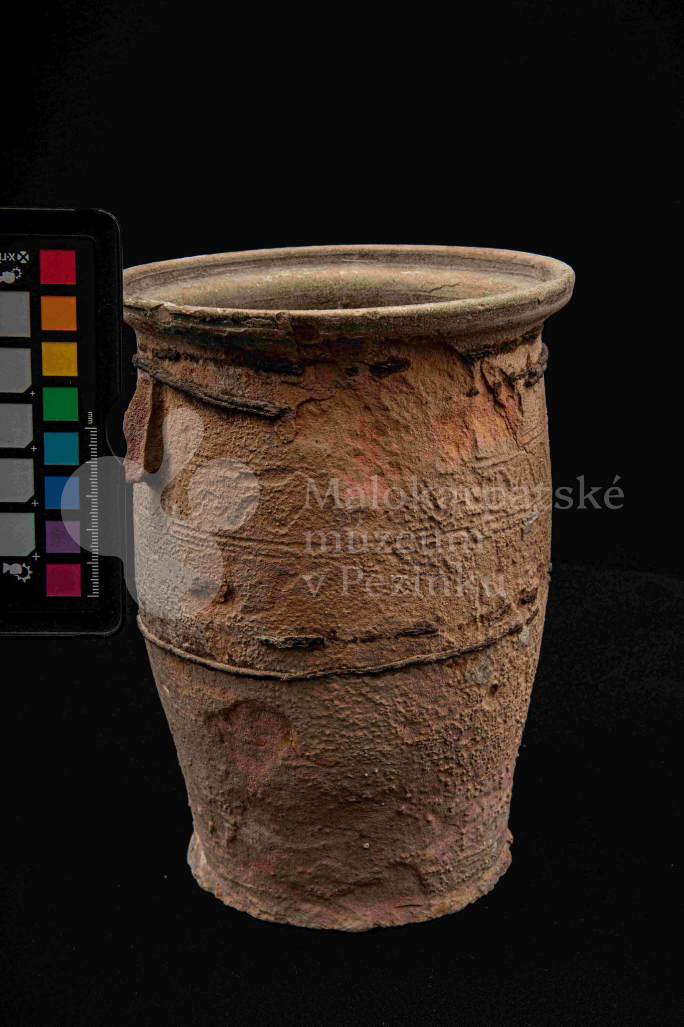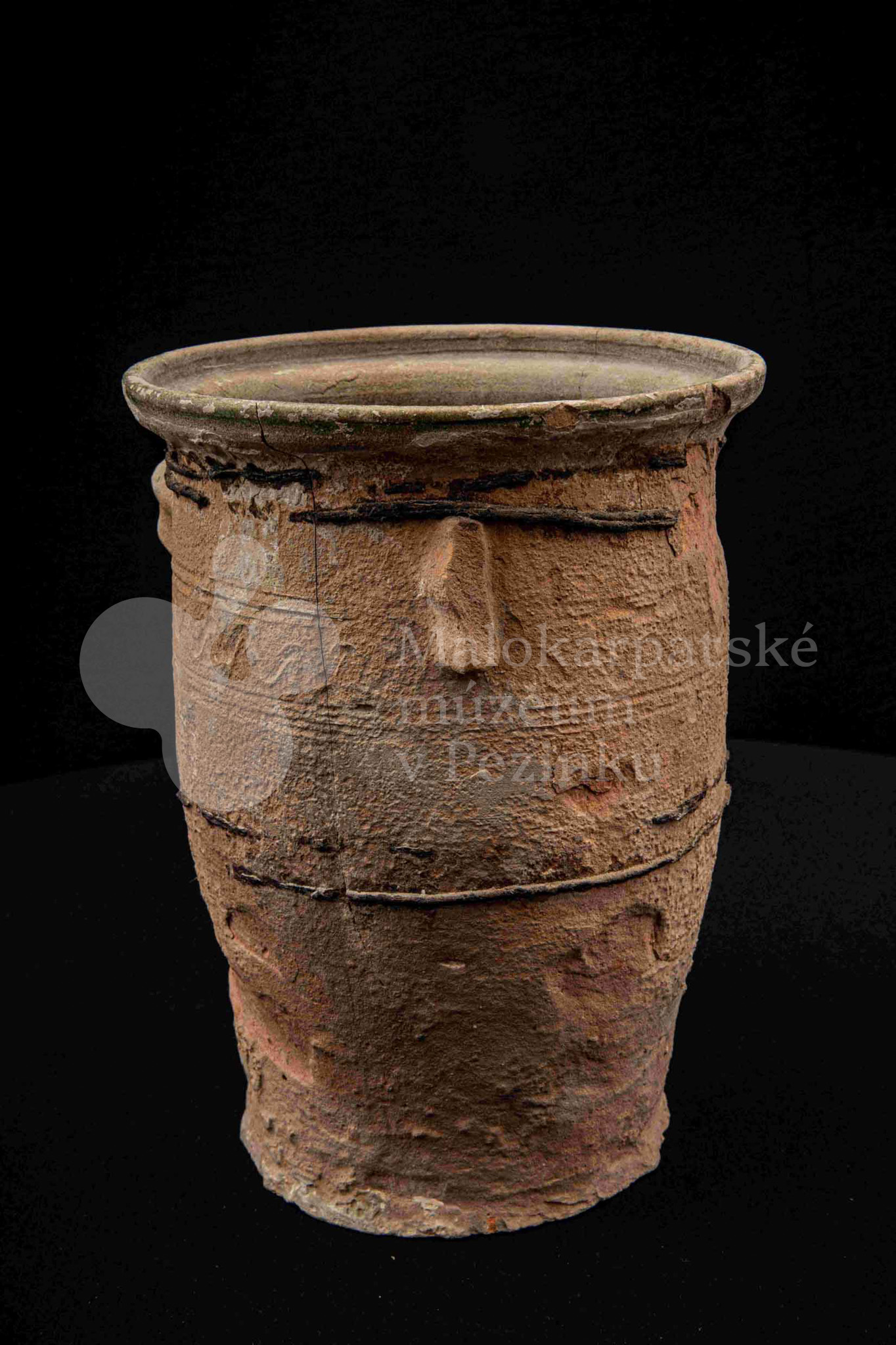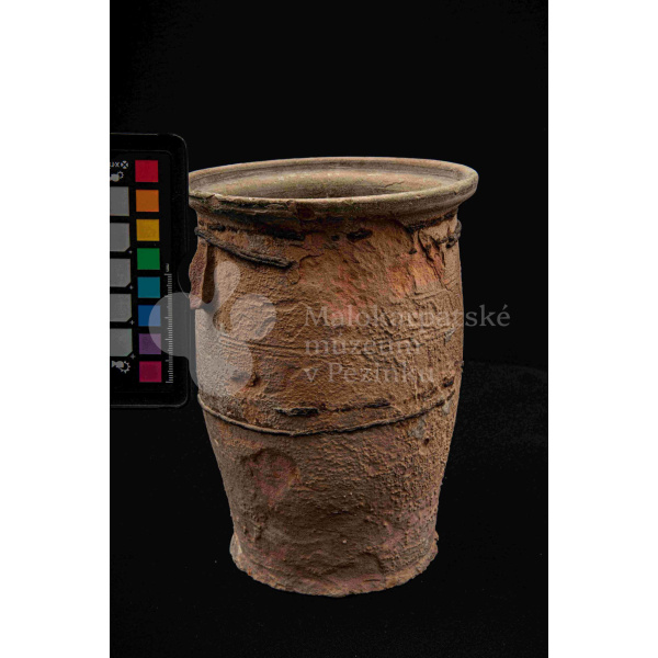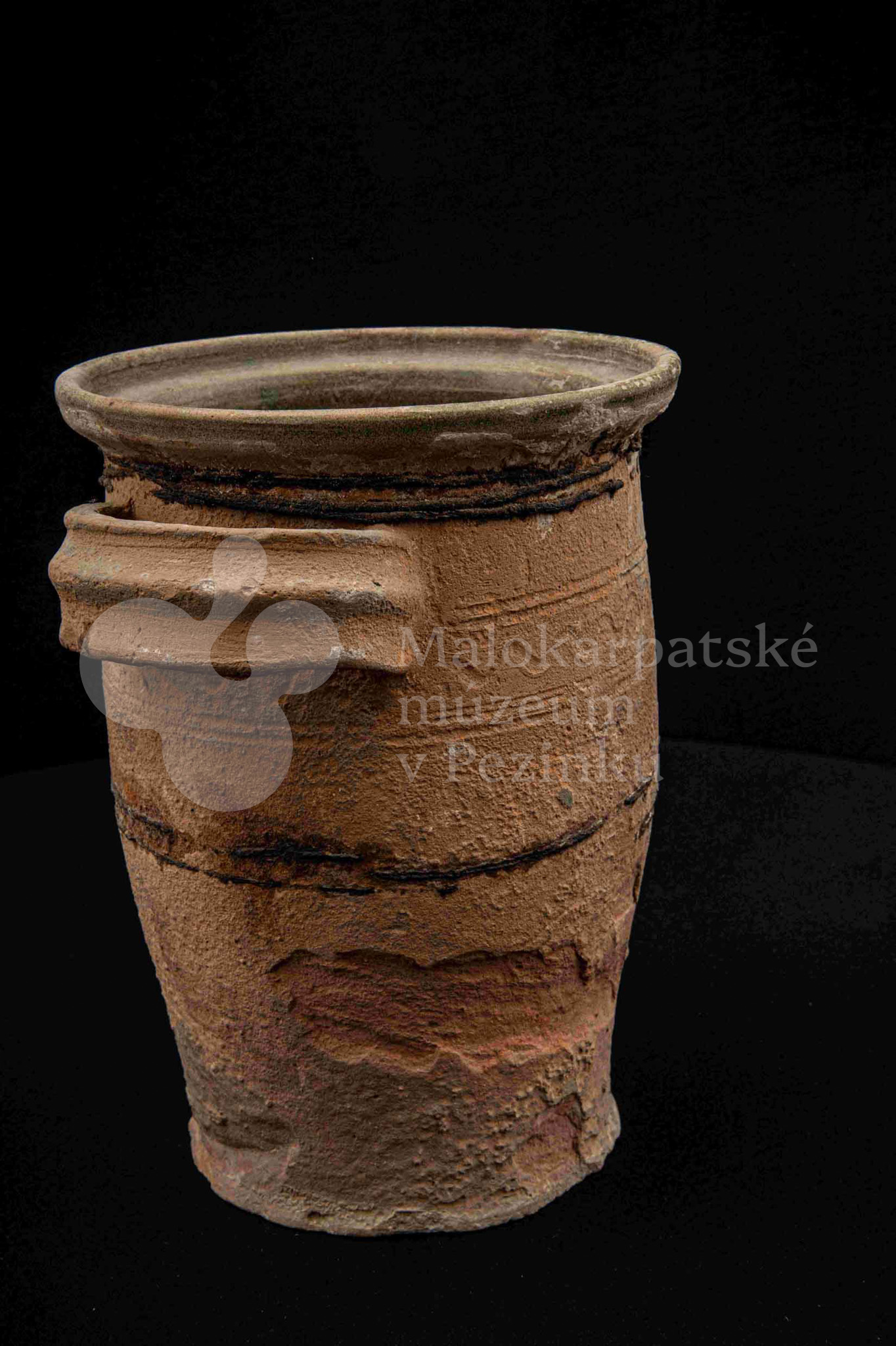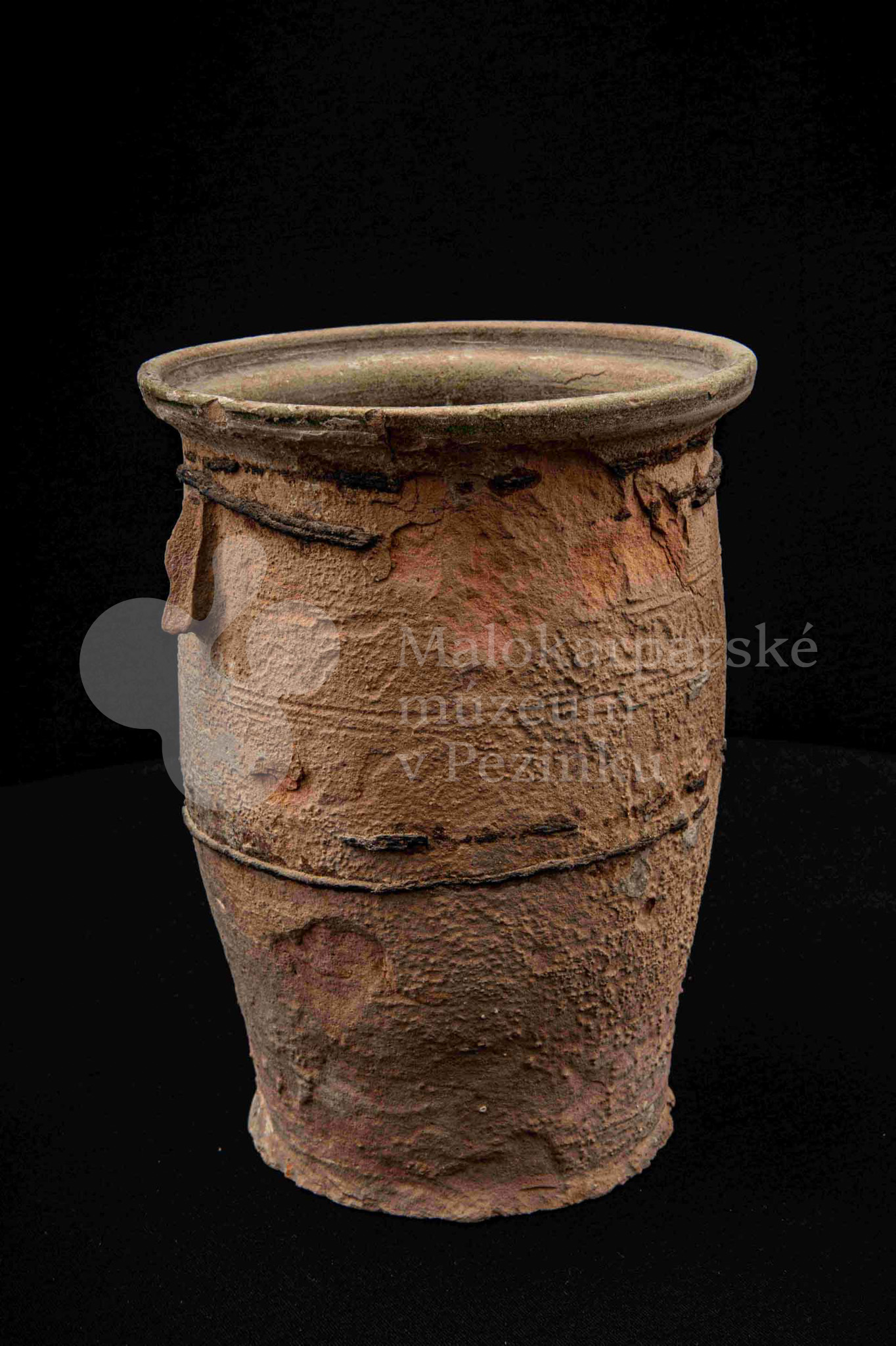 Neglazovaný hrniec, spevnený drôtom, s jedným uchom, druhé je odrazené. Poškodený.