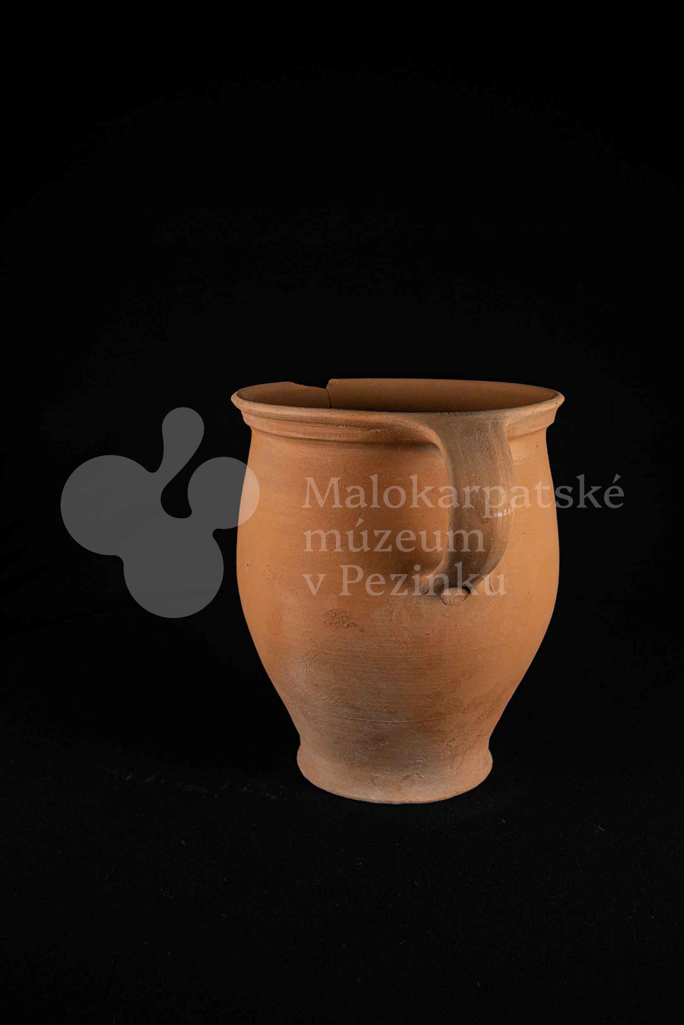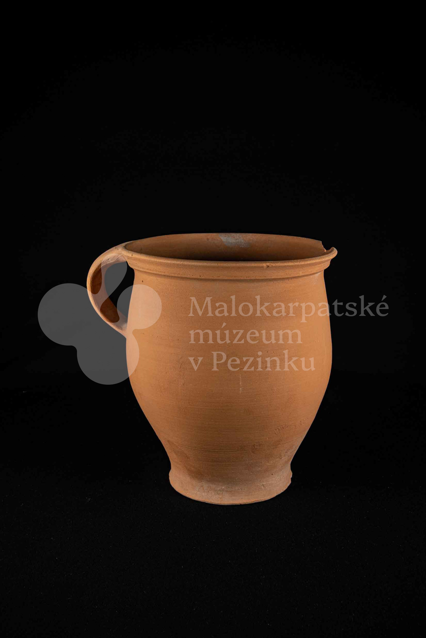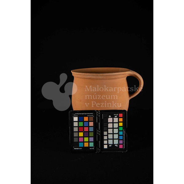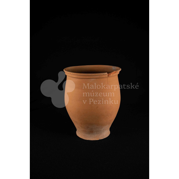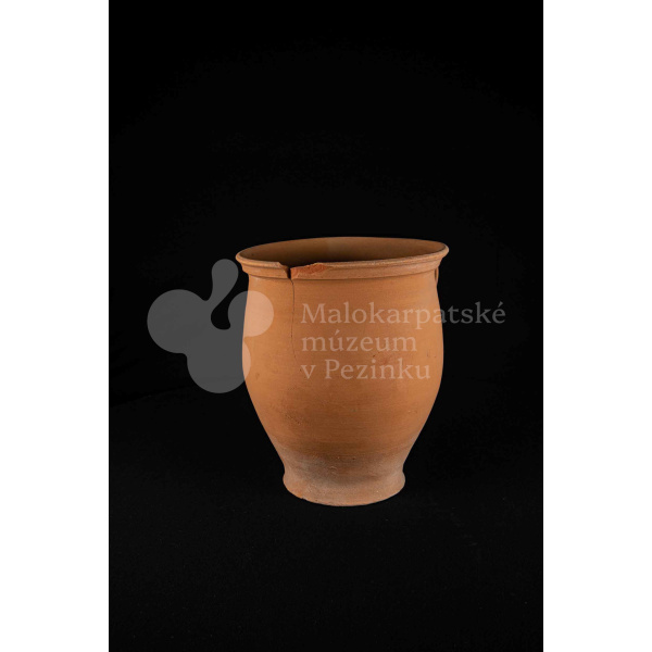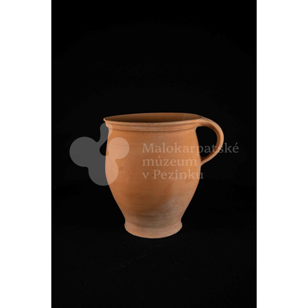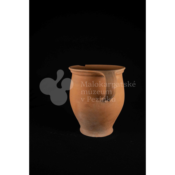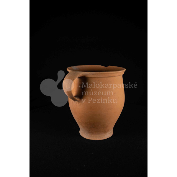Hrniec neglazovaný, s jedným uchom, hrnčarina, obsahujúci olovo potrebné na prípravu keramických glazúr. Má široký otvor. Kraj je odrozbitý. Bez značenia.