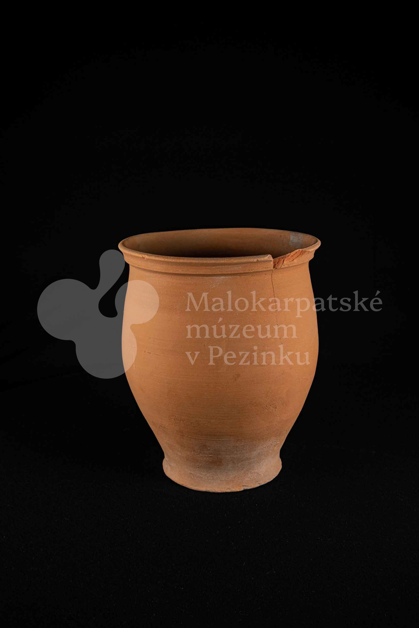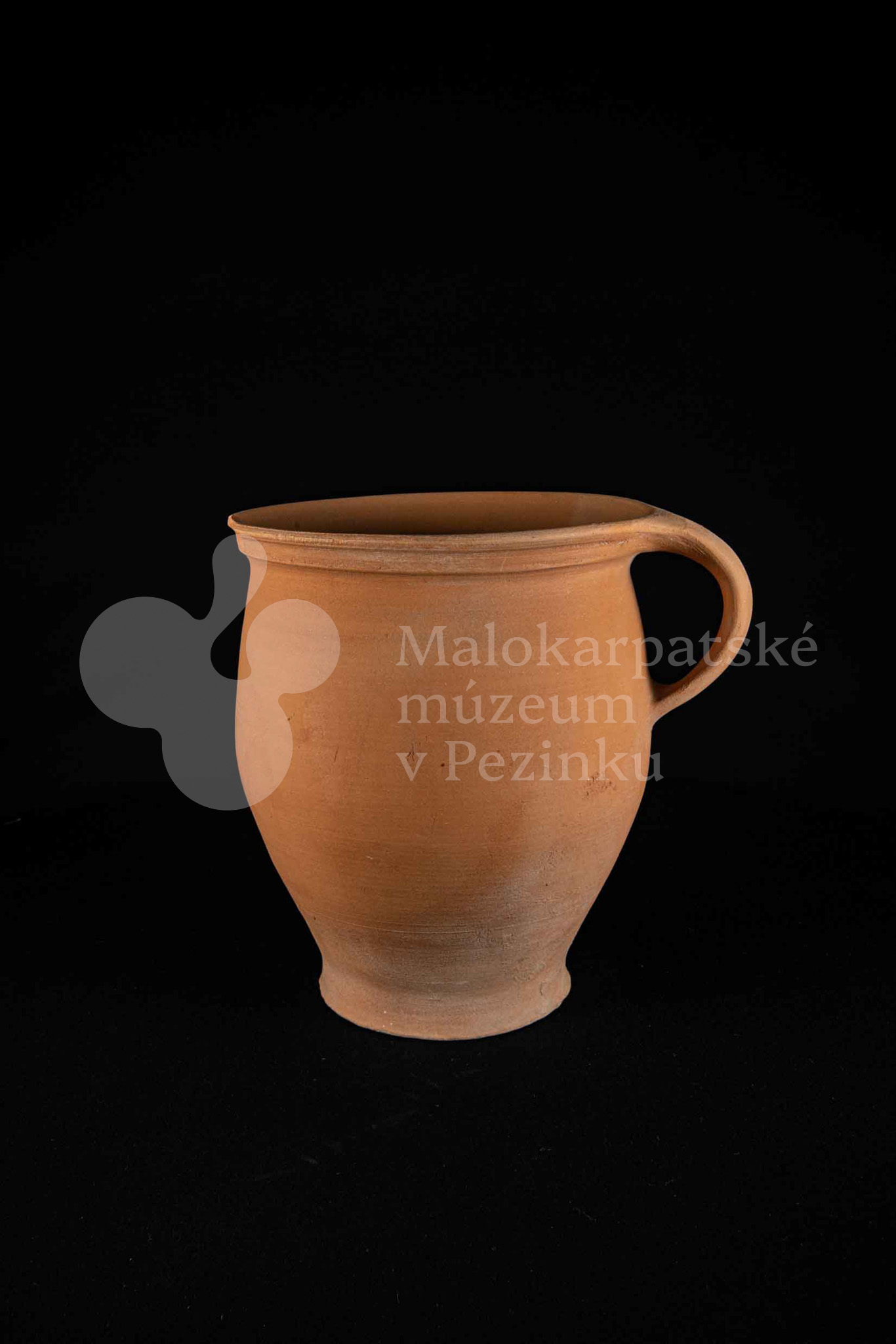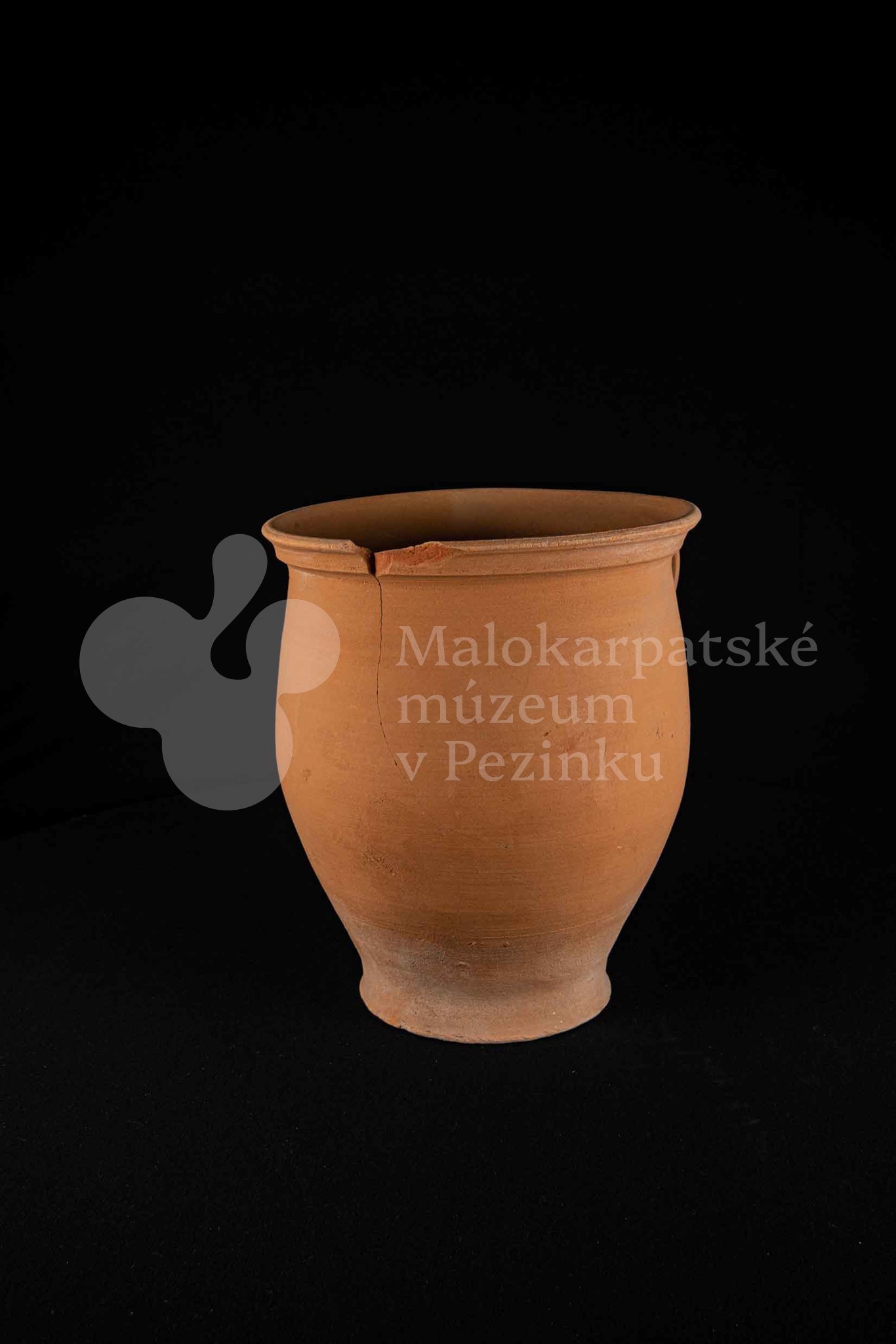 Hrniec neglazovaný, s jedným uchom, hrnčarina, obsahujúci olovo potrebné na prípravu keramických glazúr. Má široký otvor. Kraj je odrozbitý. Bez značenia.