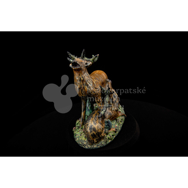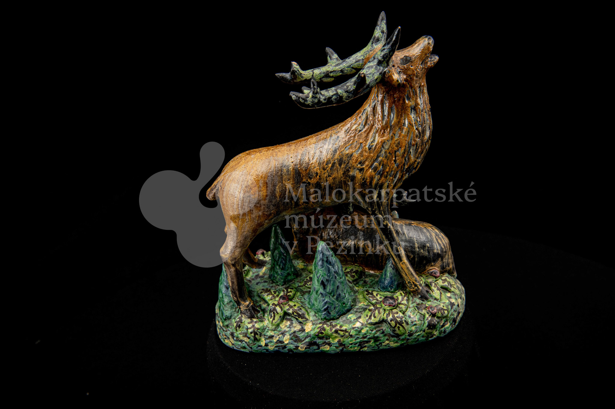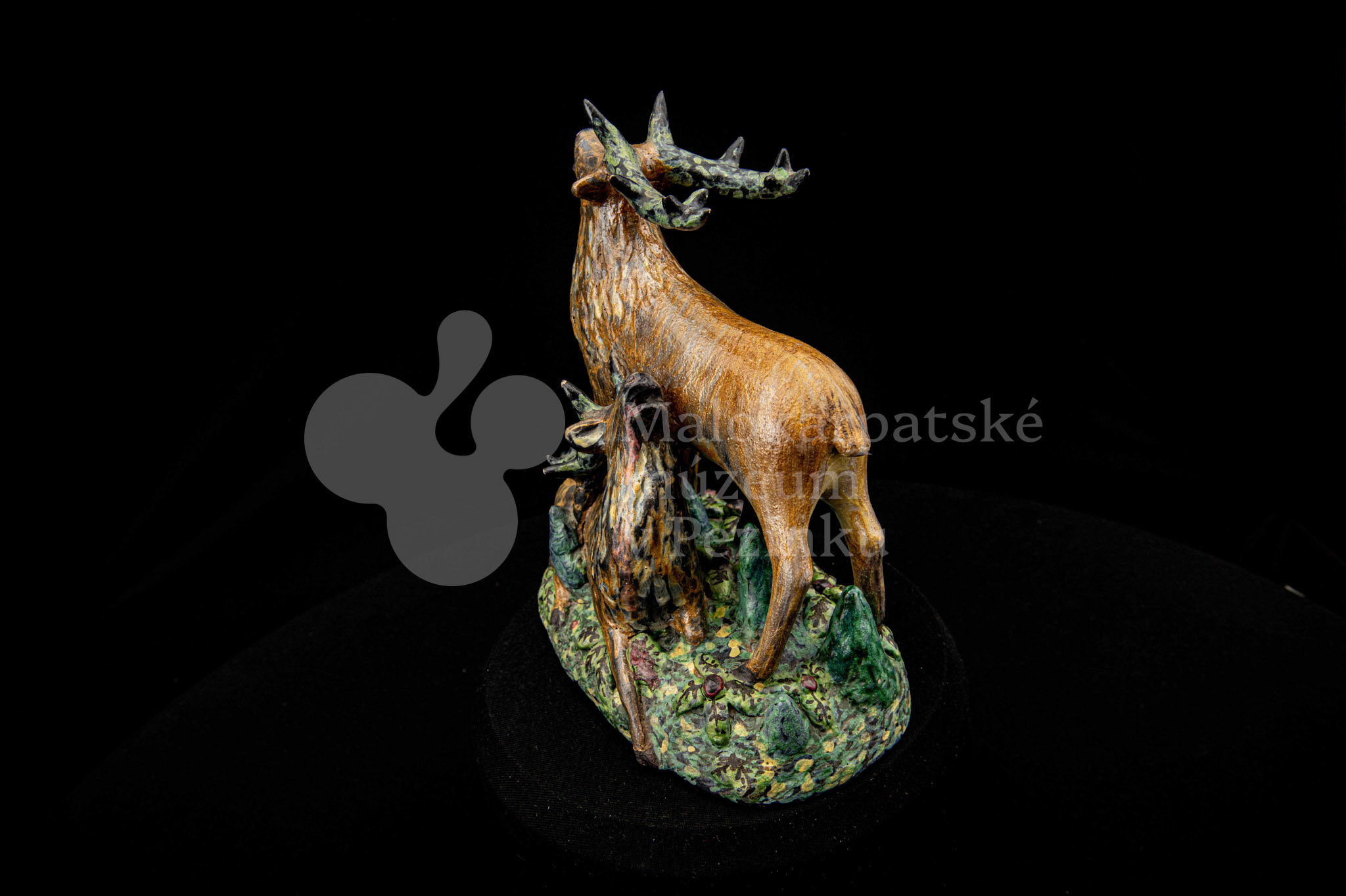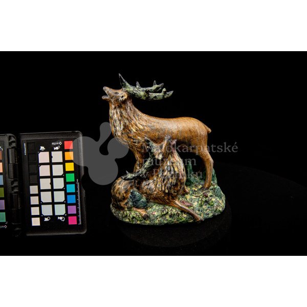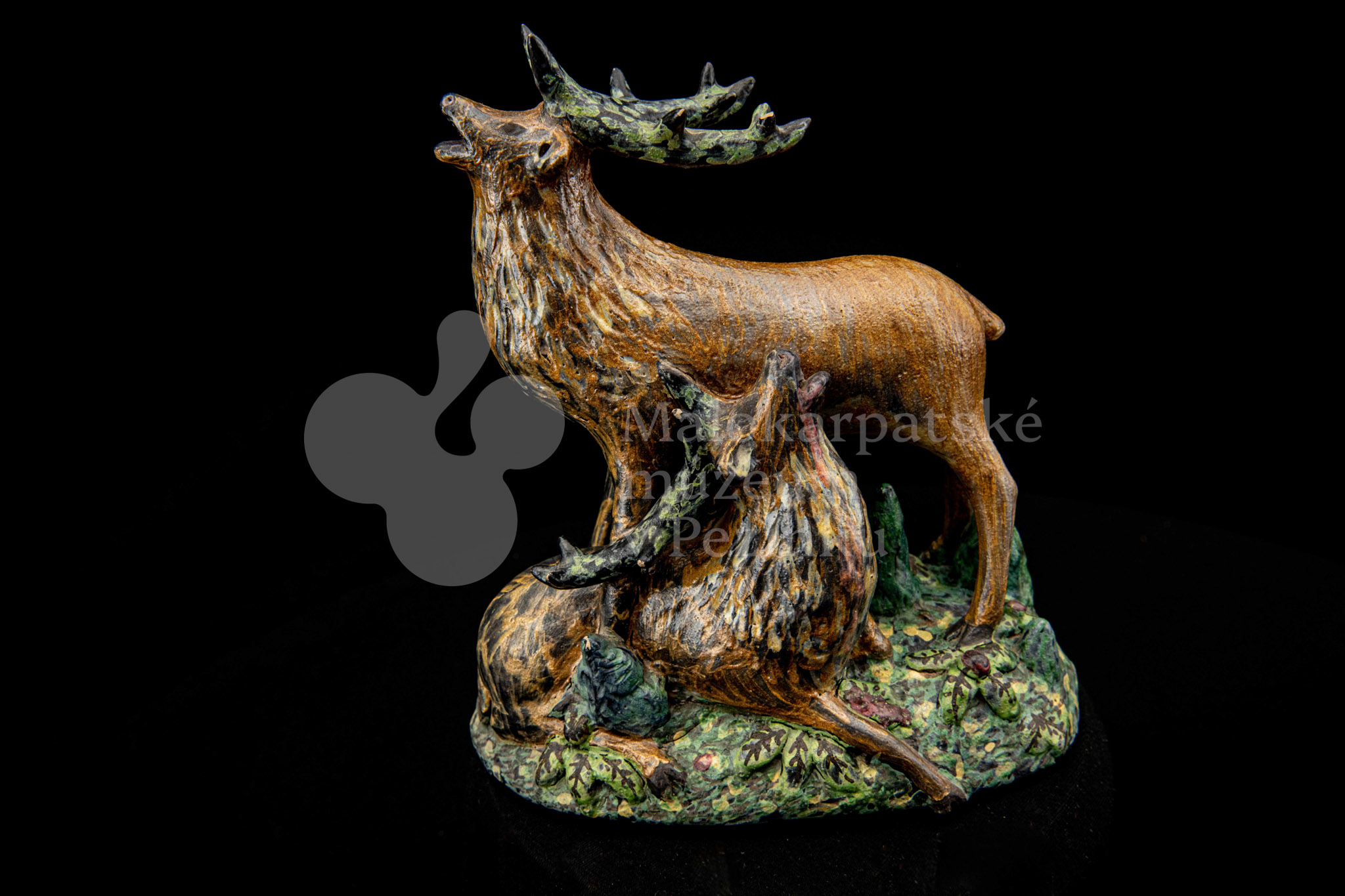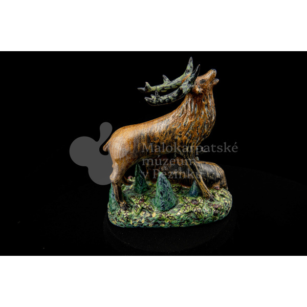 Plastika fajansová – na oválnom podstavci 1 ležiaci a 1 stojaci jeleň pri bitke. Okolo nich niekoľko malých kríčkov. Prevláda farba tmavozelená a hnedožltá. Na rube podstavca značené FK.ST.