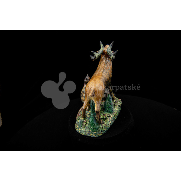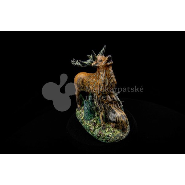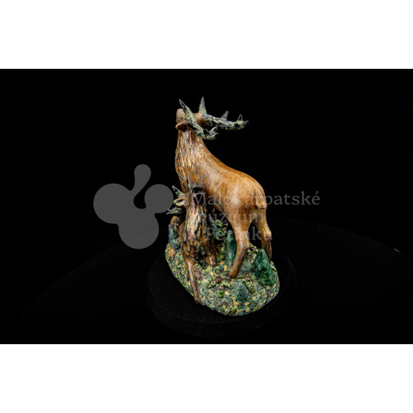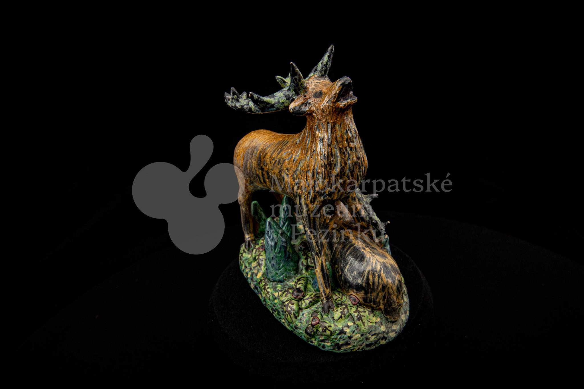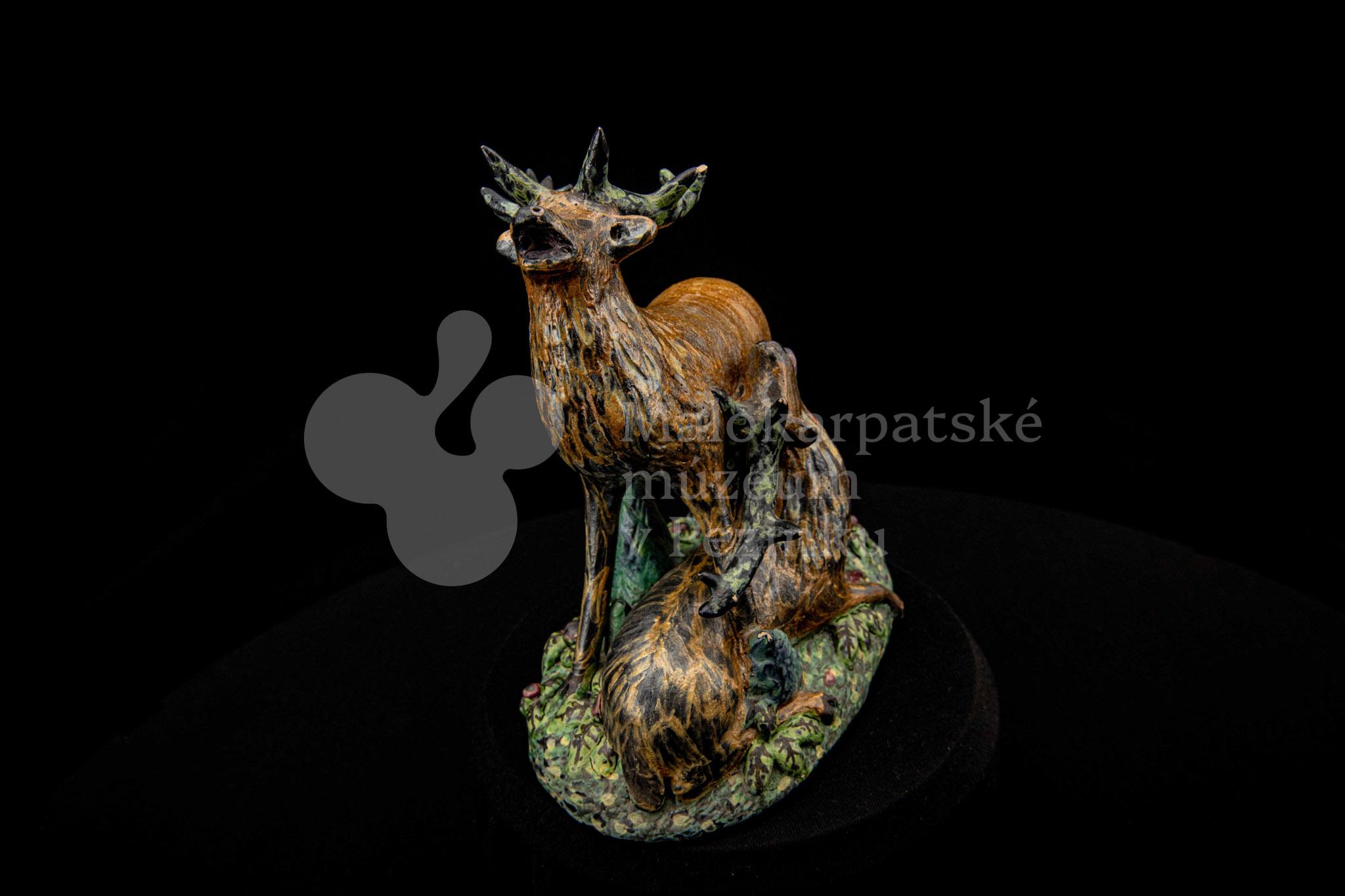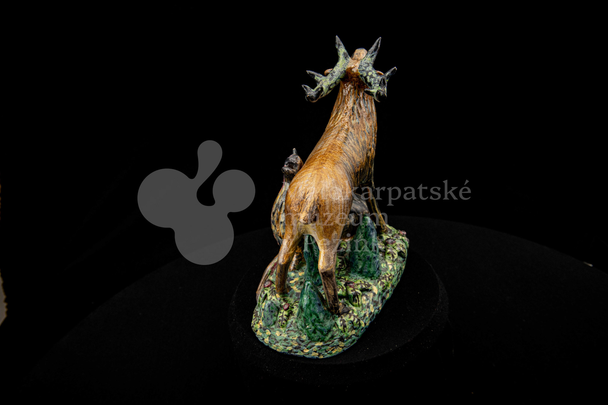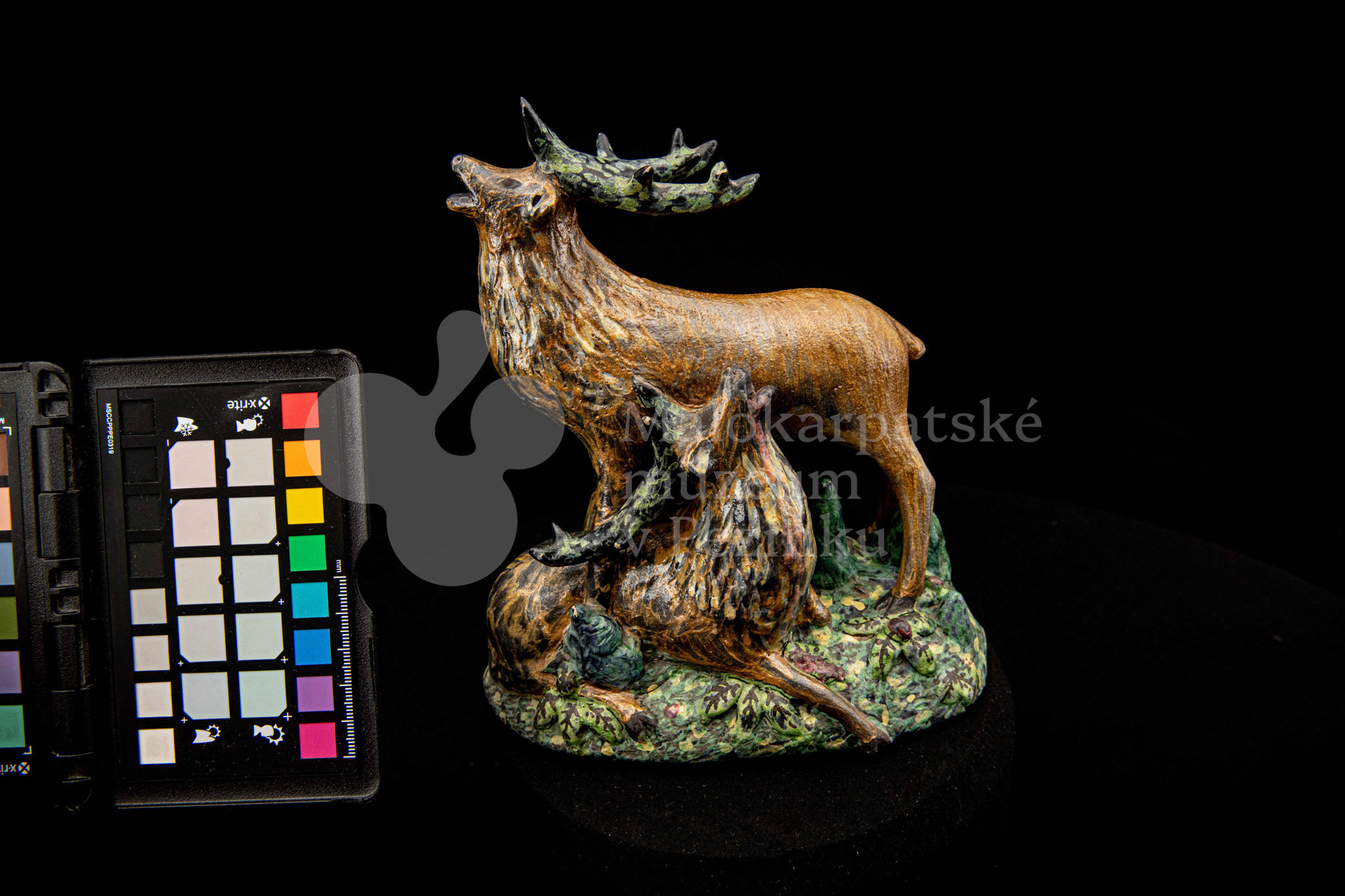 Plastika fajansová – na oválnom podstavci 1 ležiaci a 1 stojaci jeleň pri bitke. Okolo nich niekoľko malých kríčkov. Prevláda farba tmavozelená a hnedožltá. Na rube podstavca značené FK.ST.