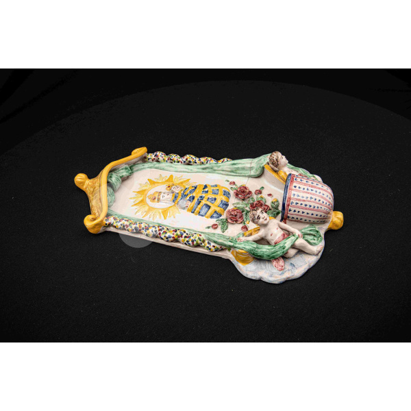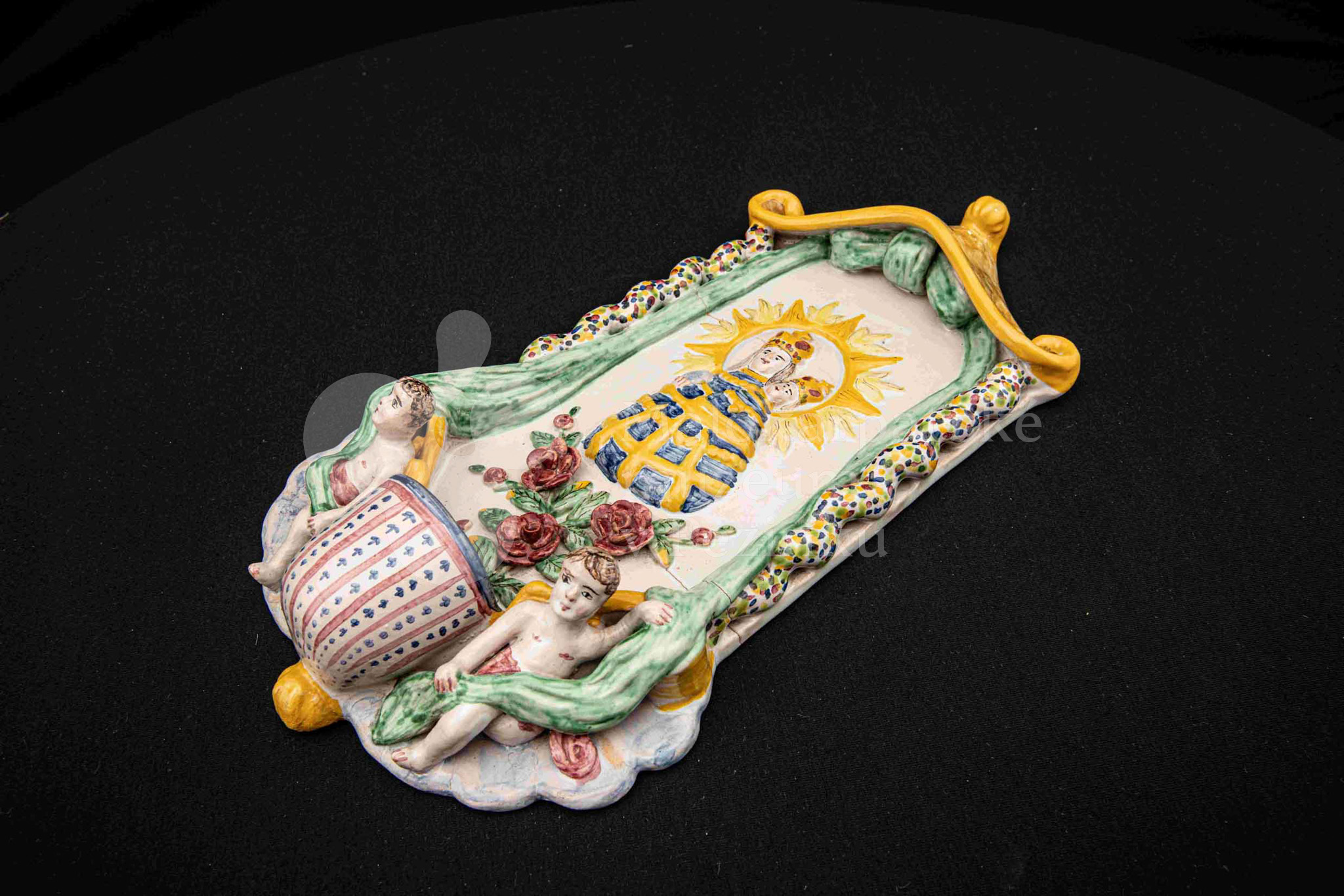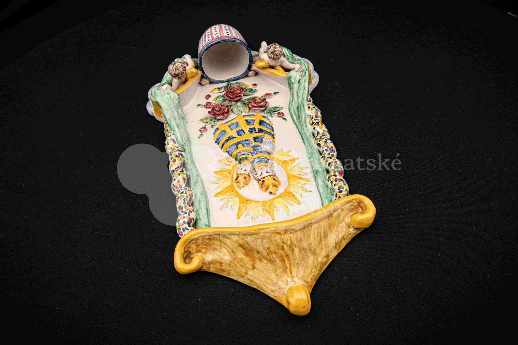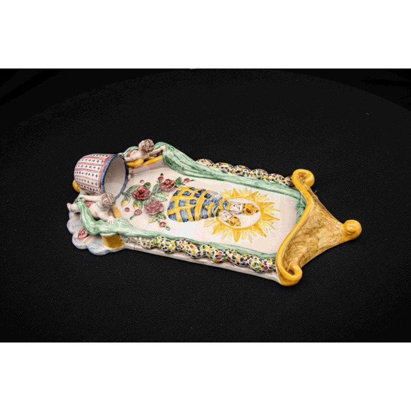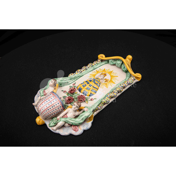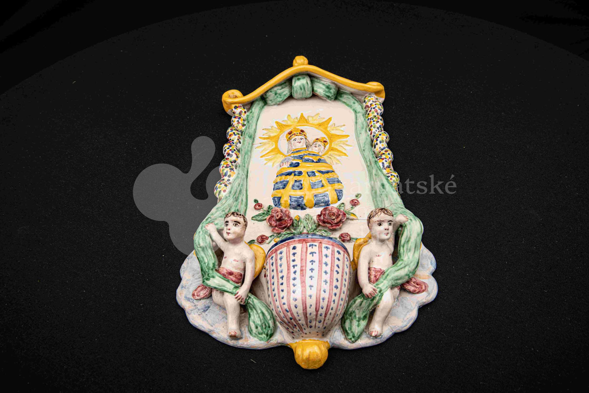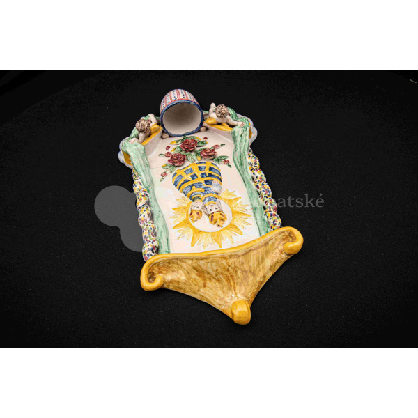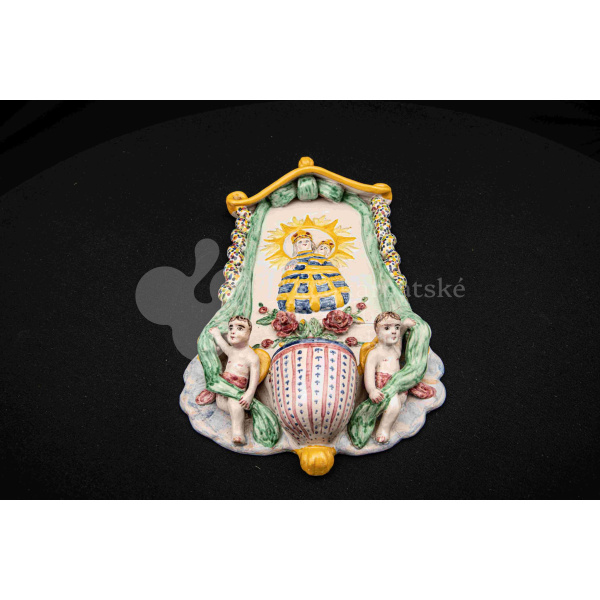 Závesná kaplička – večné svetlo, fajansový reliéf, dielo Ferdiša Kostku z r. 1948, v. 36 cm