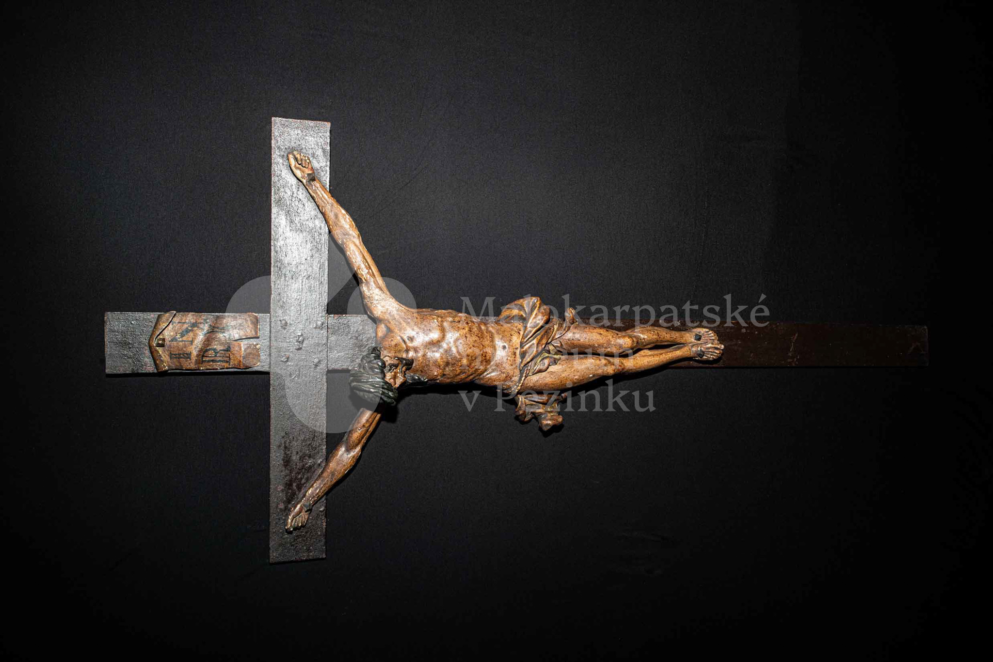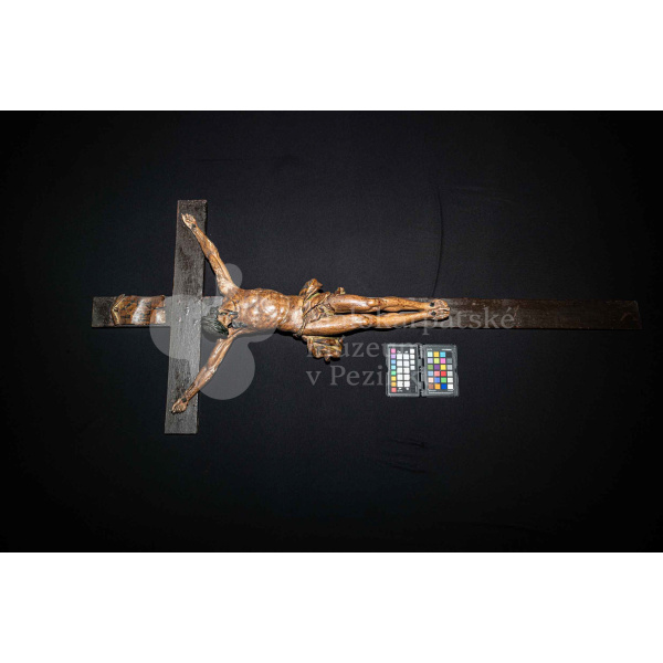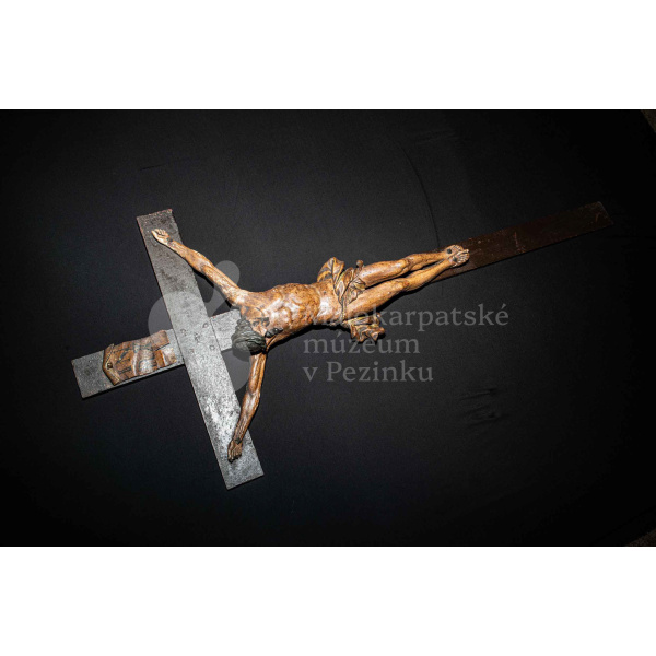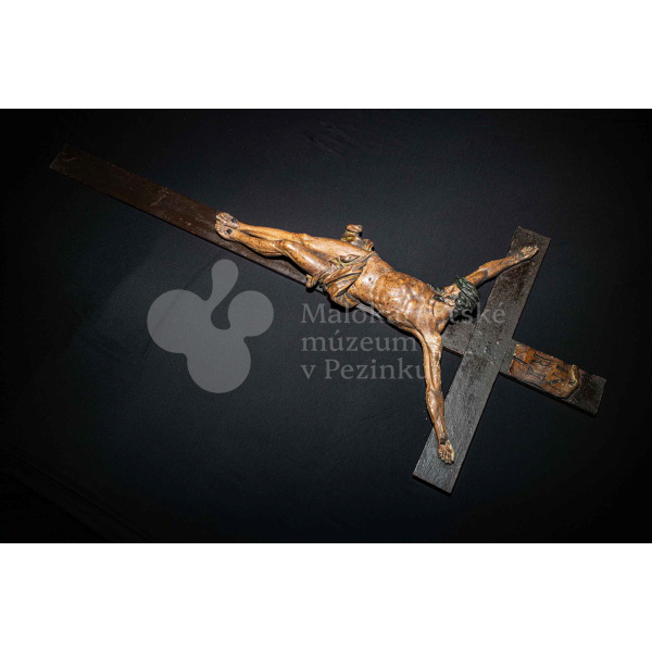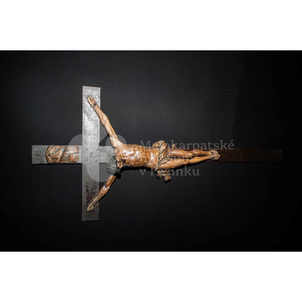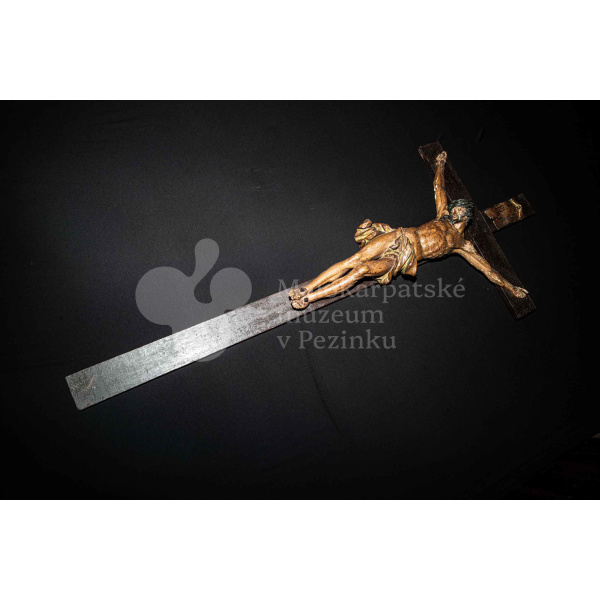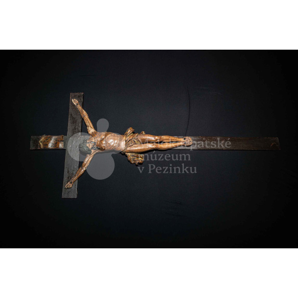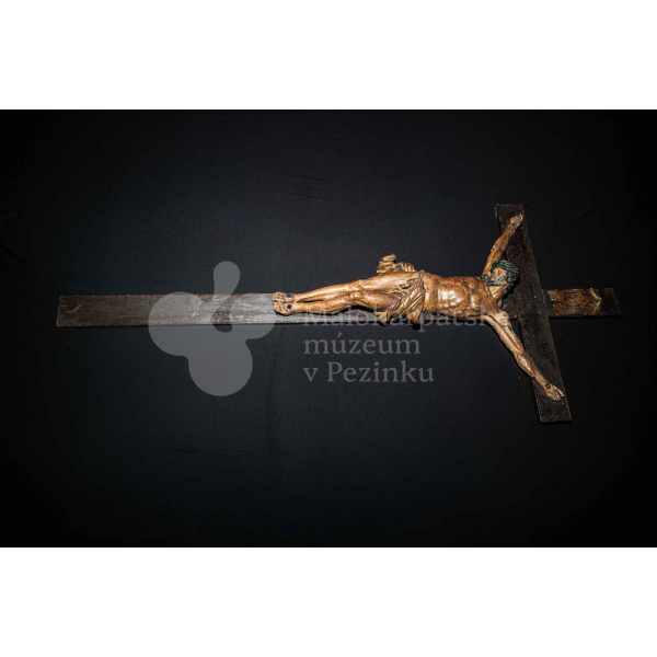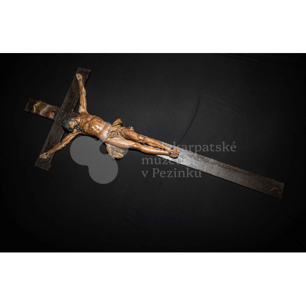 Kríž drevený čiernej farby. Korpus sadrový, patinovaný. Hore štítok s nápisom INRI /poškodený/.