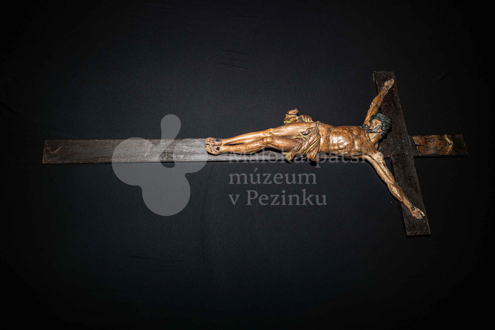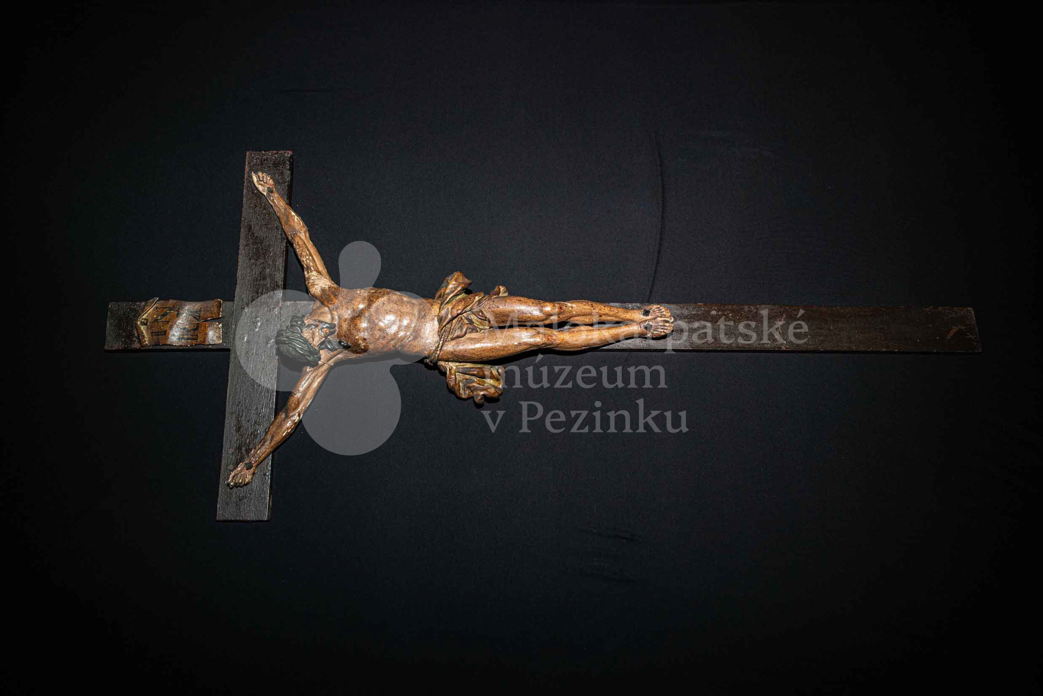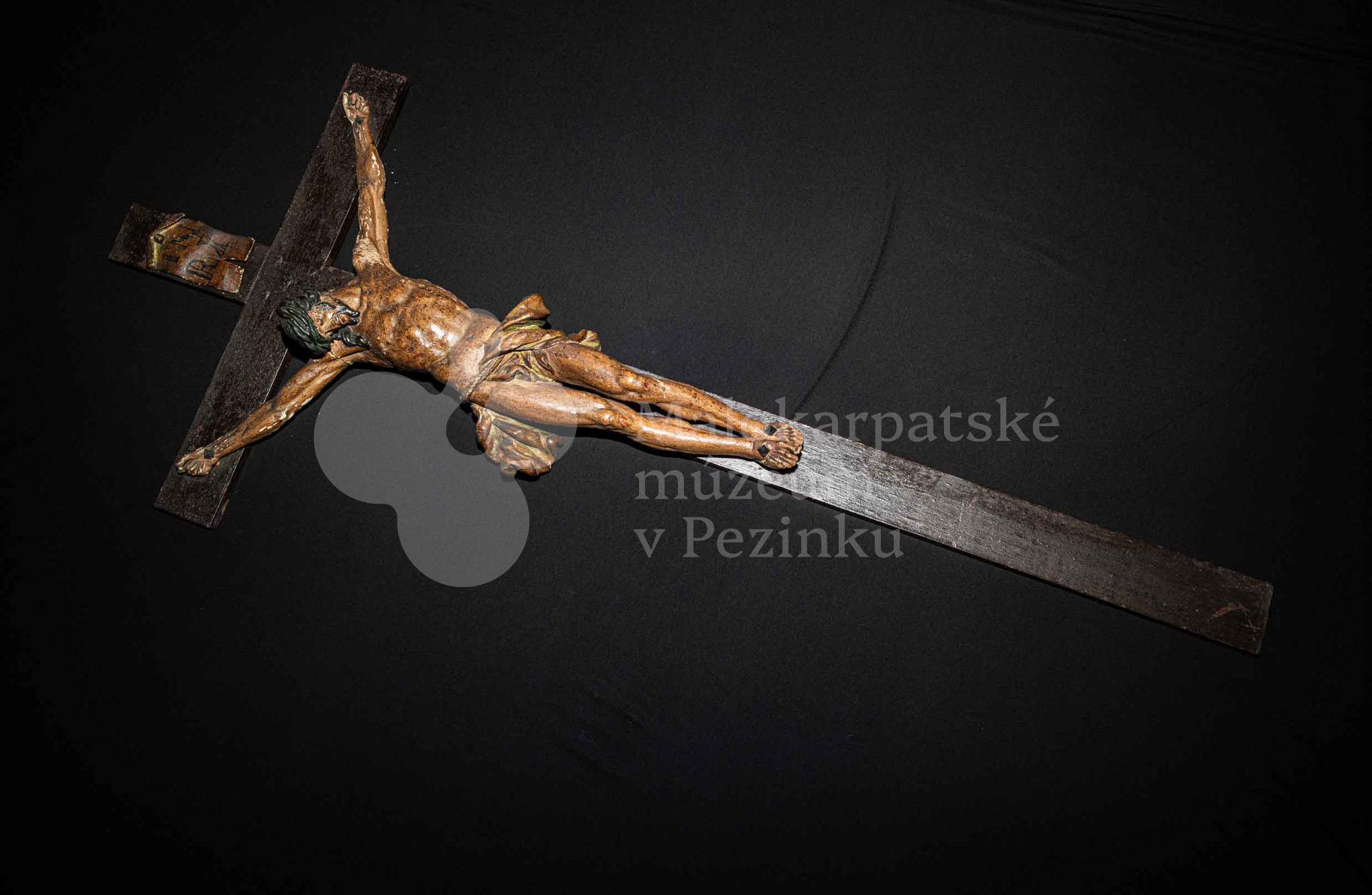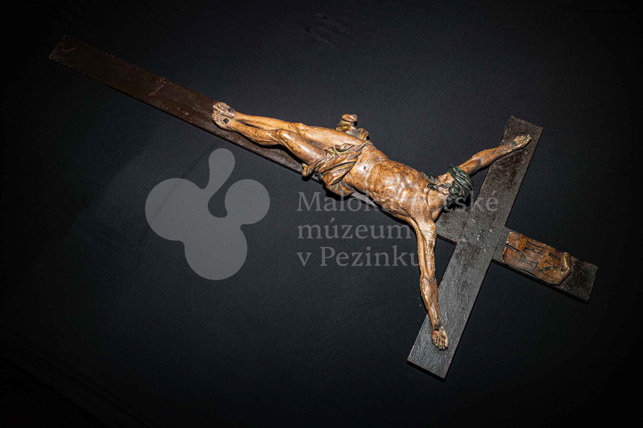 Kríž drevený čiernej farby. Korpus sadrový, patinovaný. Hore štítok s nápisom INRI /poškodený/.