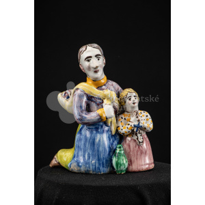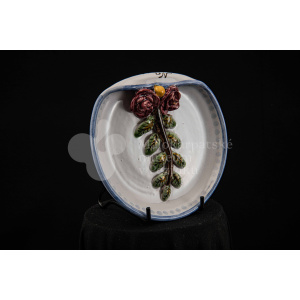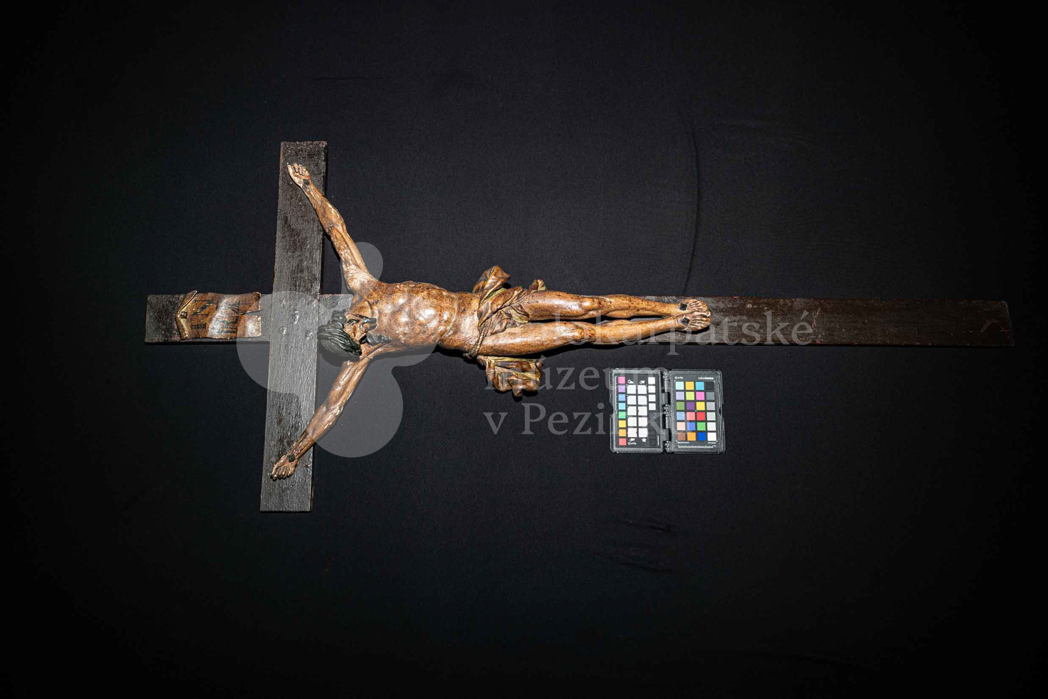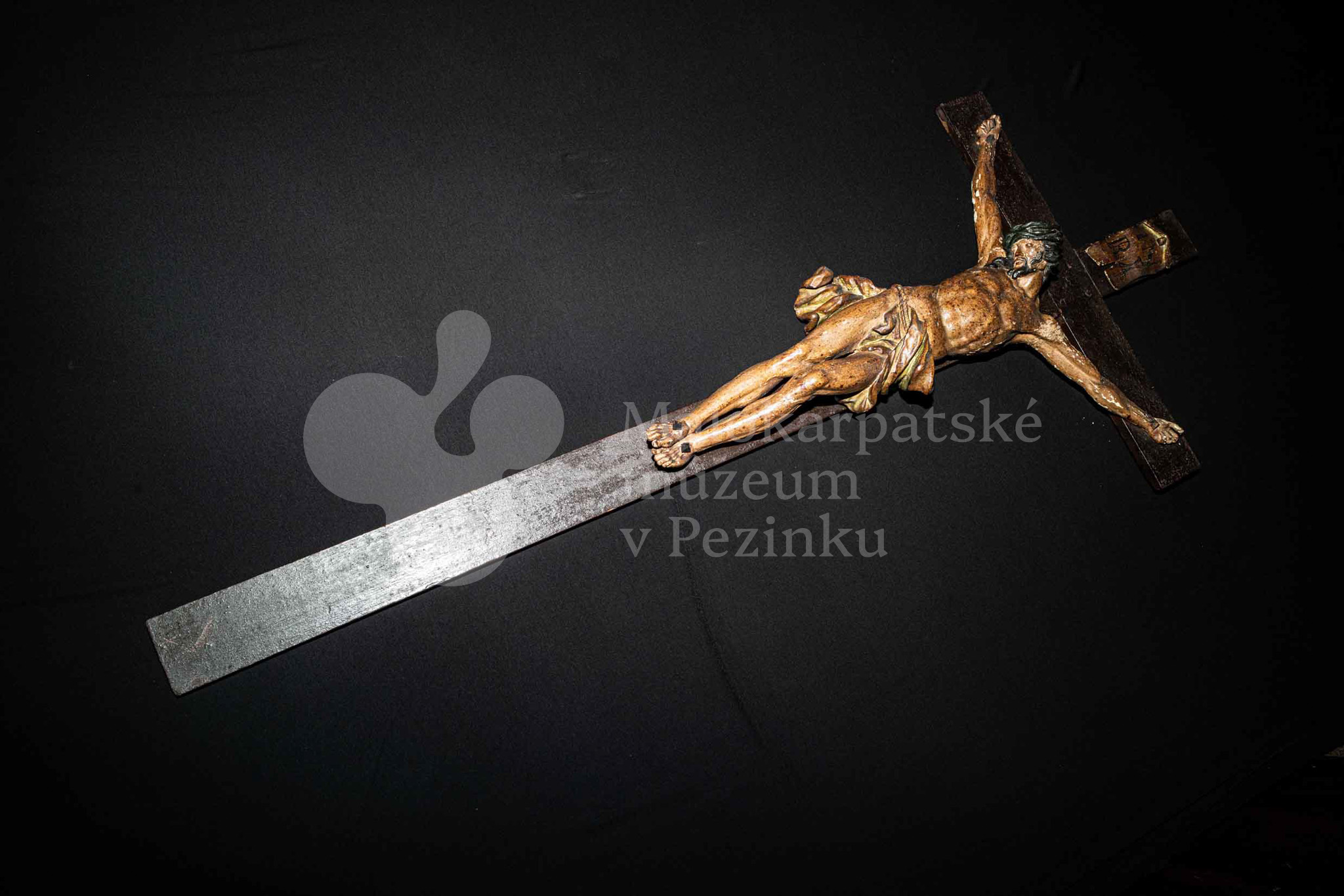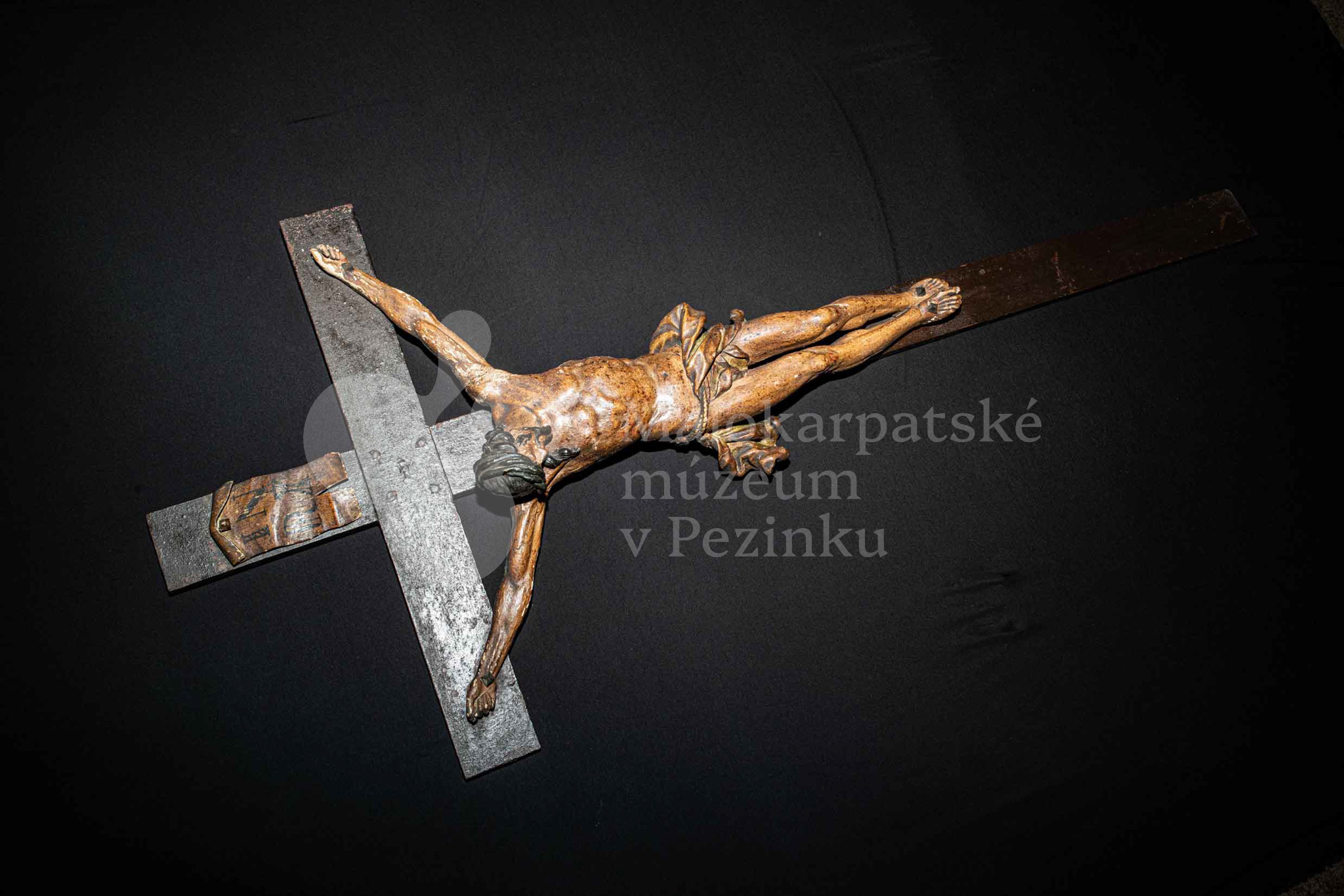 Kríž drevený čiernej farby. Korpus sadrový, patinovaný. Hore štítok s nápisom INRI /poškodený/.