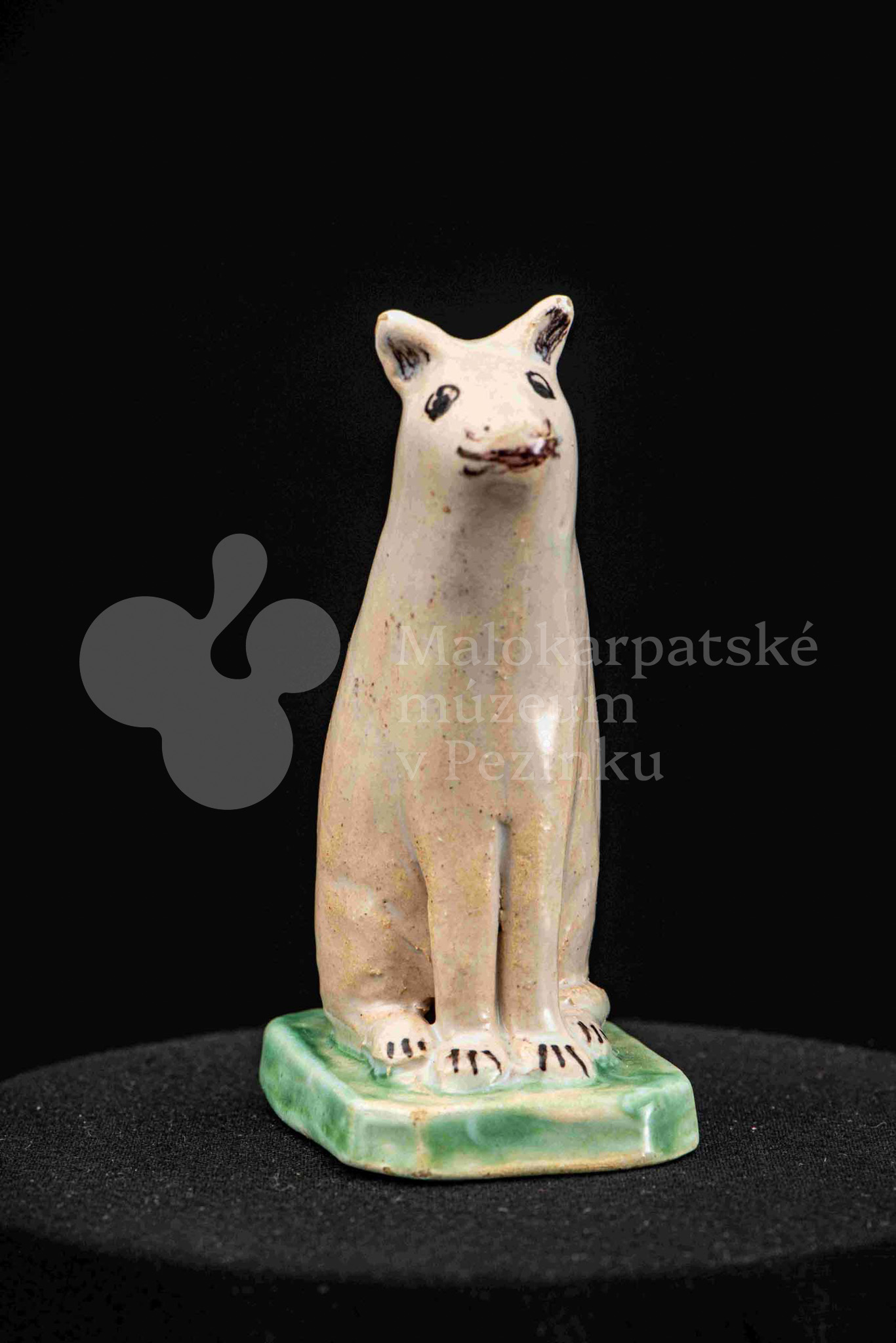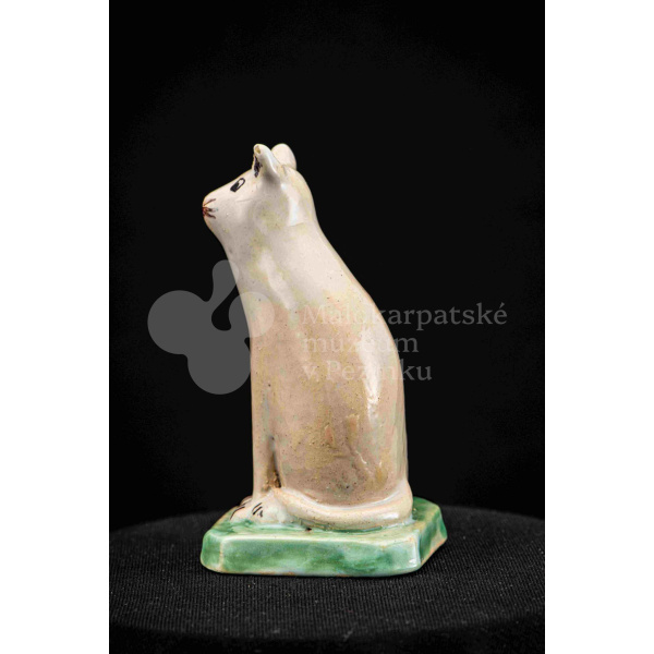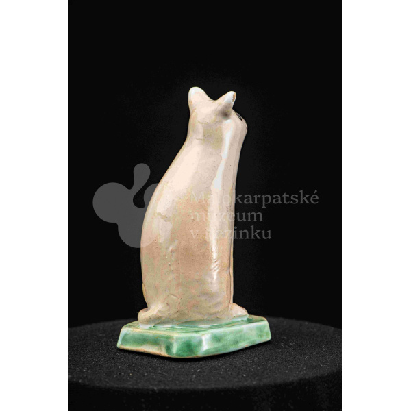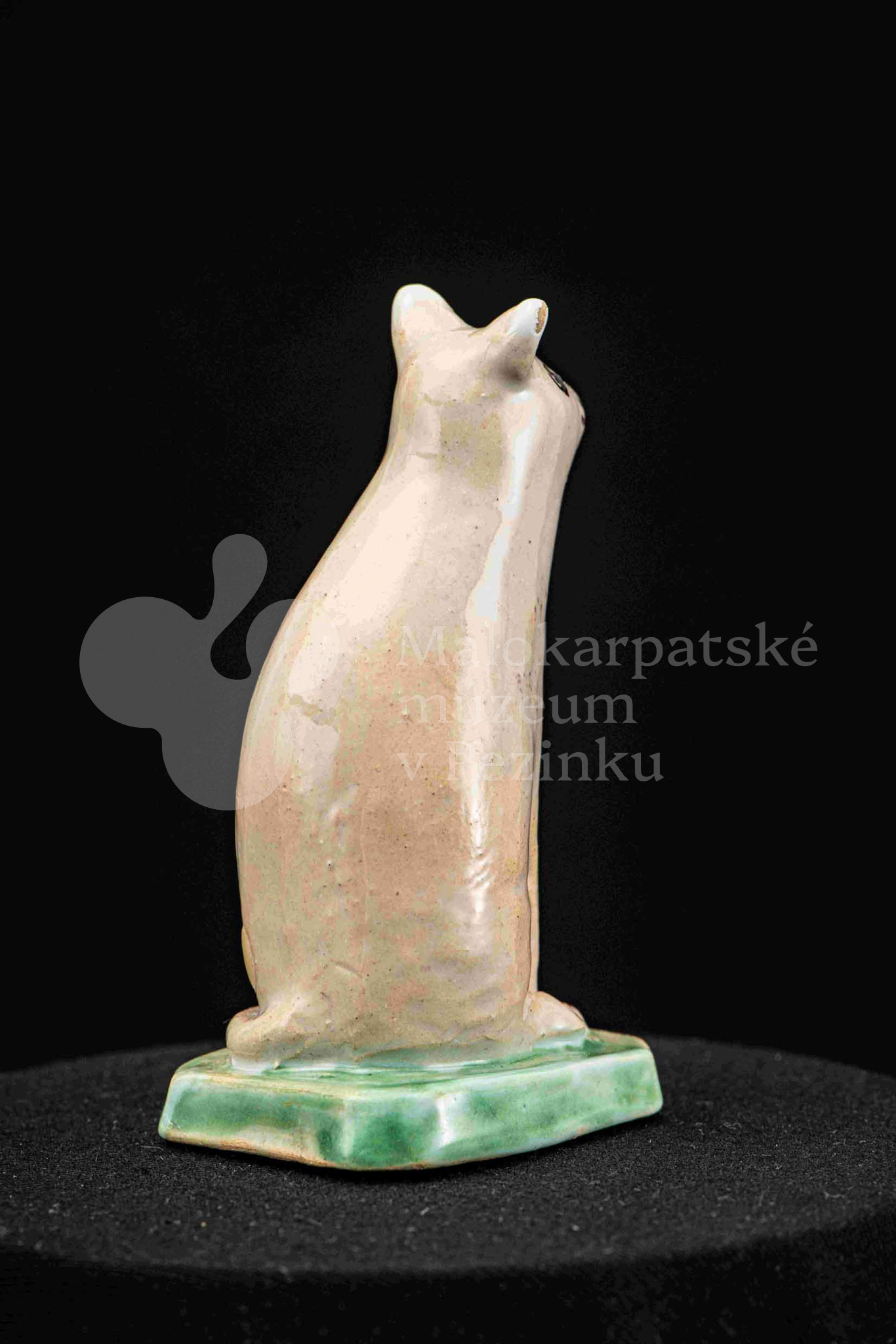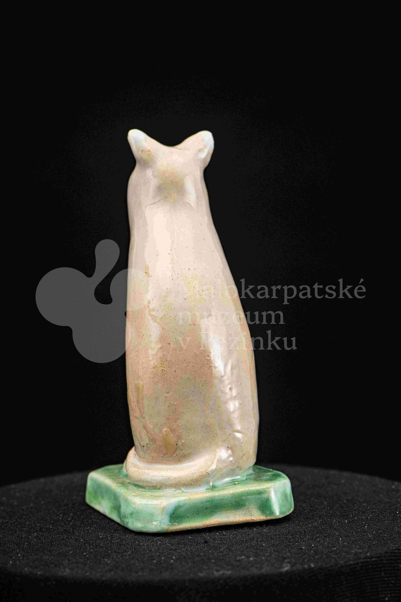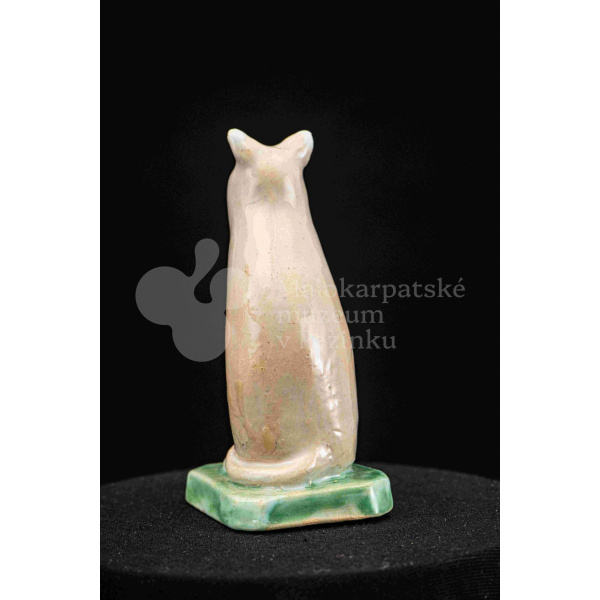 Plastika figurálna – mačka, biela sediaca mačka na zelenom podstavci, výška 10 cm. Značenie na dne FK.ST.
