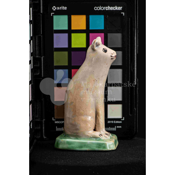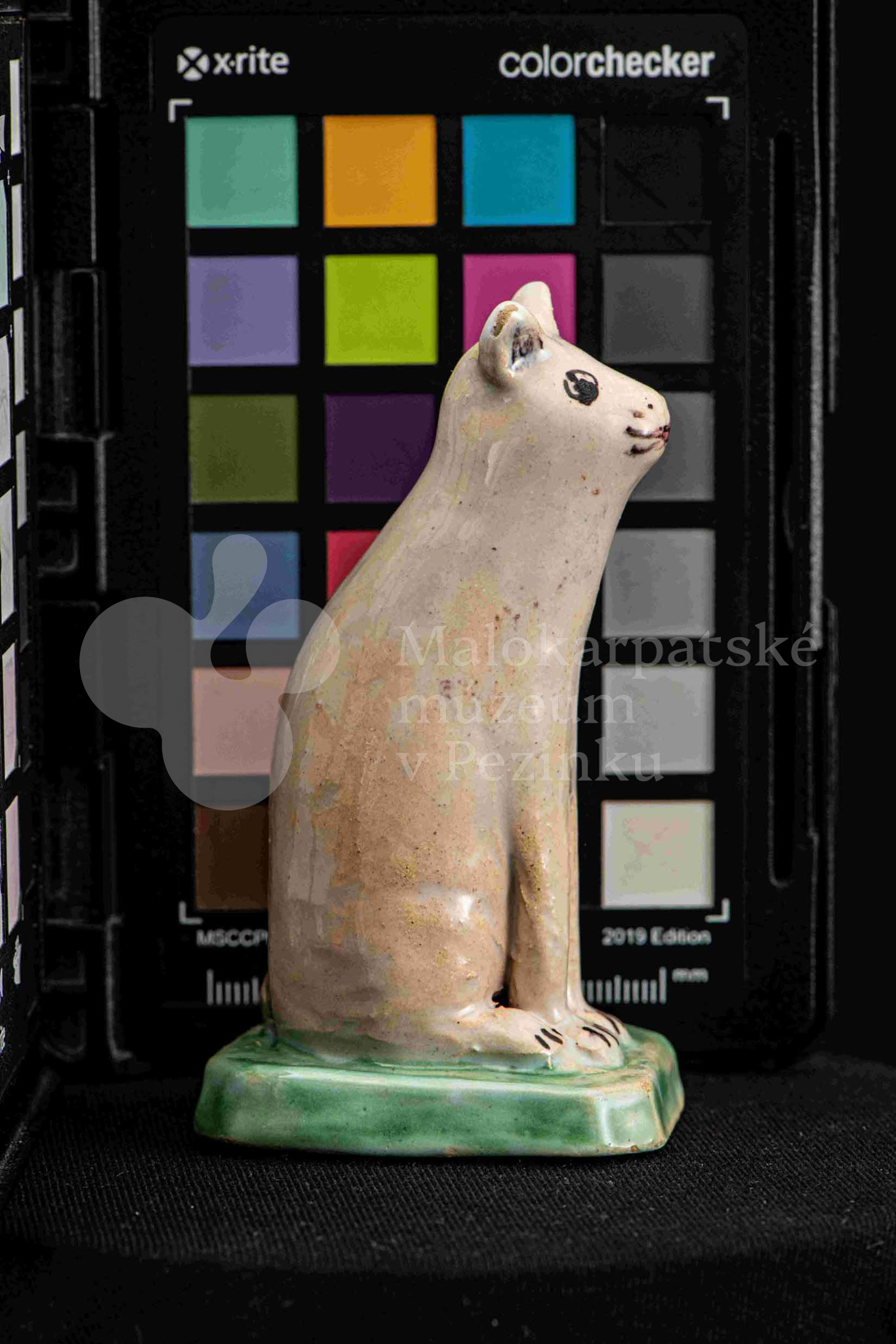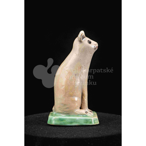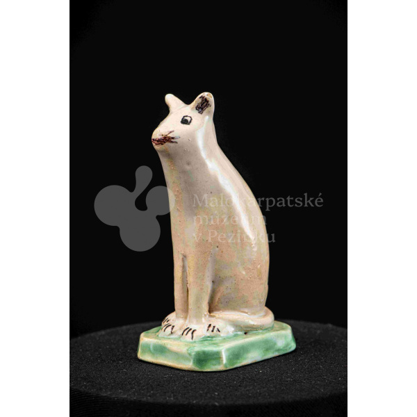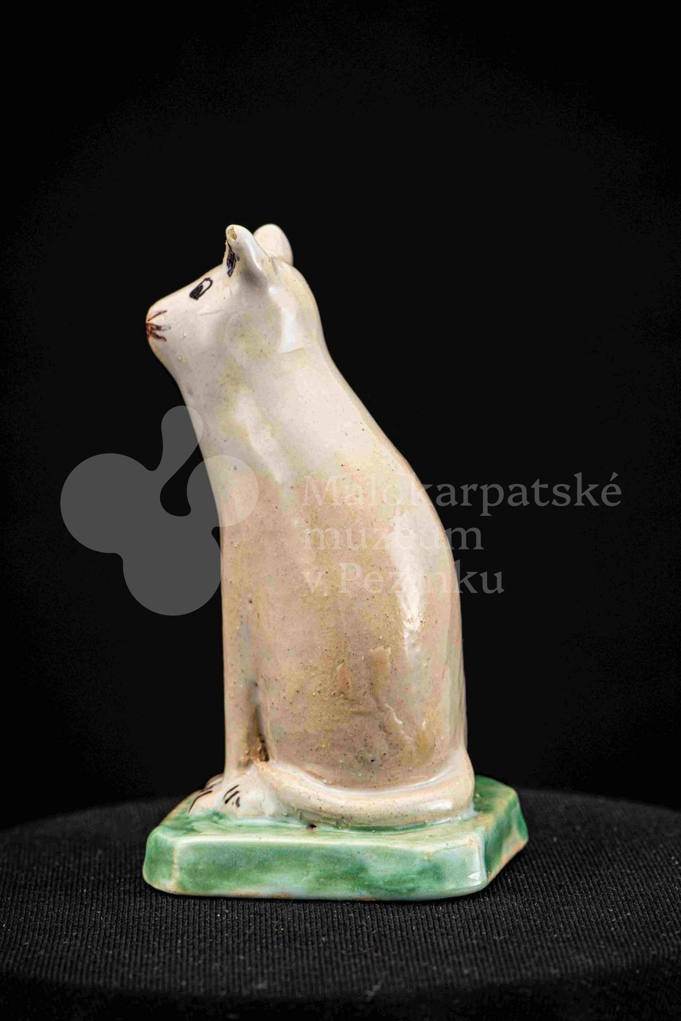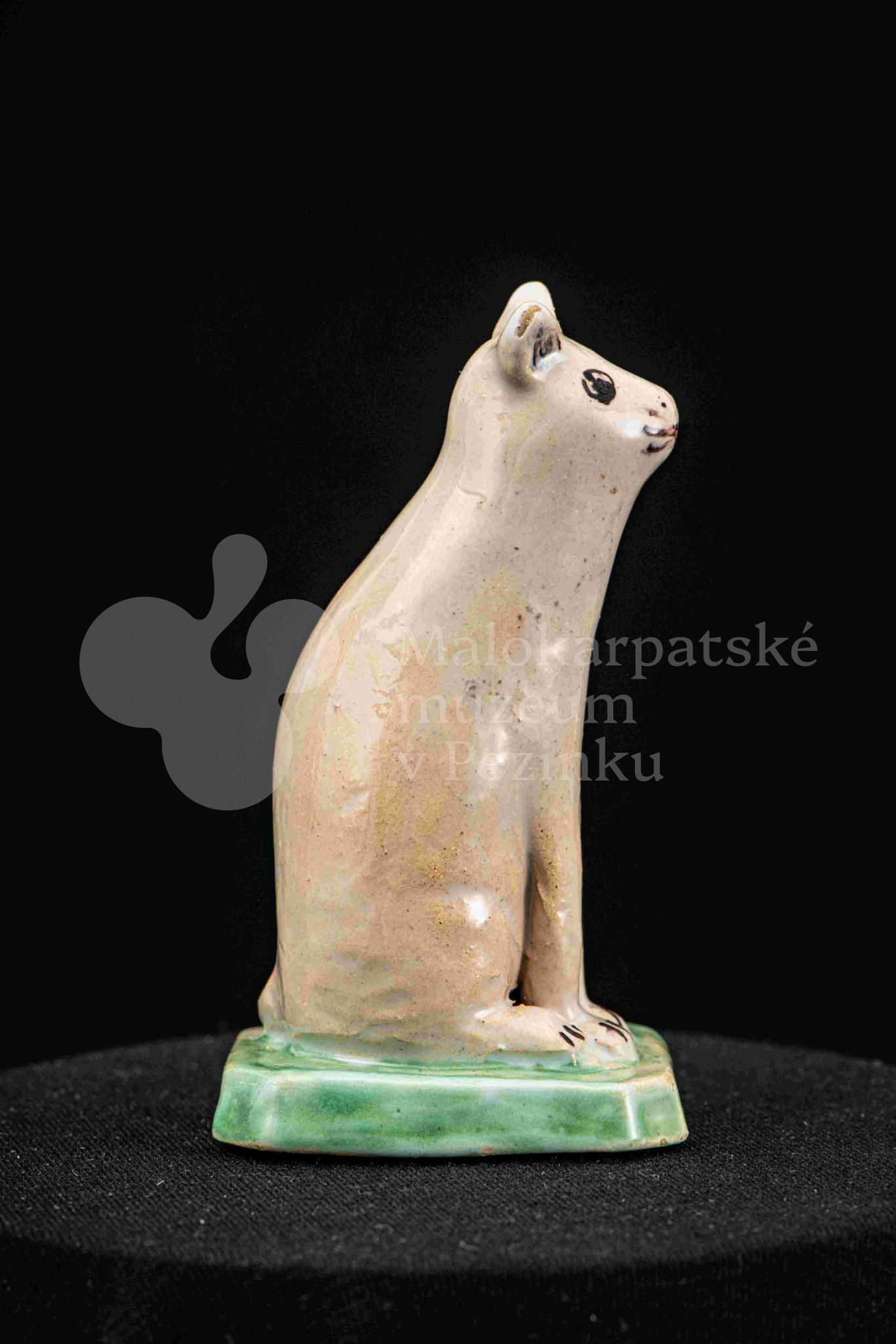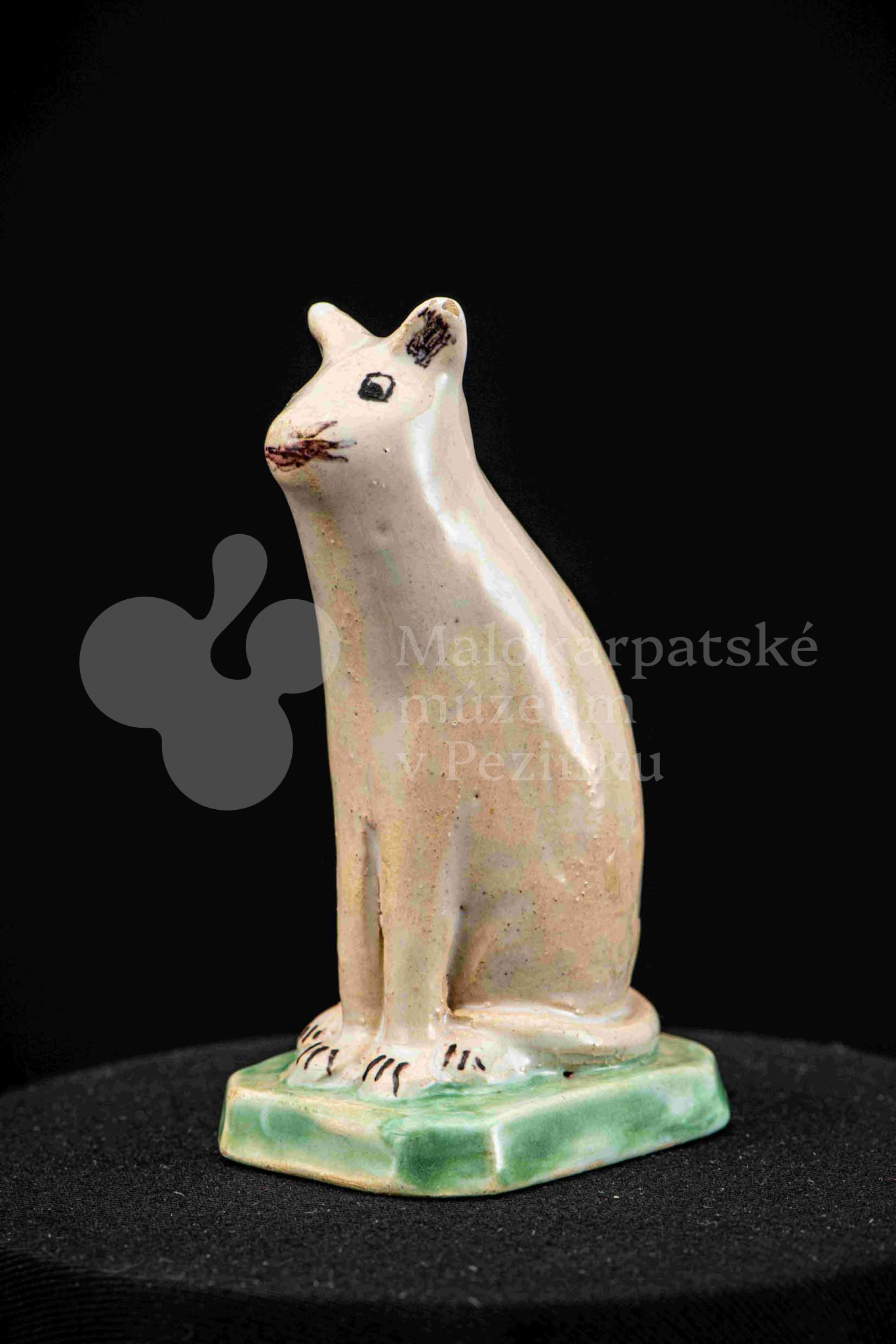 Plastika figurálna – mačka, biela sediaca mačka na zelenom podstavci, výška 10 cm. Značenie na dne FK.ST.
