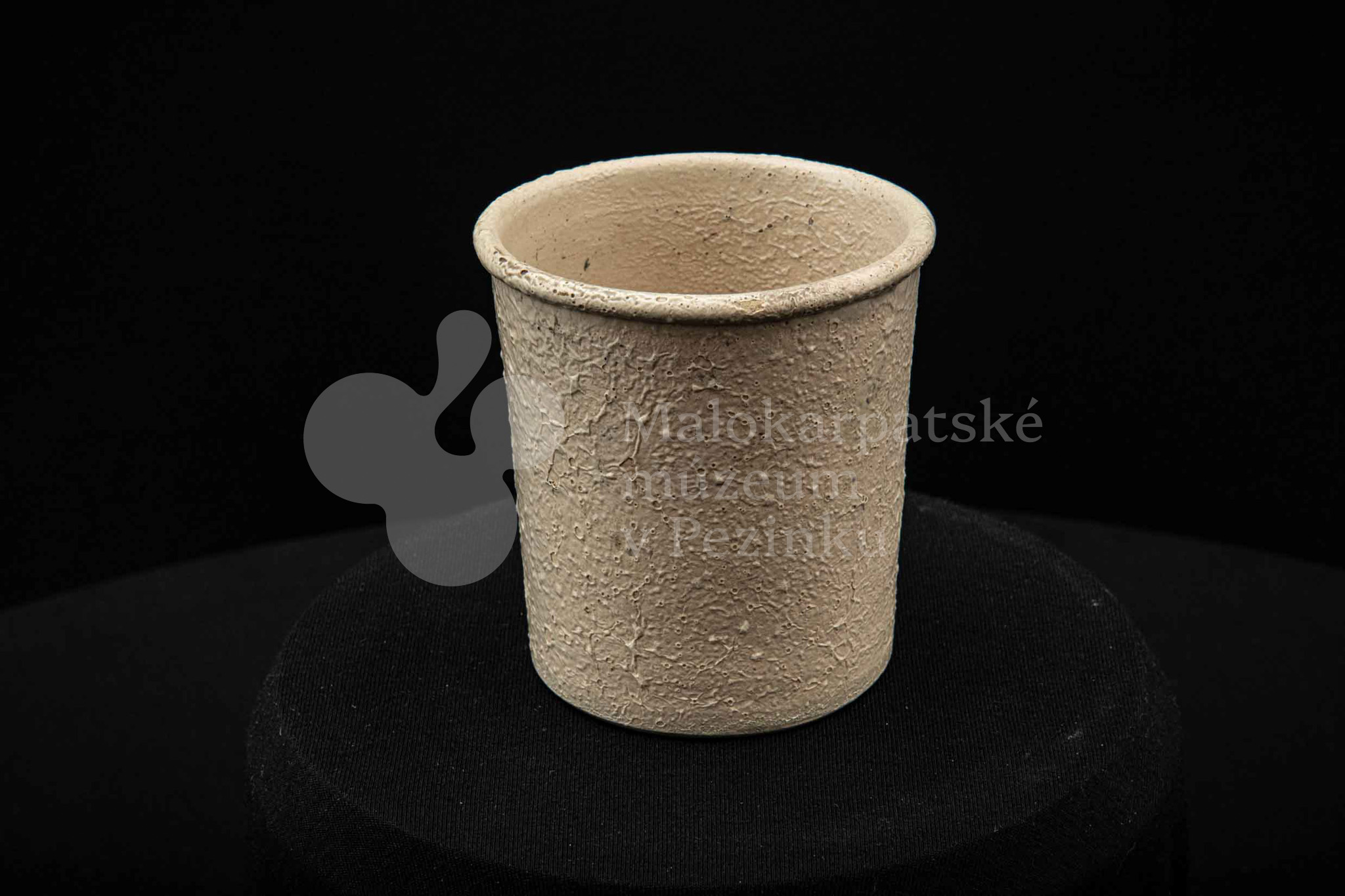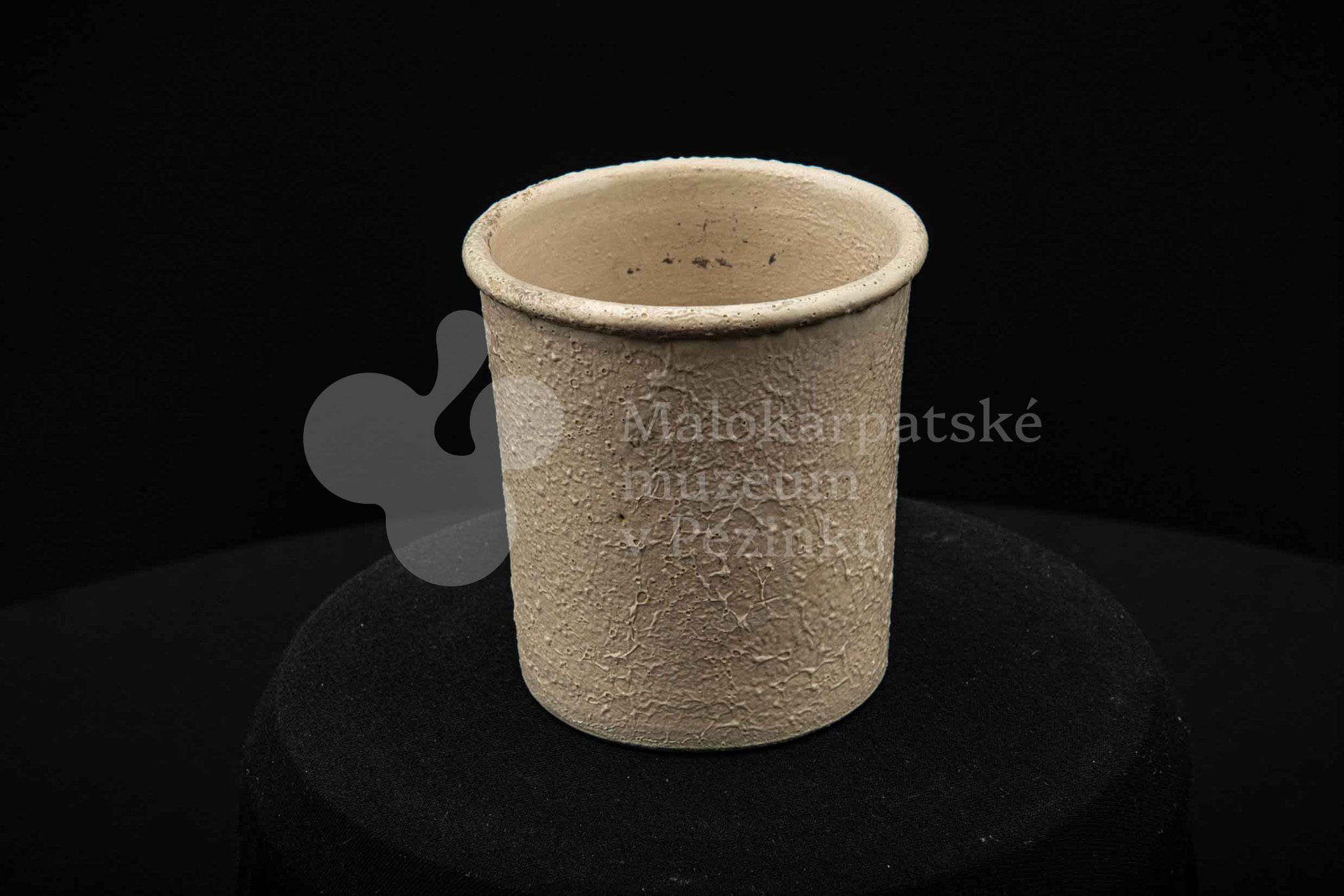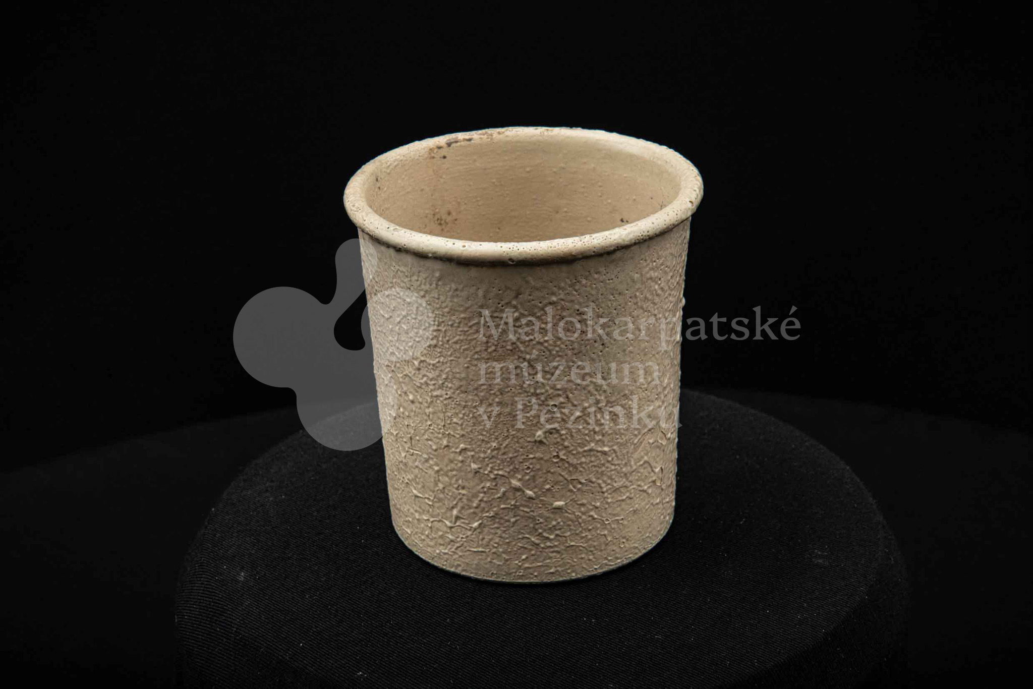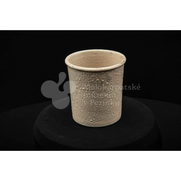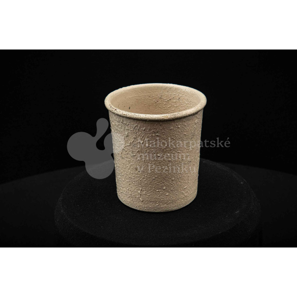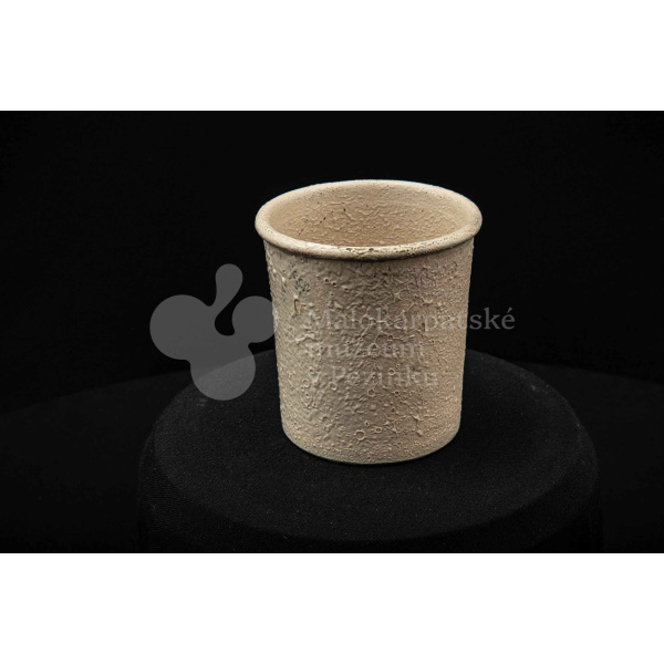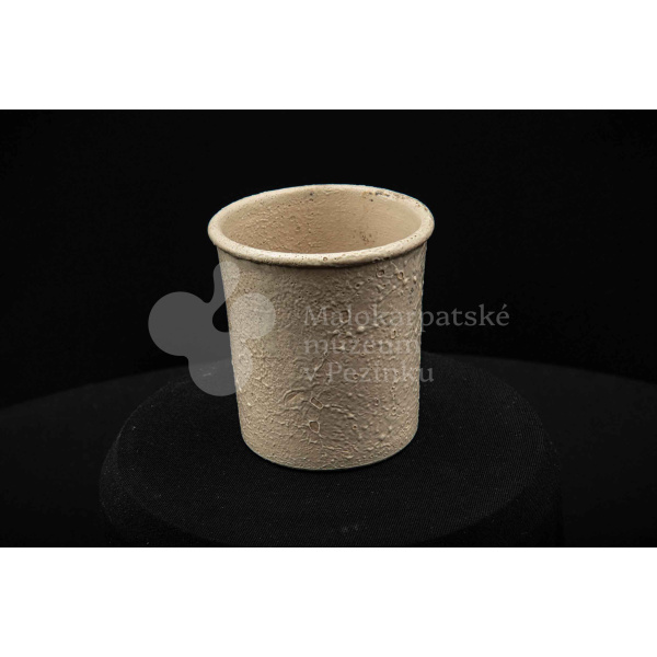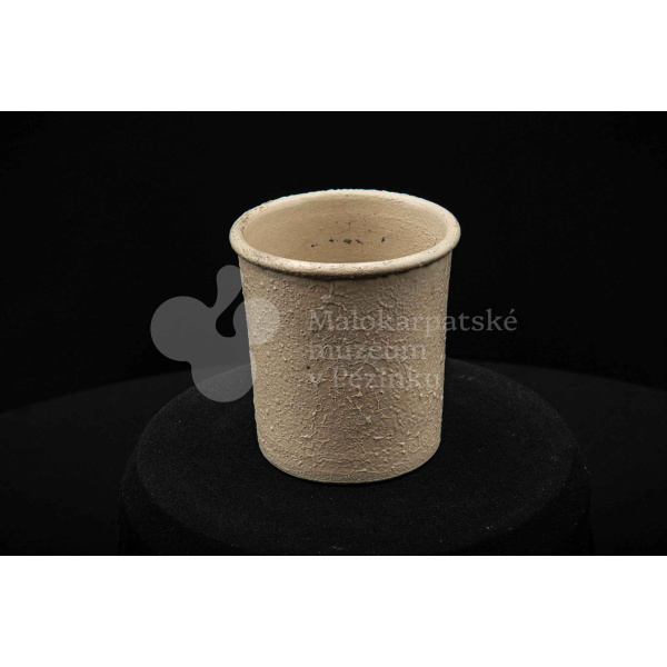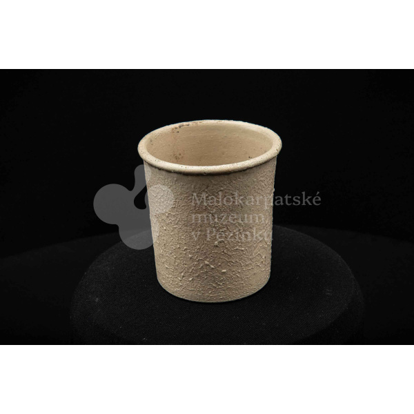 Keramická nádobka s čiernou surovinou, valcového tvaru, poliata bielou glazúrou. Na dne vyryté značenie 200.