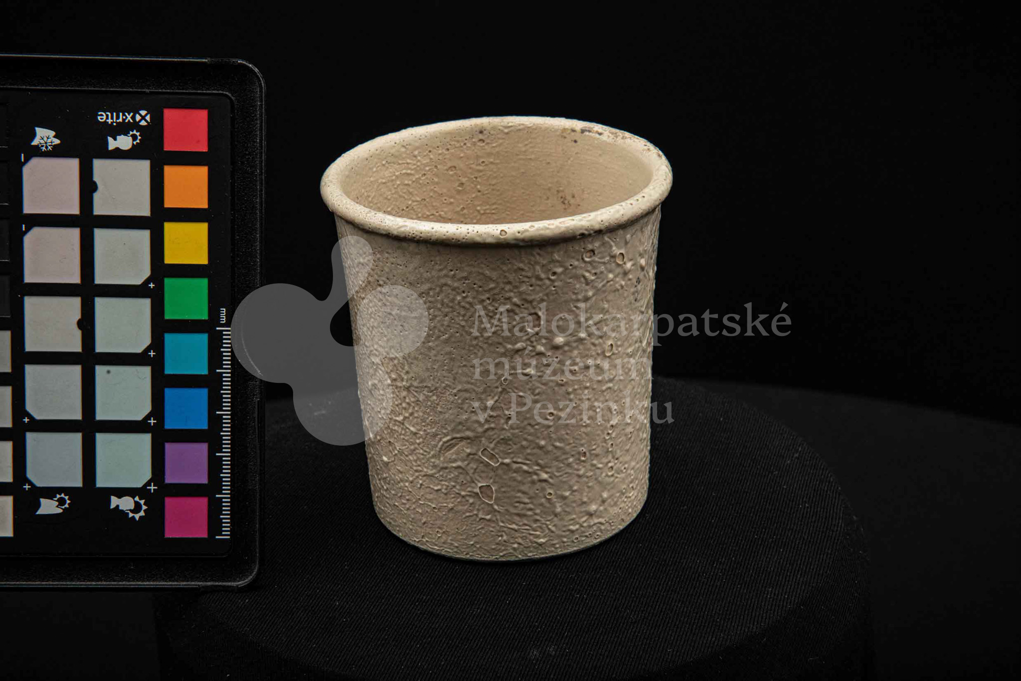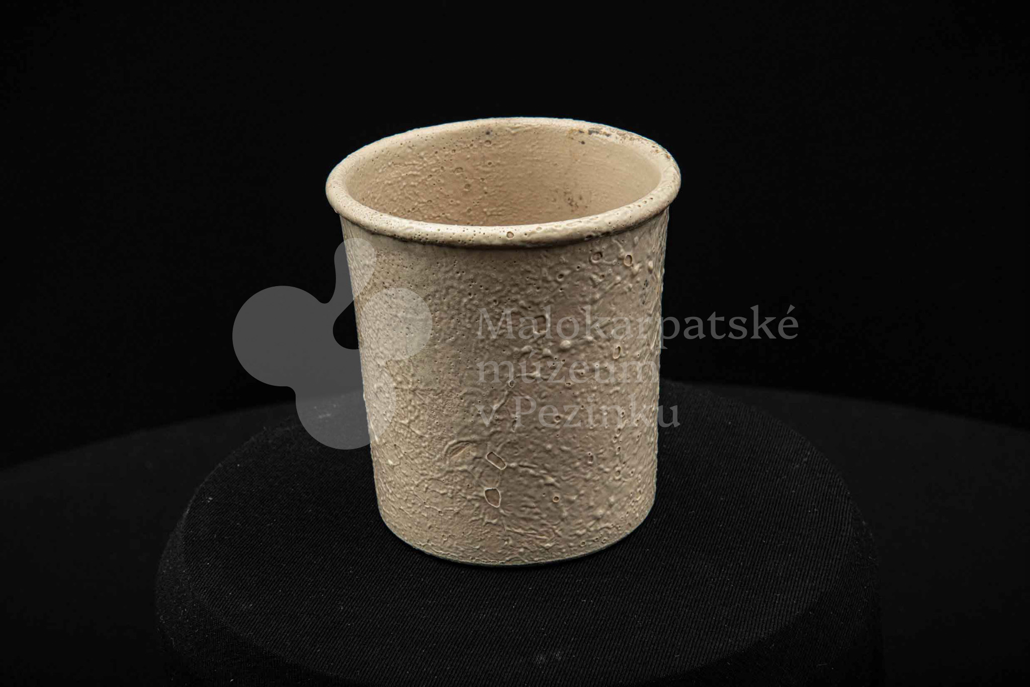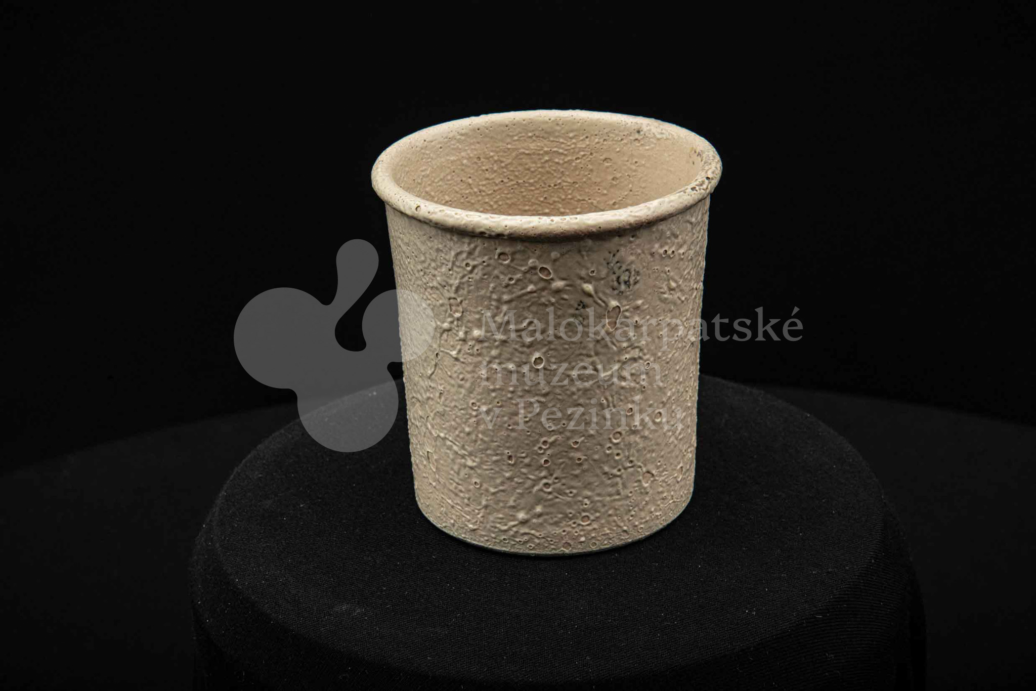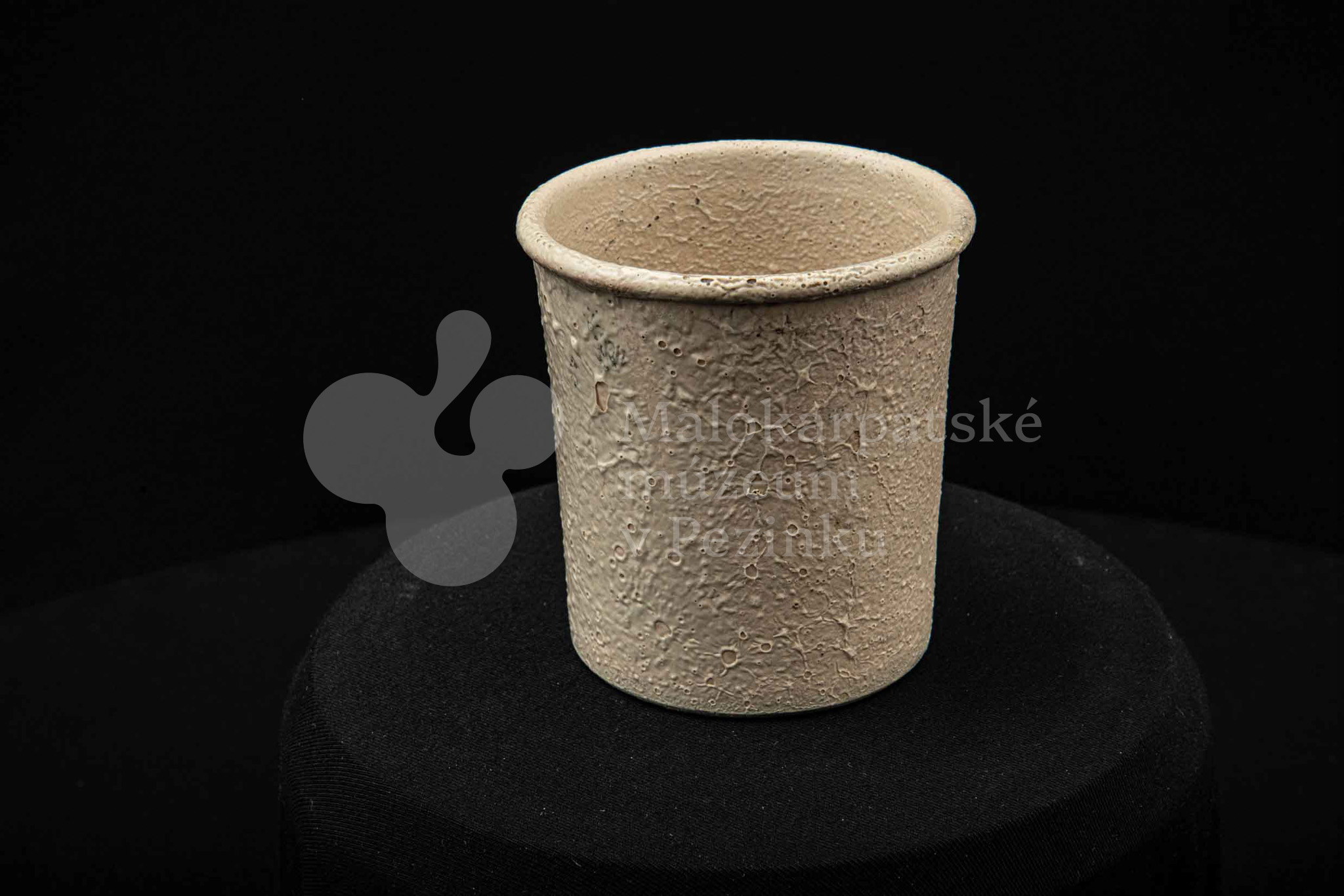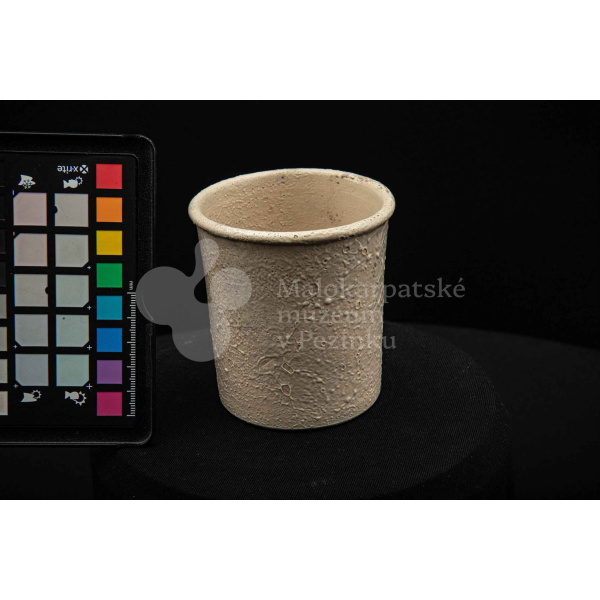 Keramická nádobka s čiernou surovinou, valcového tvaru, poliata bielou glazúrou. Na dne vyryté značenie 200.