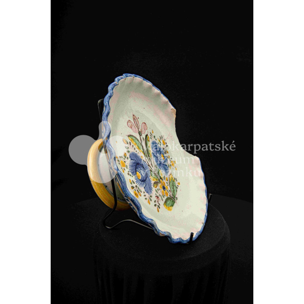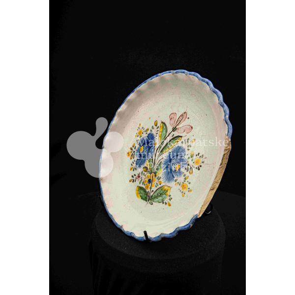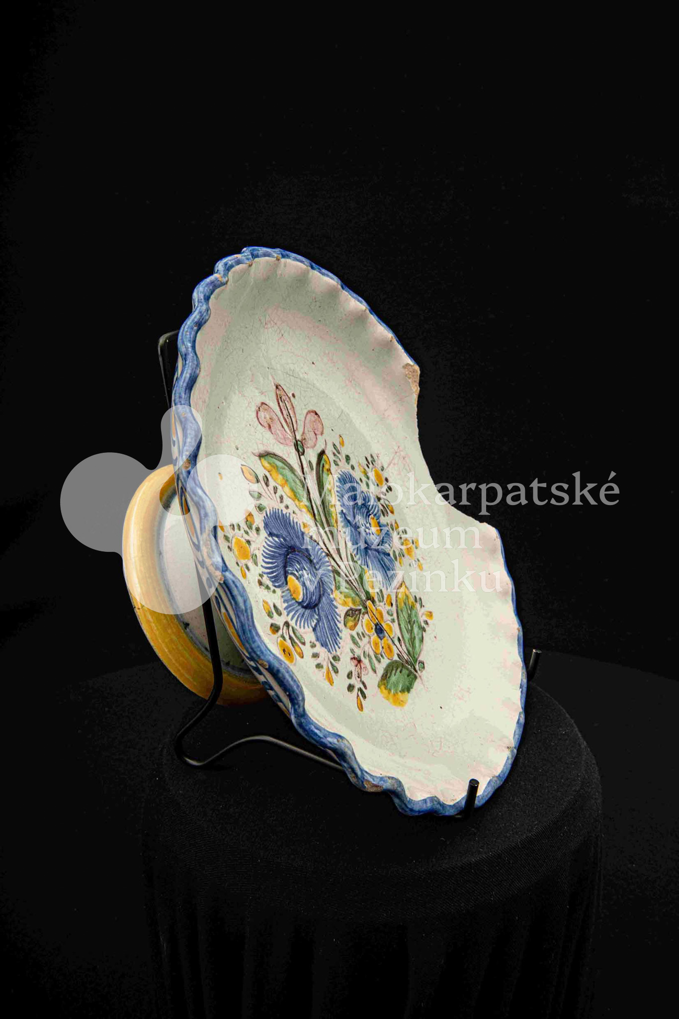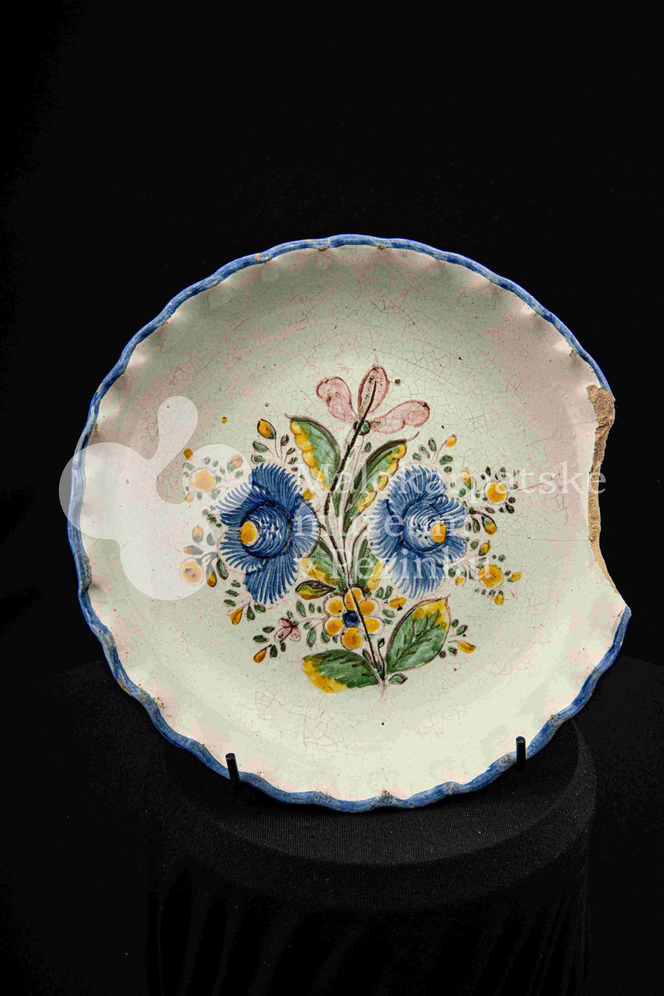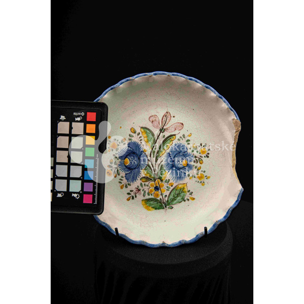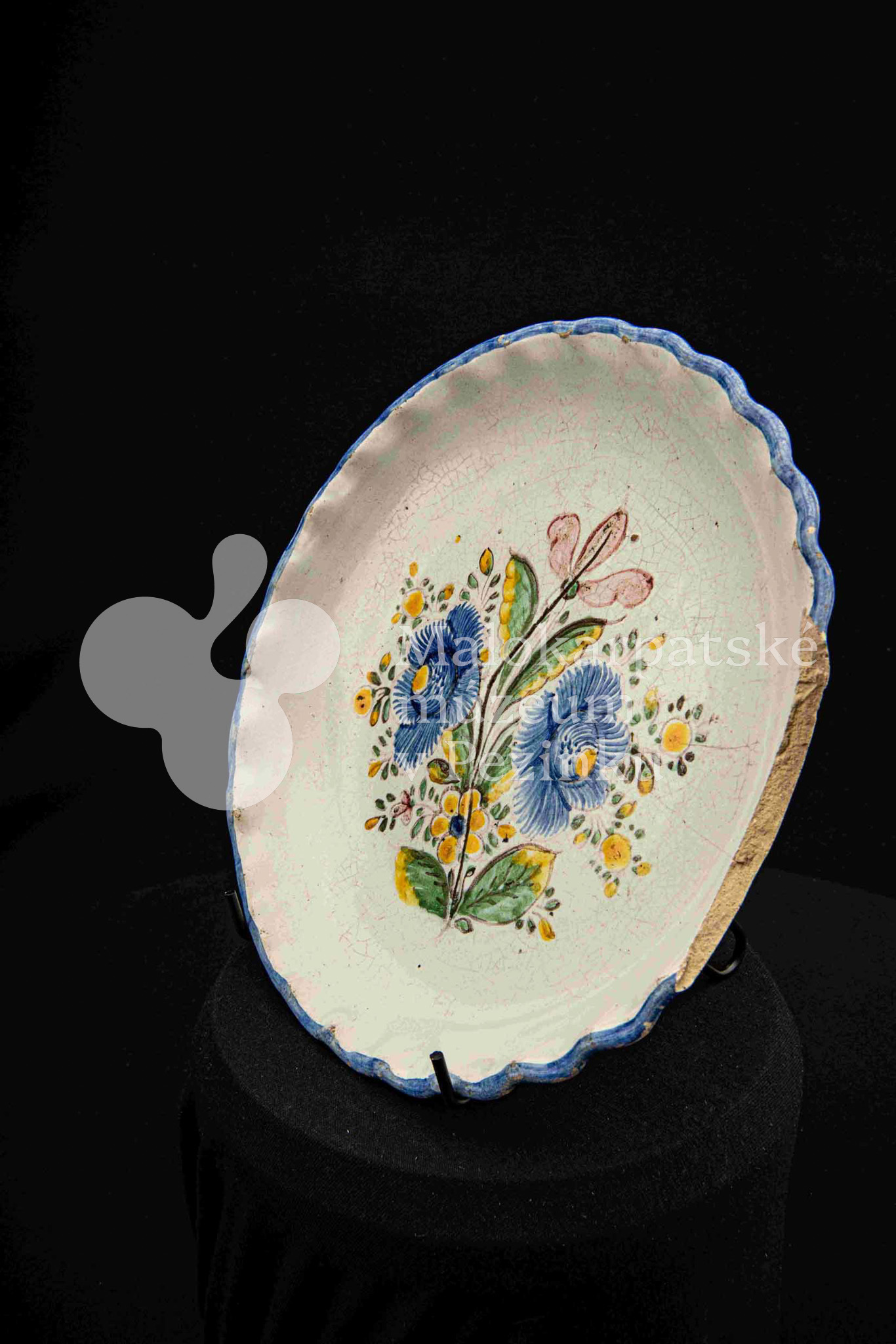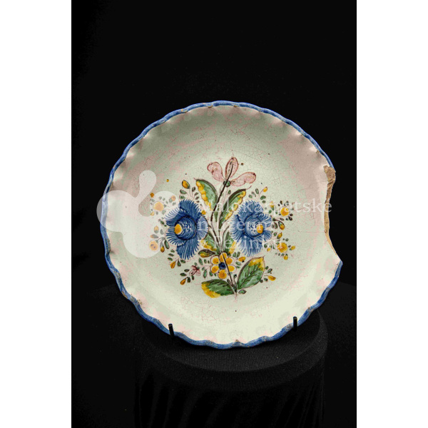 Misa fajansová na ovocie, na nôžke, kvetinový dekor (dve modré ruže), poškodená, priemer 15 cm. Na spodnej strane nohy značenie FK. ST.