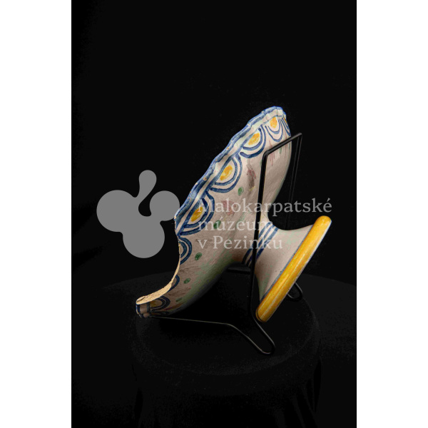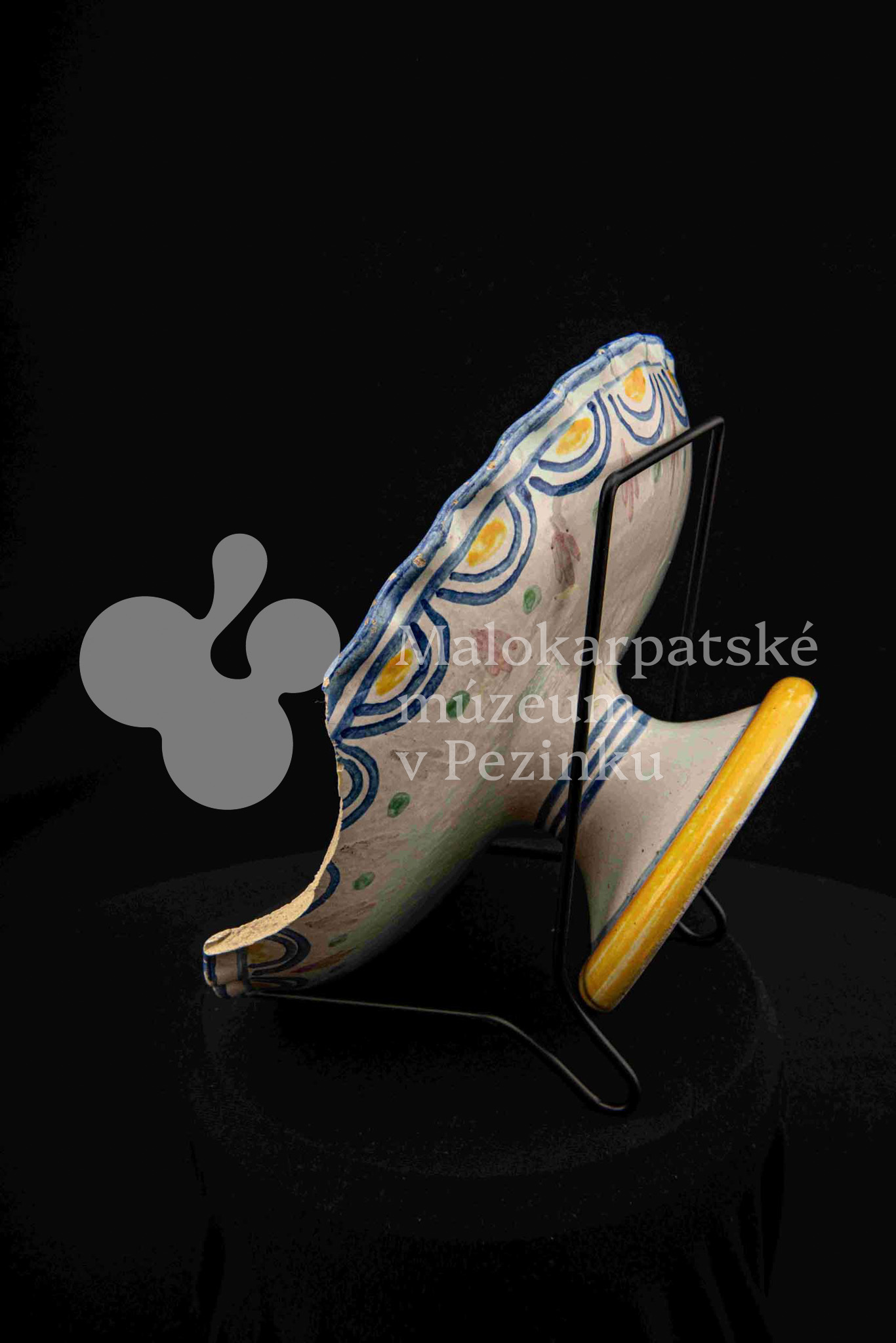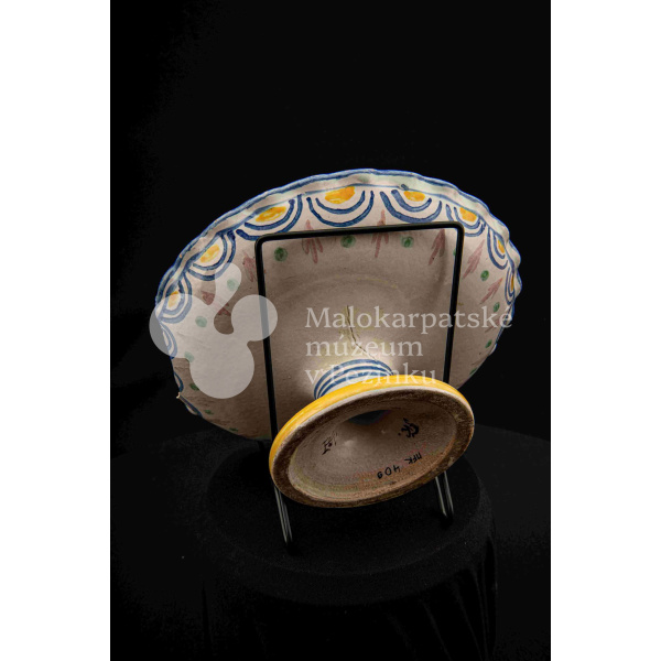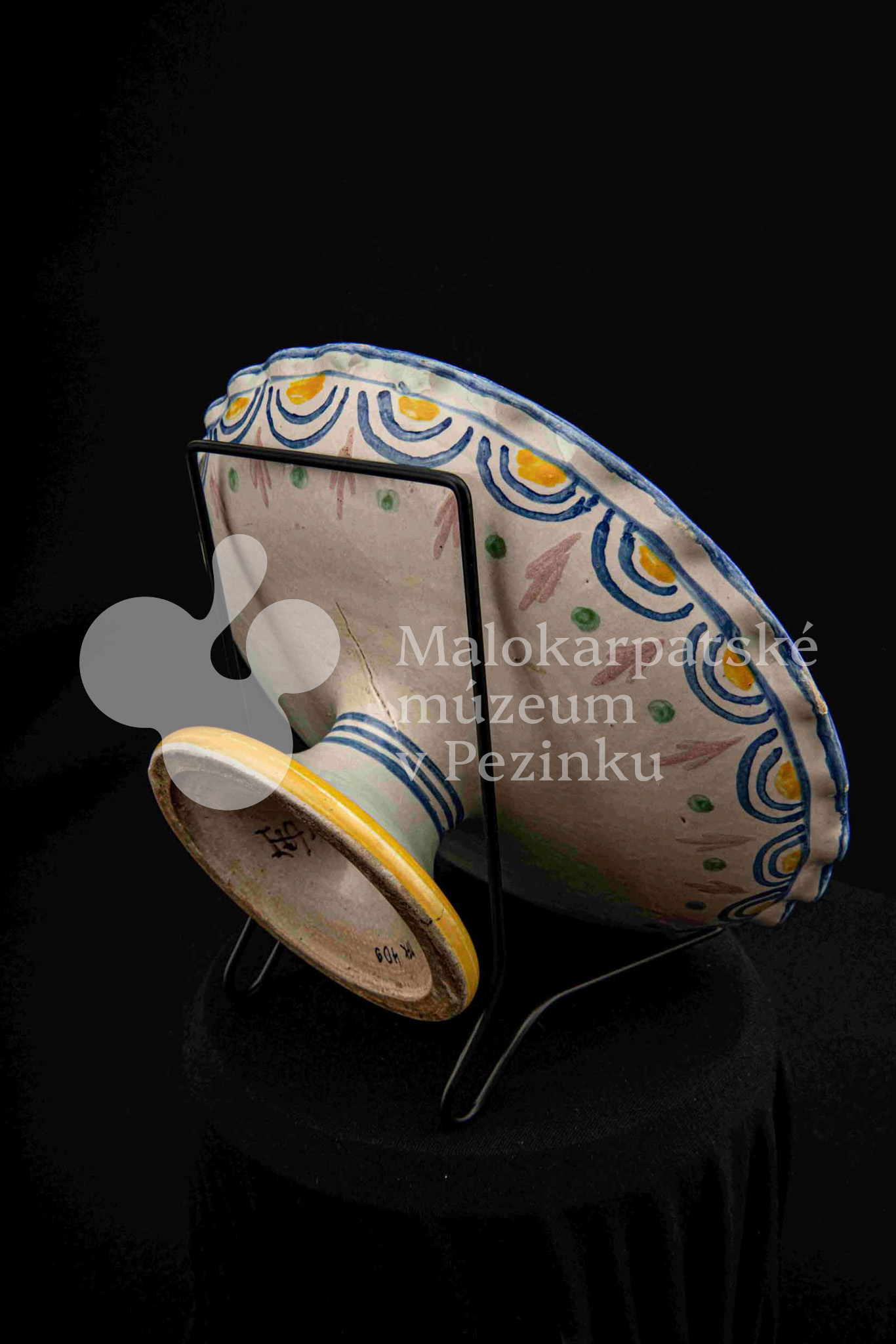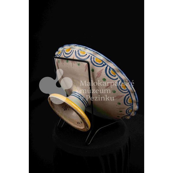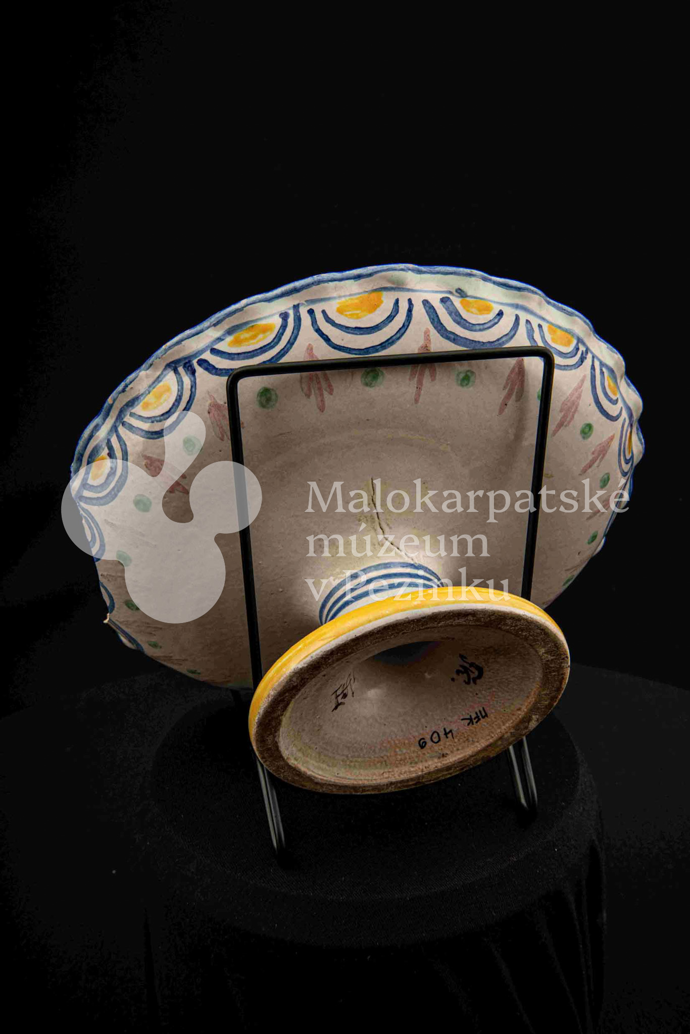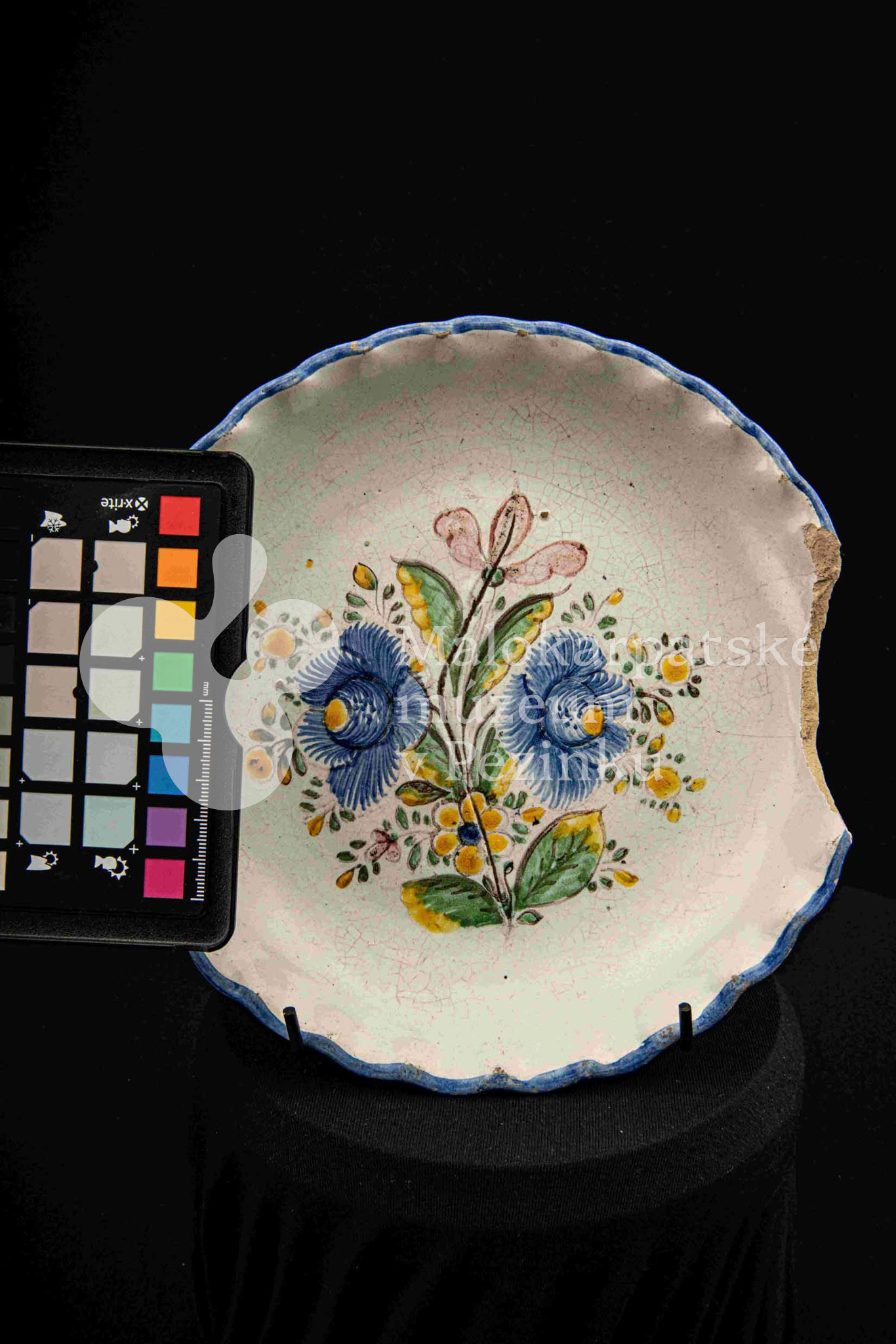 Misa fajansová na ovocie, na nôžke, kvetinový dekor (dve modré ruže), poškodená, priemer 15 cm. Na spodnej strane nohy značenie FK. ST.