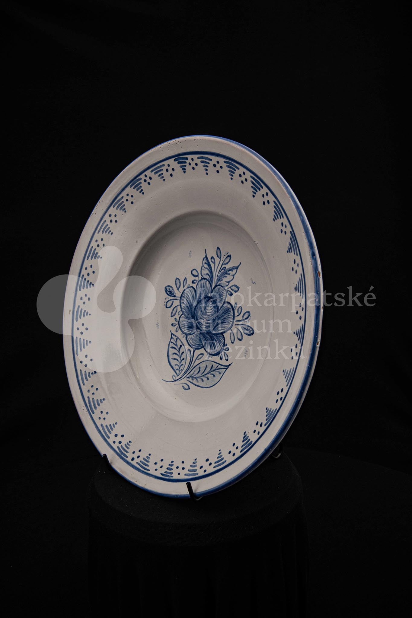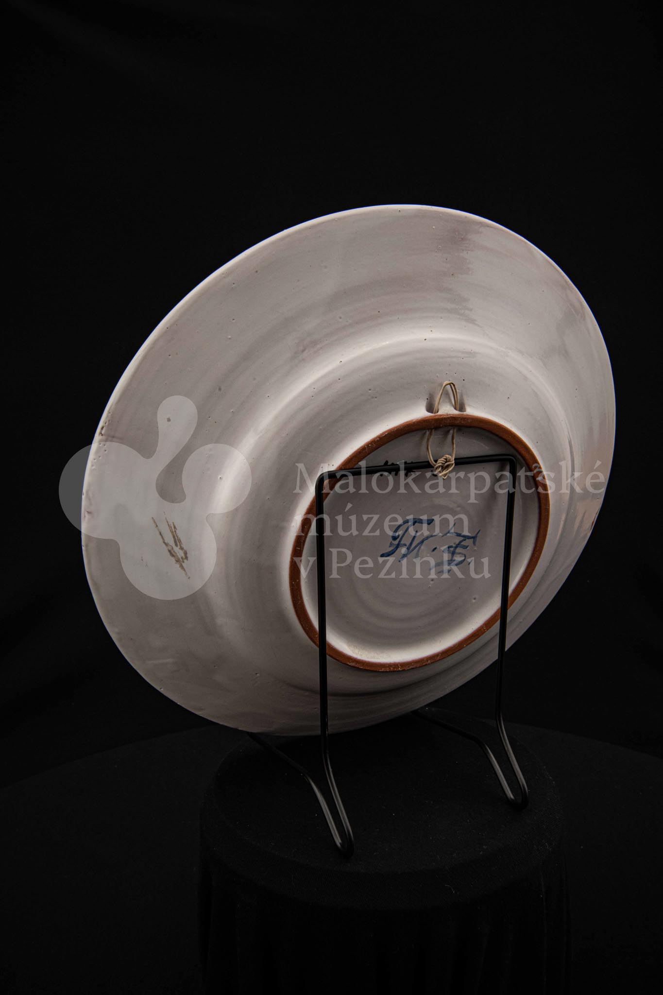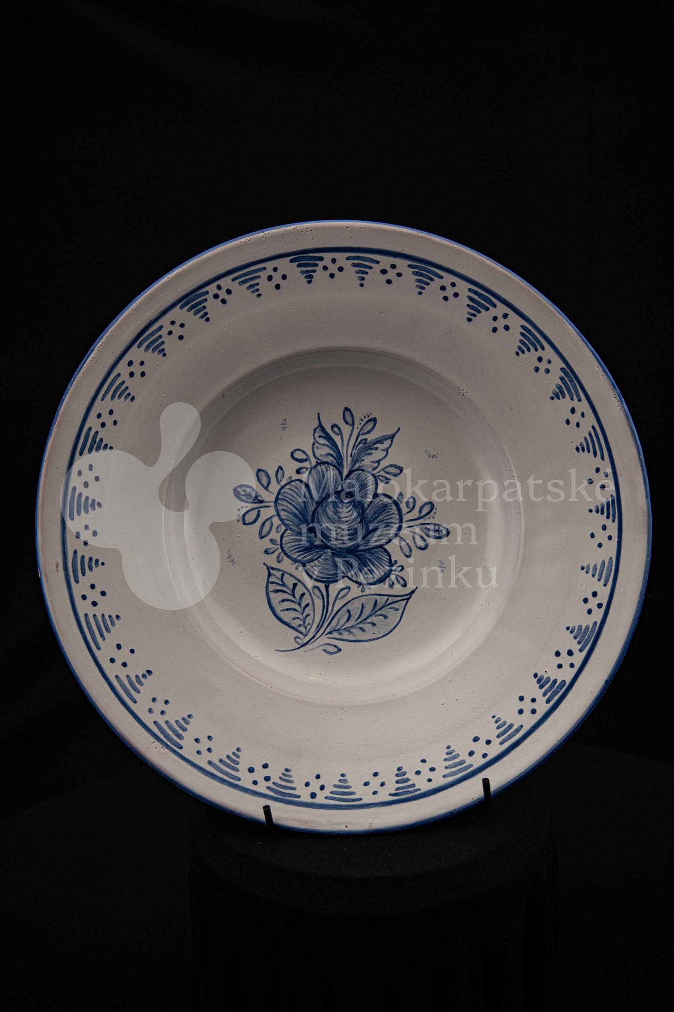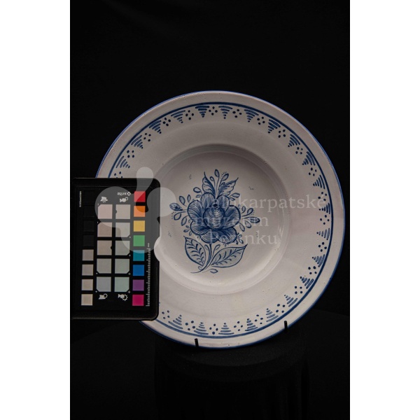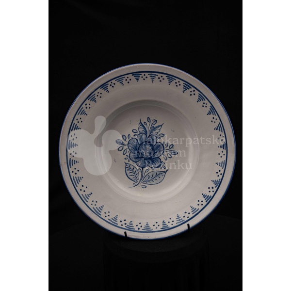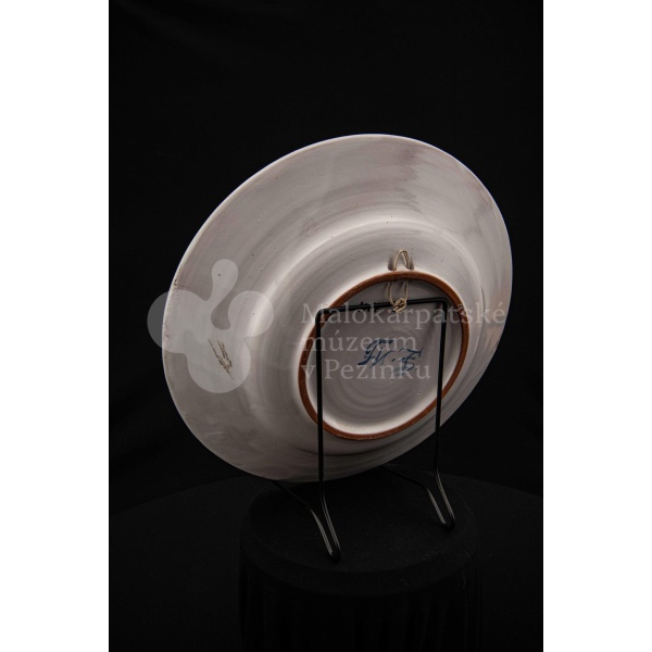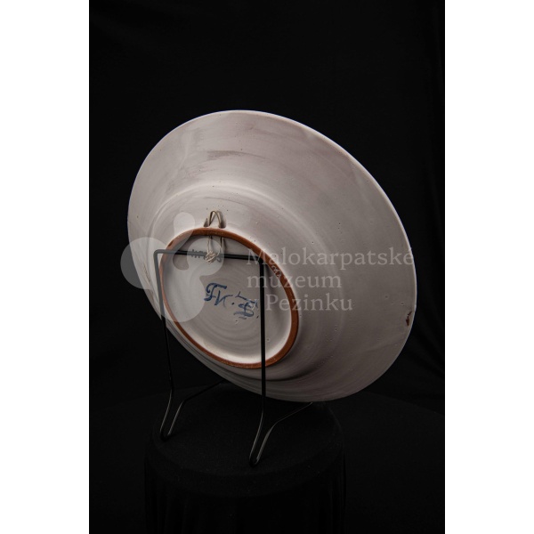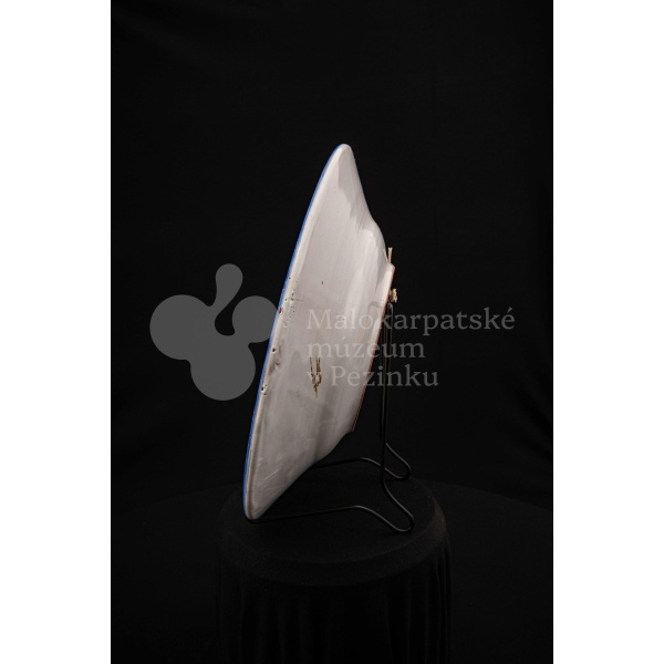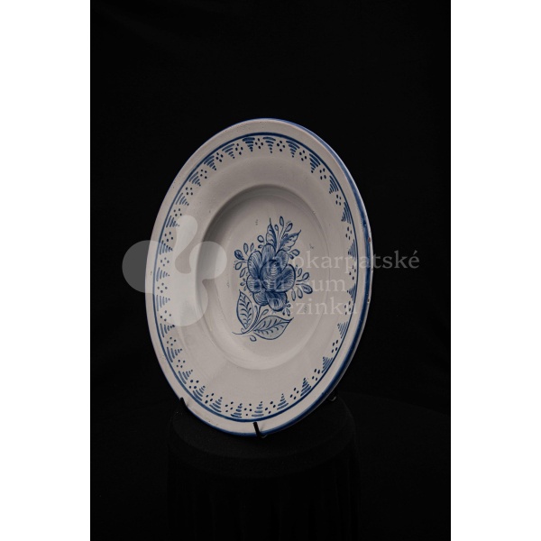 Misa fajansová, bielo glazovaná s modrým kvetom a iným modrým dekorom okolo. Na dne značená FK.ST.