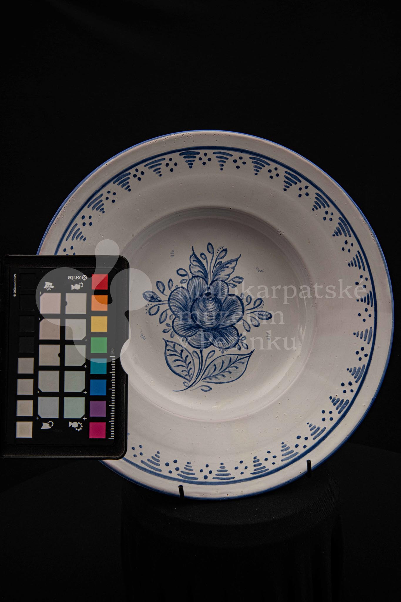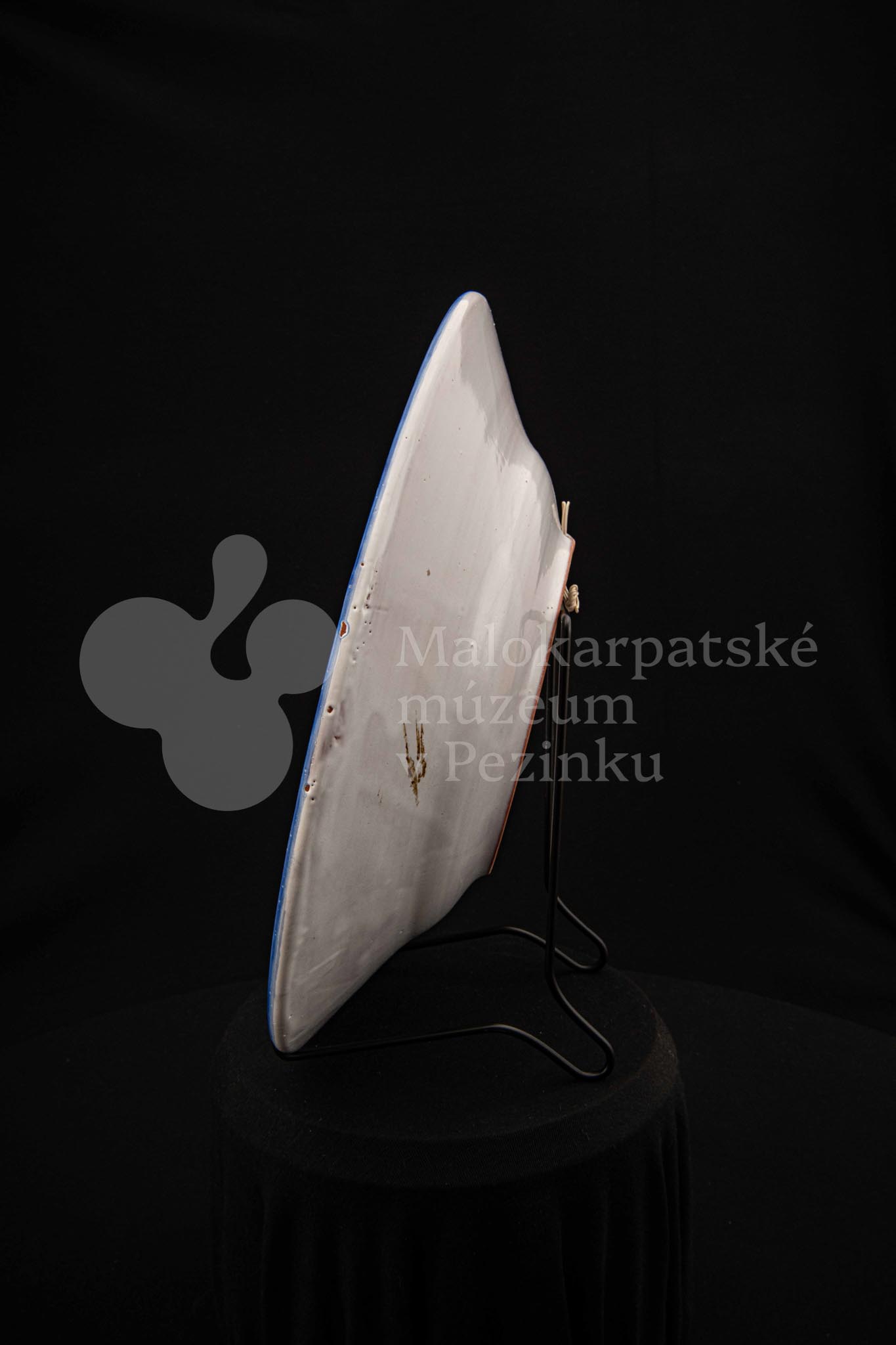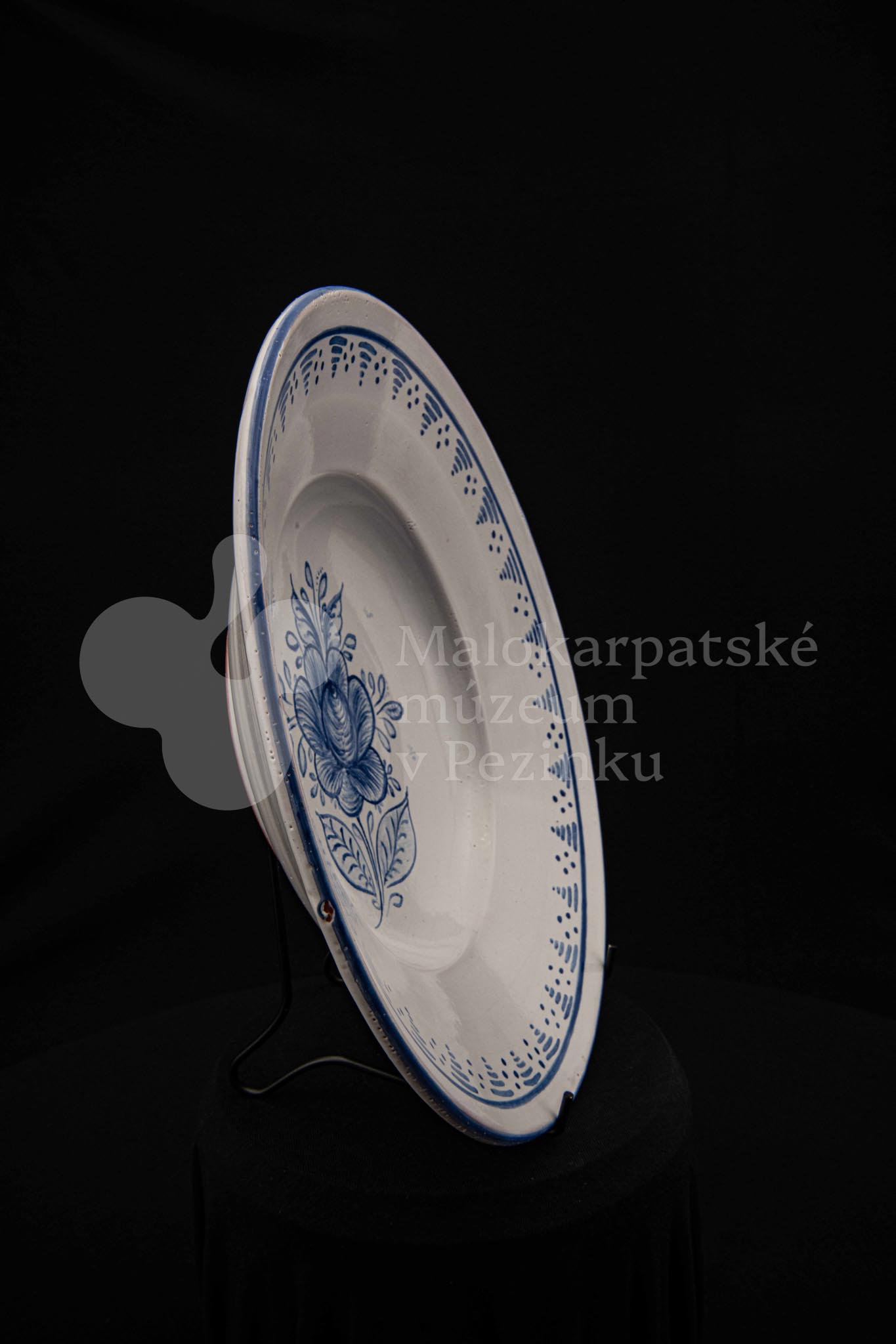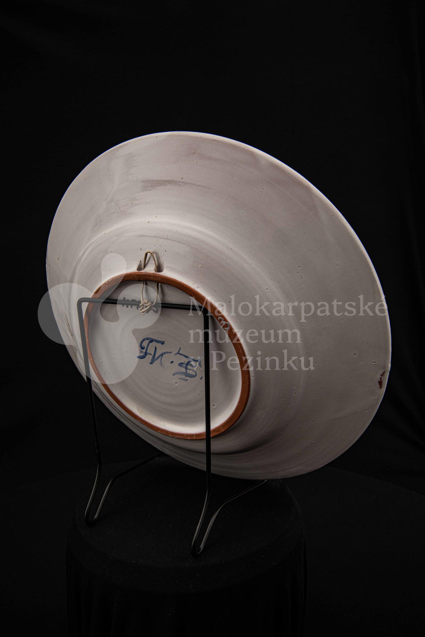 Misa fajansová, bielo glazovaná s modrým kvetom a iným modrým dekorom okolo. Na dne značená FK.ST.