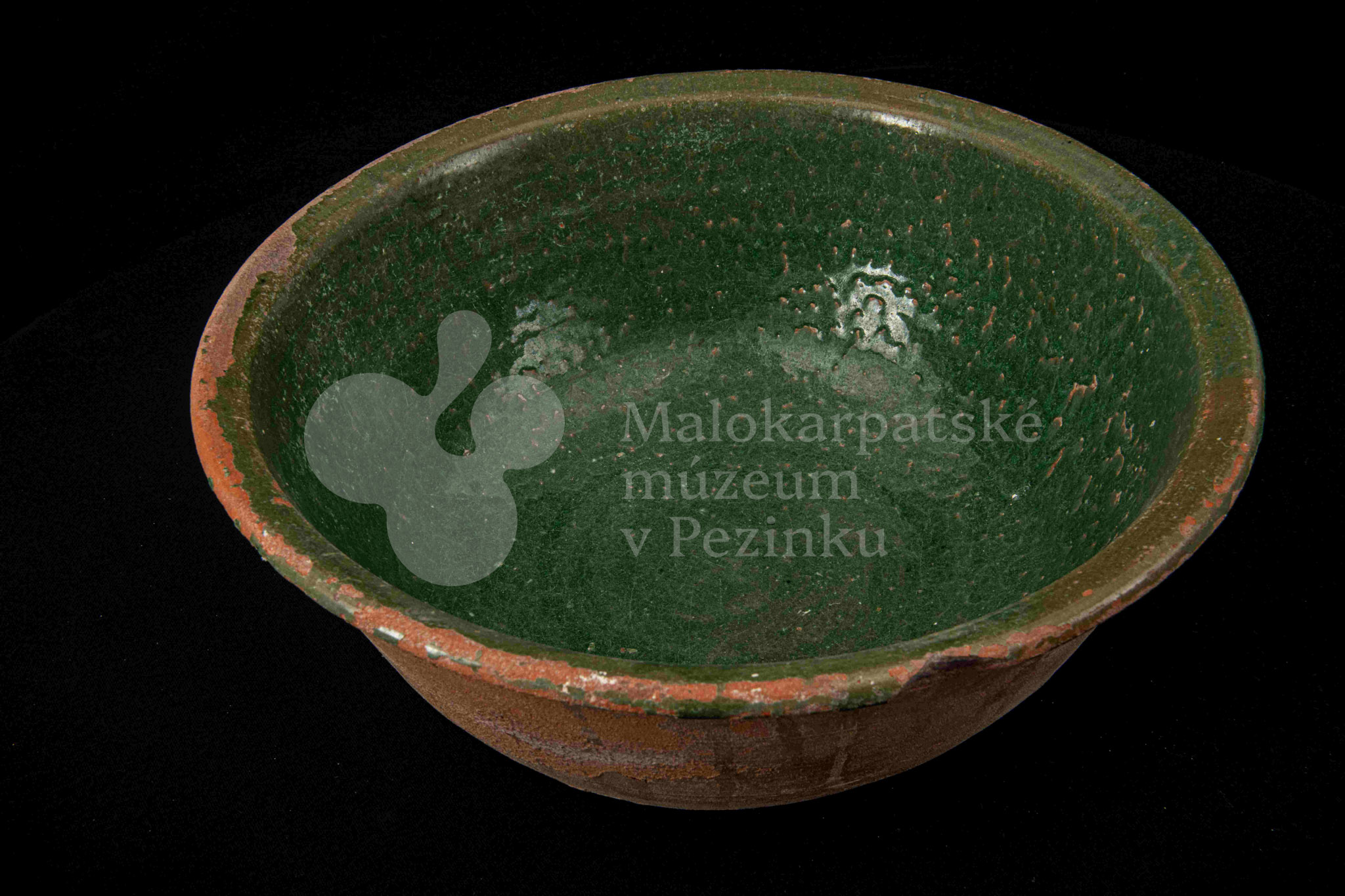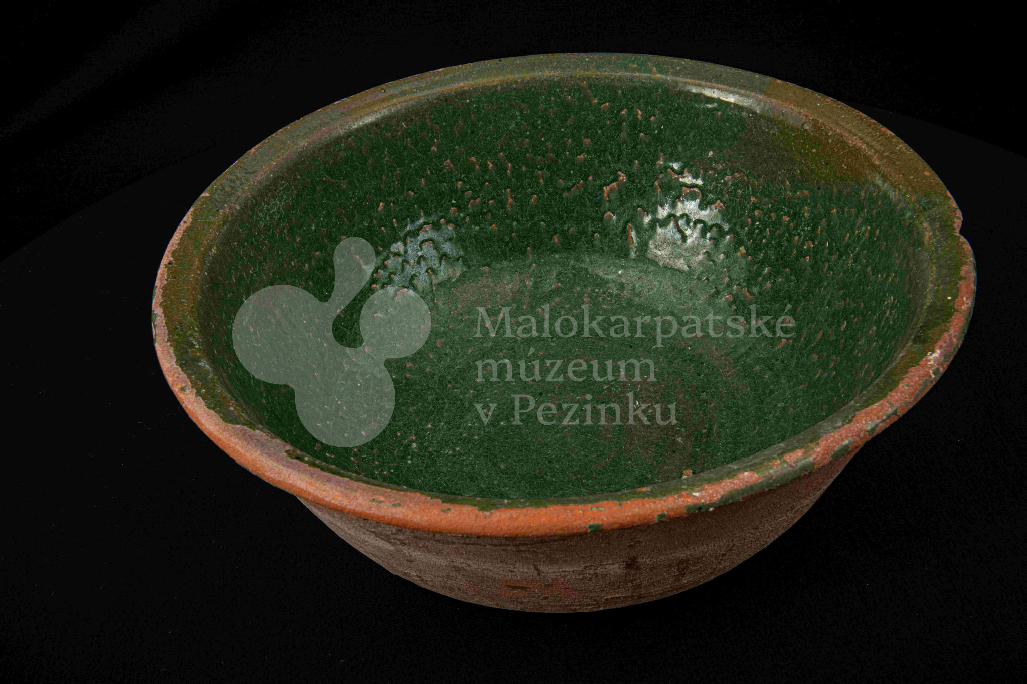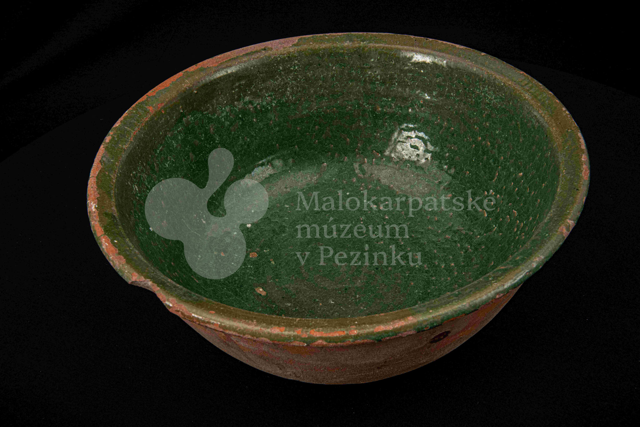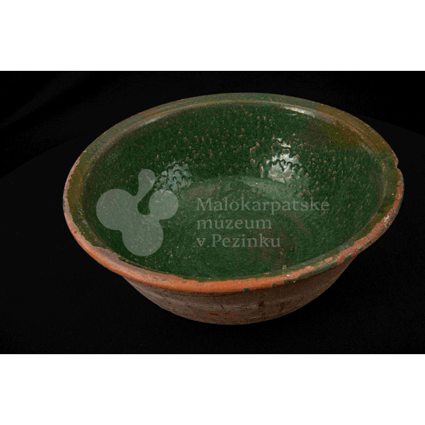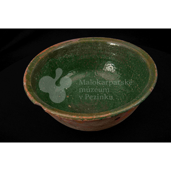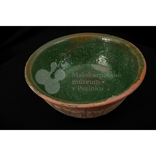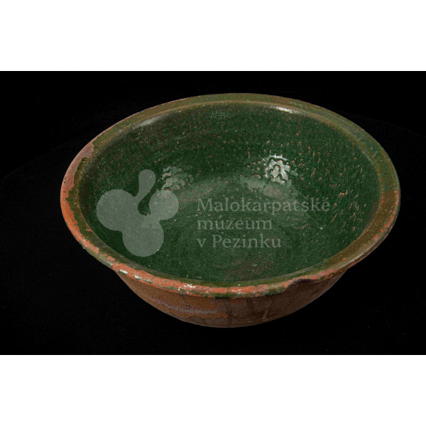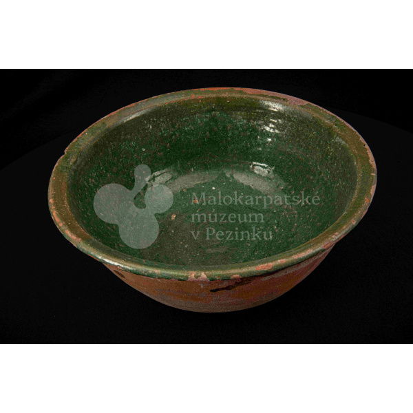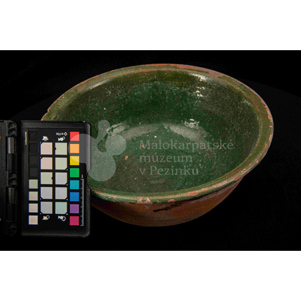 Okrúhla misa hlboká, z vonkajšej strany neglazovaná, z vnútornej poliata olovnatou zelenou glazúrou. Je poškodená, obsahuje kusy rôznofarebných glazúr.