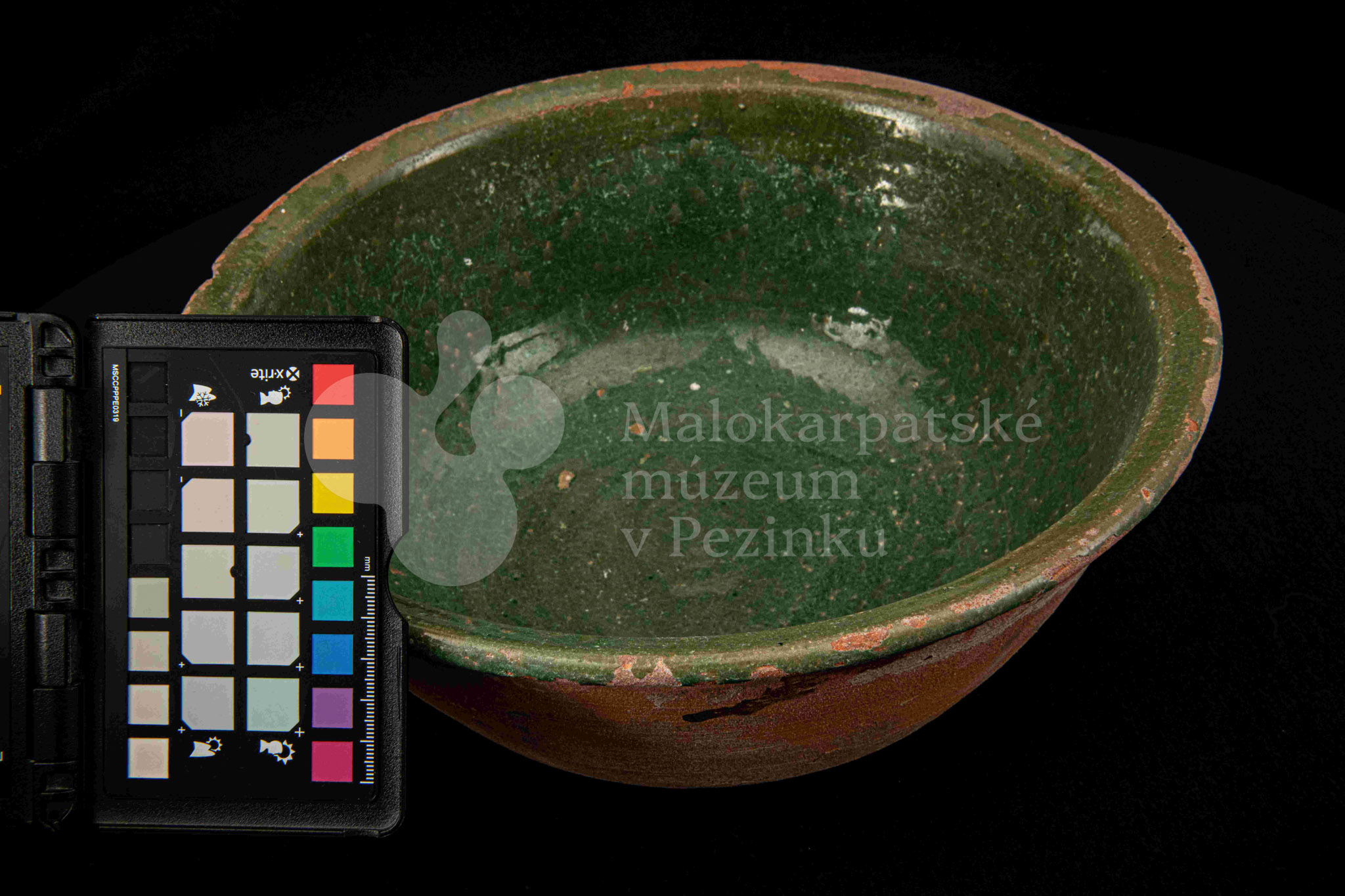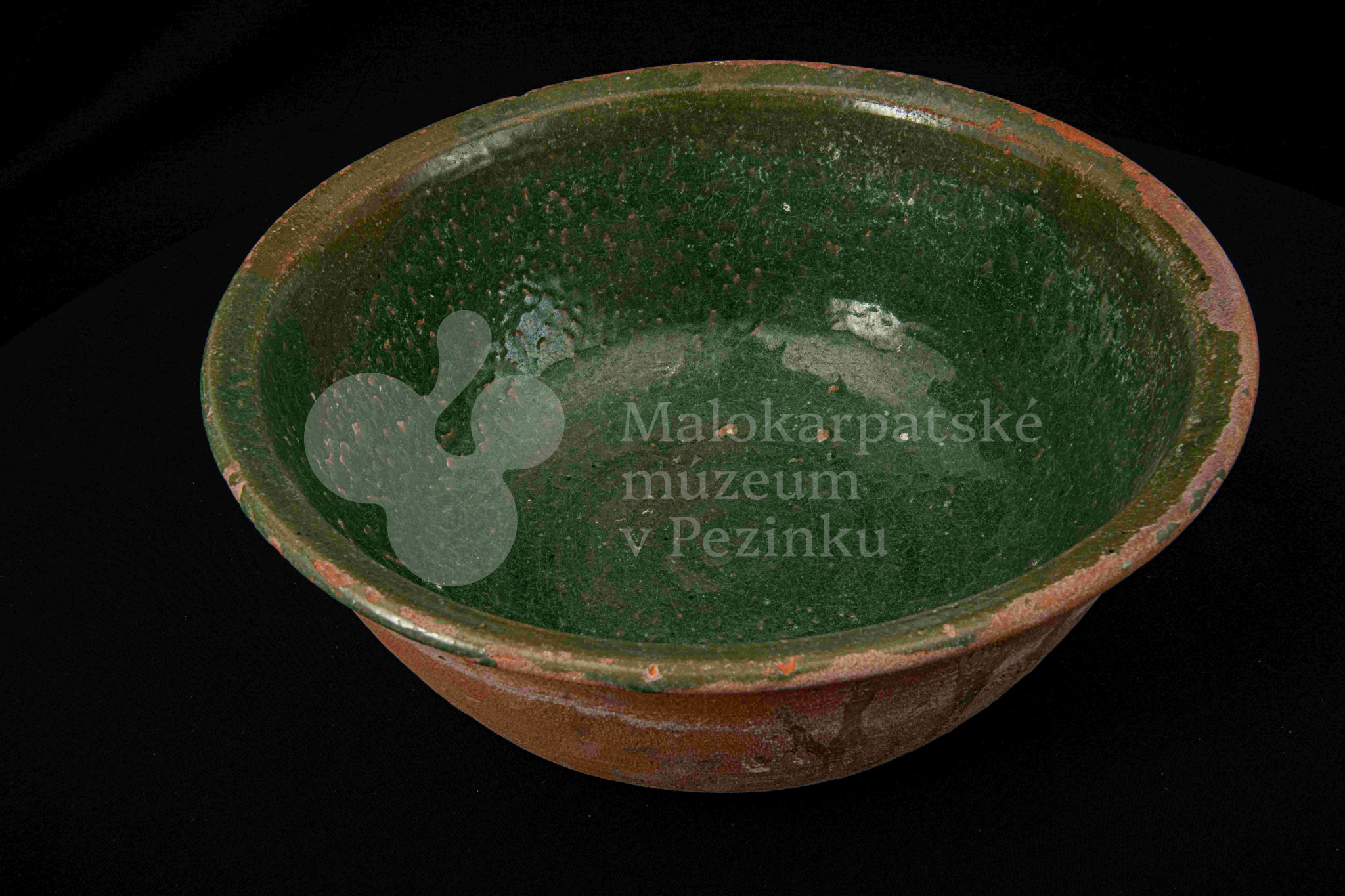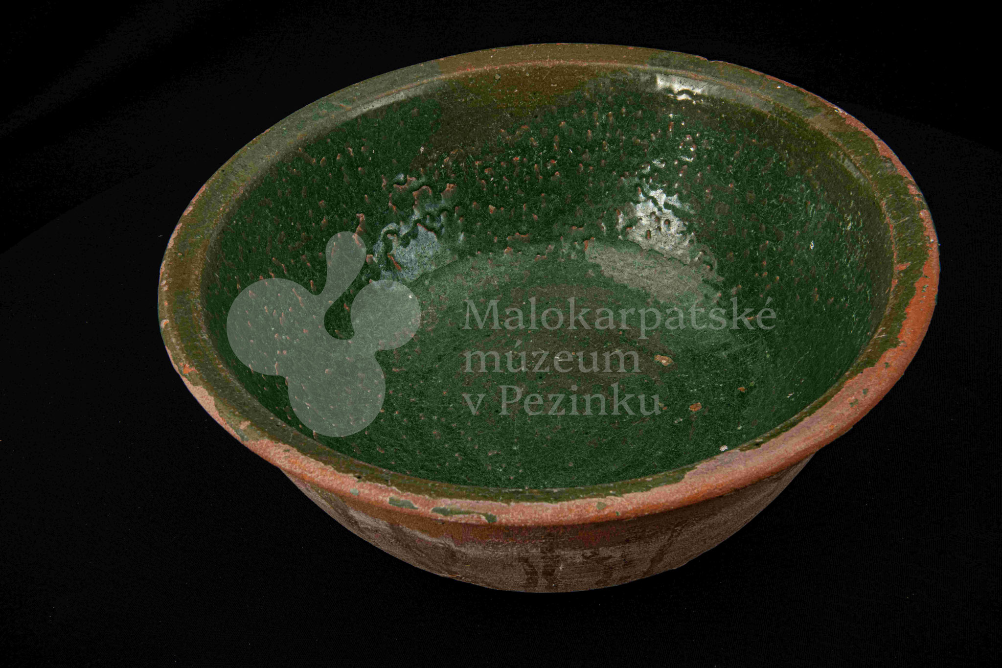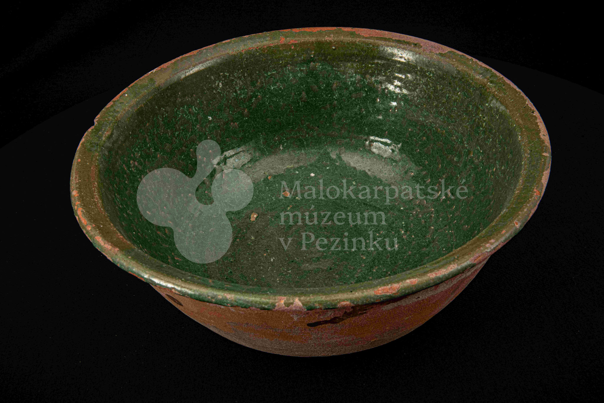 Okrúhla misa hlboká, z vonkajšej strany neglazovaná, z vnútornej poliata olovnatou zelenou glazúrou. Je poškodená, obsahuje kusy rôznofarebných glazúr.