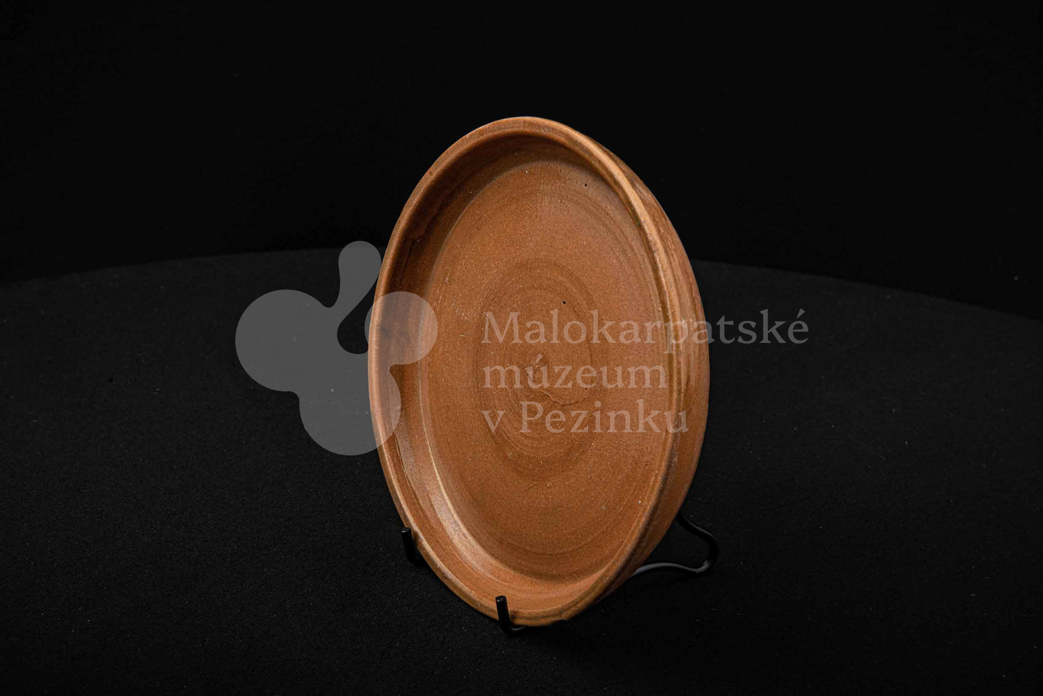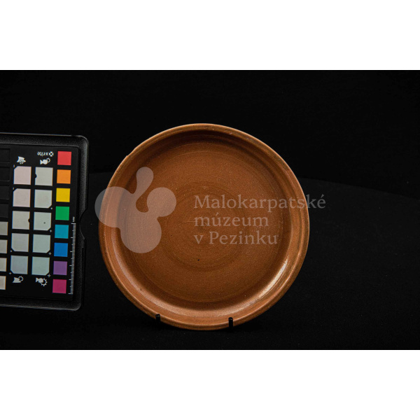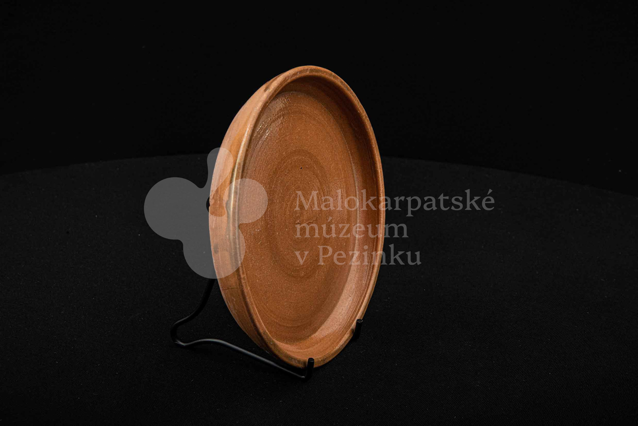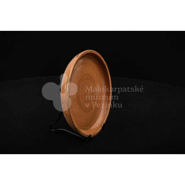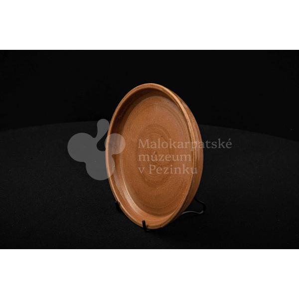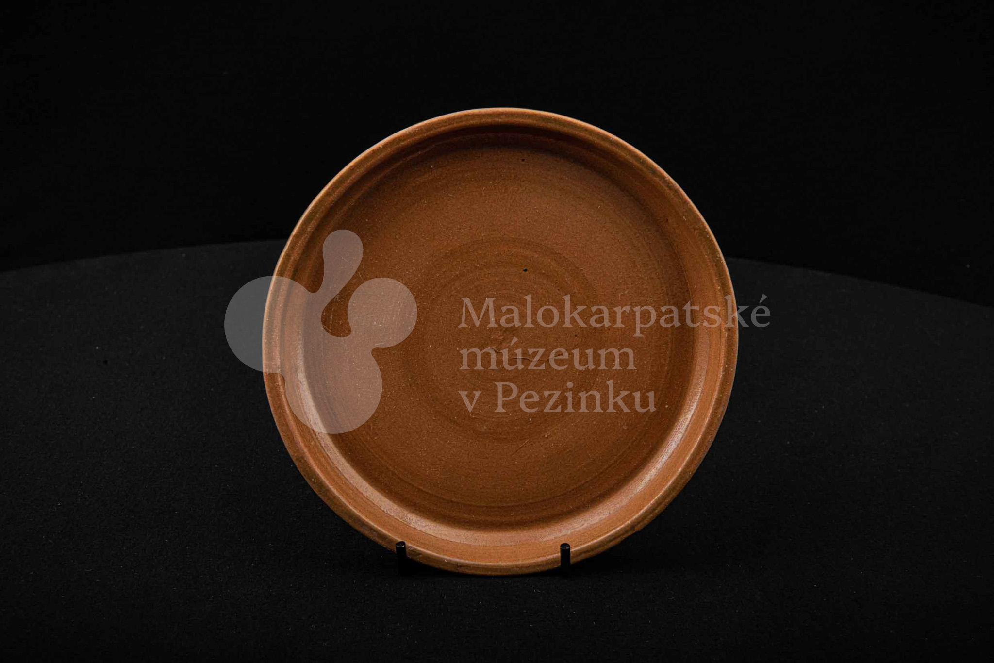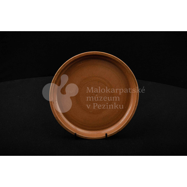Miska keramická, pod kvetináč, glejtovaná, hnedej farby. Má rovný okraj, bez značenia.