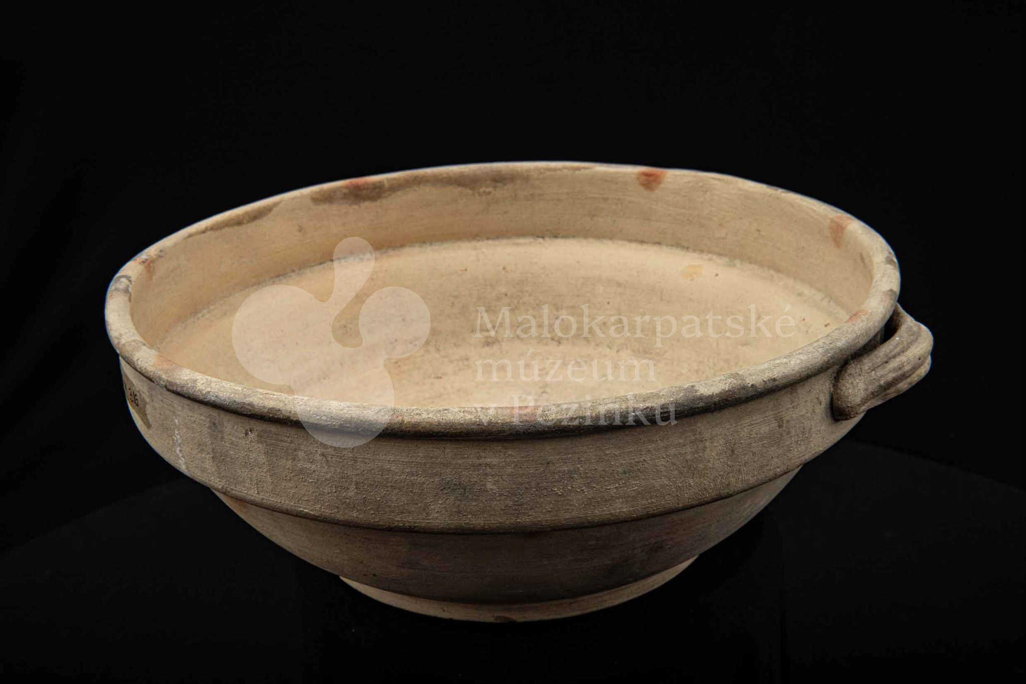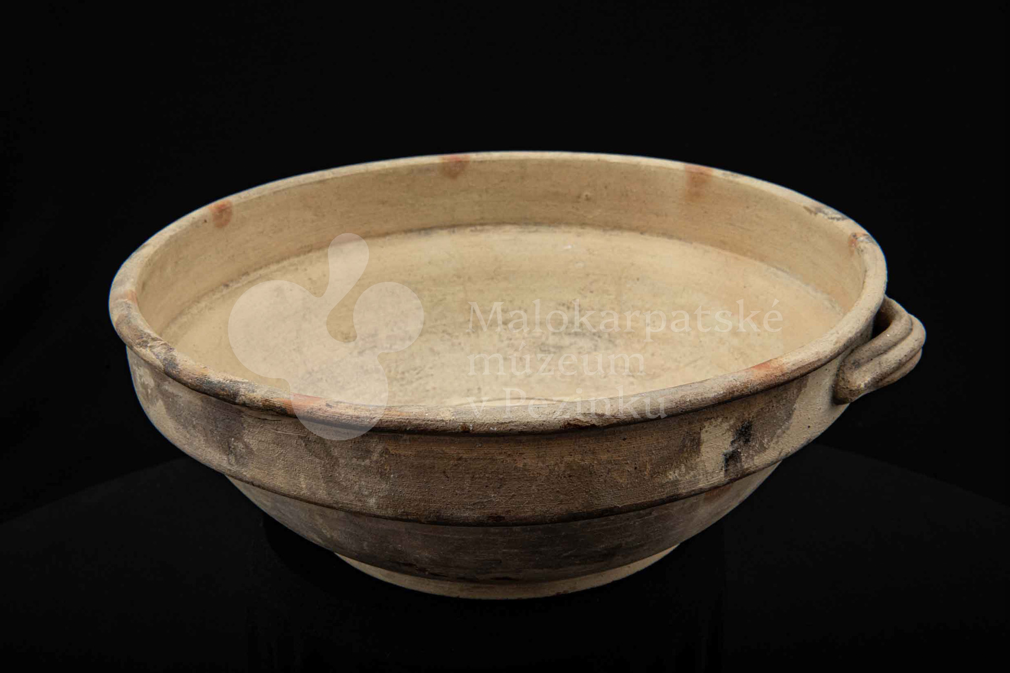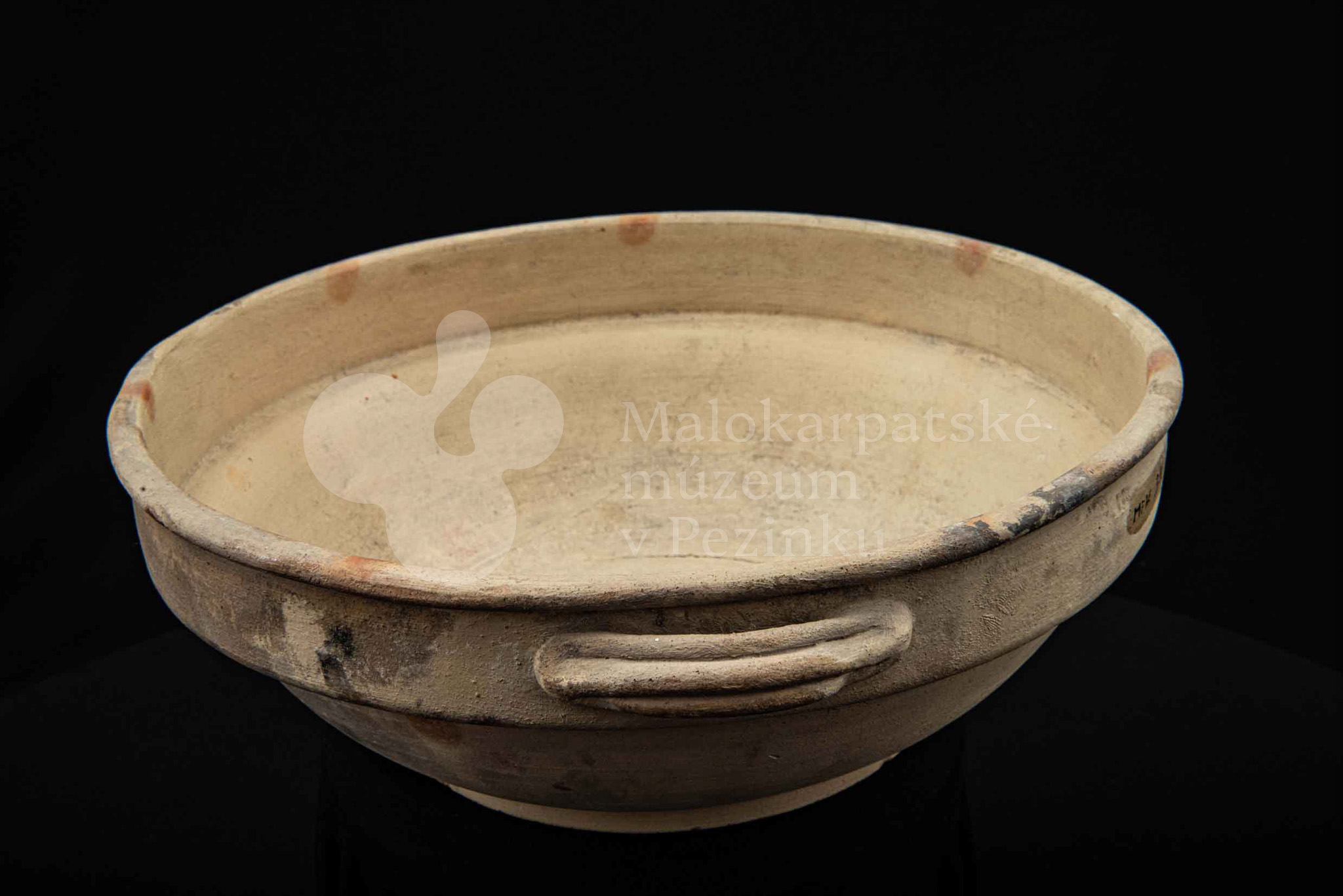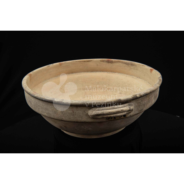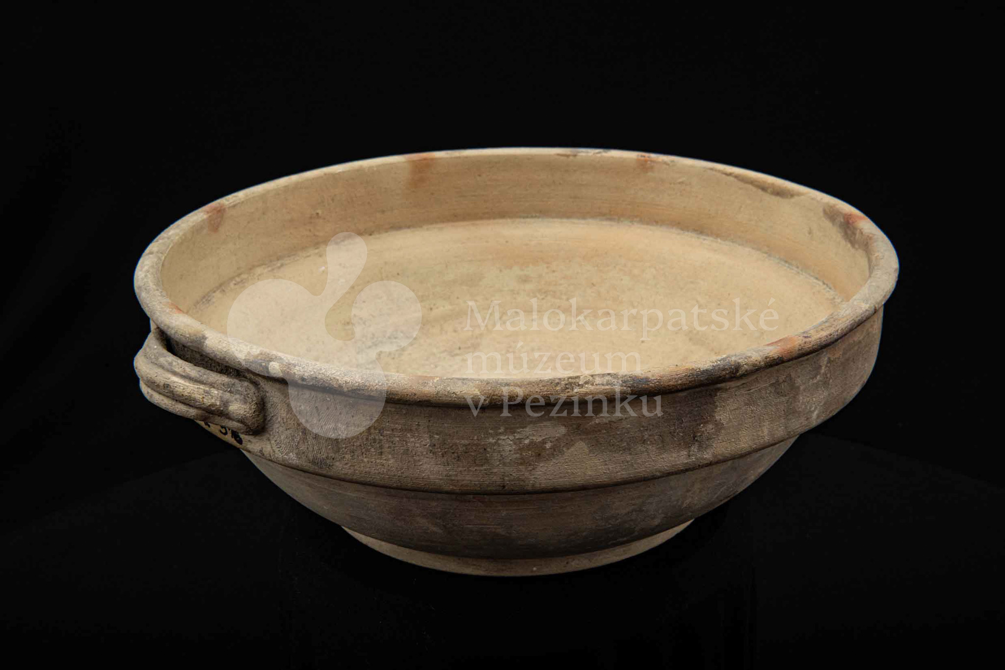 Misa keramická – neglazovaná, okrúhla s dvoma uškami. Obsahuje kremičitý piesok. Bez označenia.