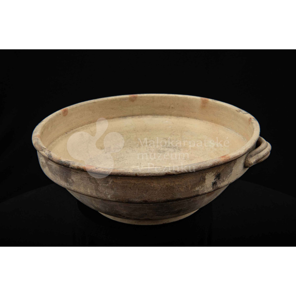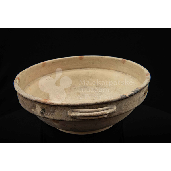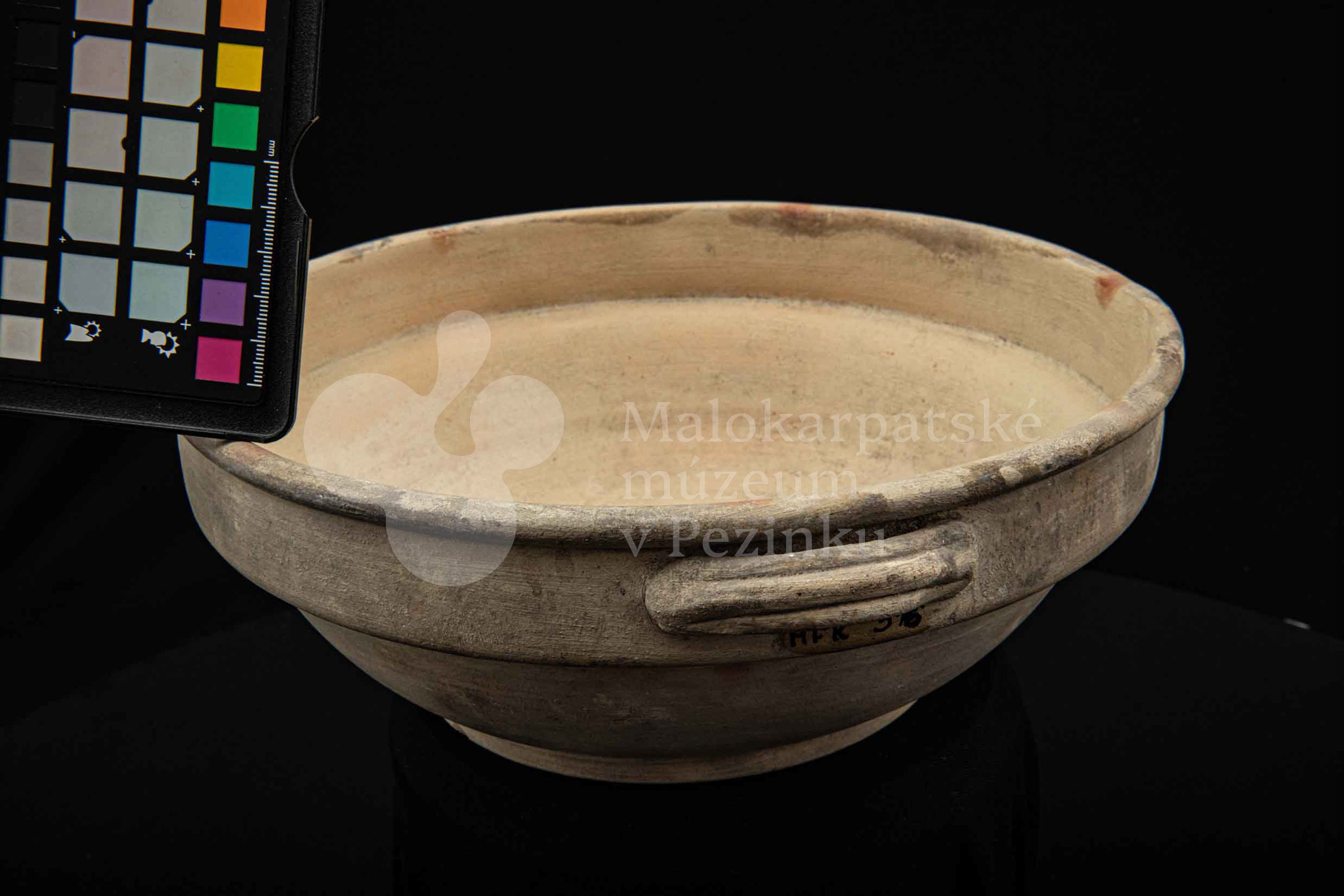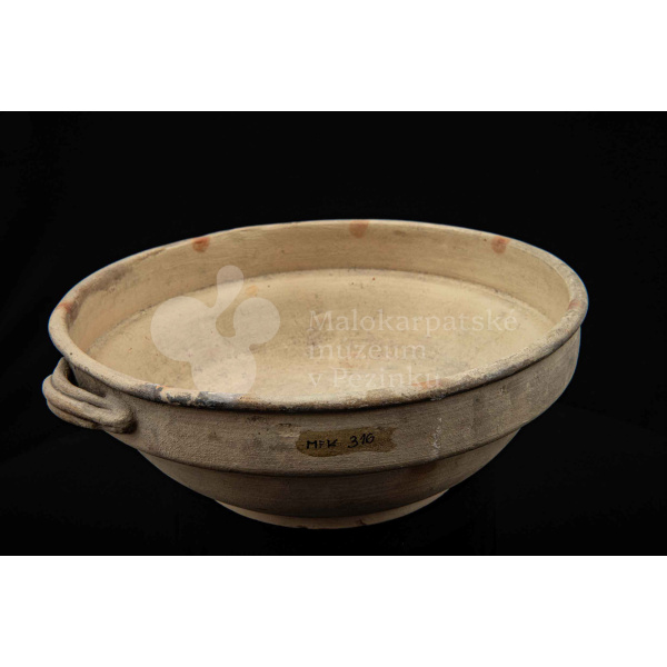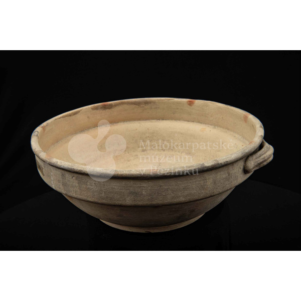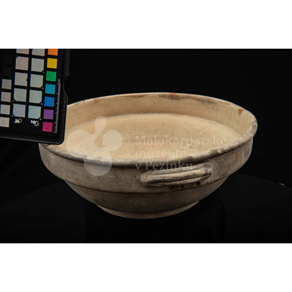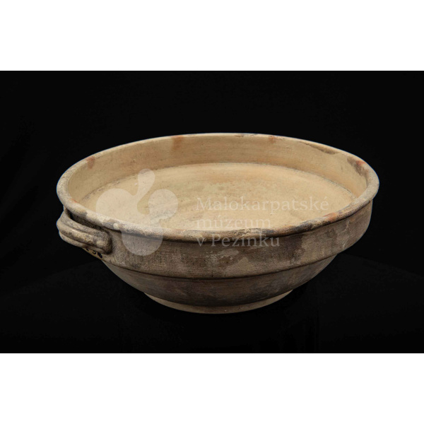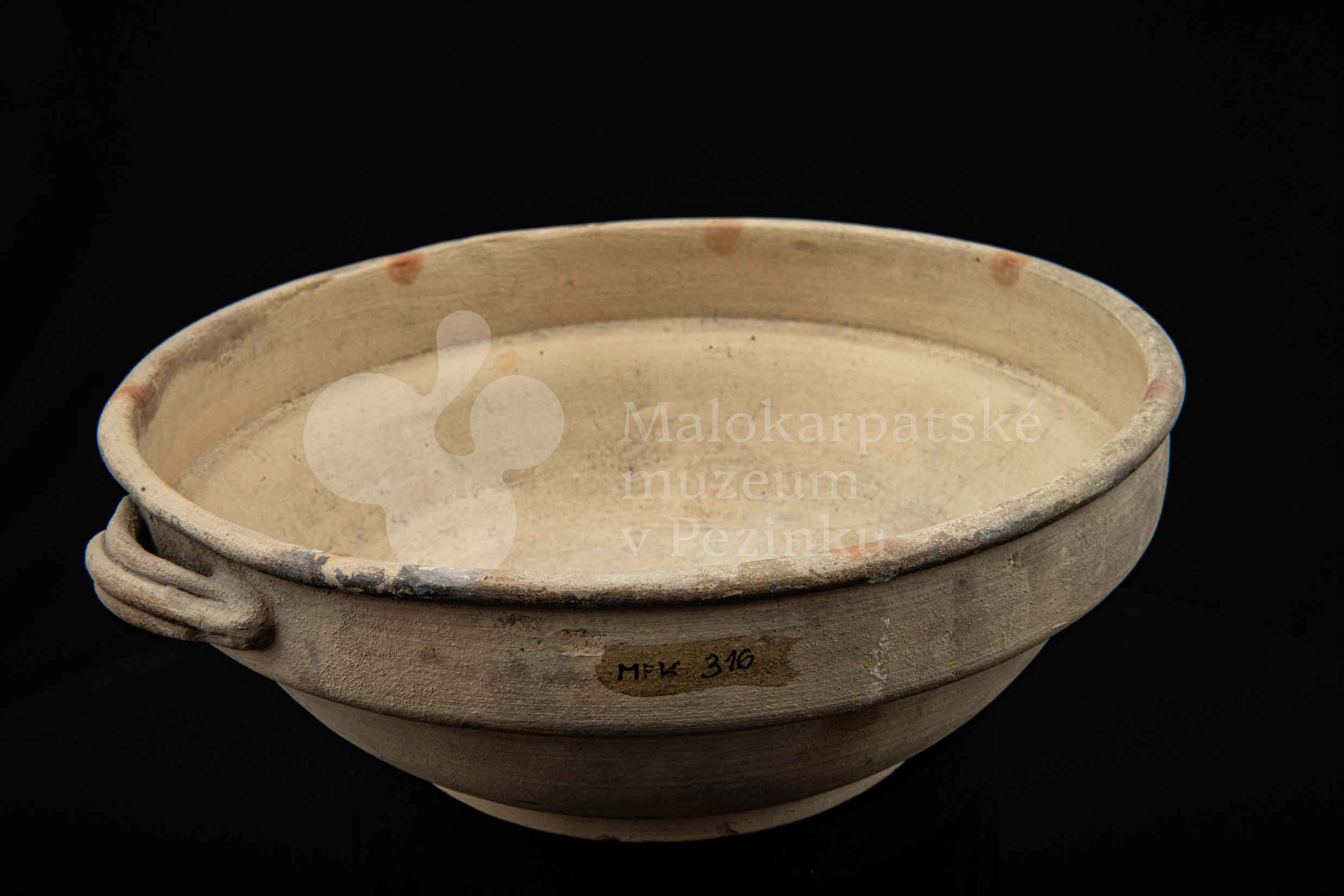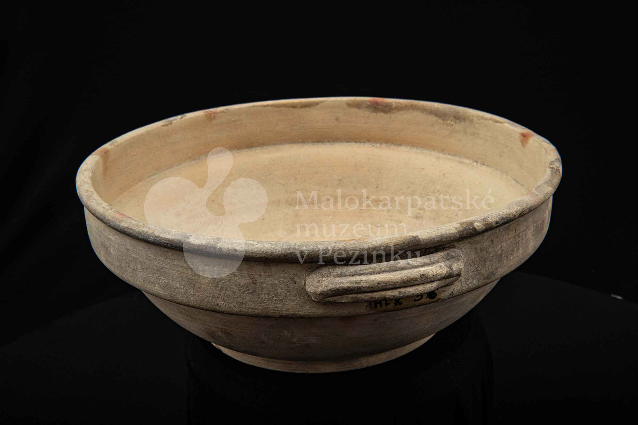 Misa keramická – neglazovaná, okrúhla s dvoma uškami. Obsahuje kremičitý piesok. Bez označenia.