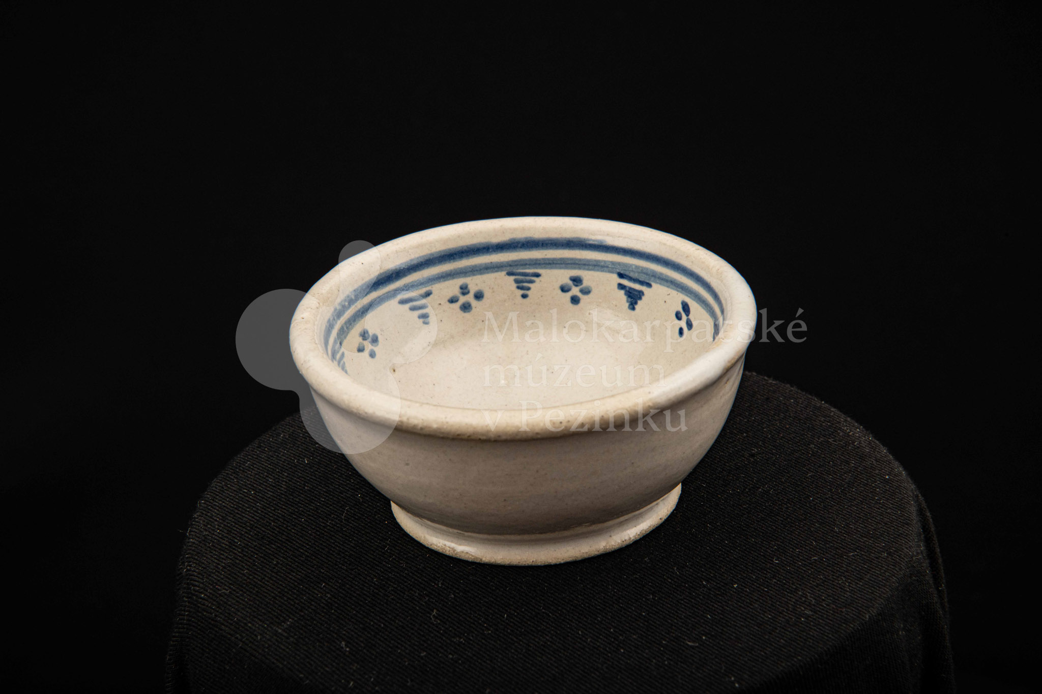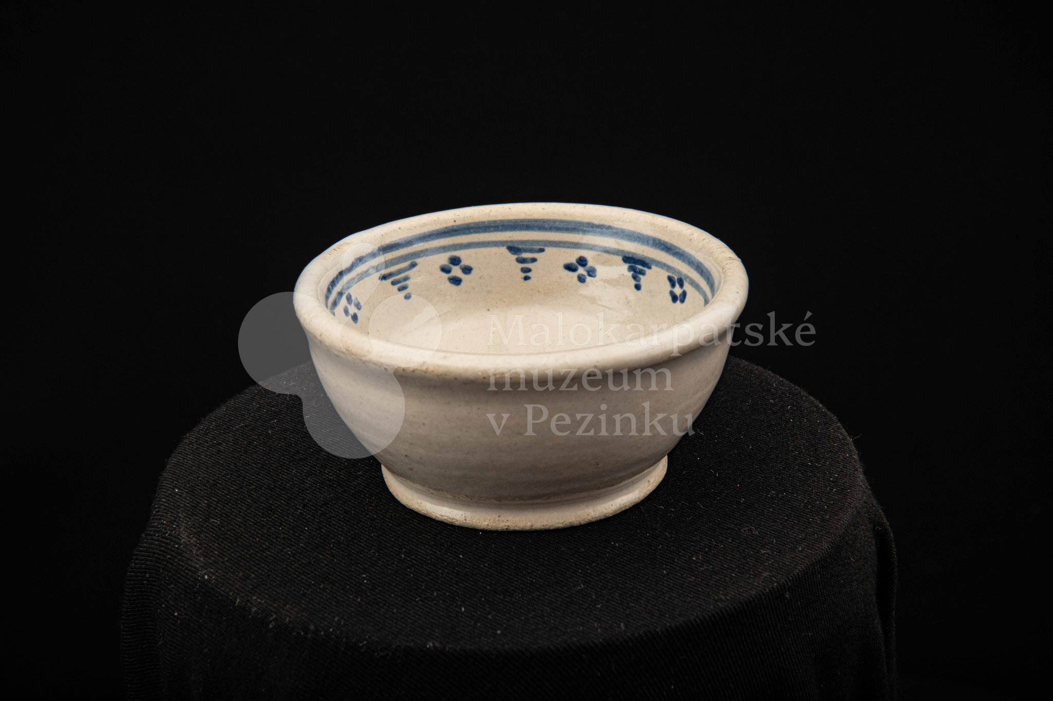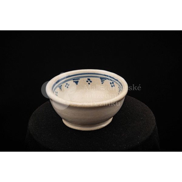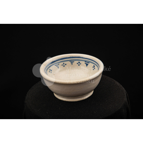 Mištička fajansová – bielo glazovaná, hlboká, v strede modrý kvietok, po okraji jemná modrá výzdoba. Vysokožiarny dekor modrej farby. Na dne značenie FK.ST.
