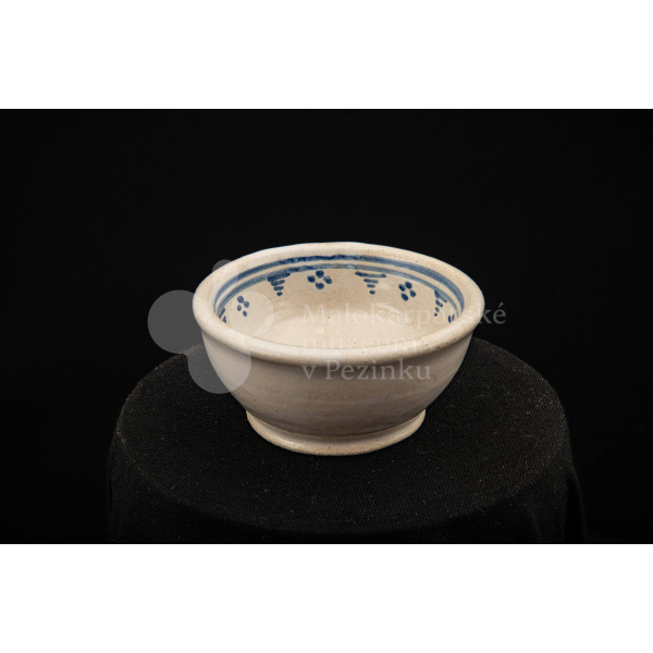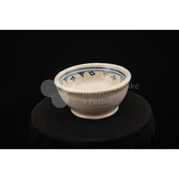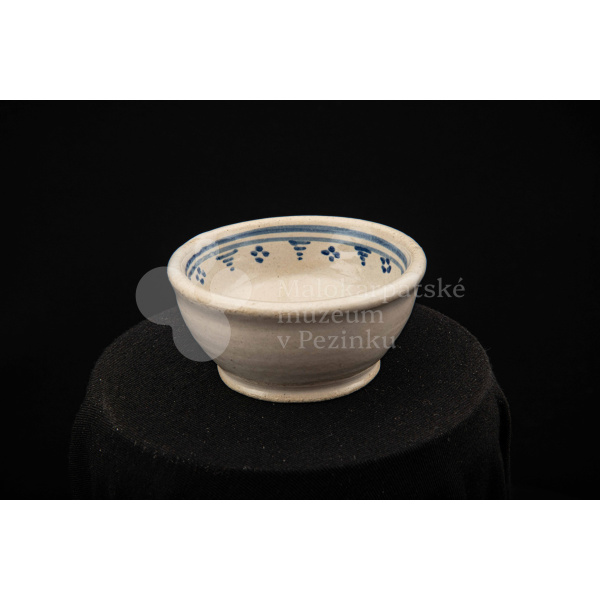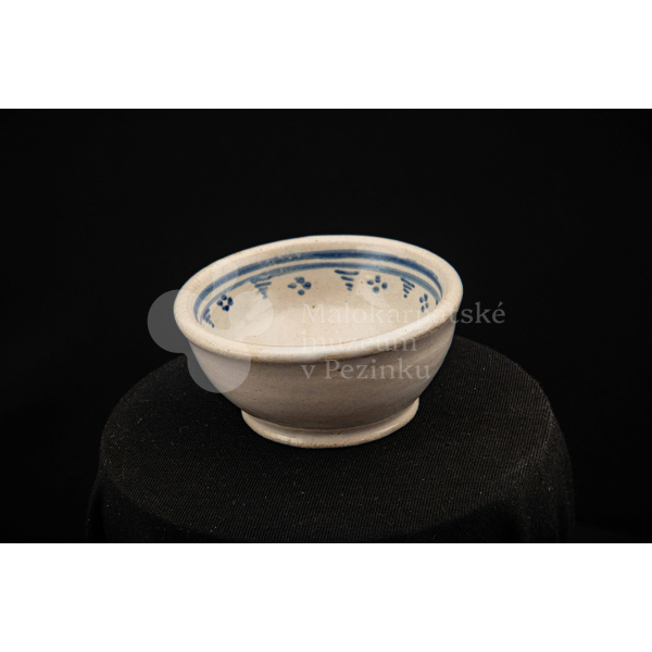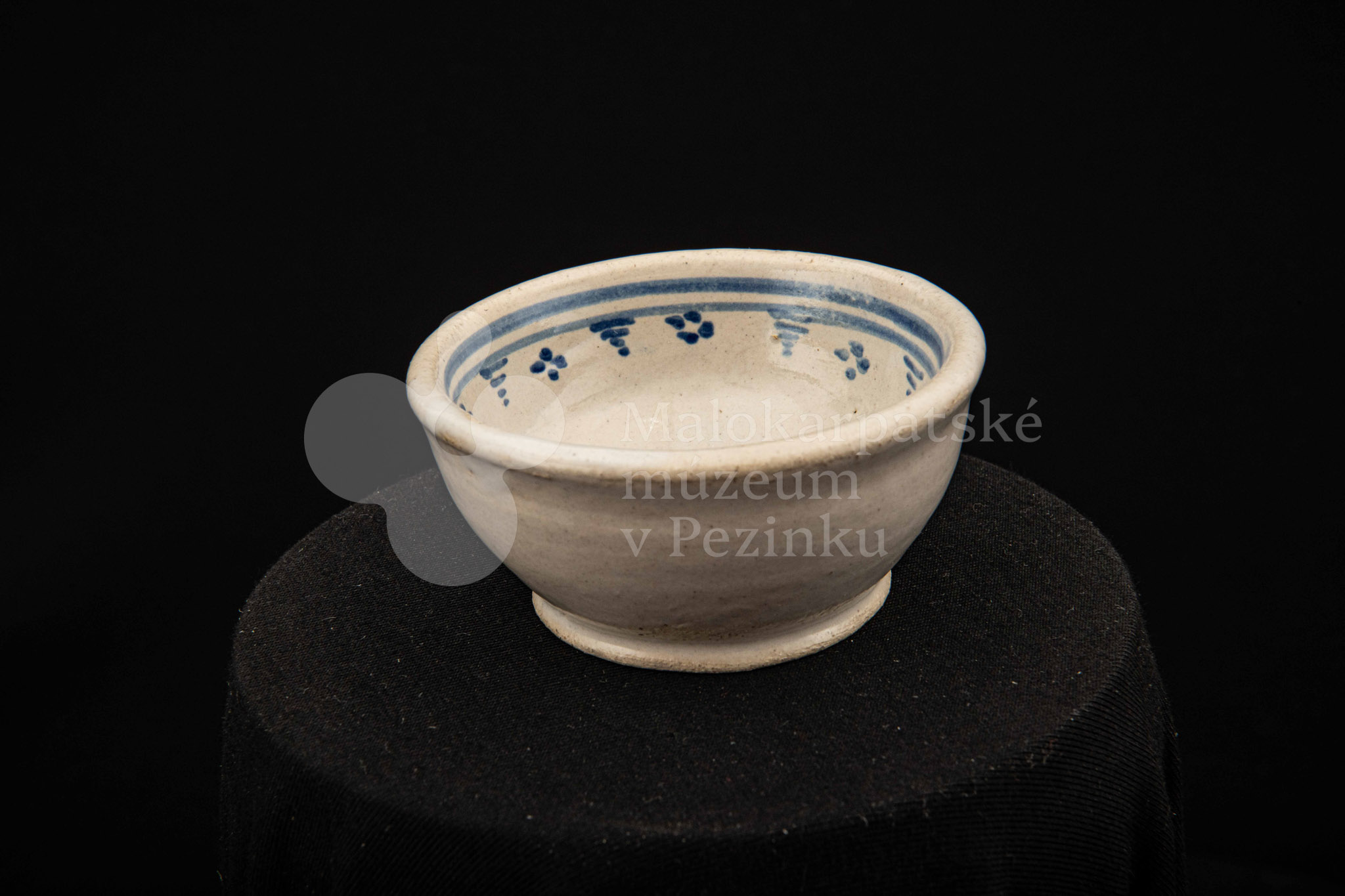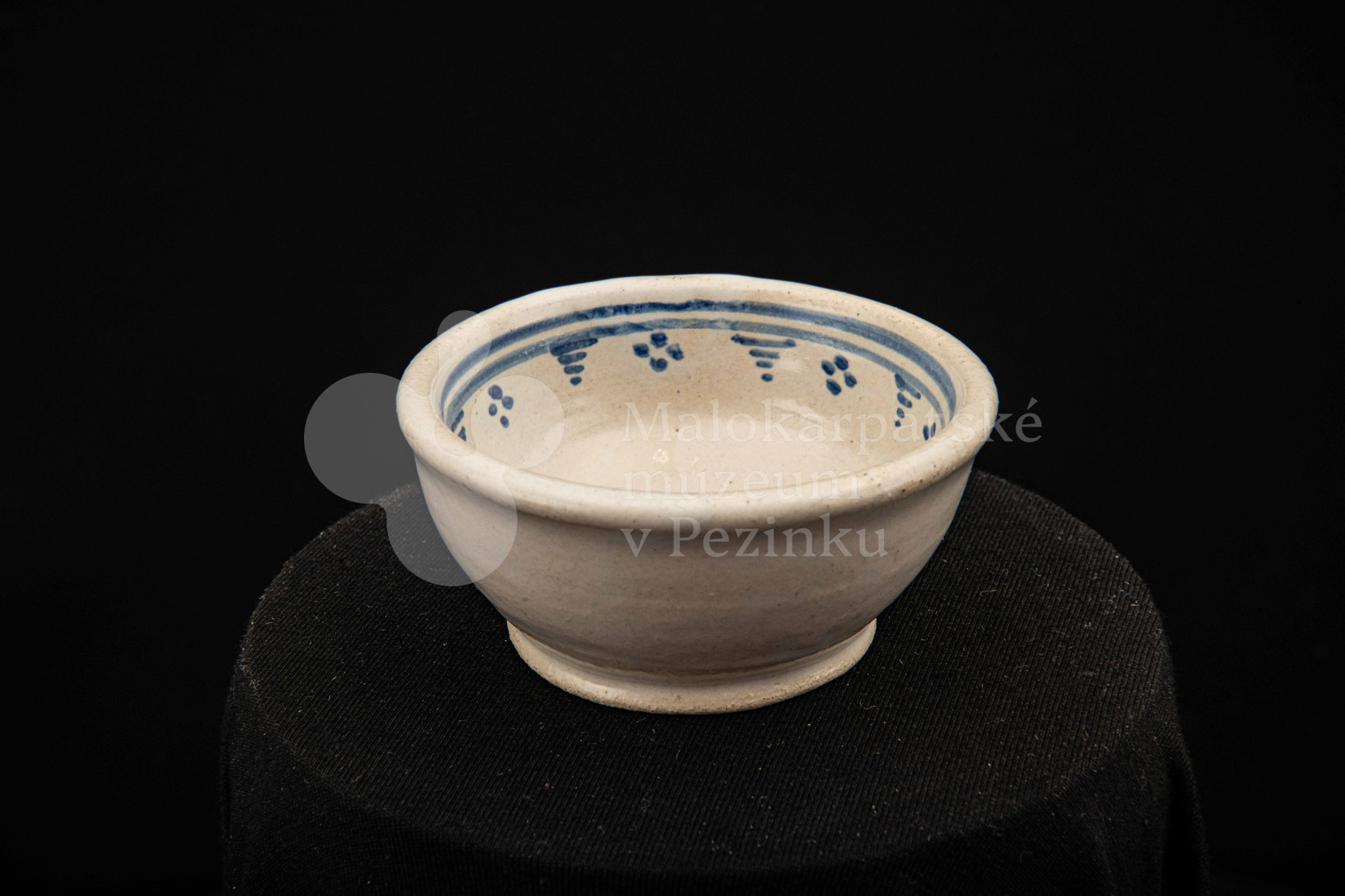 Mištička fajansová – bielo glazovaná, hlboká, v strede modrý kvietok, po okraji jemná modrá výzdoba. Vysokožiarny dekor modrej farby. Na dne značenie FK.ST.