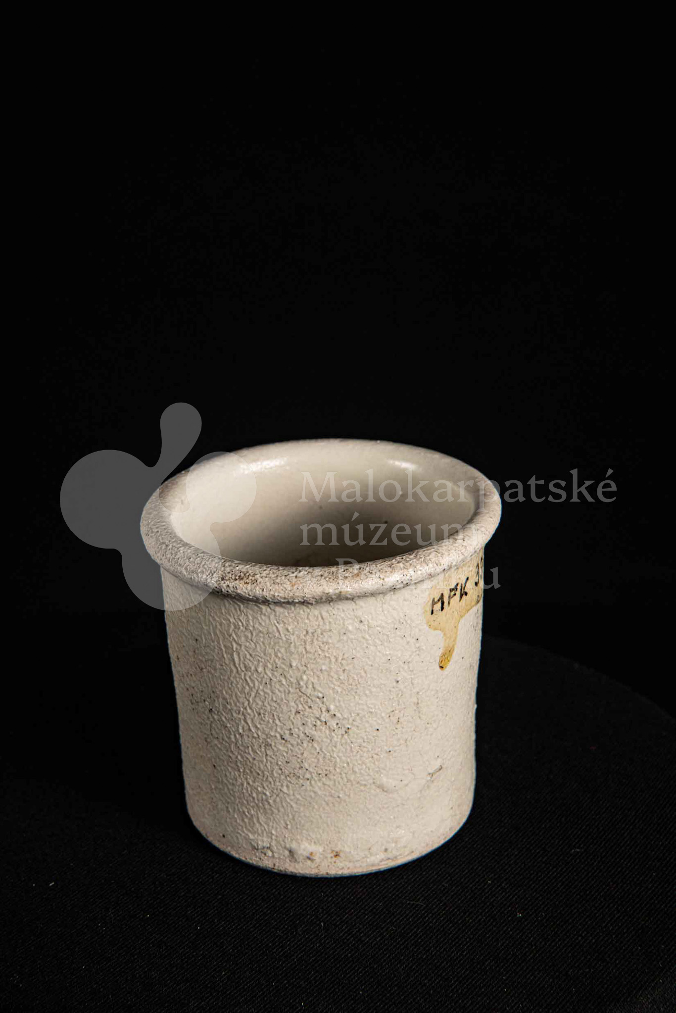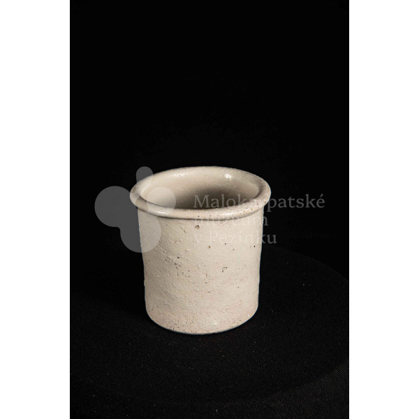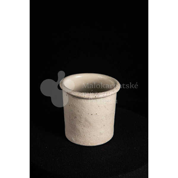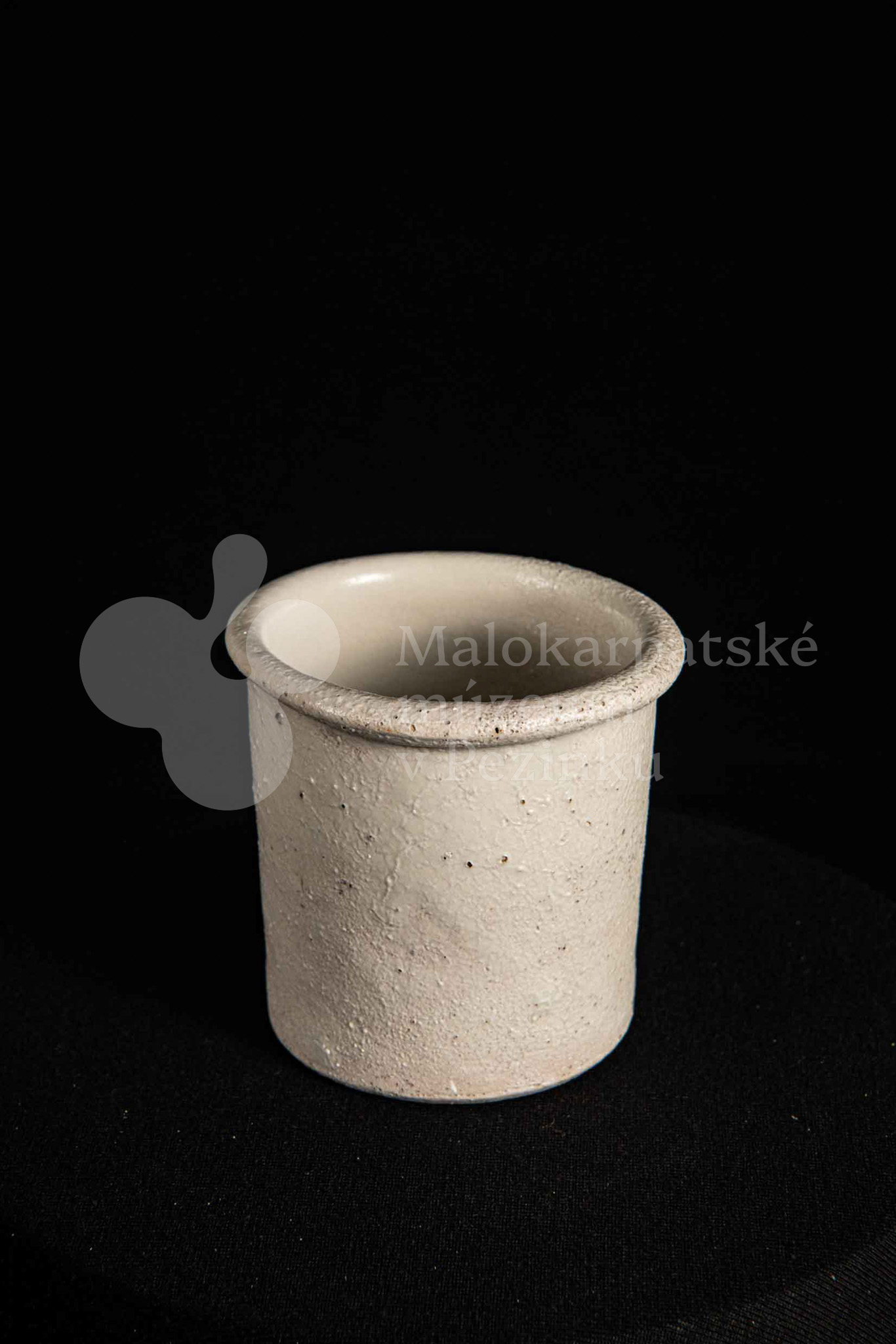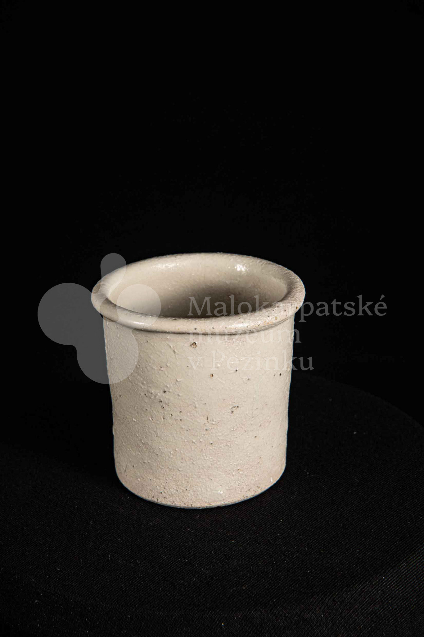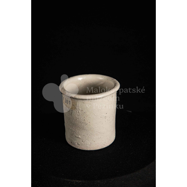 Menšia keramická nádoba so surovinou, bielo glazovaná, hlboká, valcového tvaru.