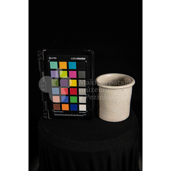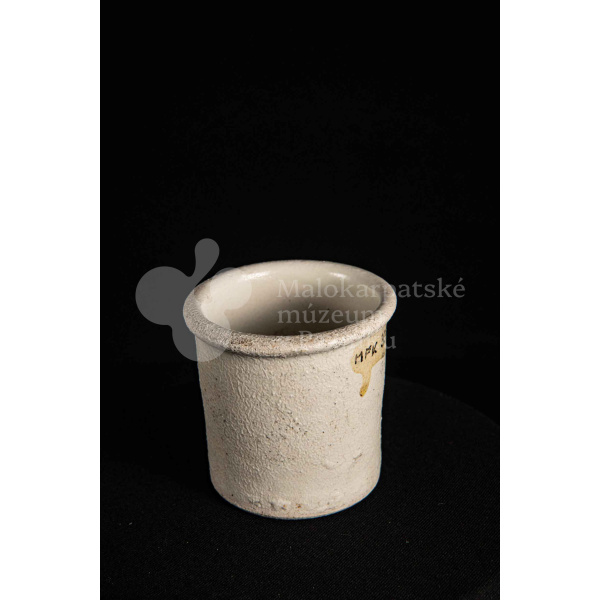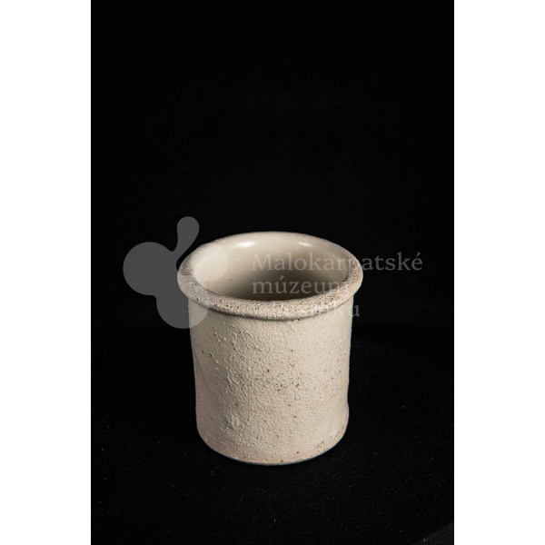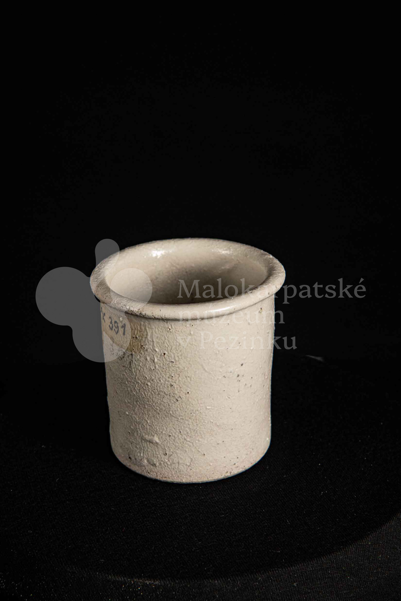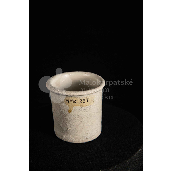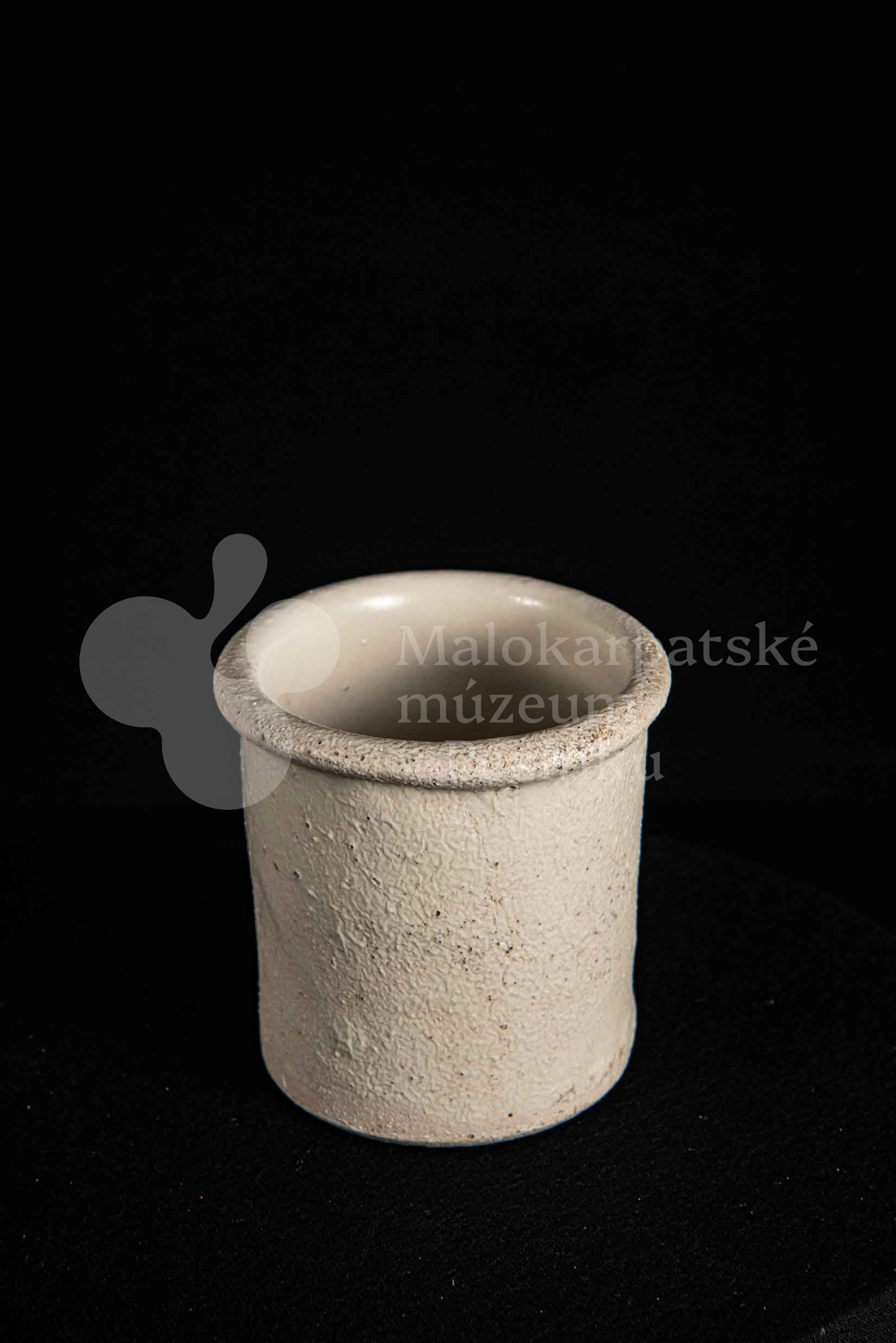 Menšia keramická nádoba so surovinou, bielo glazovaná, hlboká, valcového tvaru.