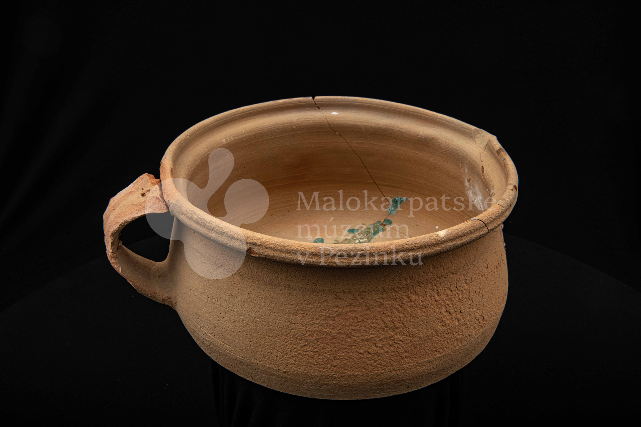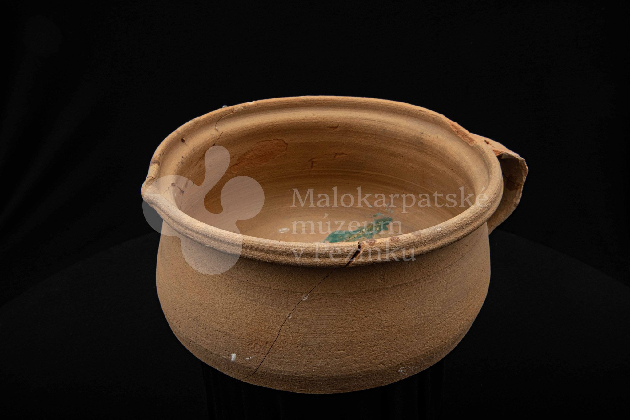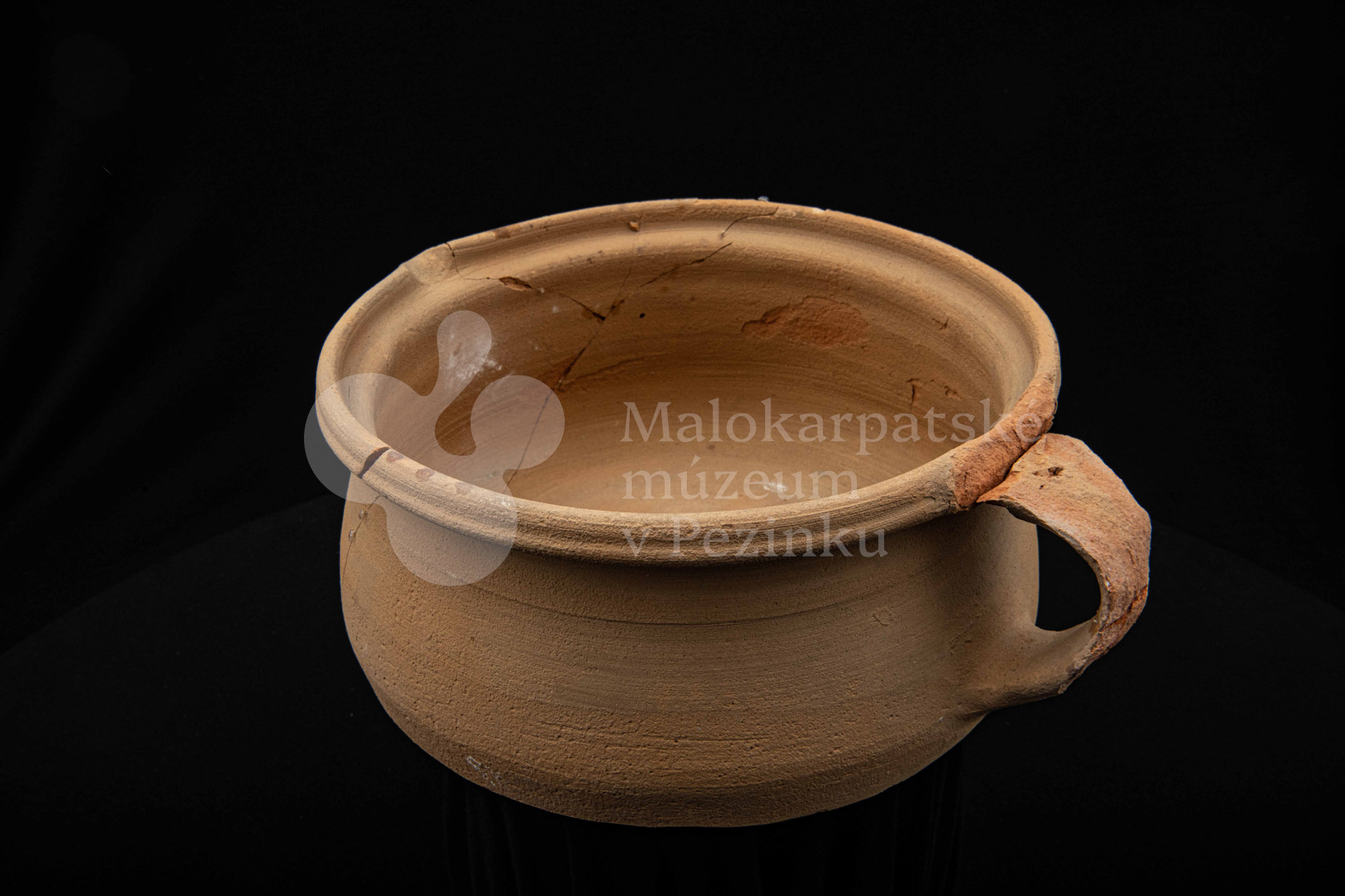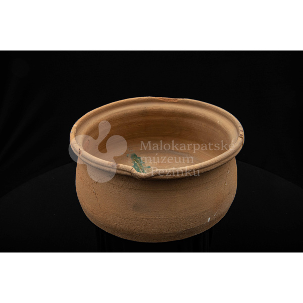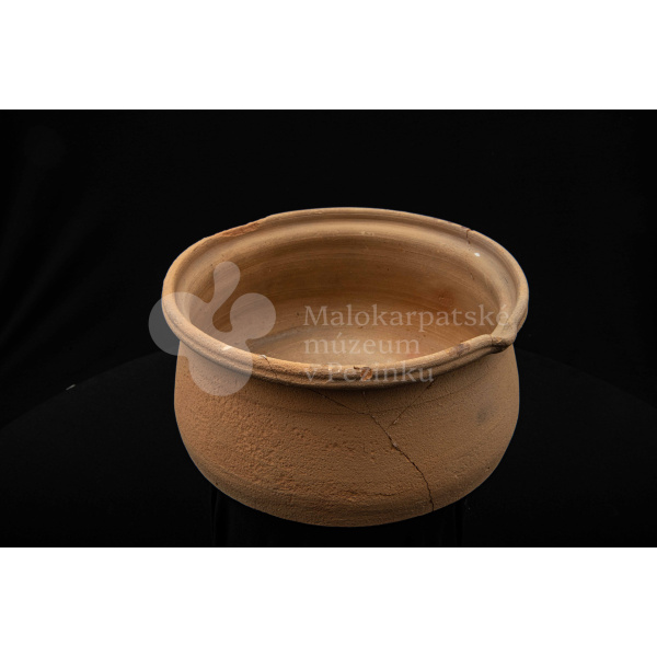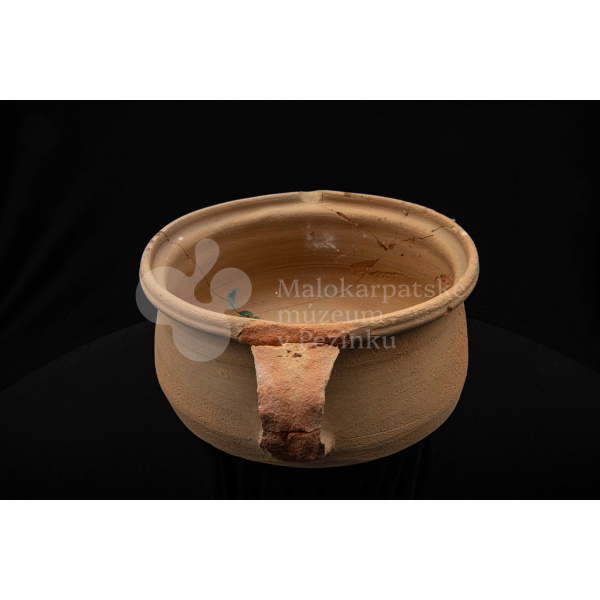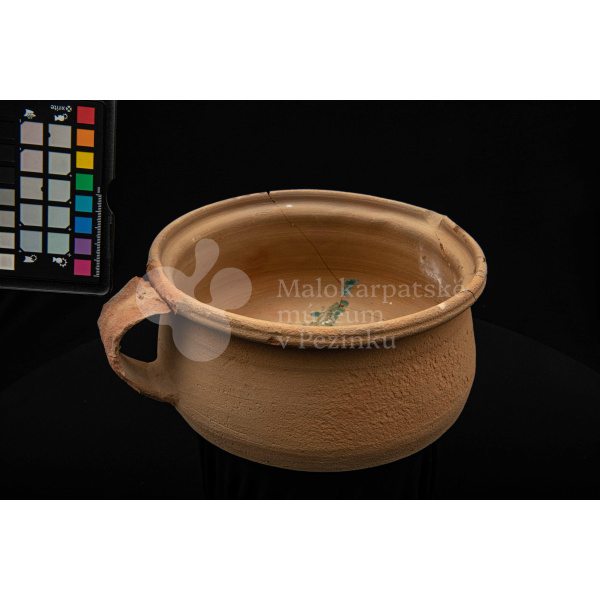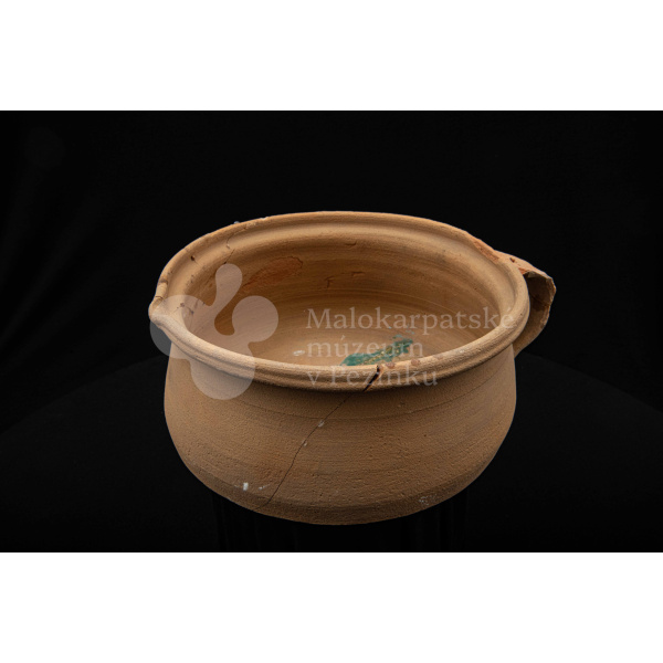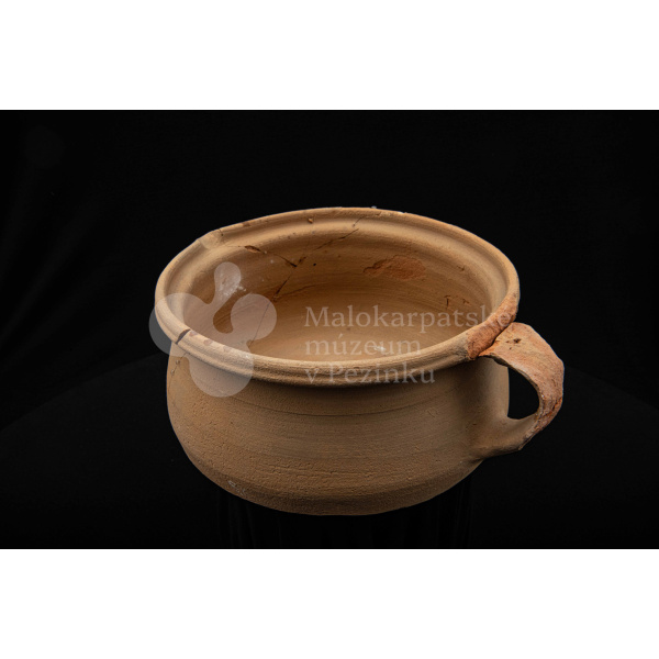 Keramická hlbšia nádoba s jedným uchom a s pyštekom na vrúbenom kraji. Nádoba je neglazovaná a poškodená. Pochádza z 19. storočia.