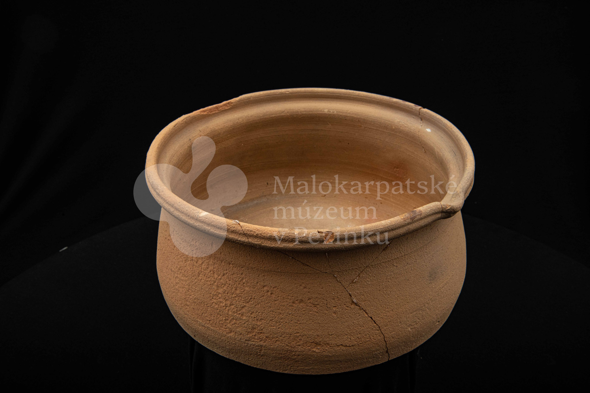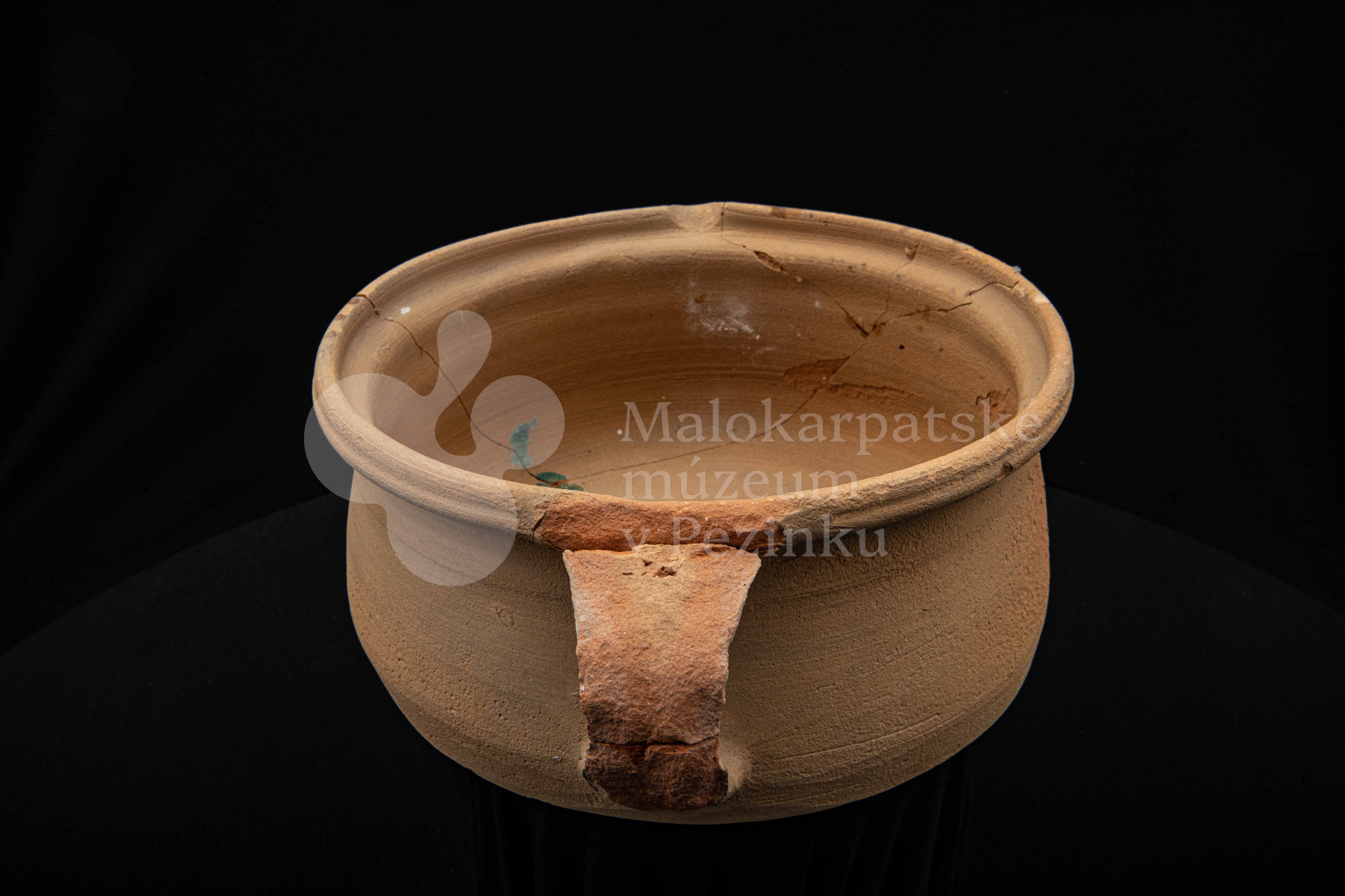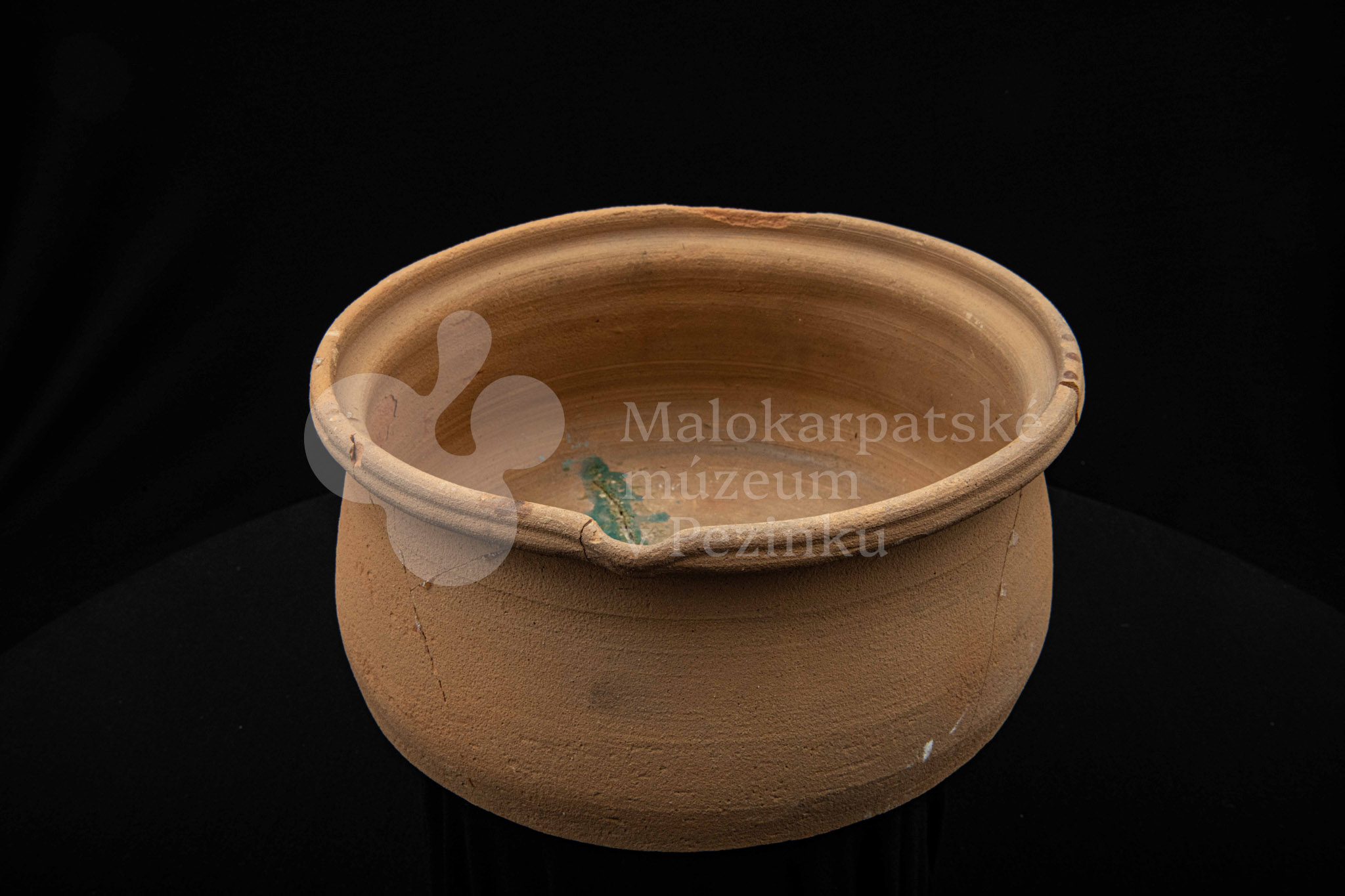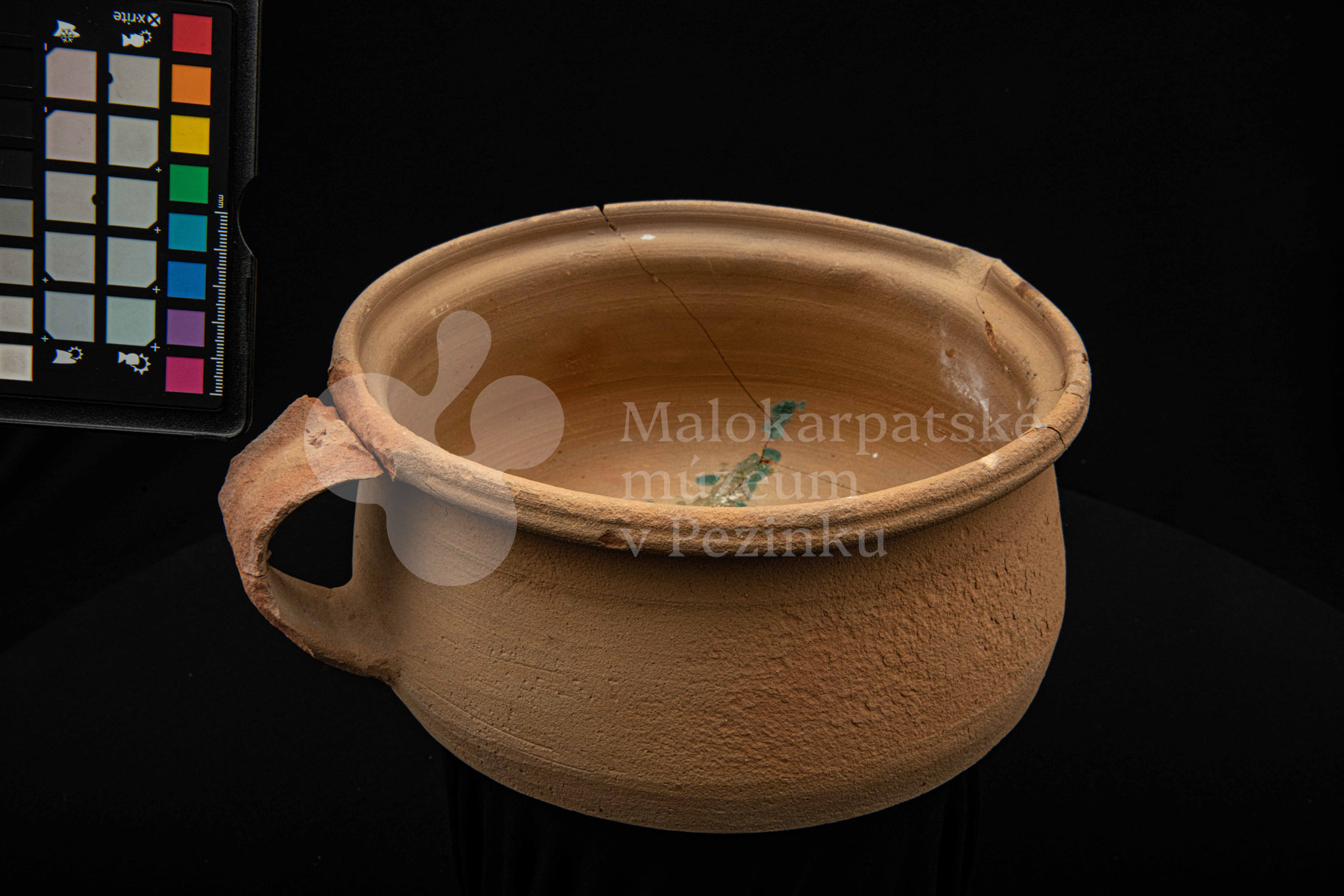 Keramická hlbšia nádoba s jedným uchom a s pyštekom na vrúbenom kraji. Nádoba je neglazovaná a poškodená. Pochádza z 19. storočia.