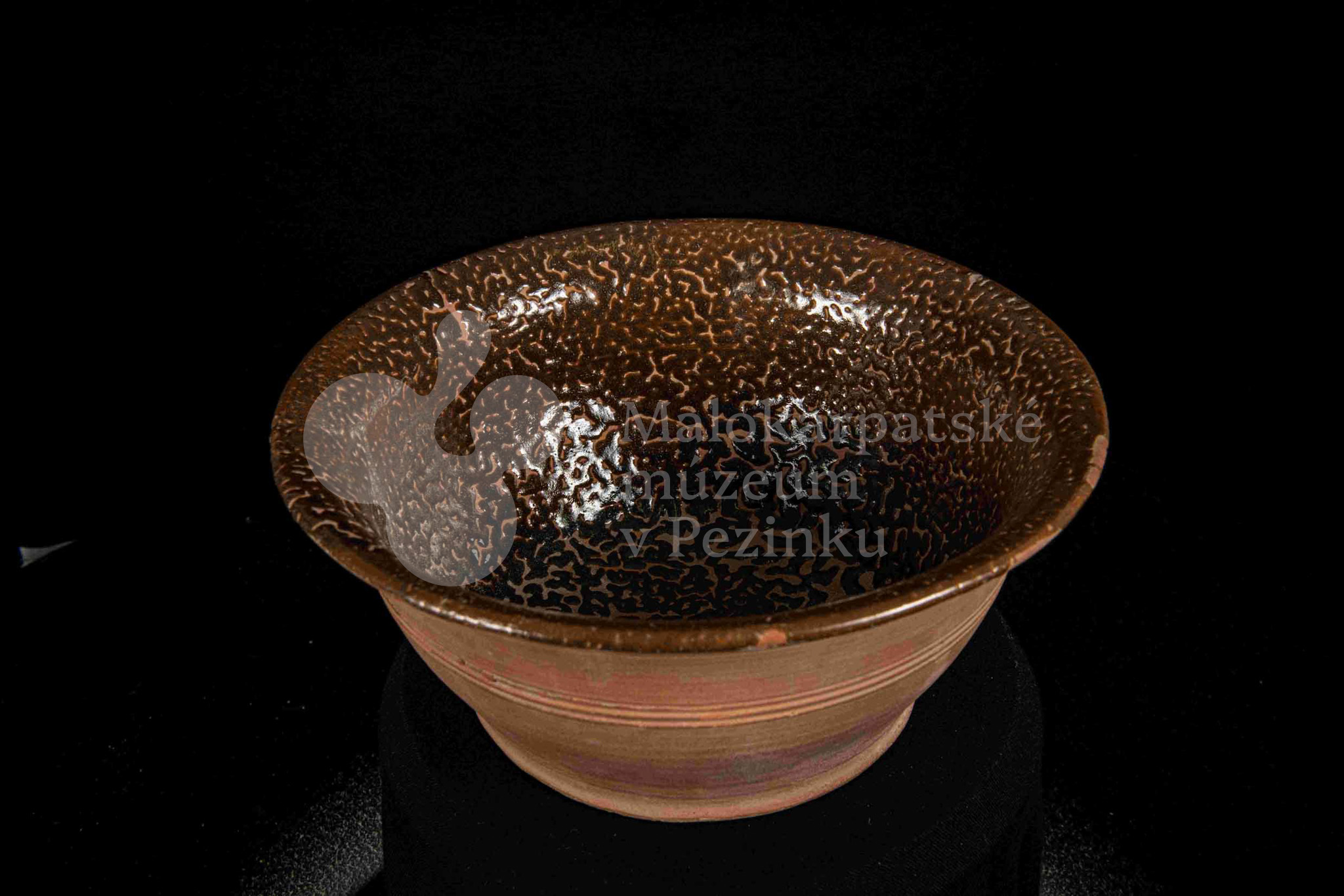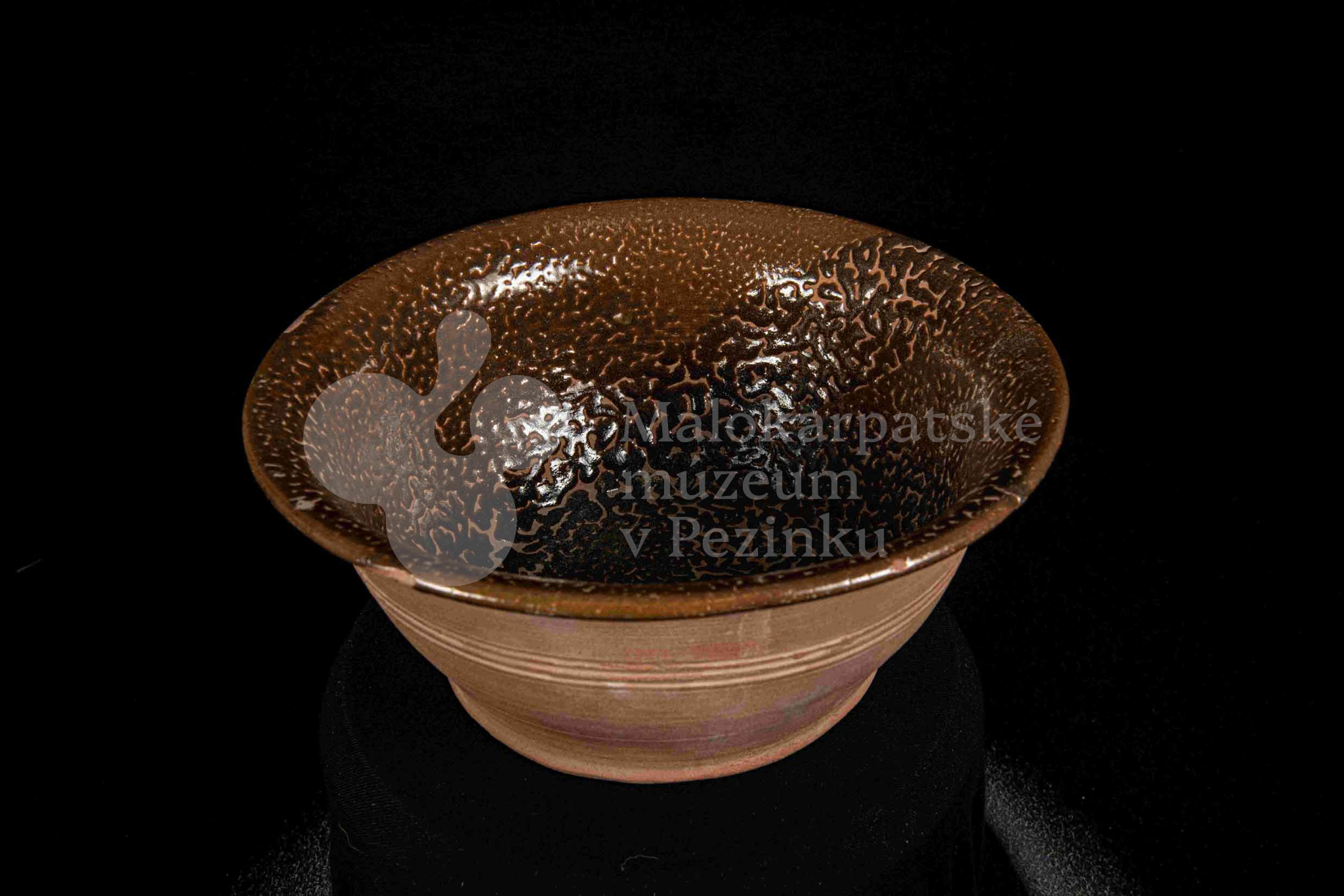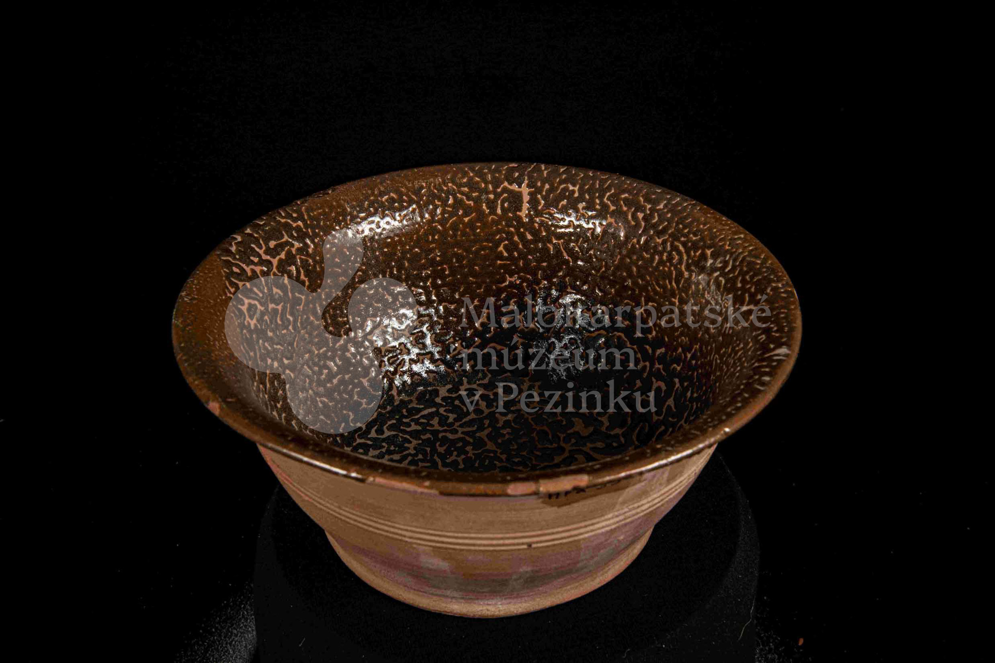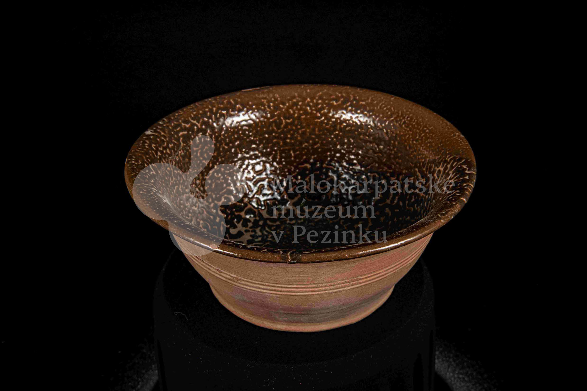 Keramická miska, hlboká, okrúhleho tvaru, z vonkajšej strany neglazovaná, z vnútornej strany poliata hnedým popraskaným glajtom. Obsahuje surovinu potrebnú k príprave glazúr.