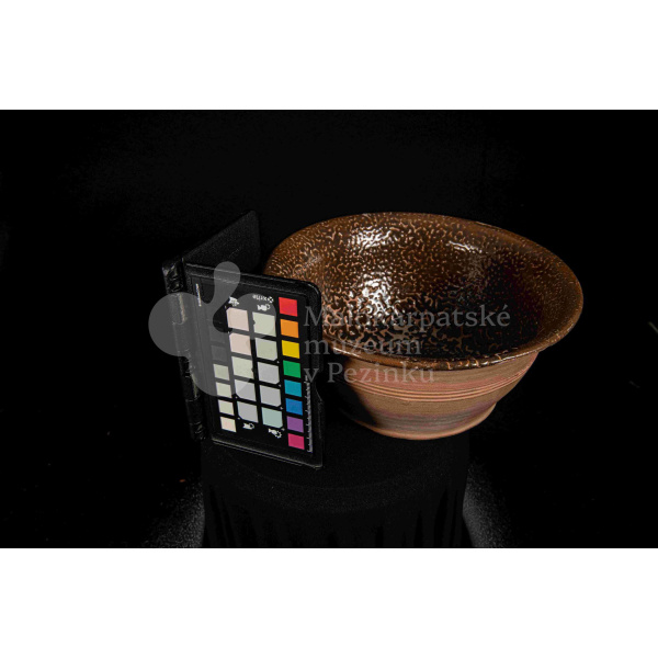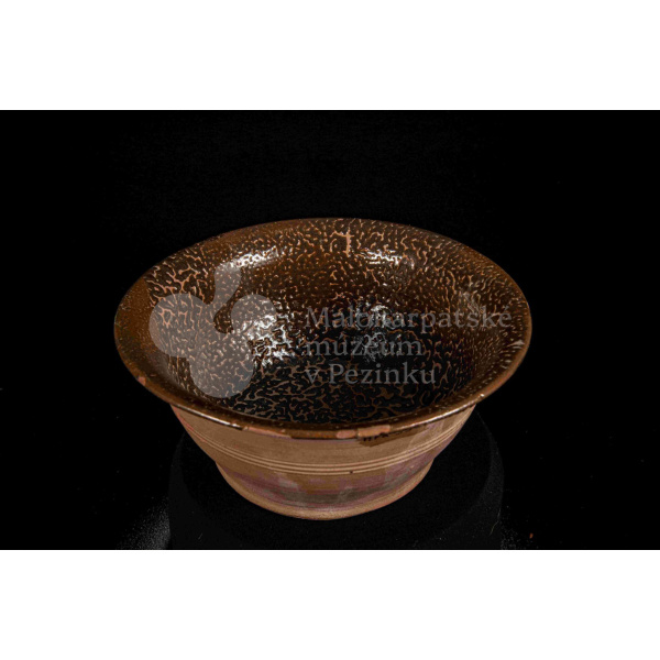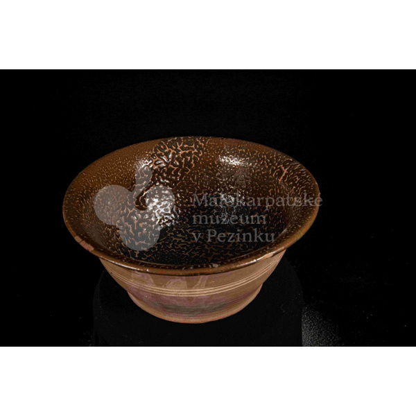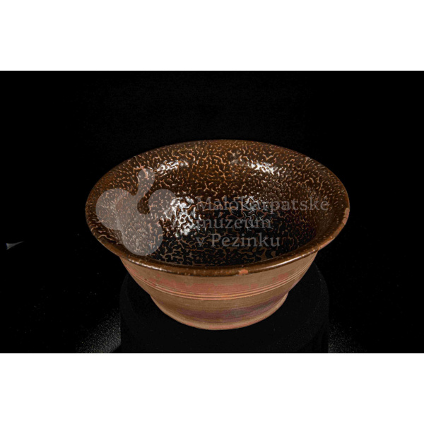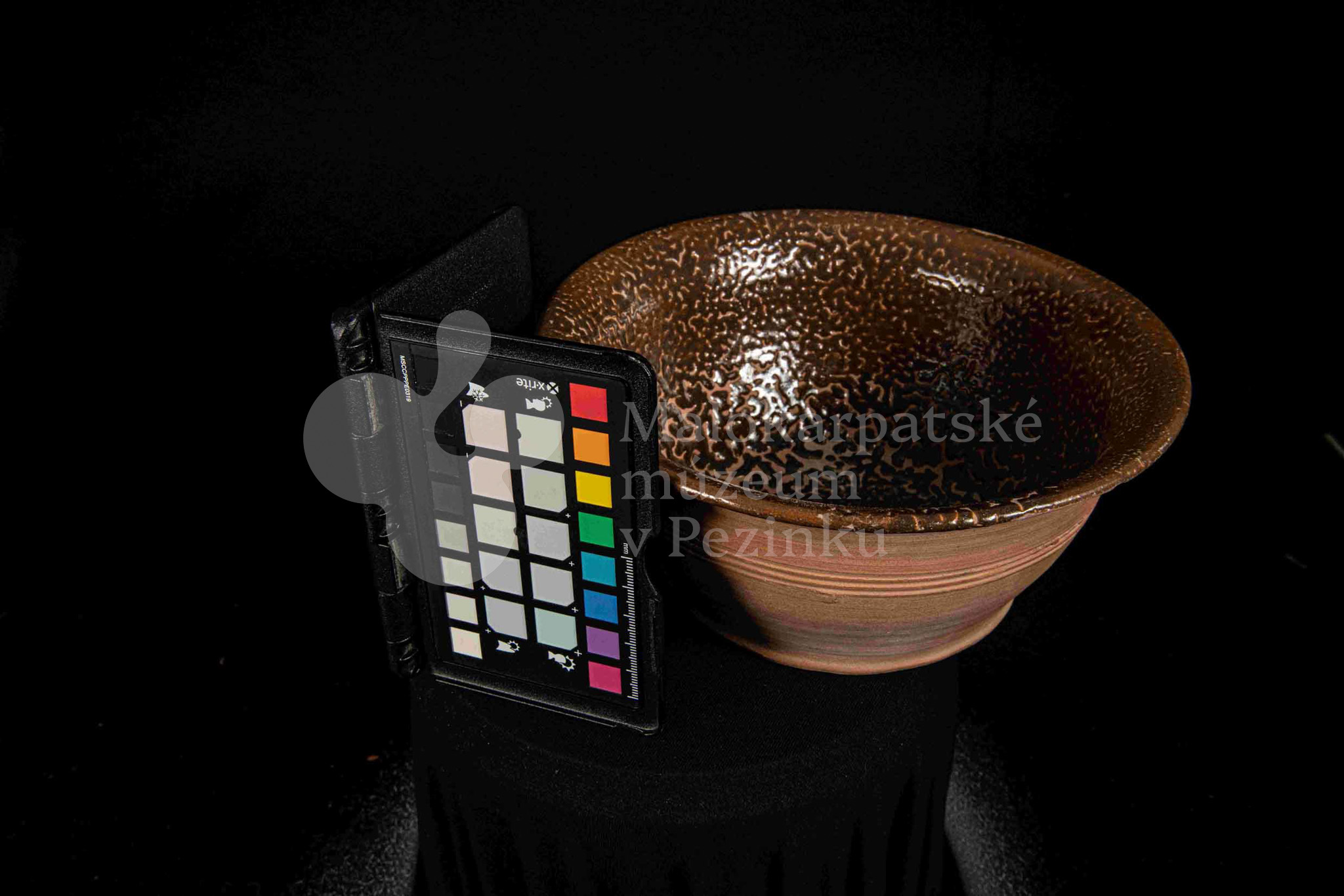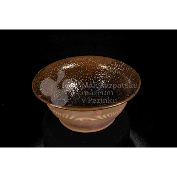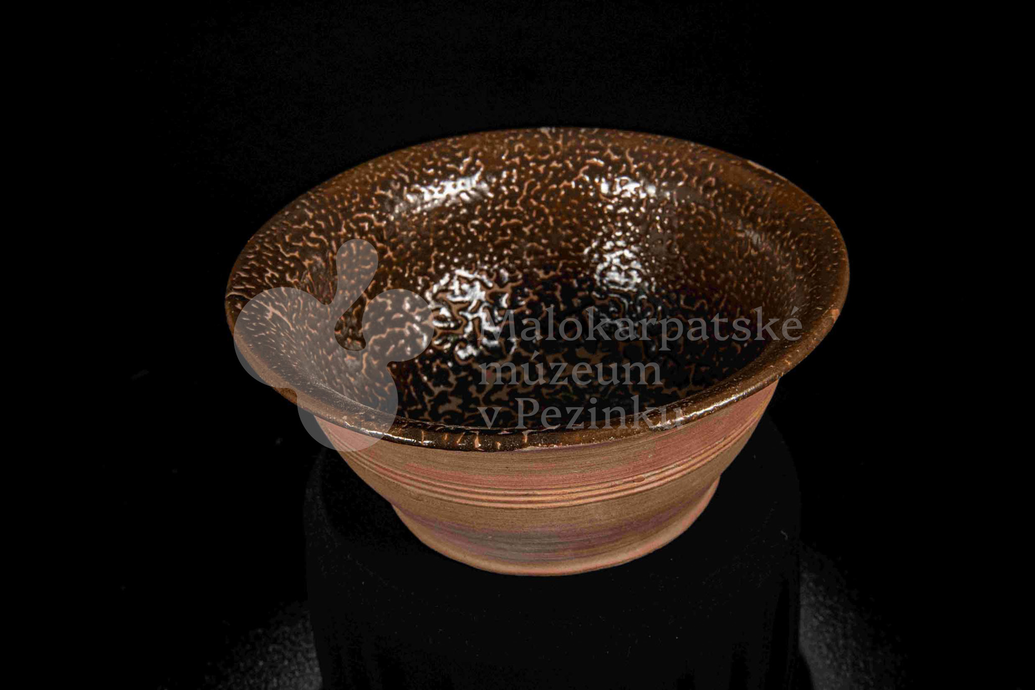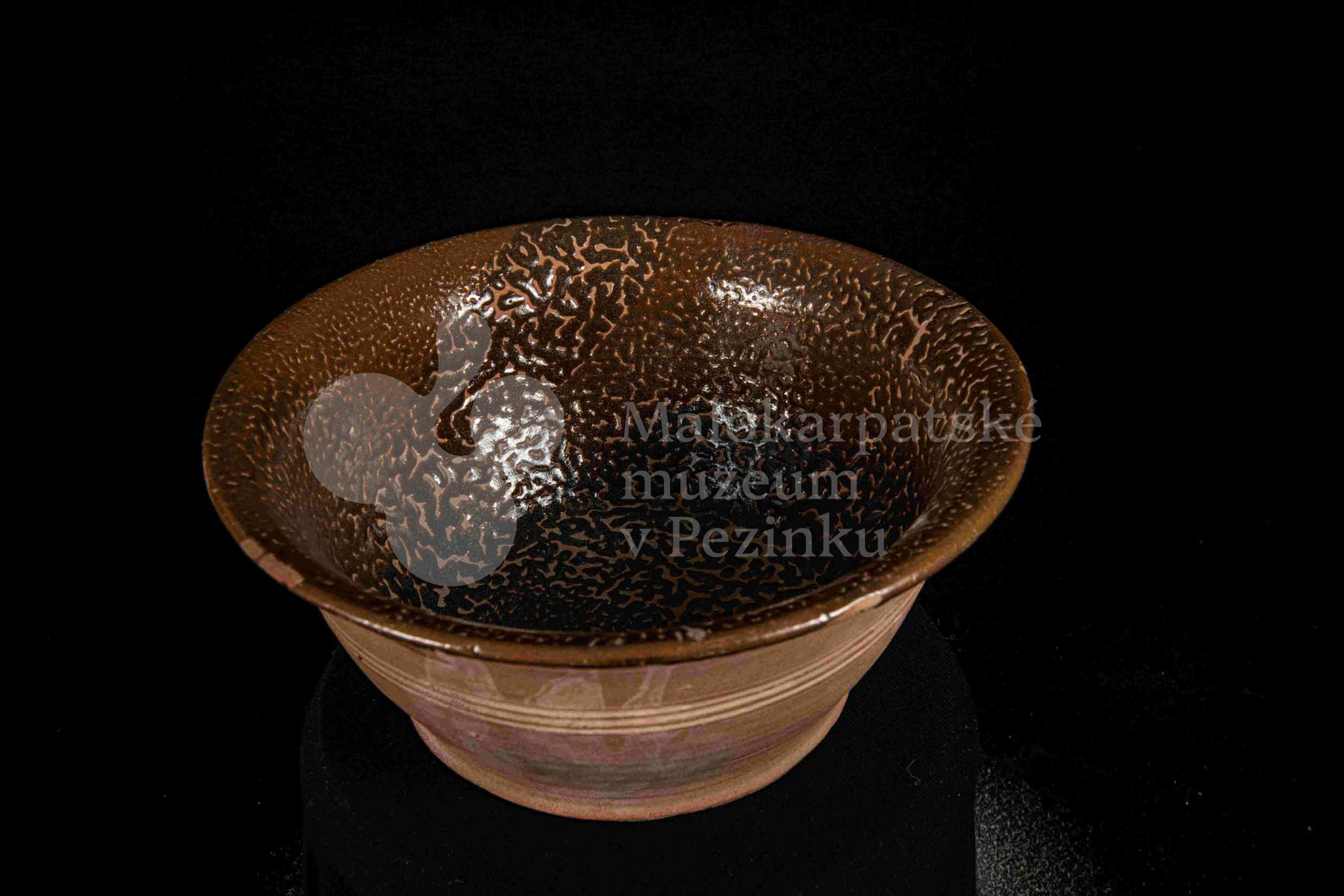 Keramická miska, hlboká, okrúhleho tvaru, z vonkajšej strany neglazovaná, z vnútornej strany poliata hnedým popraskaným glajtom. Obsahuje surovinu potrebnú k príprave glazúr.