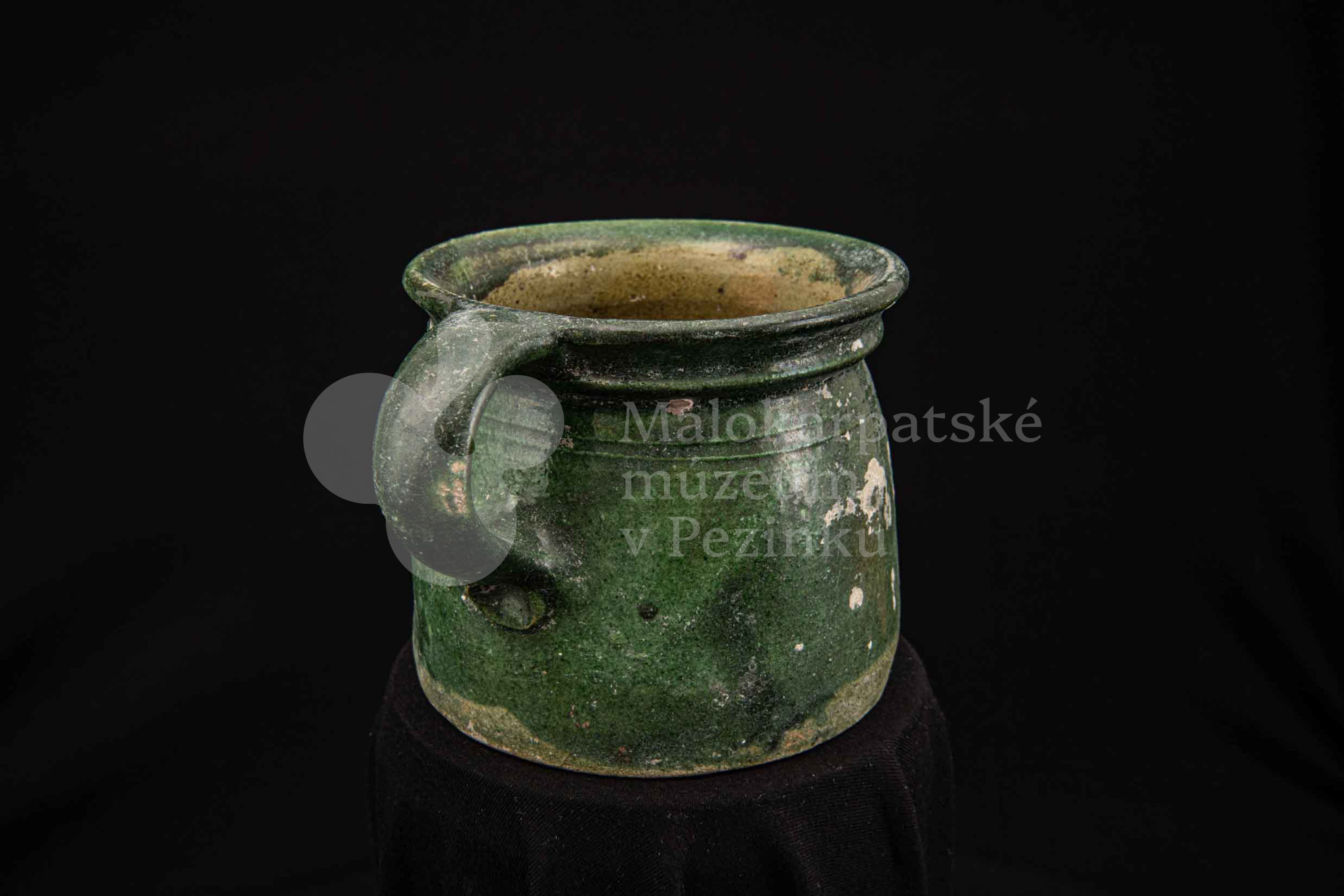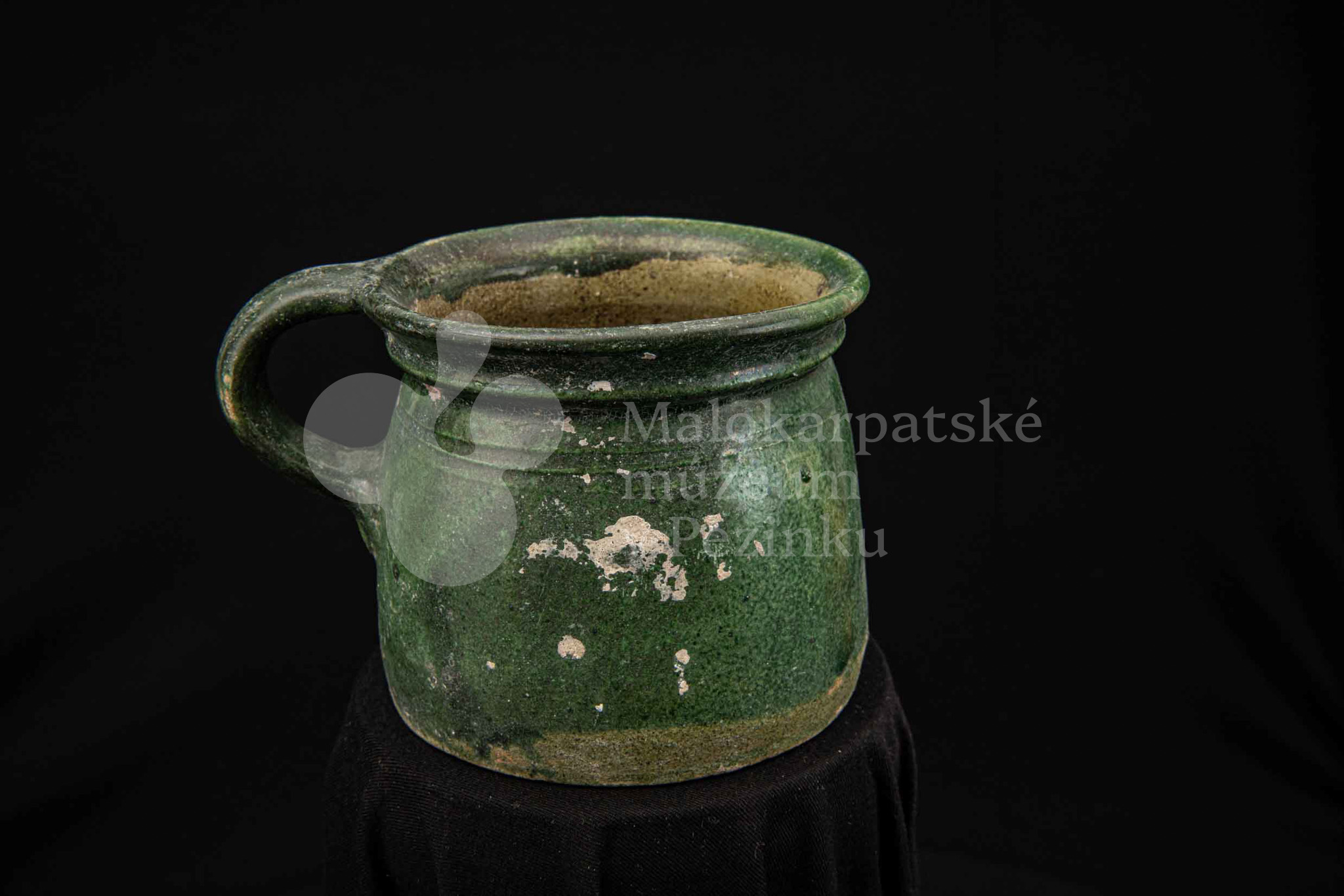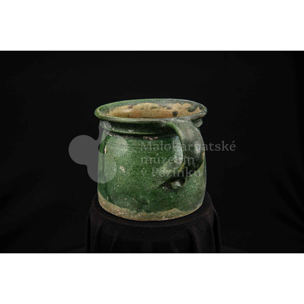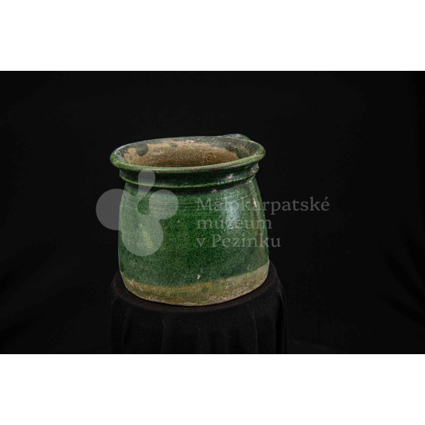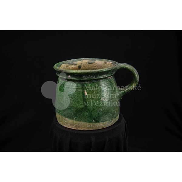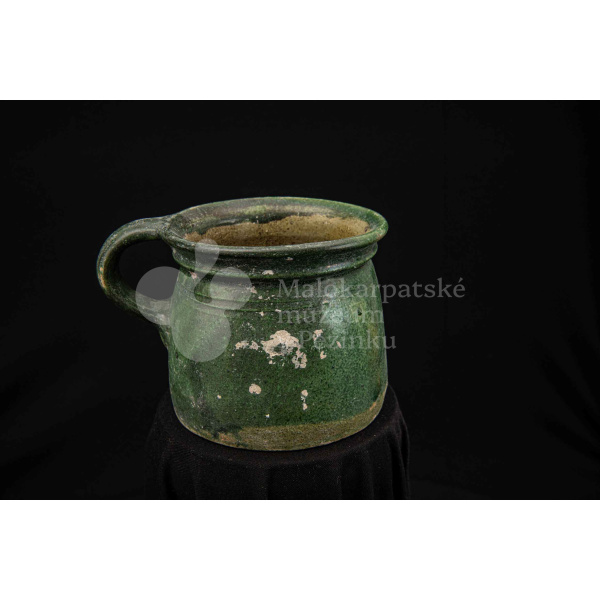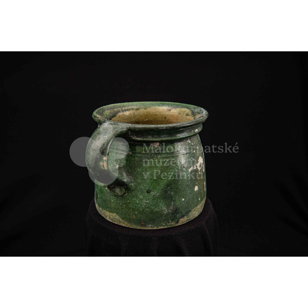 Nádoba keramická s jedným uchom zelenej farby, glejtovaná. Dolu je rozšírená, horný okraj má zdobený plastickými vrúbkami. Používala sa na čiernu glazúru.