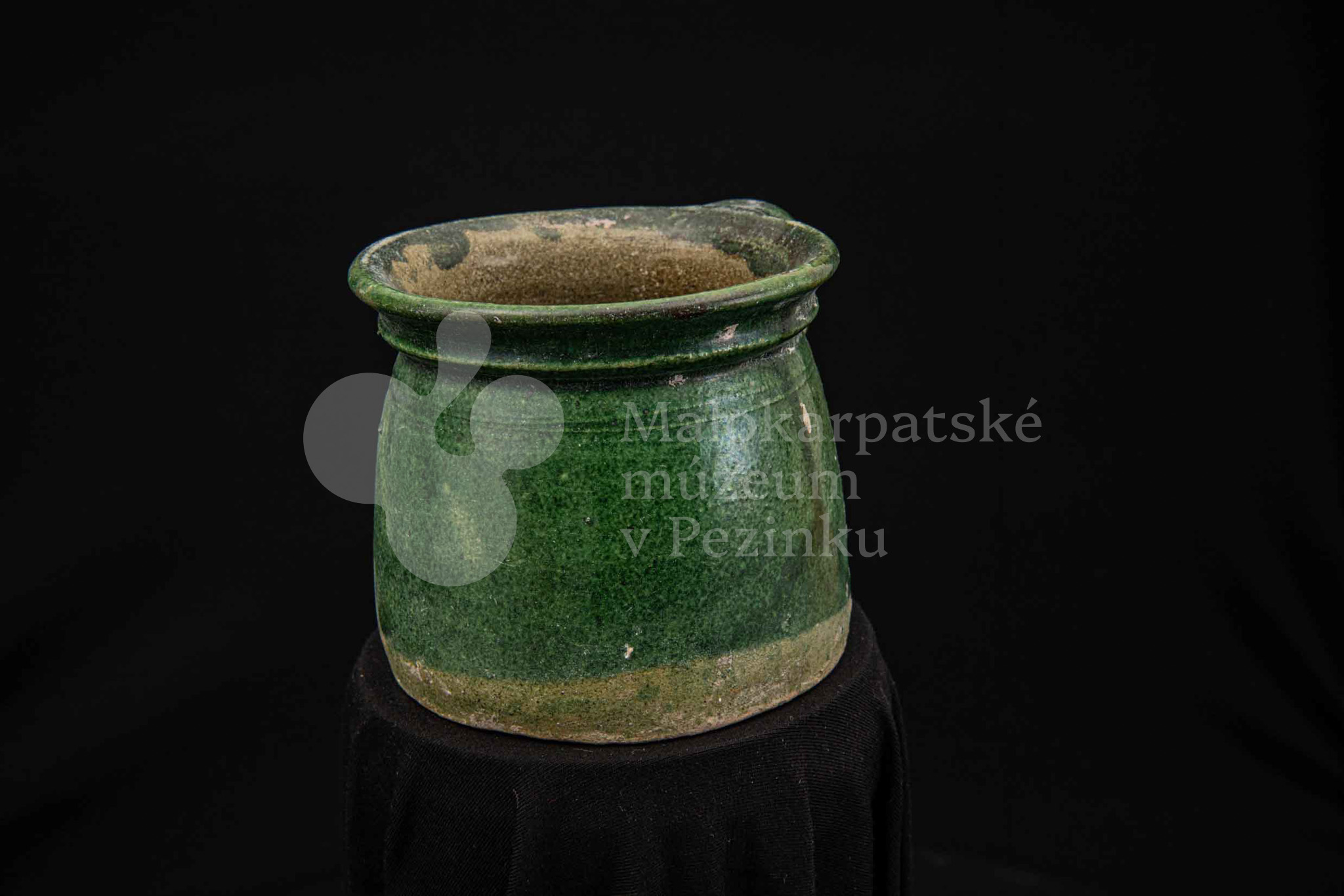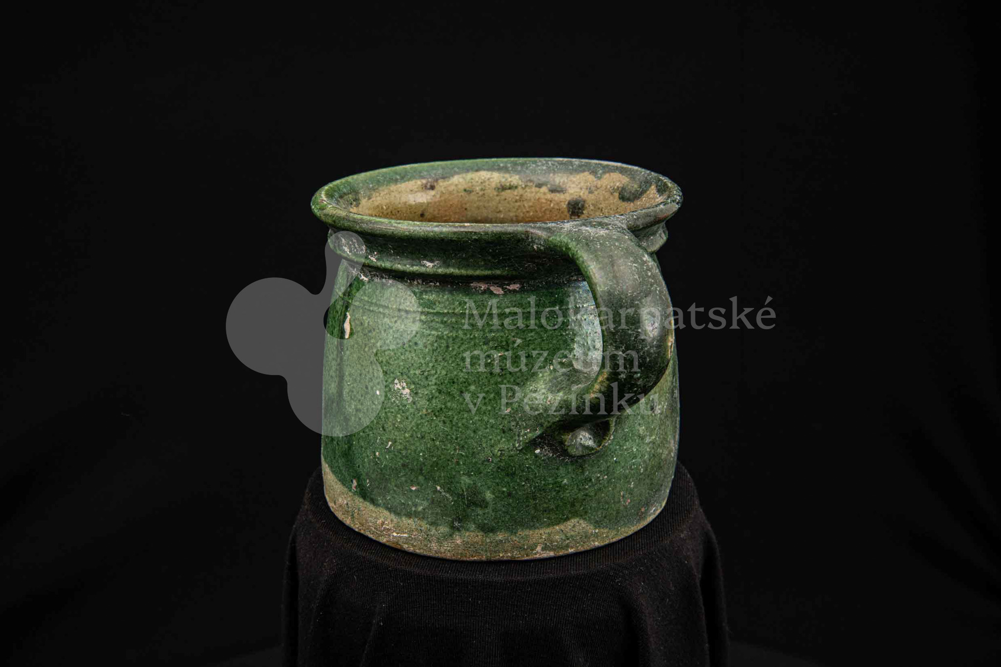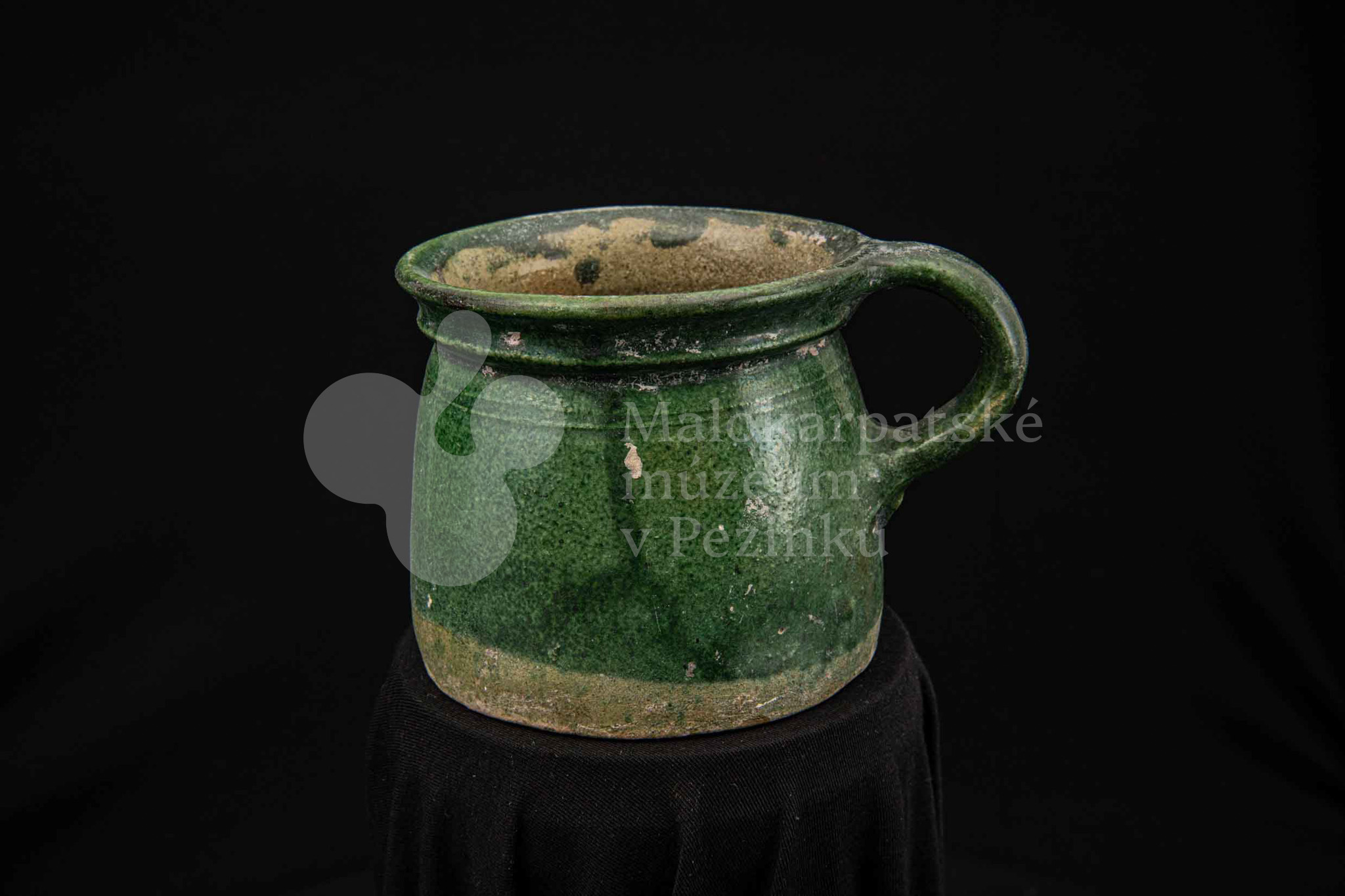 Nádoba keramická s jedným uchom zelenej farby, glejtovaná. Dolu je rozšírená, horný okraj má zdobený plastickými vrúbkami. Používala sa na čiernu glazúru.