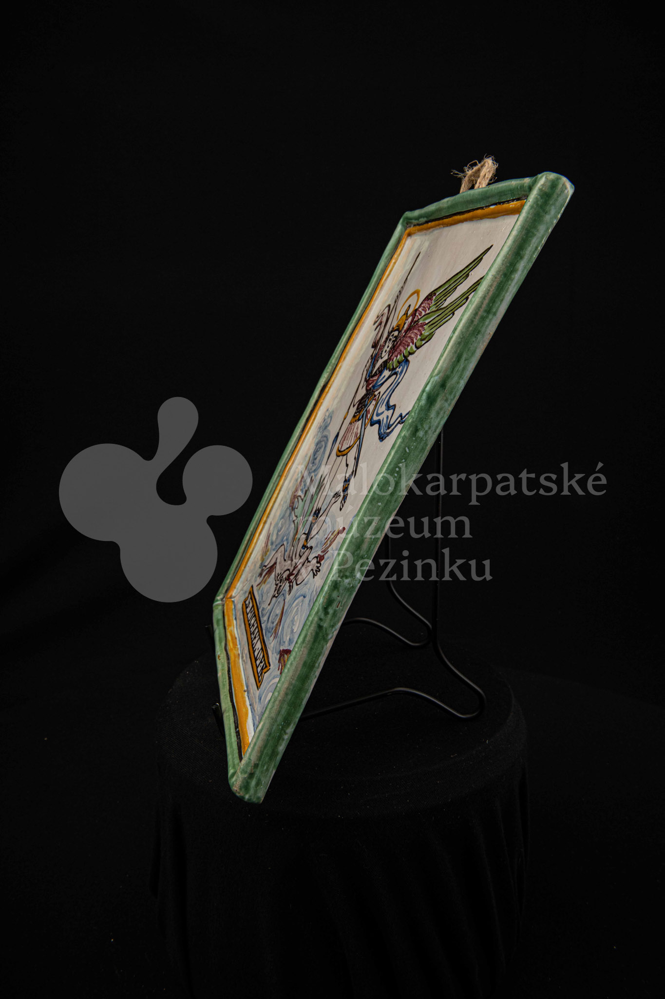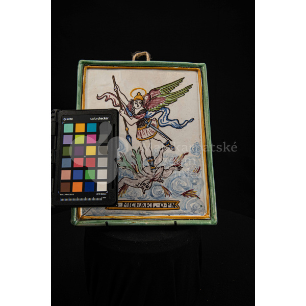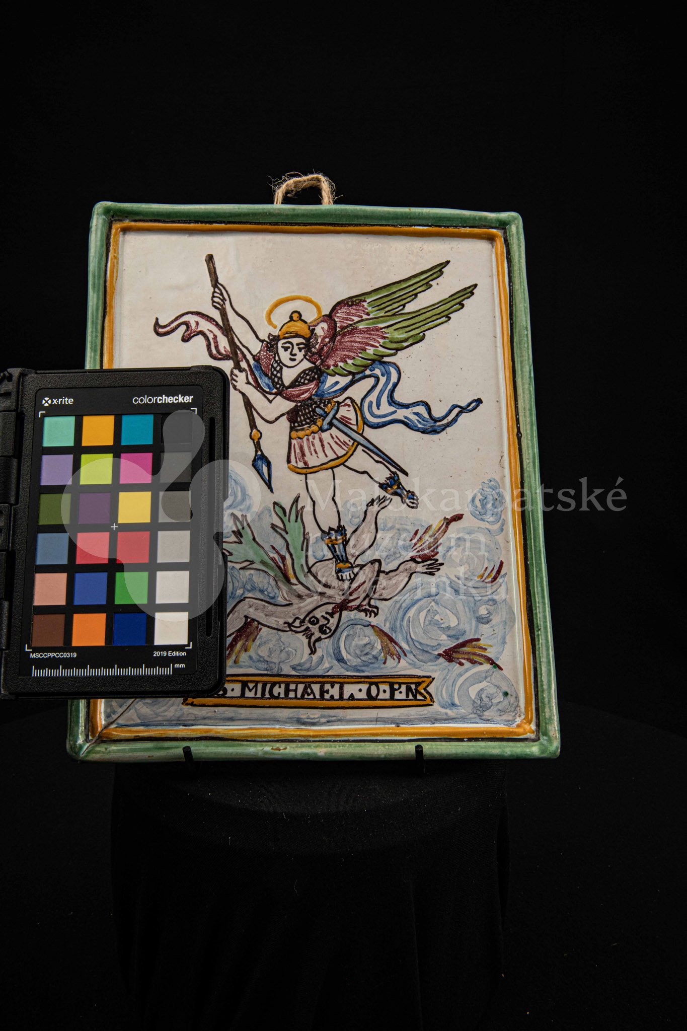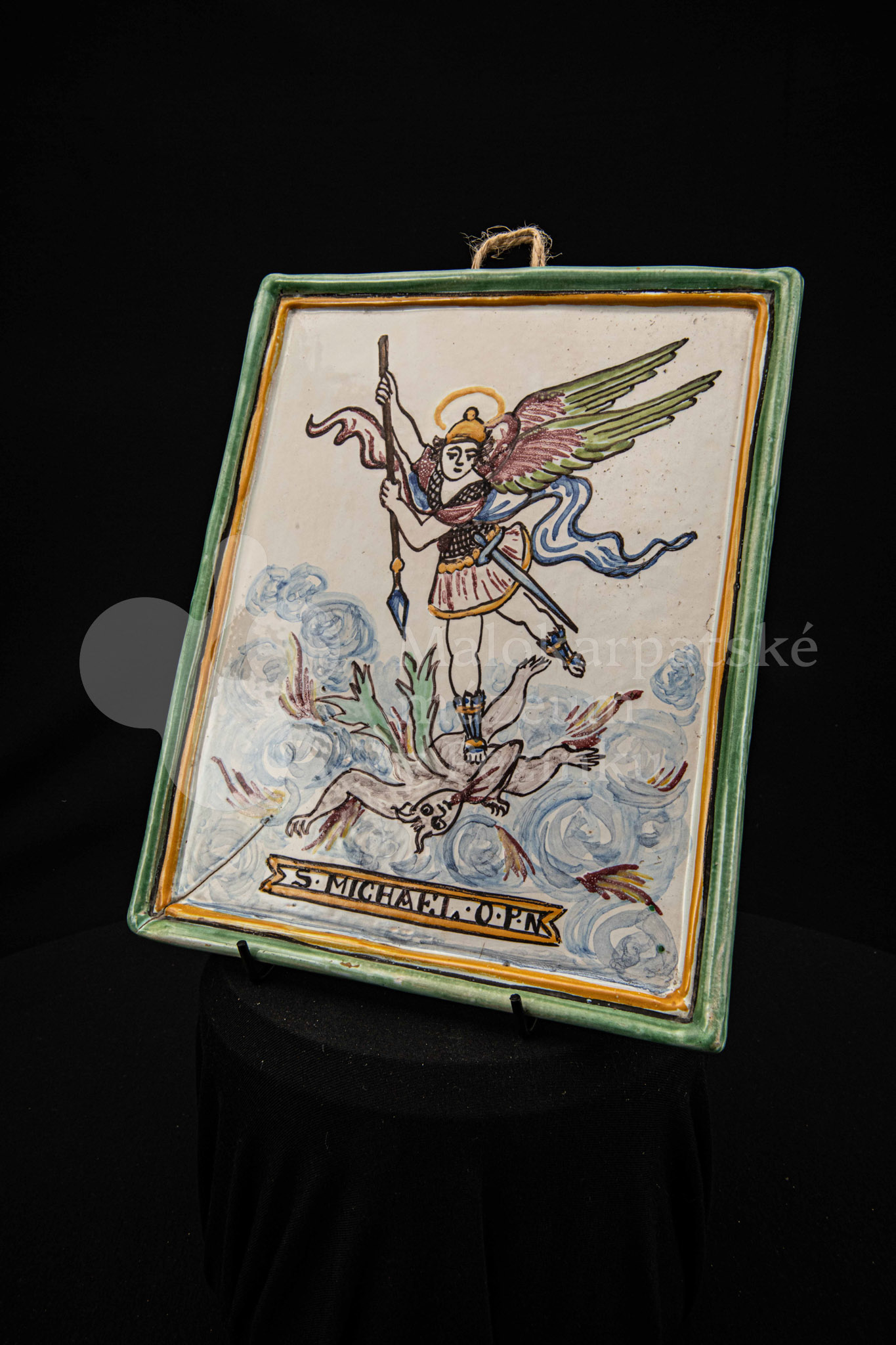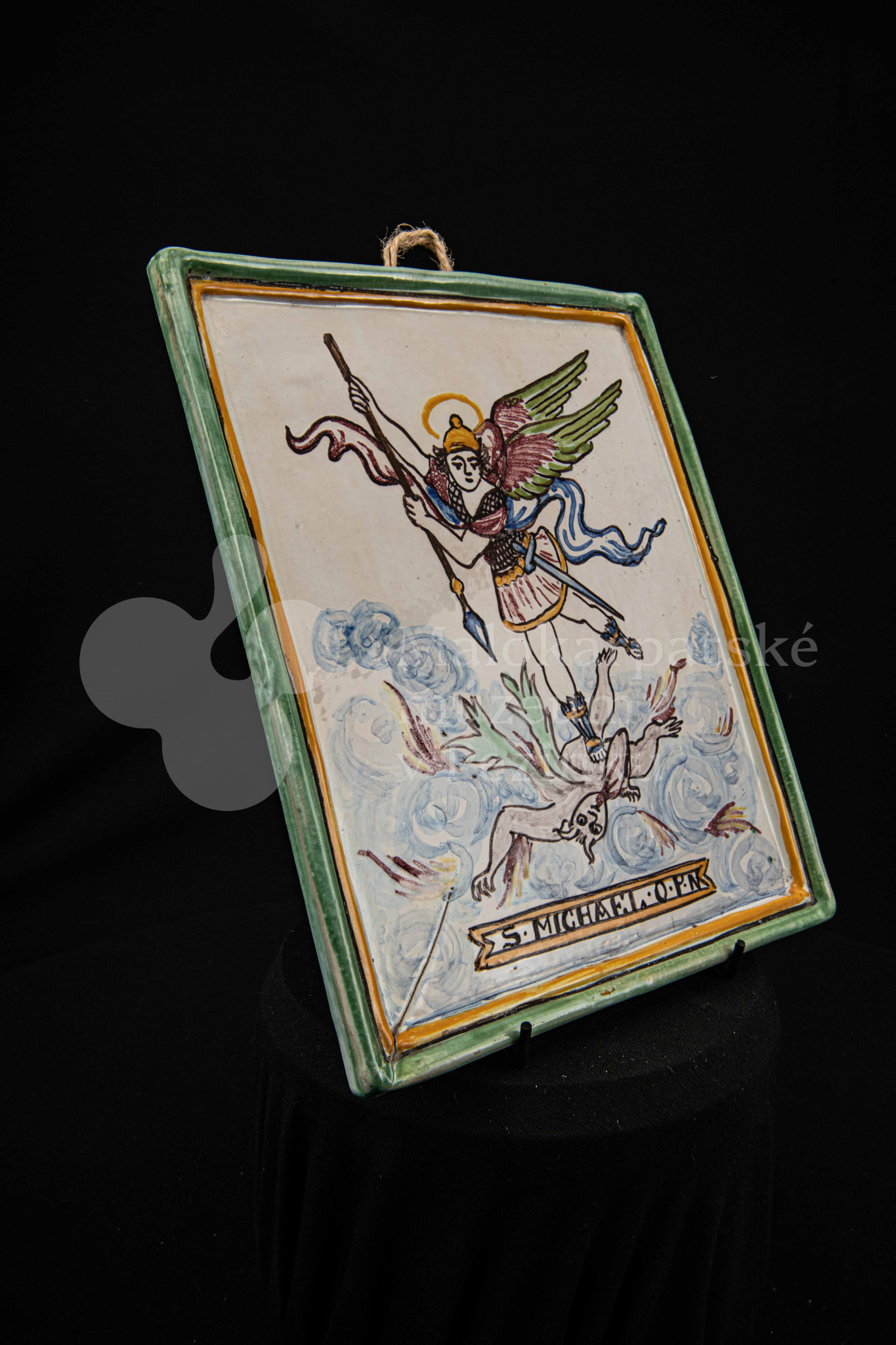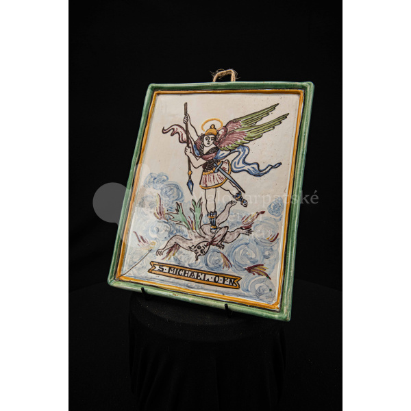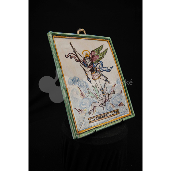 Obraz fajansový, po celej ploche bieloglazovaný. Rám obdĺžnikový zelenej a žltej farby. Vysokožiarový dekor s motívom sv. Michala a diabla. Pod postavami je nápis „SV.MICHAEL O.P.N.“ Na zadnej strane je značenie FK. ST.