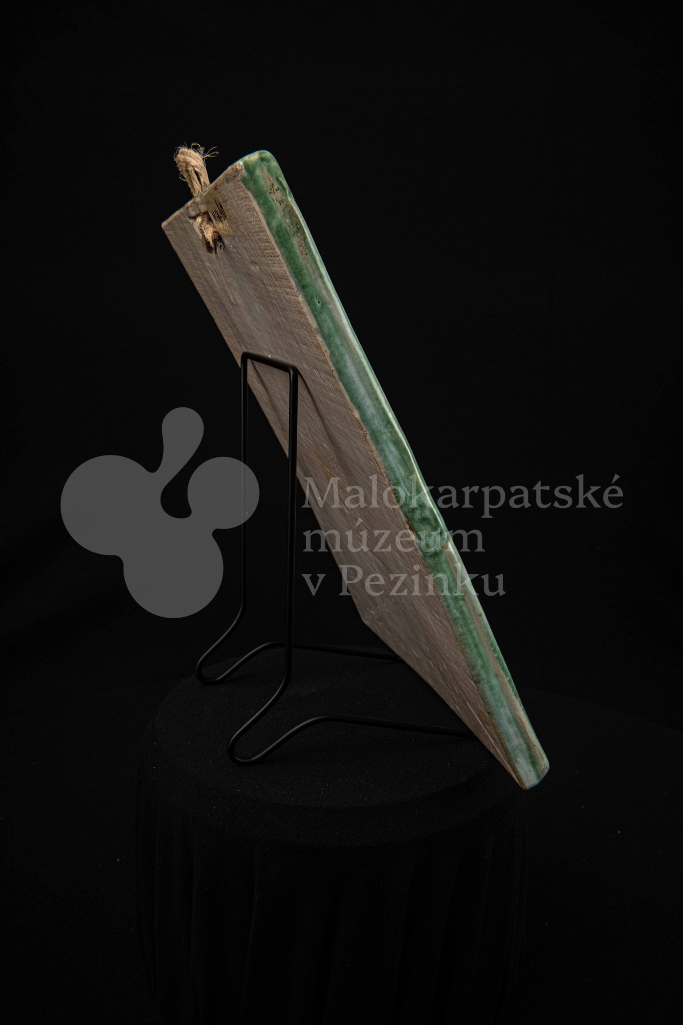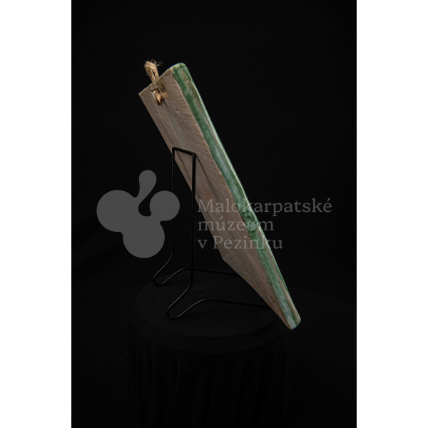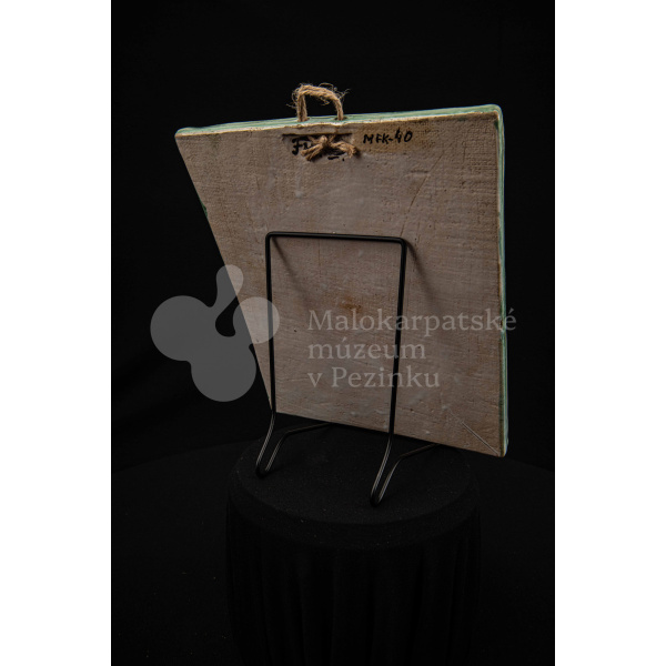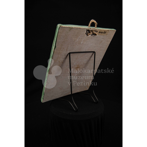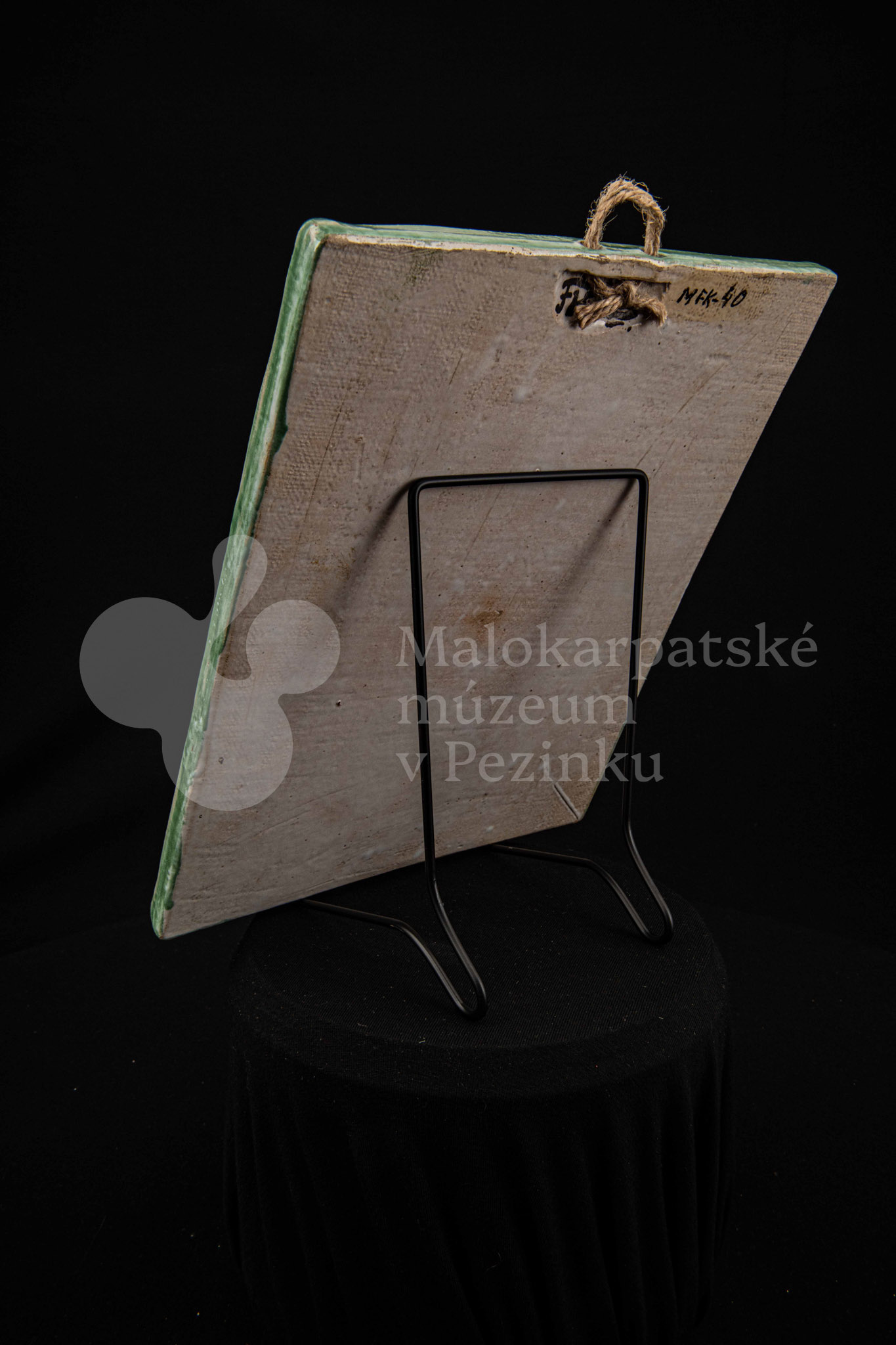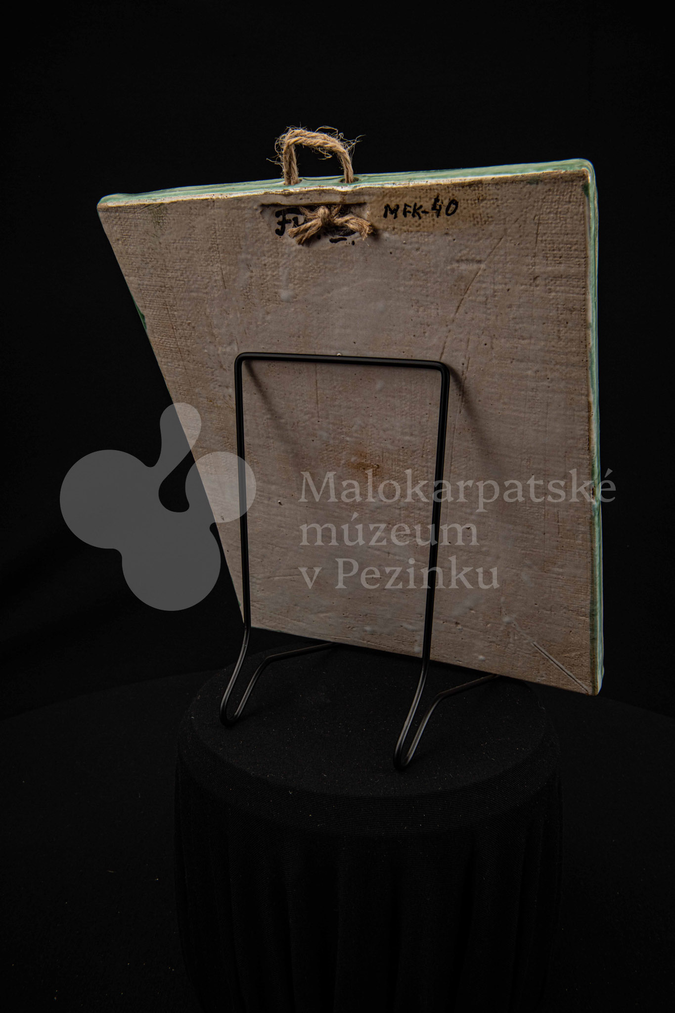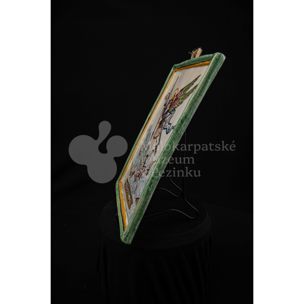 Obraz fajansový, po celej ploche bieloglazovaný. Rám obdĺžnikový zelenej a žltej farby. Vysokožiarový dekor s motívom sv. Michala a diabla. Pod postavami je nápis „SV.MICHAEL O.P.N.“ Na zadnej strane je značenie FK. ST.