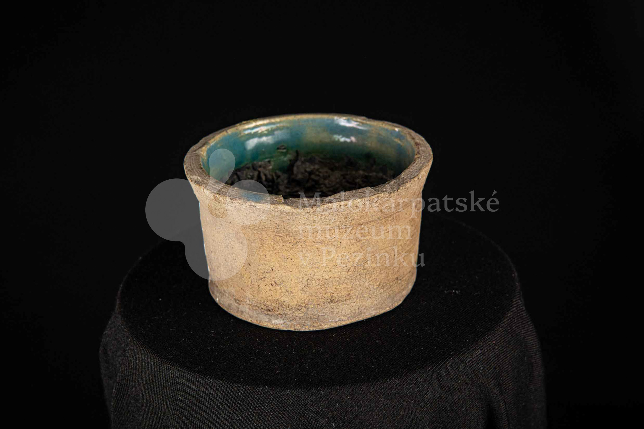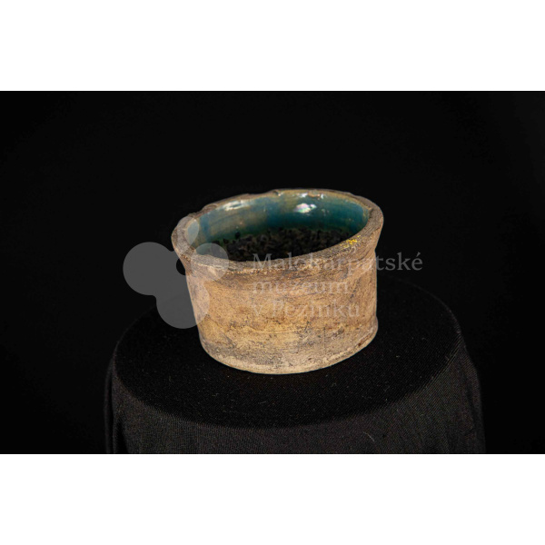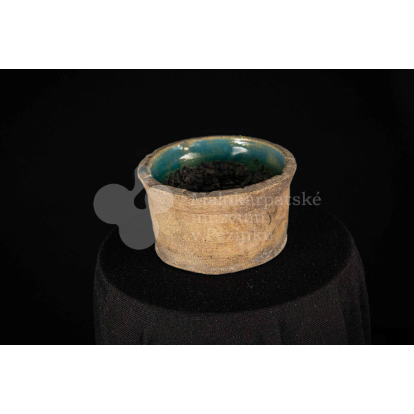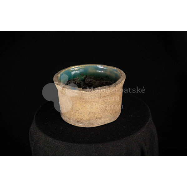 Dve keramické nádoby s glazúrami, raz pálená hlina, menšia je z vnútra poliata olovnatou polevou zelenej farby.