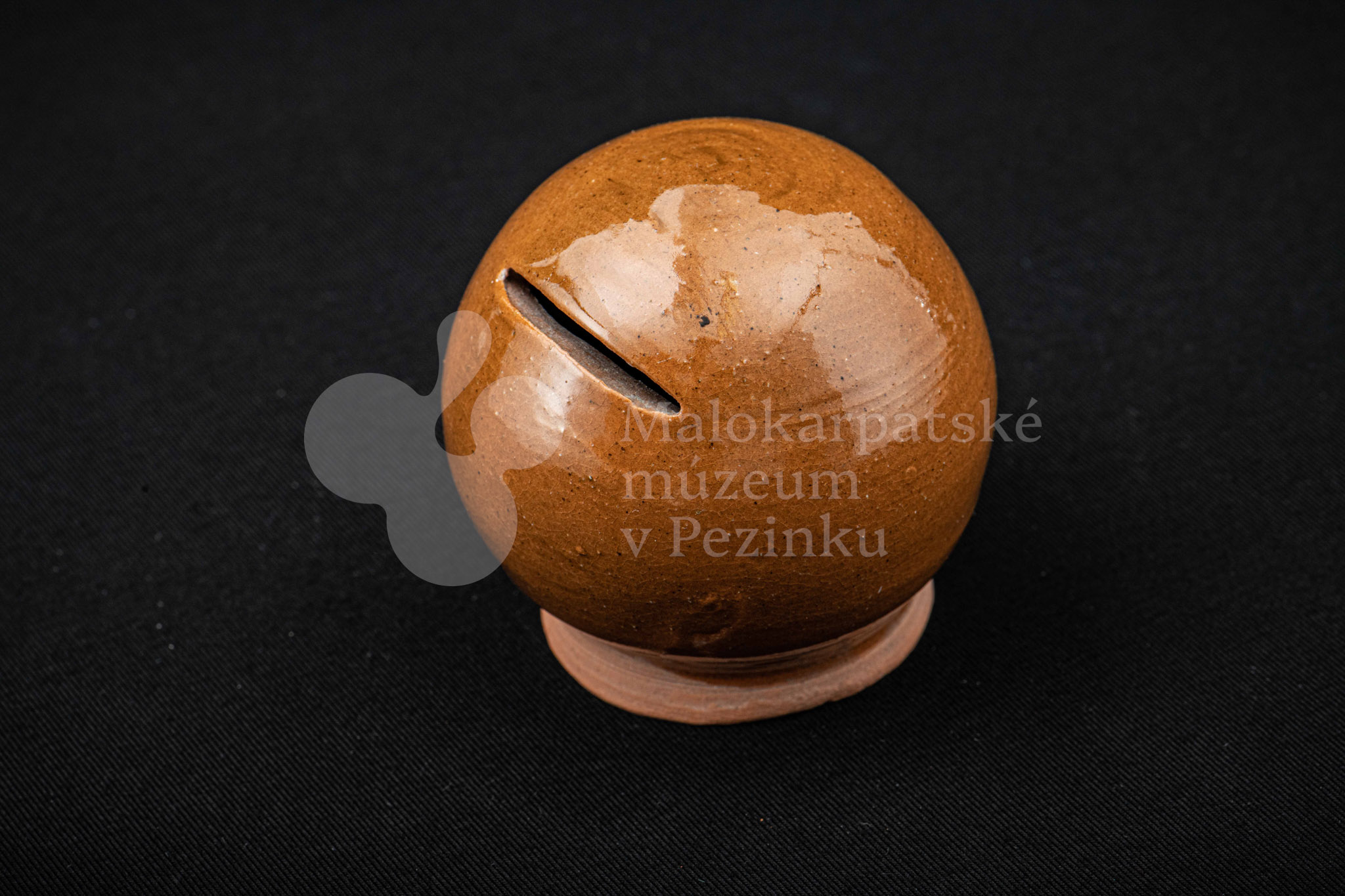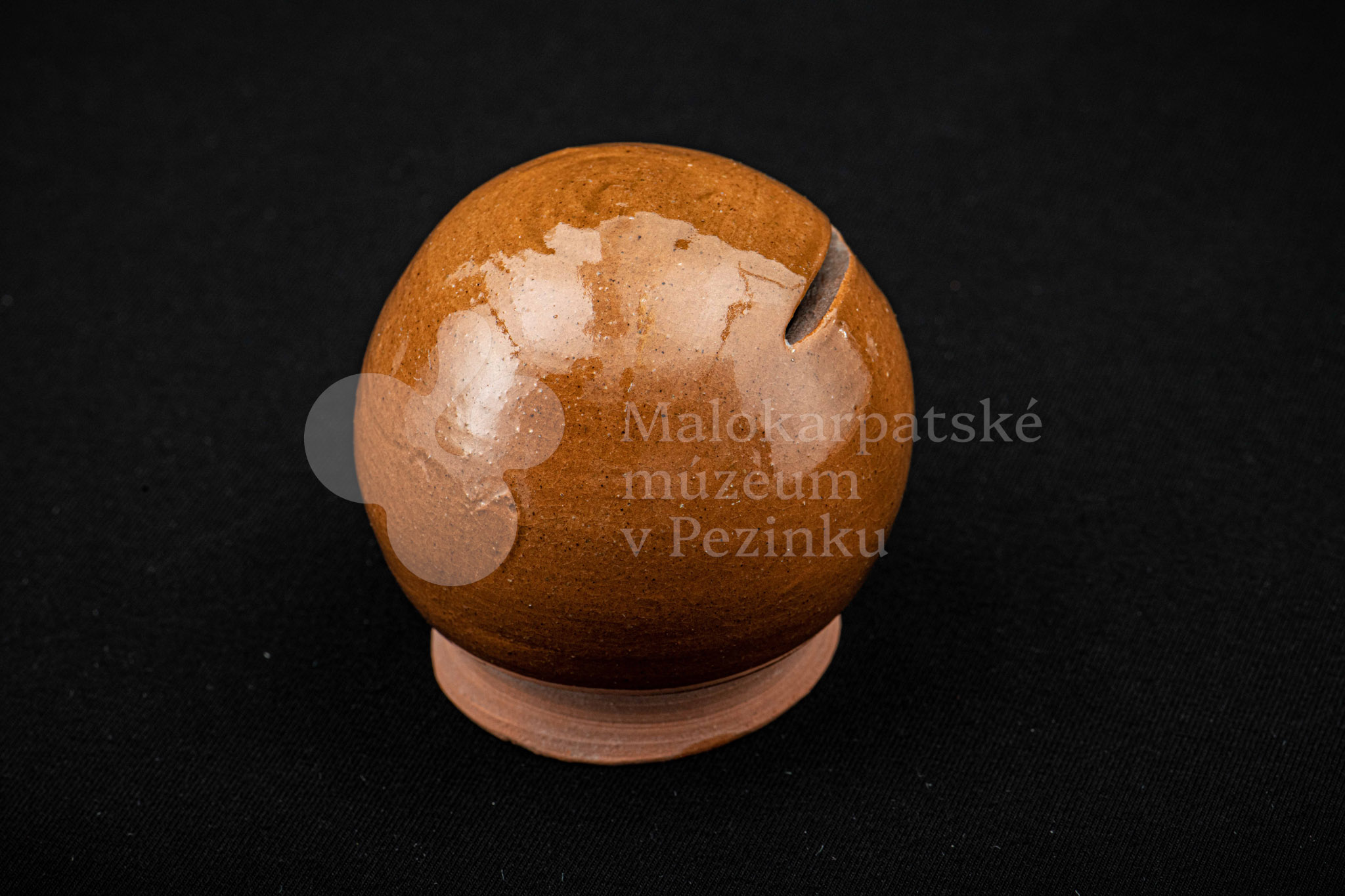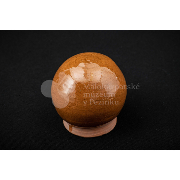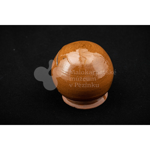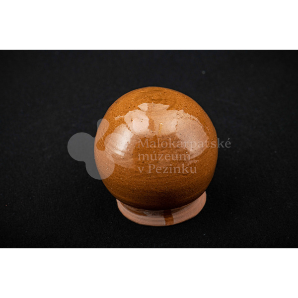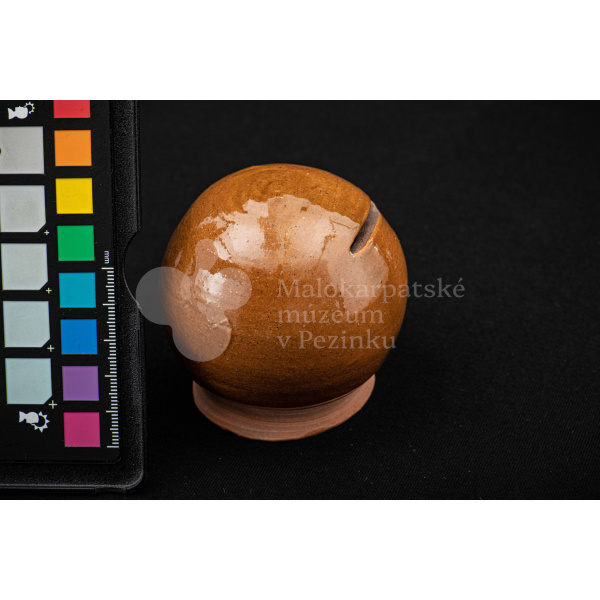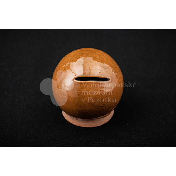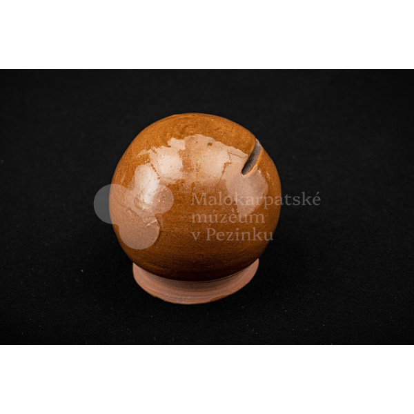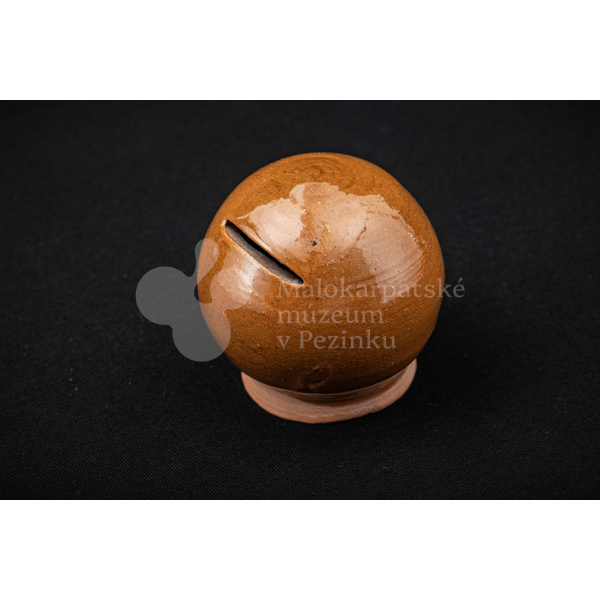 Pokladnička hnedá guľovitého tvaru. Na prednej strane má vyrezaný úzky otvor na mince. Bez značenia.
