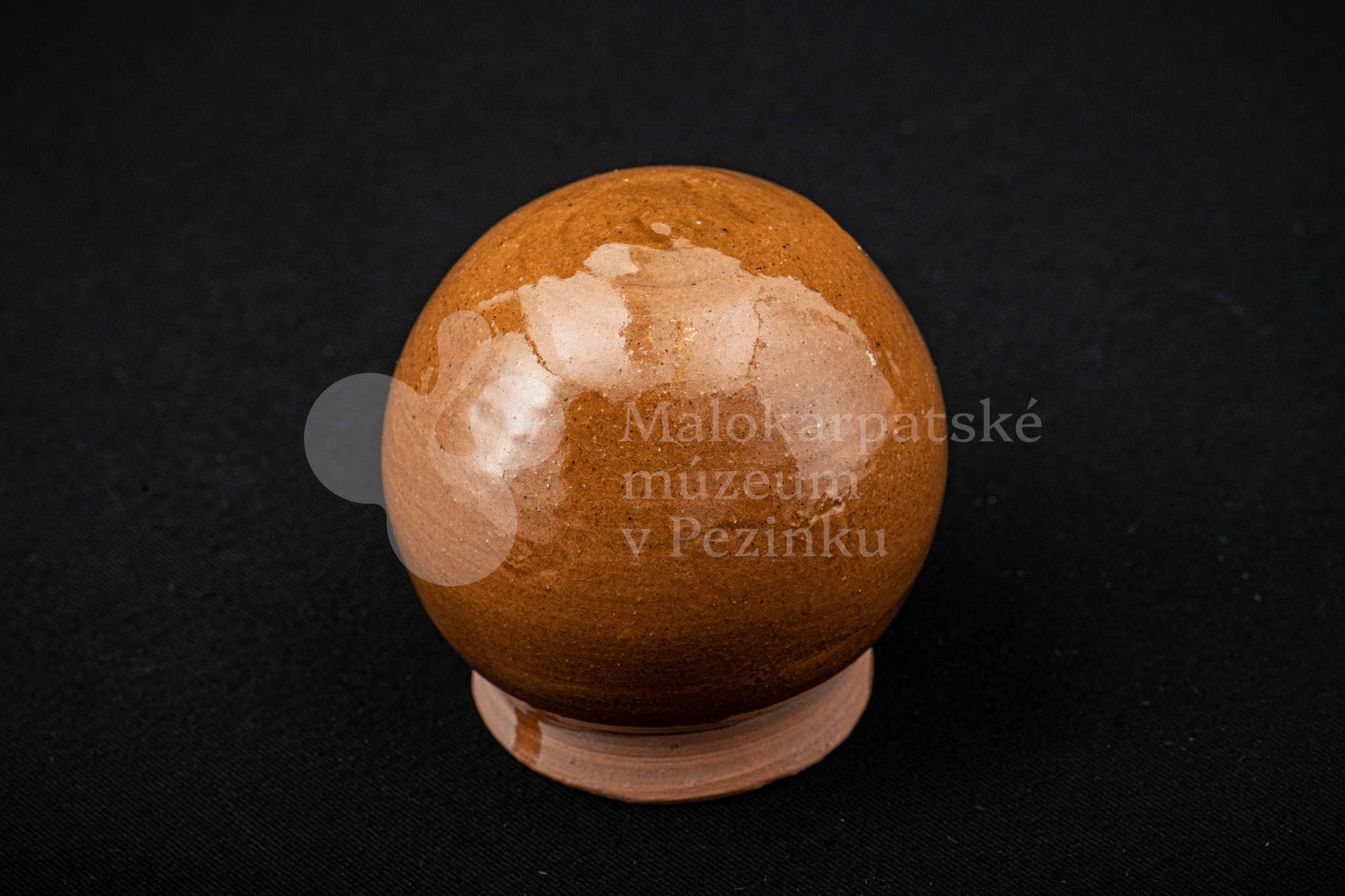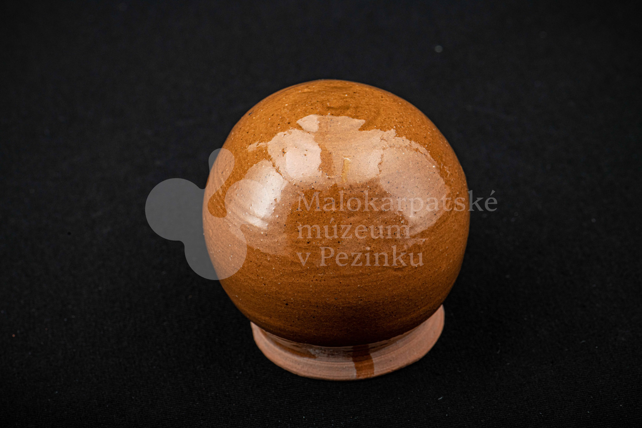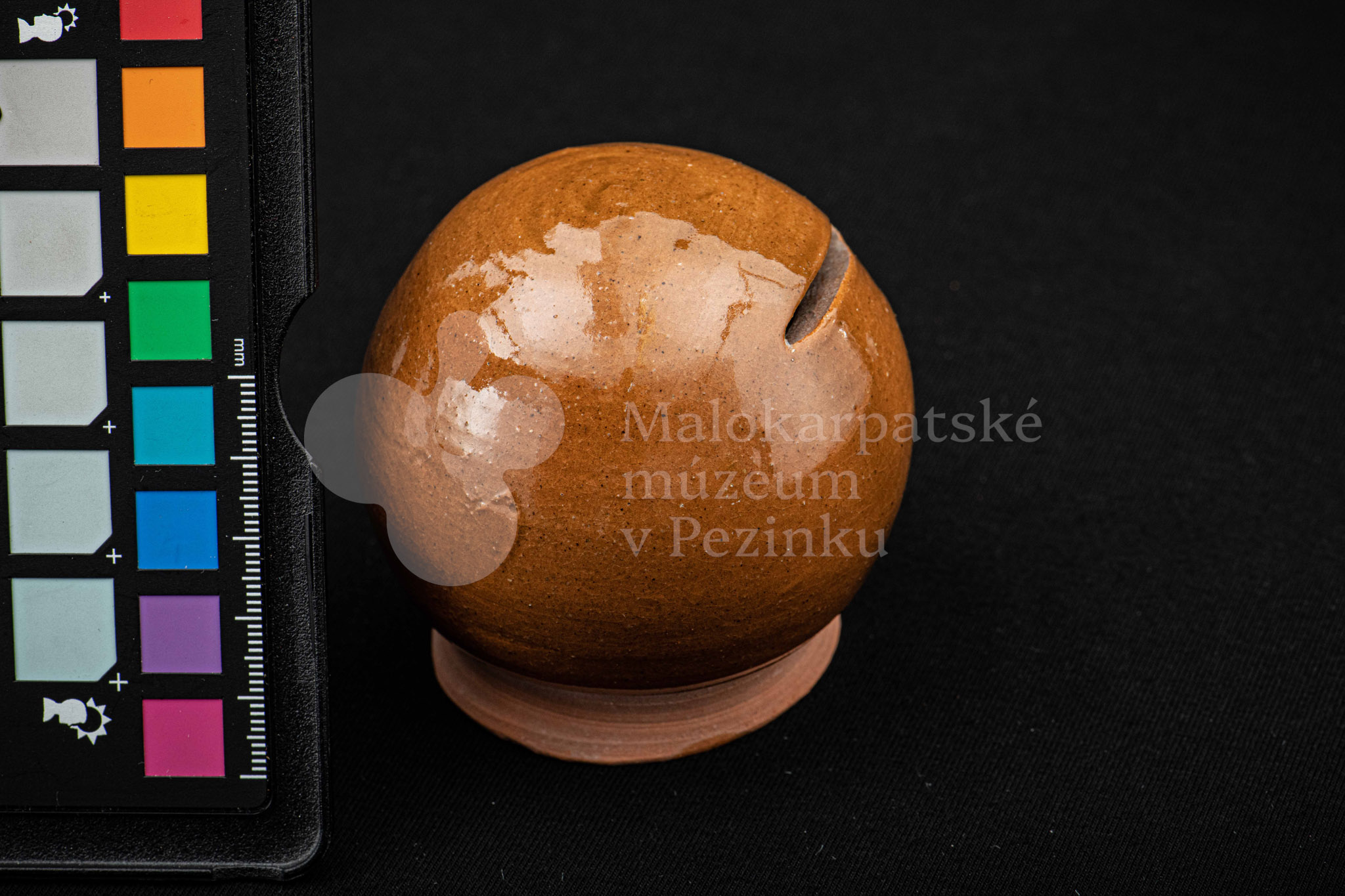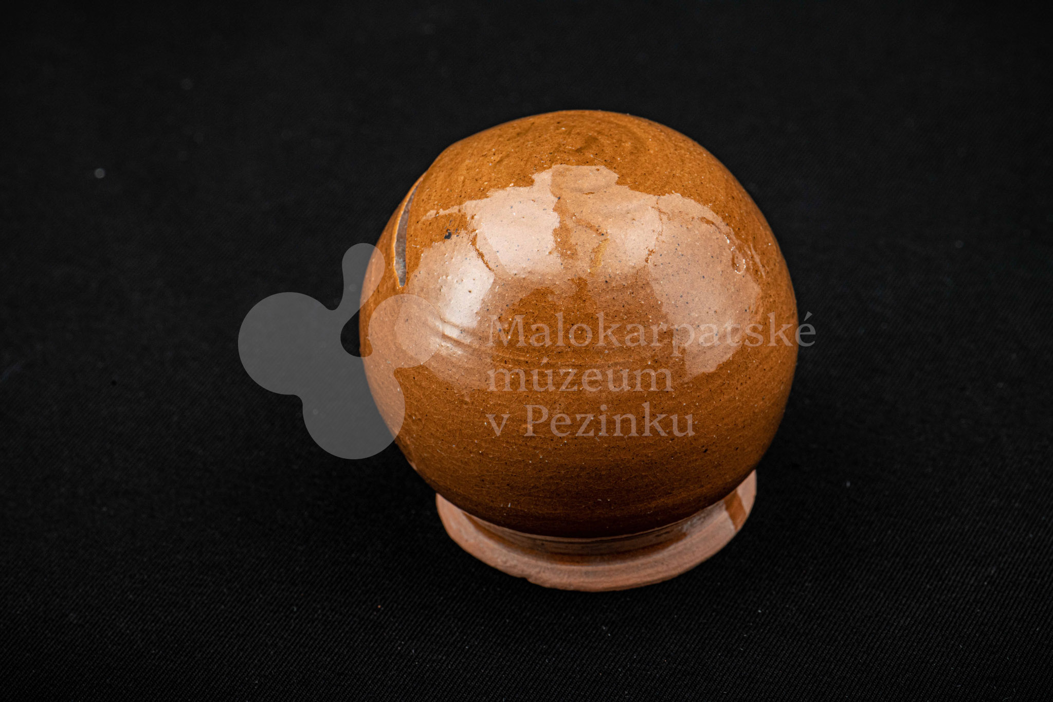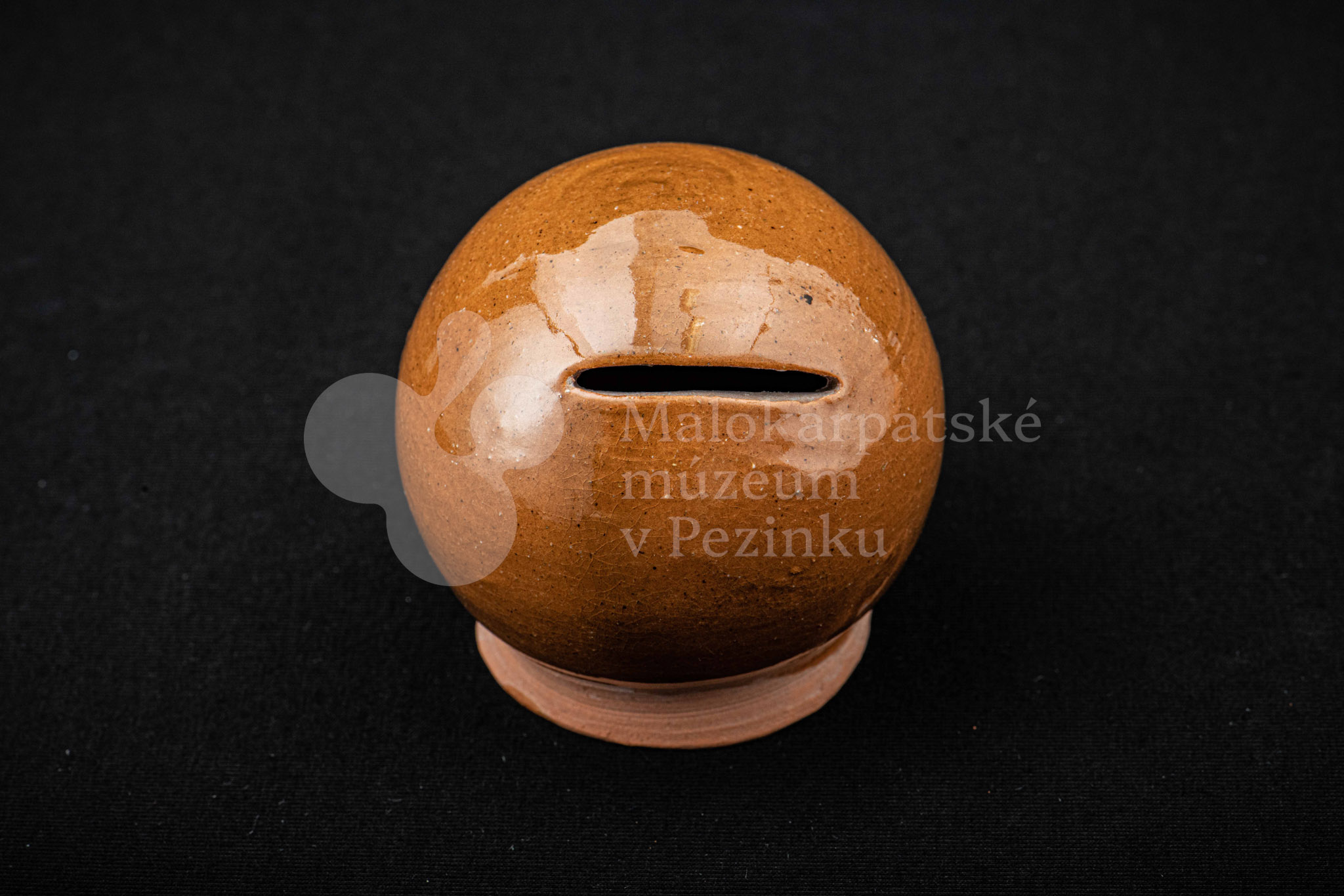 Pokladnička hnedá guľovitého tvaru. Na prednej strane má vyrezaný úzky otvor na mince. Bez značenia.