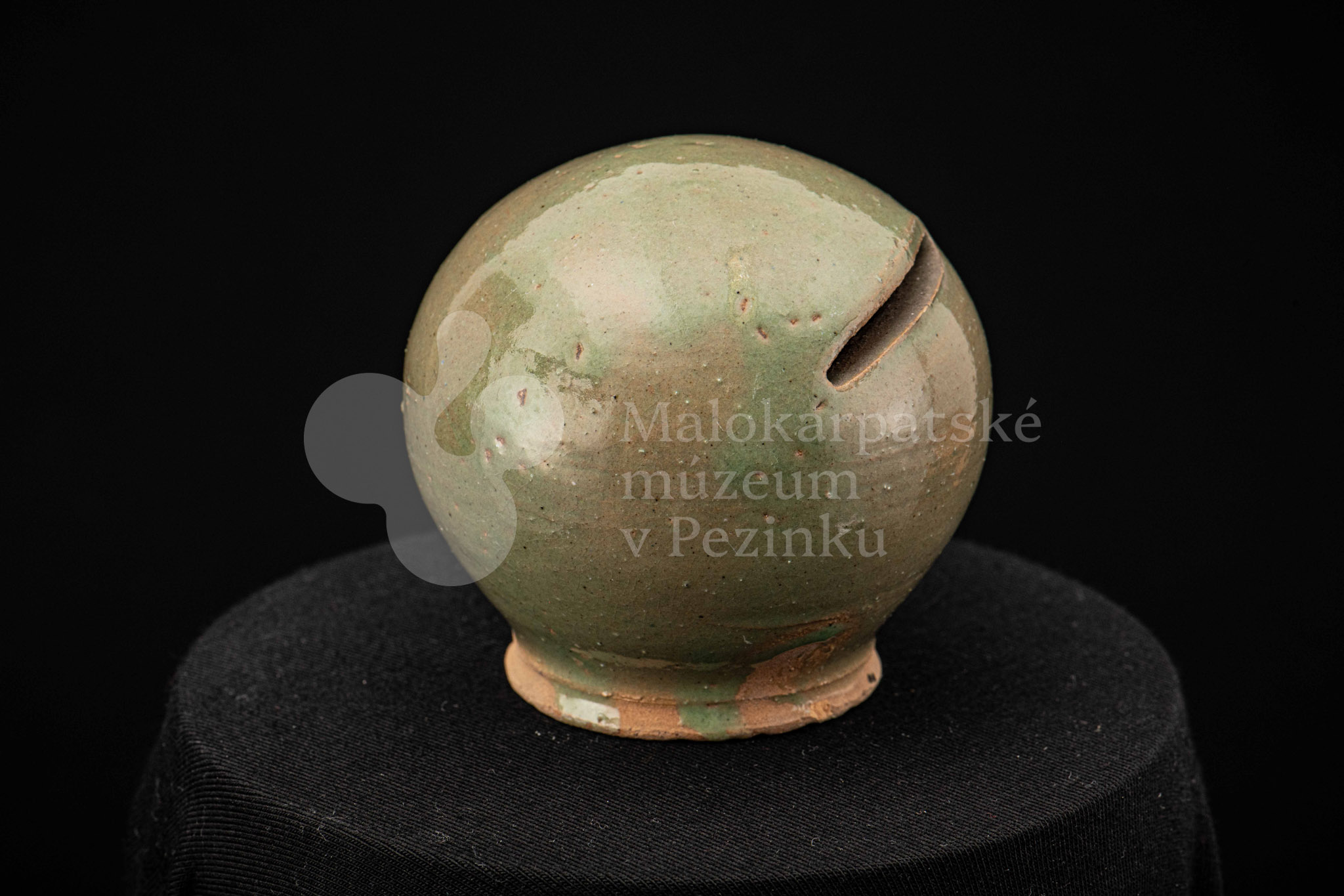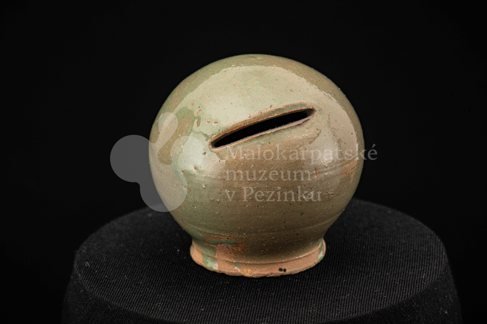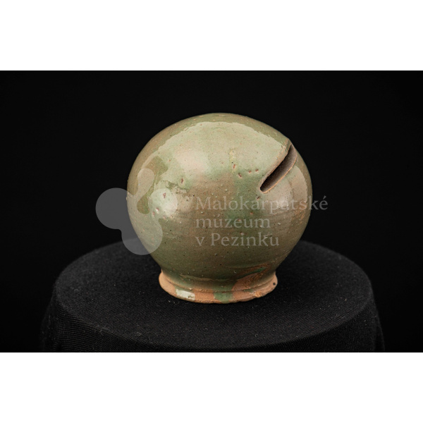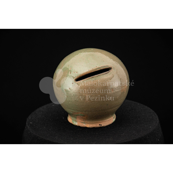 Štyri kusy zelených pokladničiek guľovitého tvaru rôznych veľkostí. Na prednej strane majú vyrezaný úzky otvor na mince. Bez značenia.