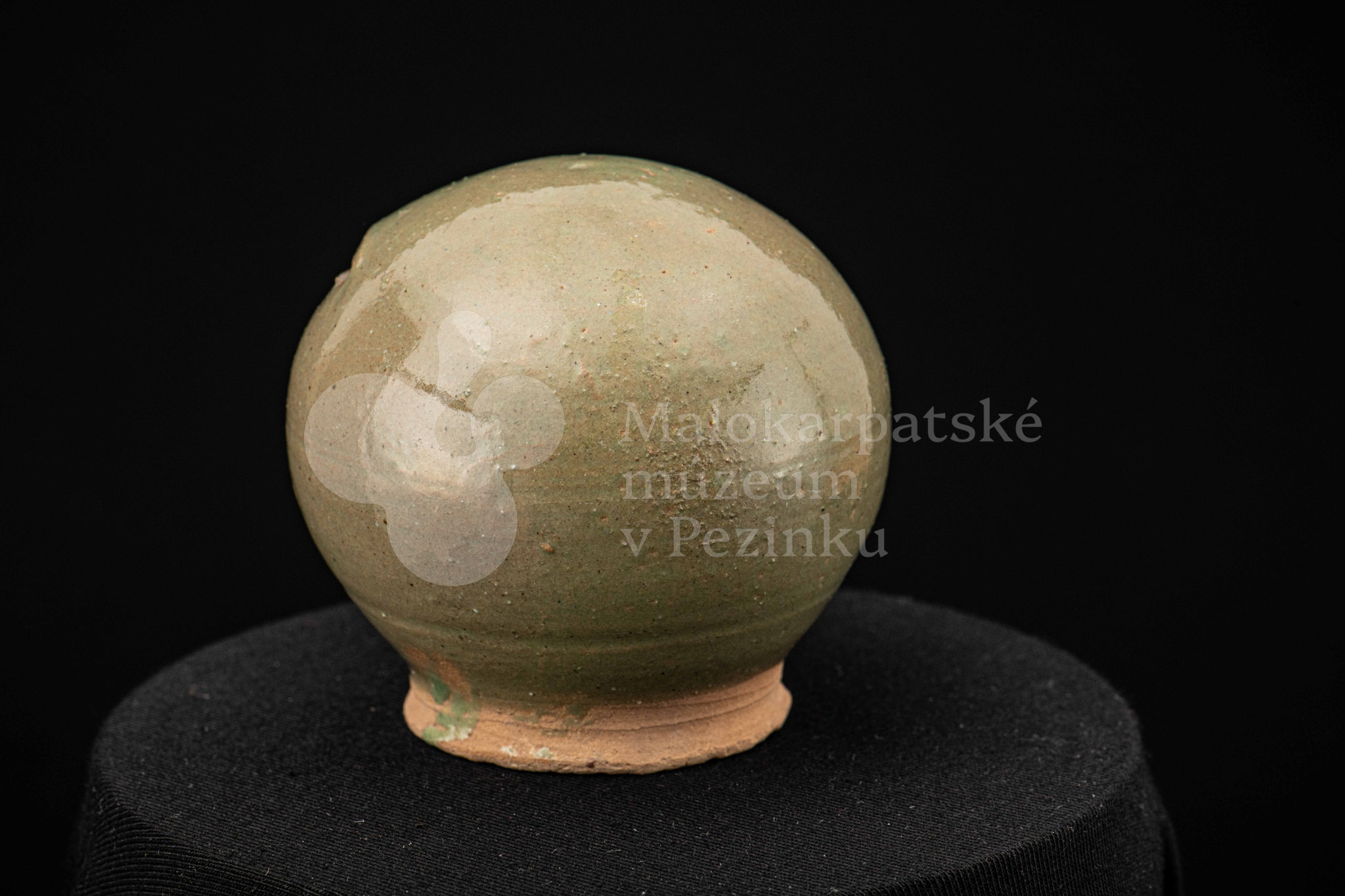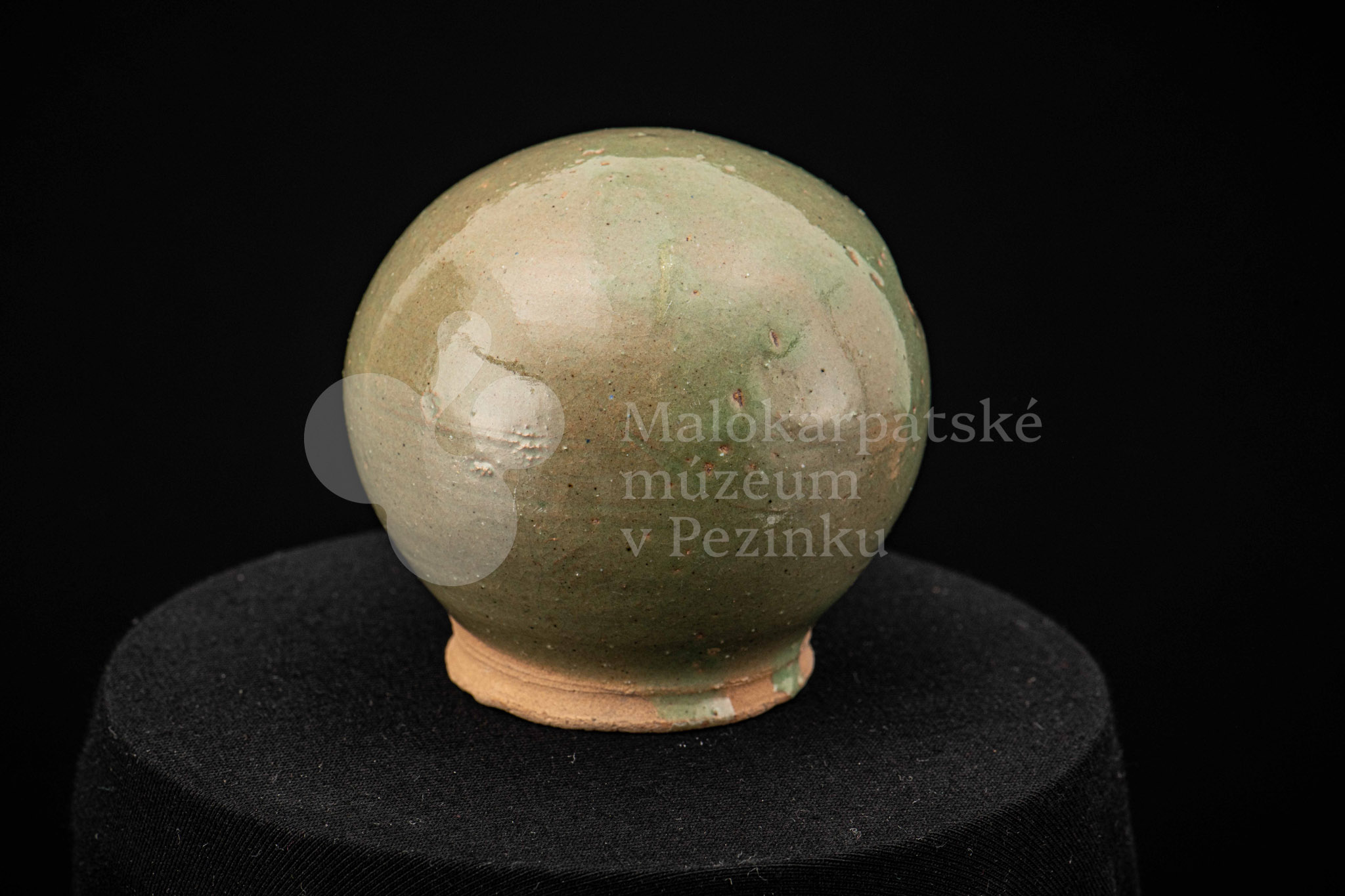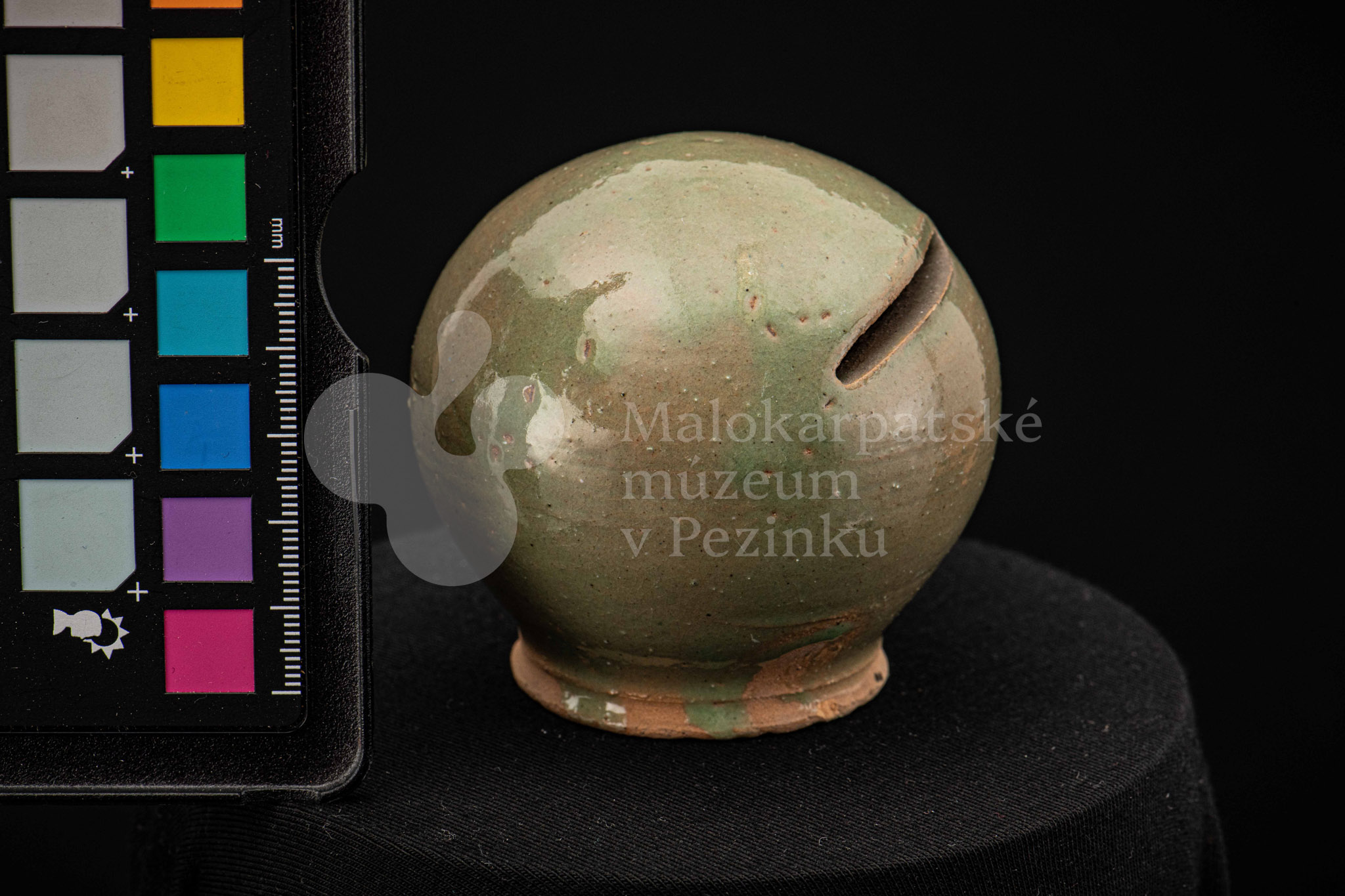 Štyri kusy zelených pokladničiek guľovitého tvaru rôznych veľkostí. Na prednej strane majú vyrezaný úzky otvor na mince. Bez značenia.