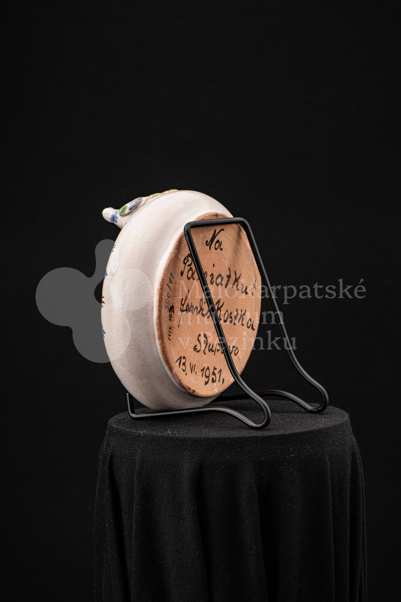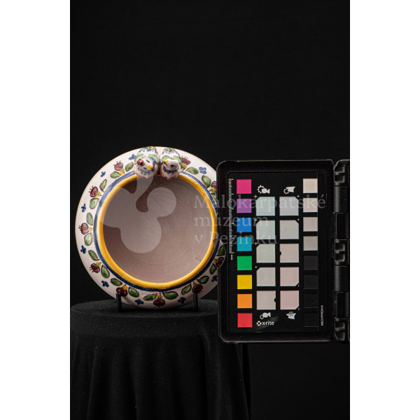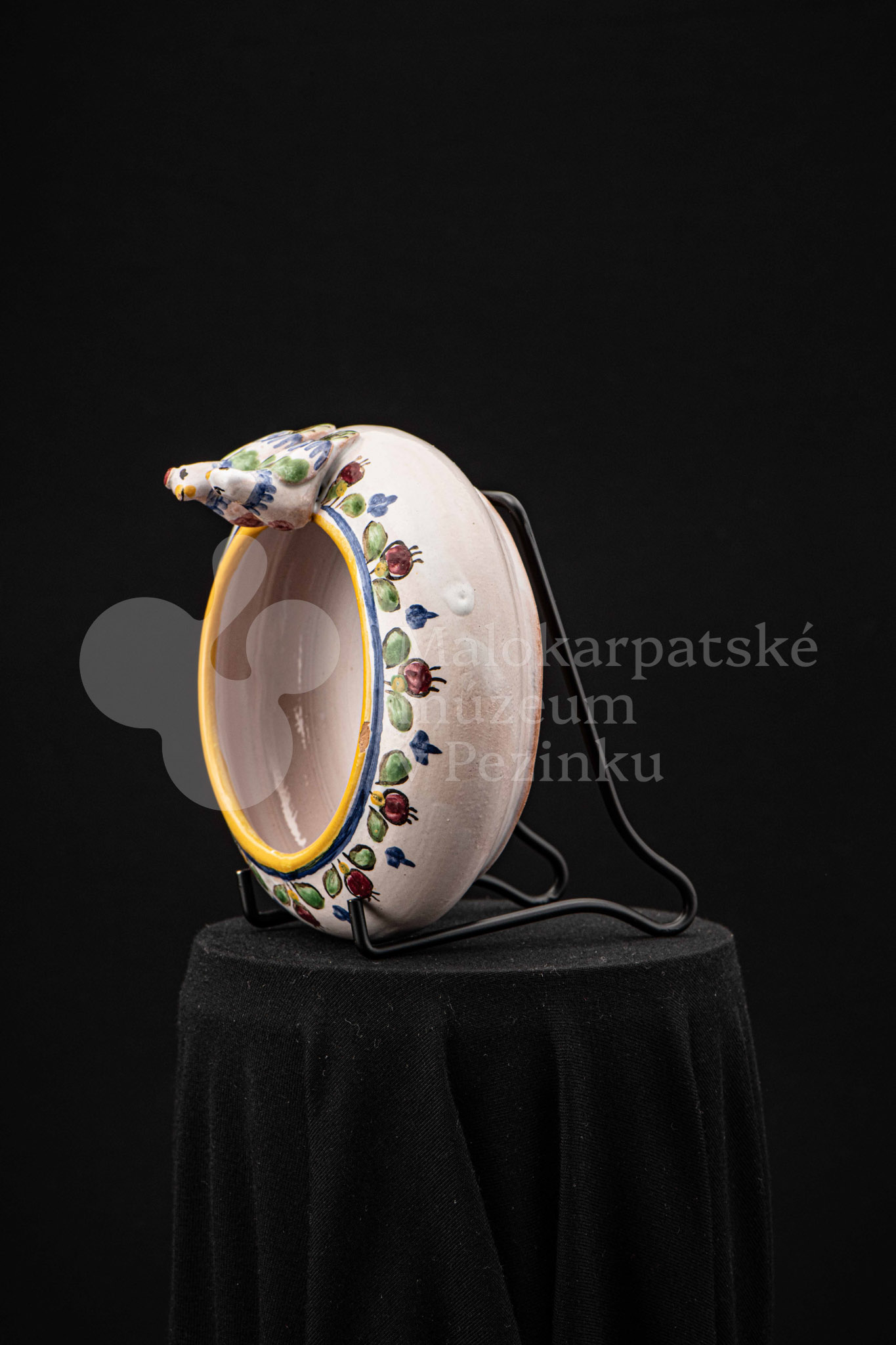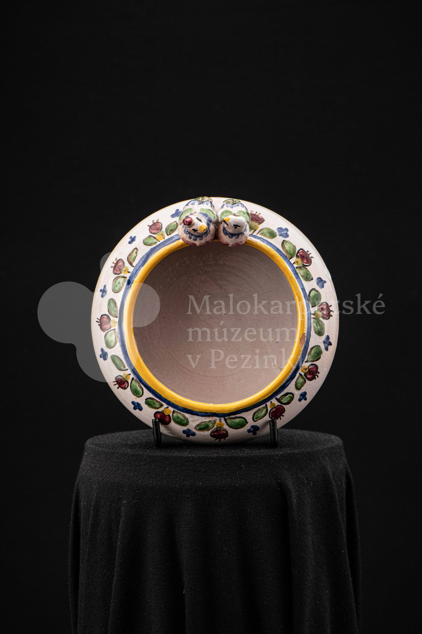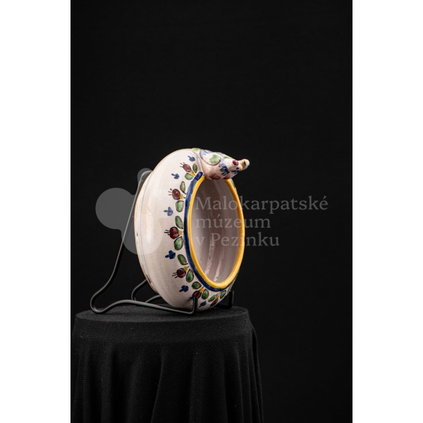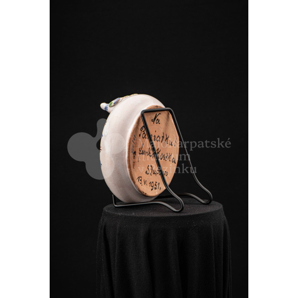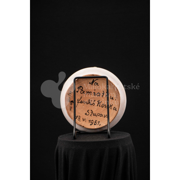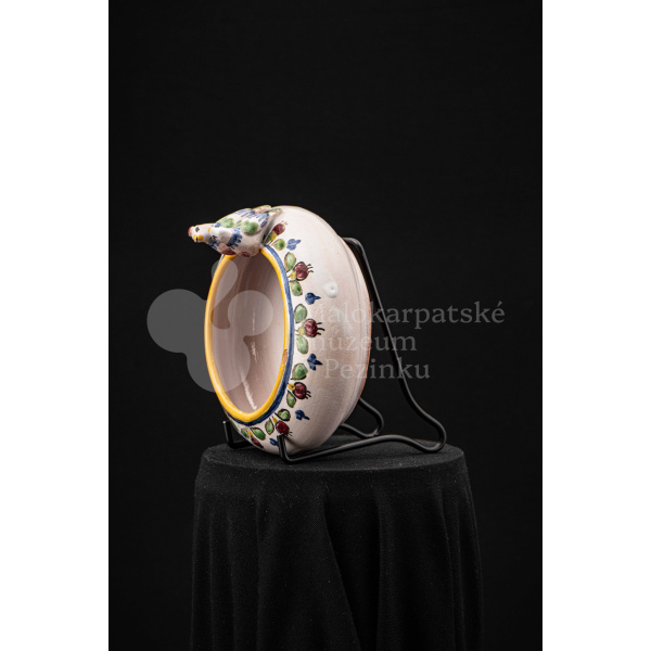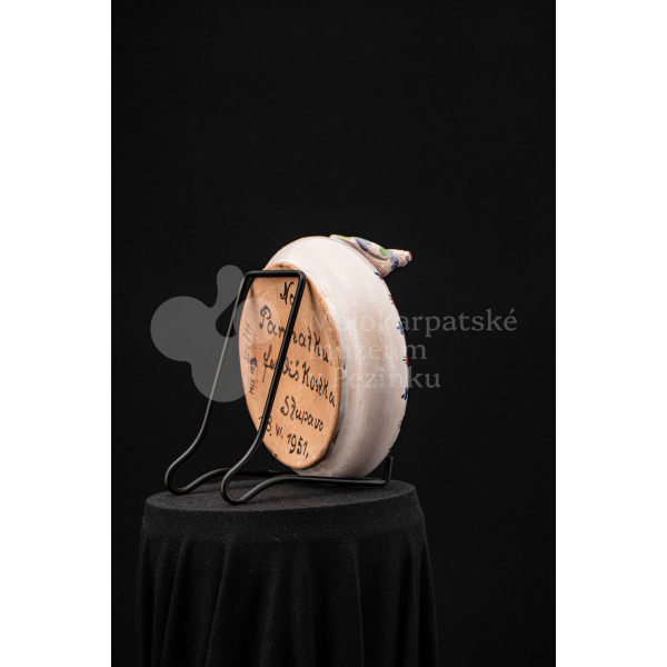 Fajansová nádoba okrúhleho tvaru, so zahnutým okrajom, na ktorom sedia dvaja vtáčkovia vedľa seba. Po celej ploche bieloglazovaný, dekor je rôznofarebný a pestrý. Na dne podstavca je nápis: Na pamiatku! Ferdiš Kostka Stupava. 13. VI.1951