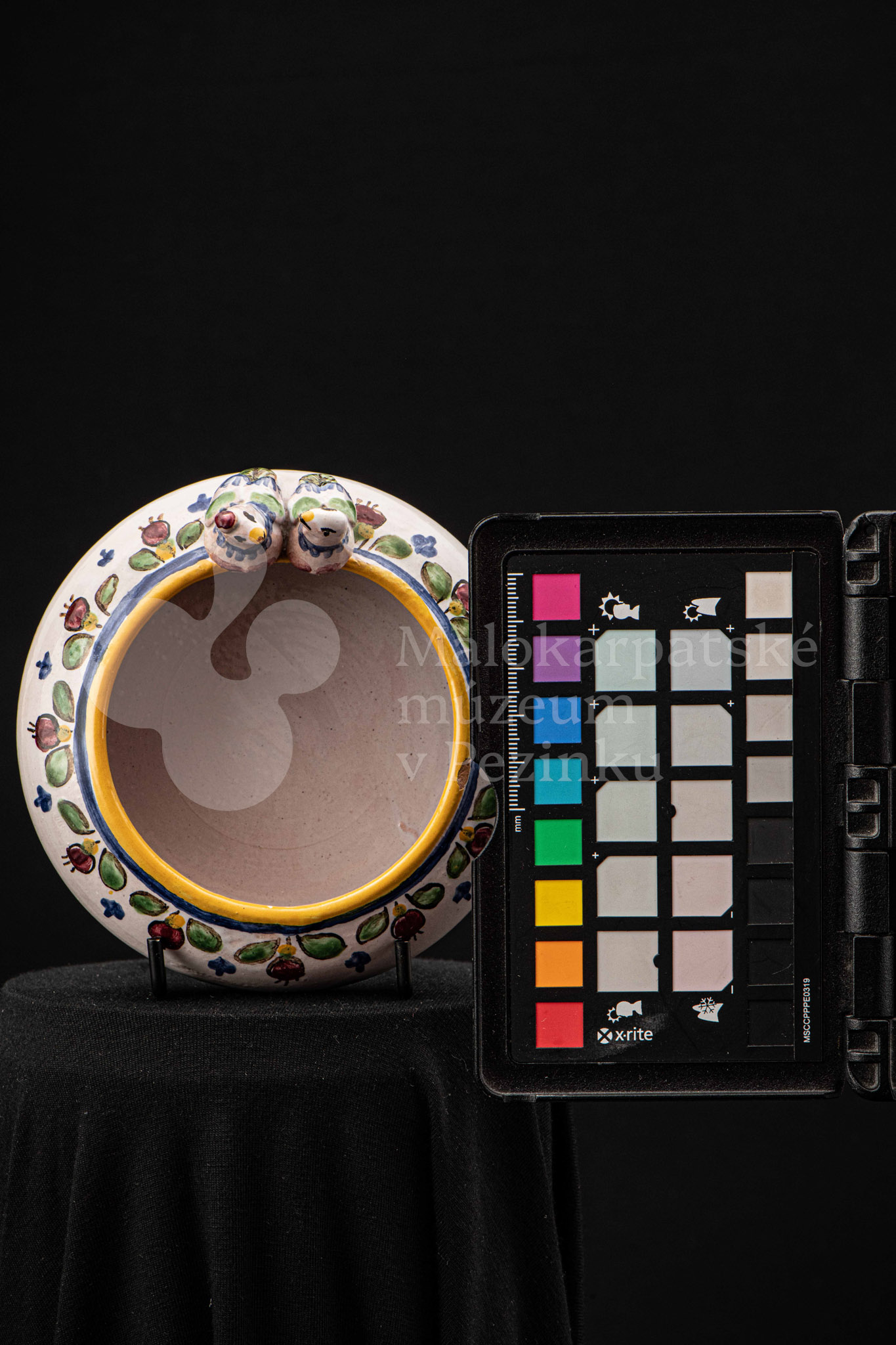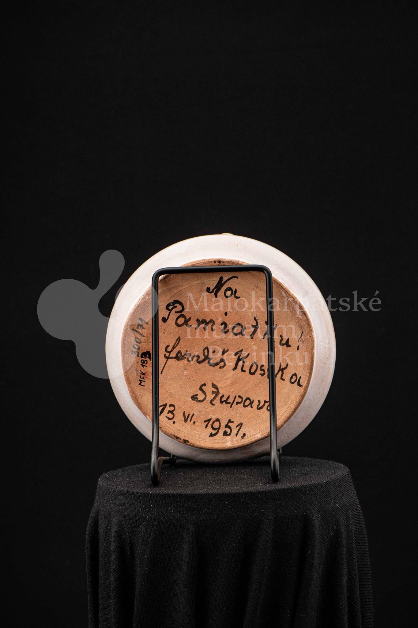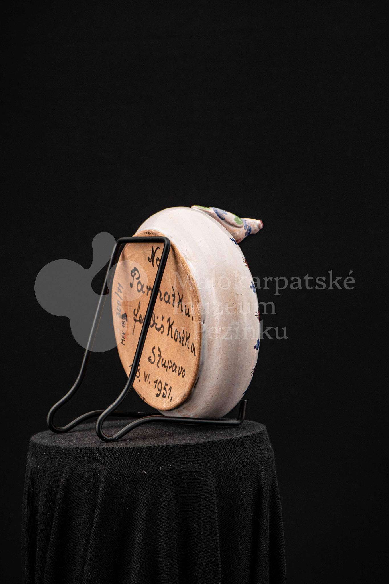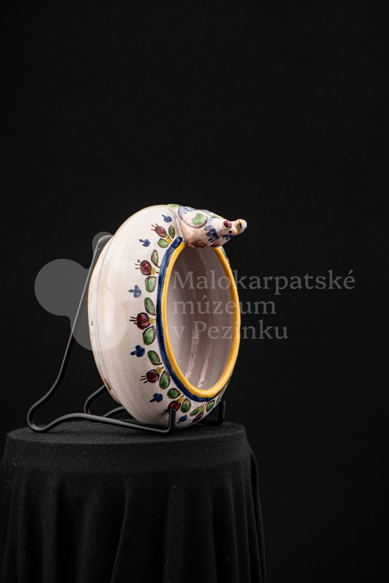 Fajansová nádoba okrúhleho tvaru, so zahnutým okrajom, na ktorom sedia dvaja vtáčkovia vedľa seba. Po celej ploche bieloglazovaný, dekor je rôznofarebný a pestrý. Na dne podstavca je nápis: Na pamiatku! Ferdiš Kostka Stupava. 13. VI.1951