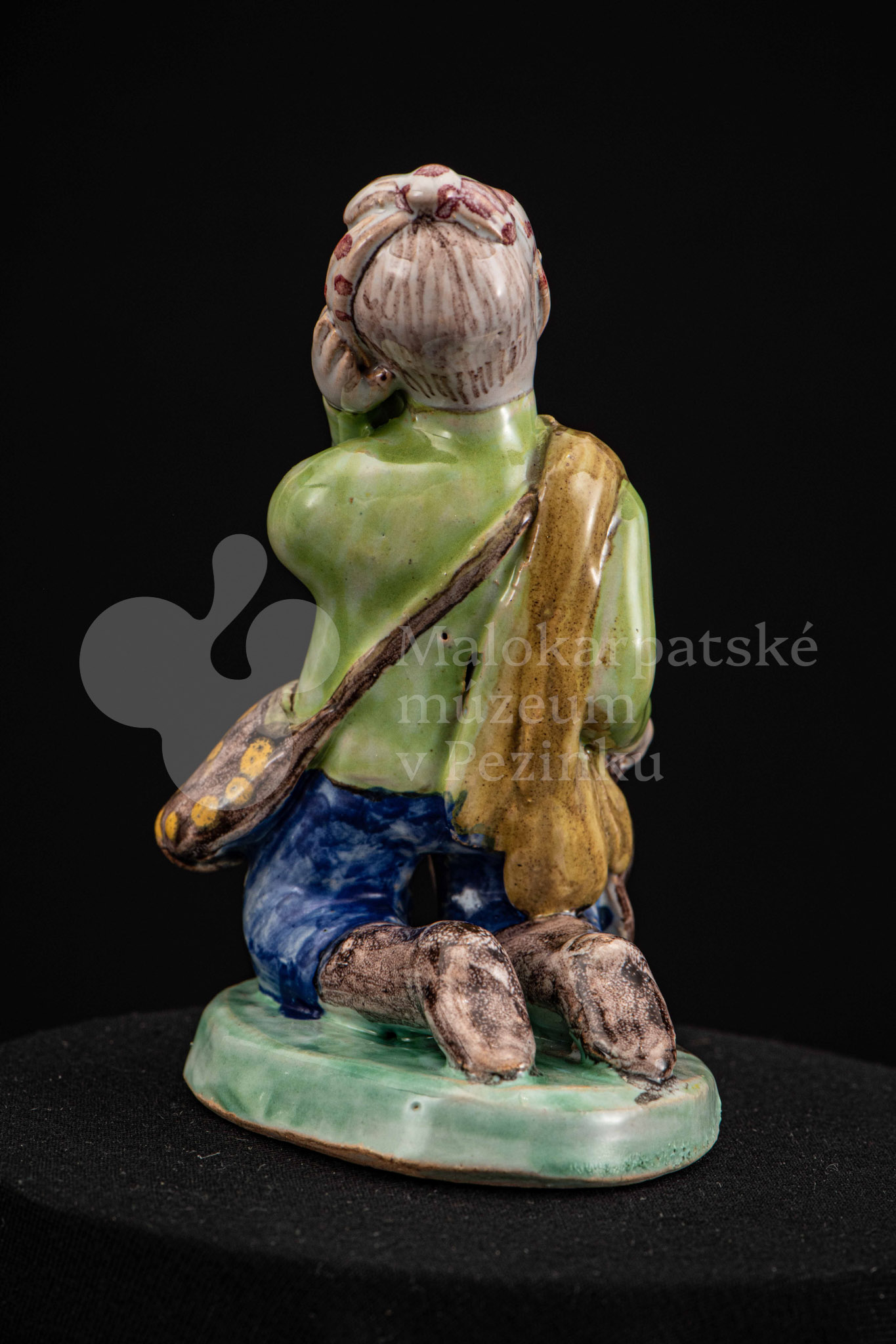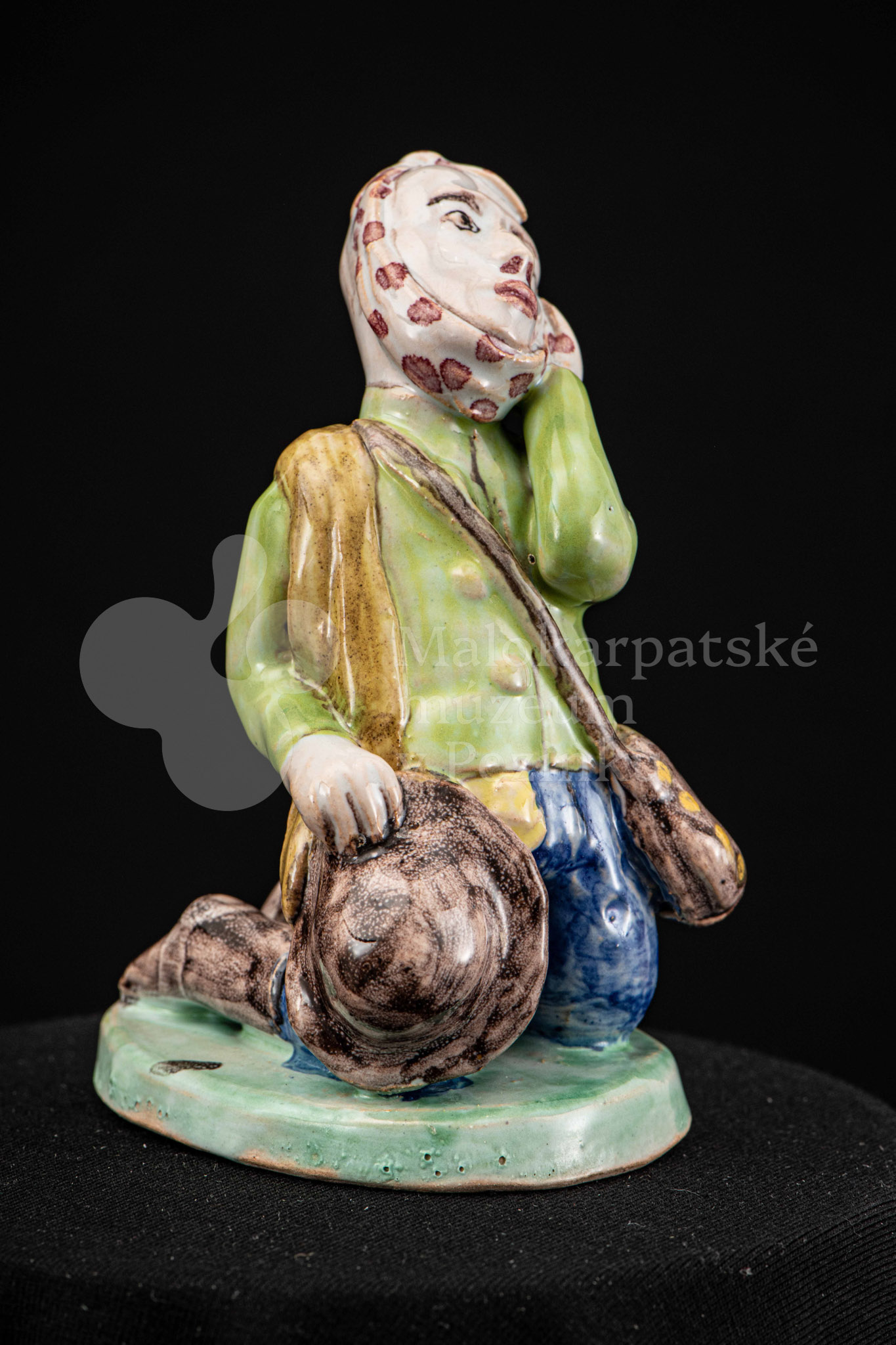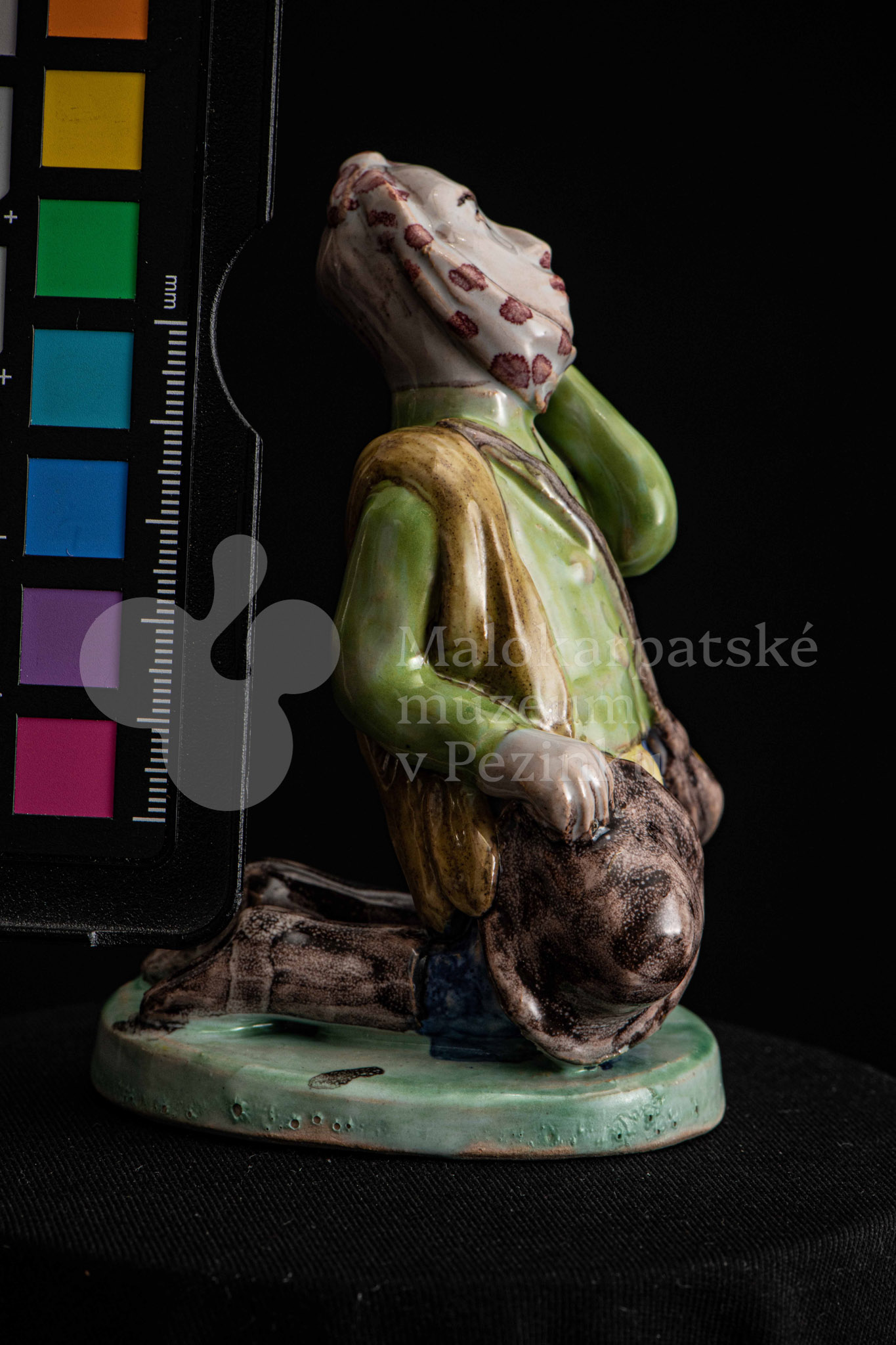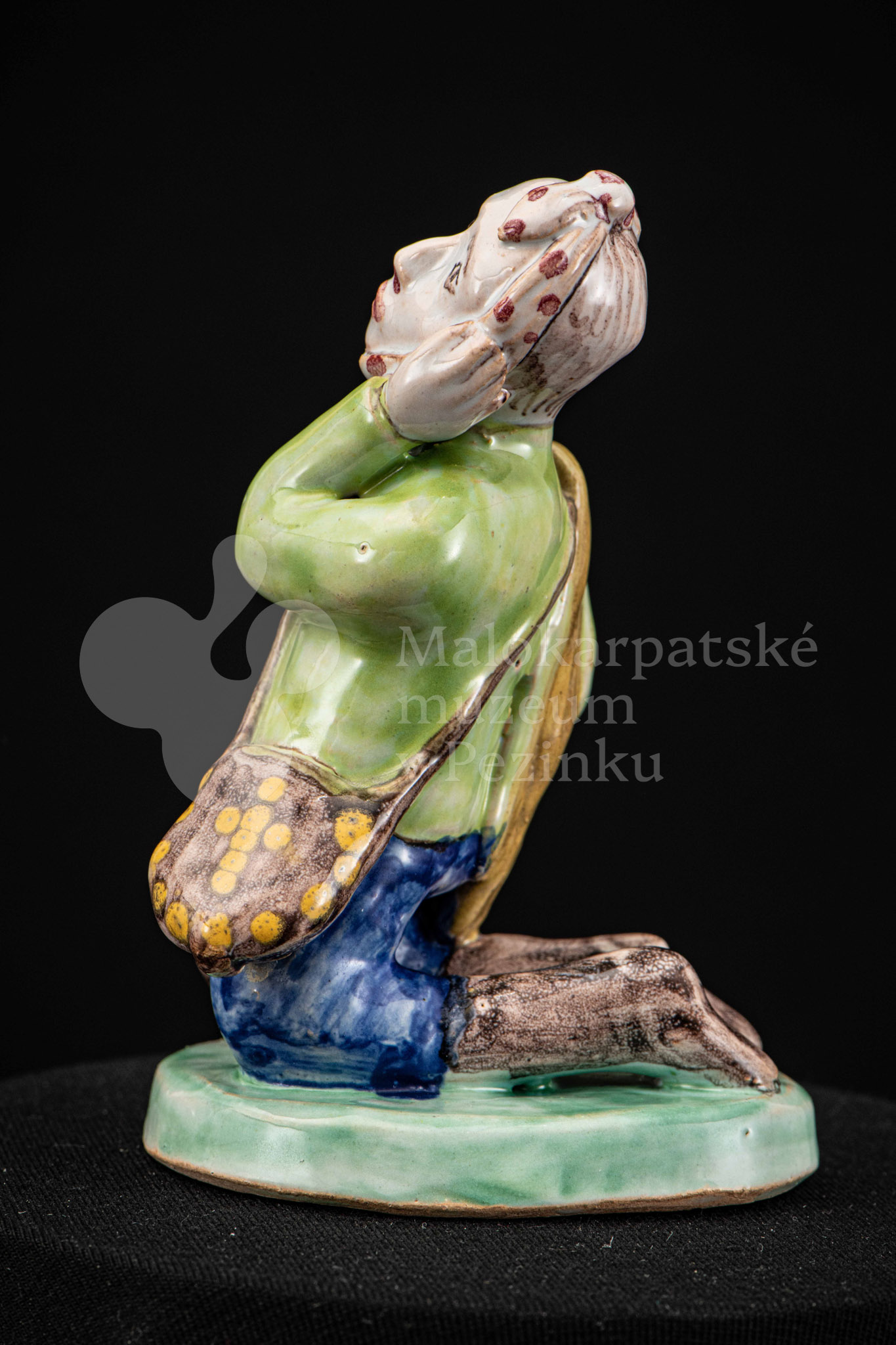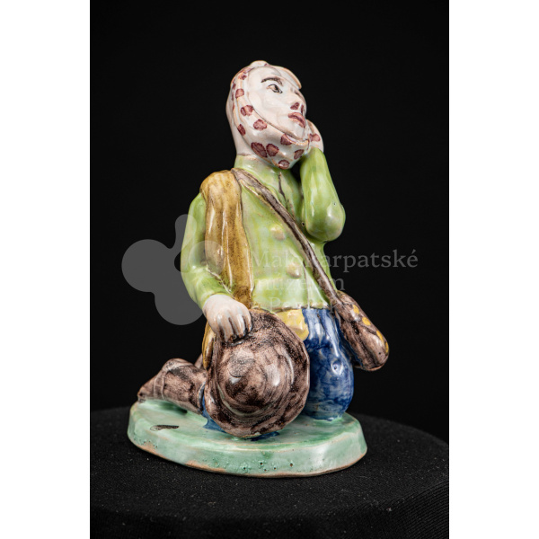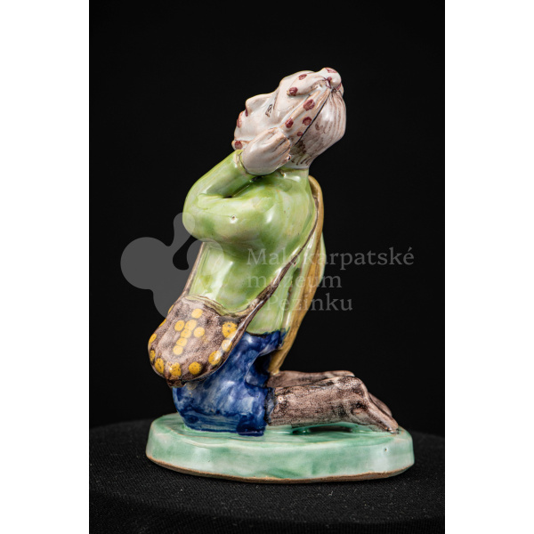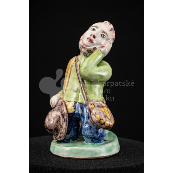 Plastika fajansová – kľačiaci muž, s tvárou obviazanou šatkou. Ľavou rukou si drží líce, v pravej klobúk. Postava je pestrofarebná, oválny podstavec je zelený. Na rube podstavca je značenie FK. ST.